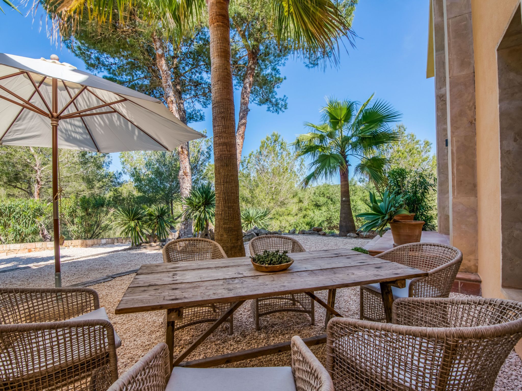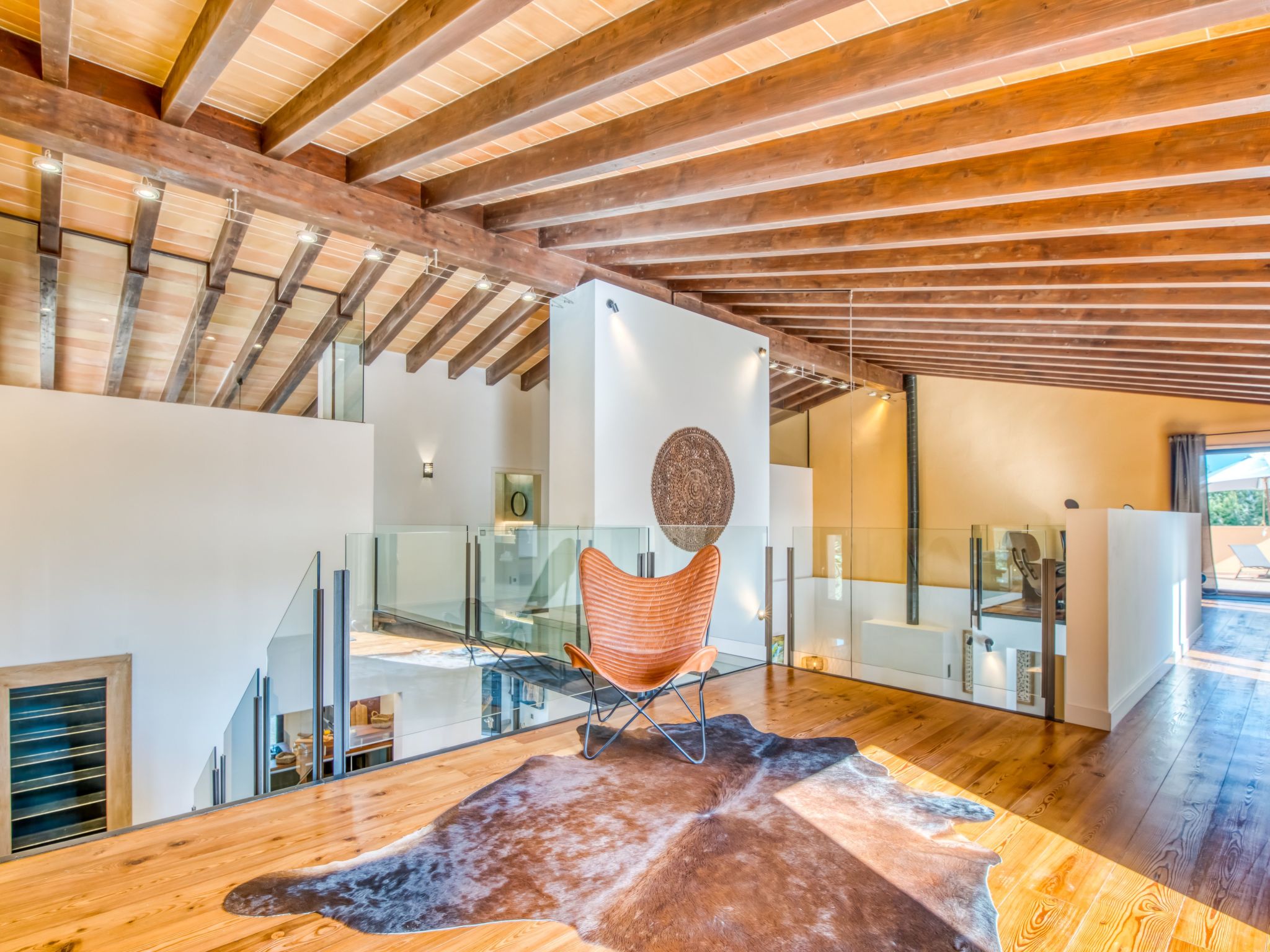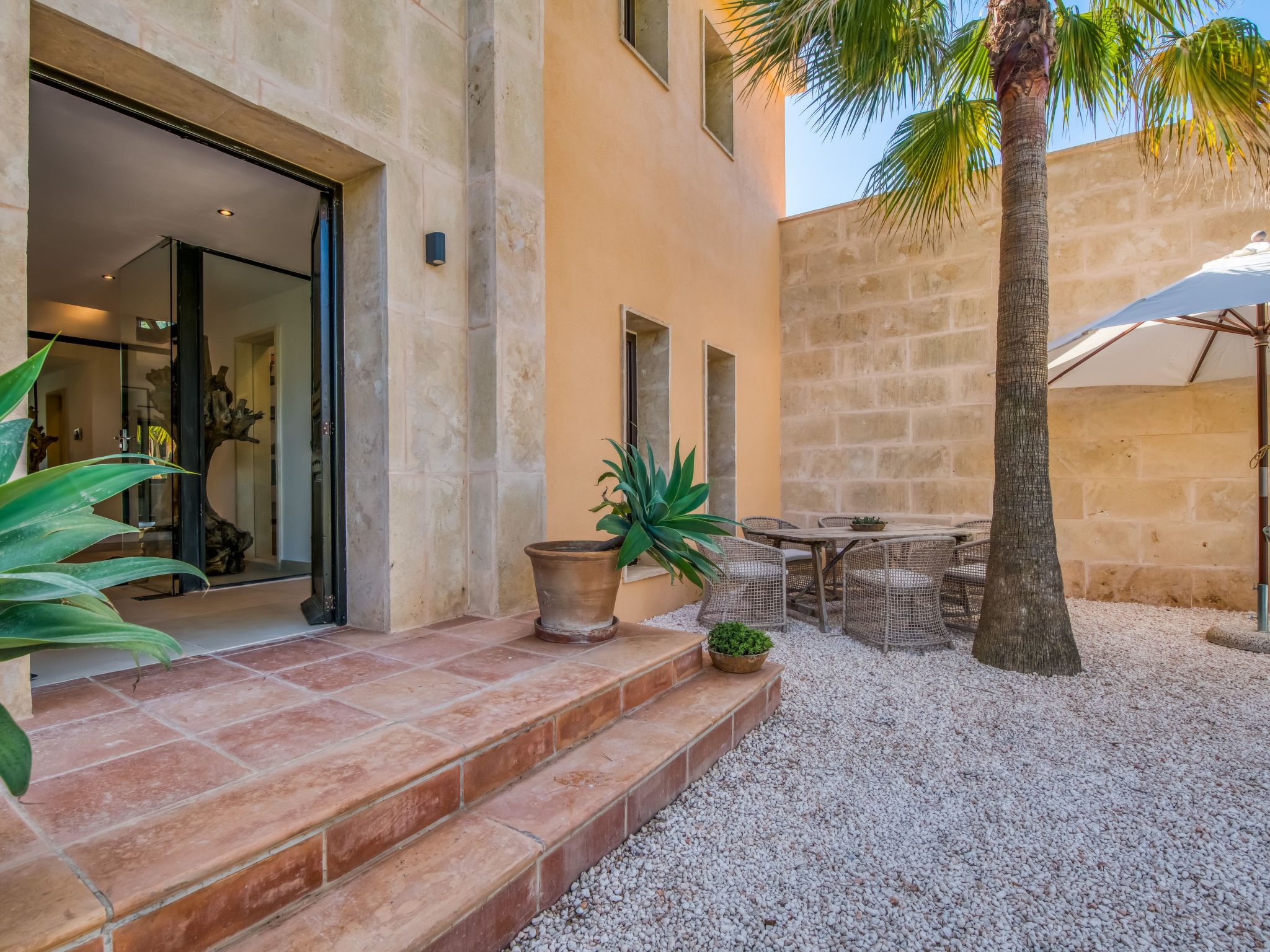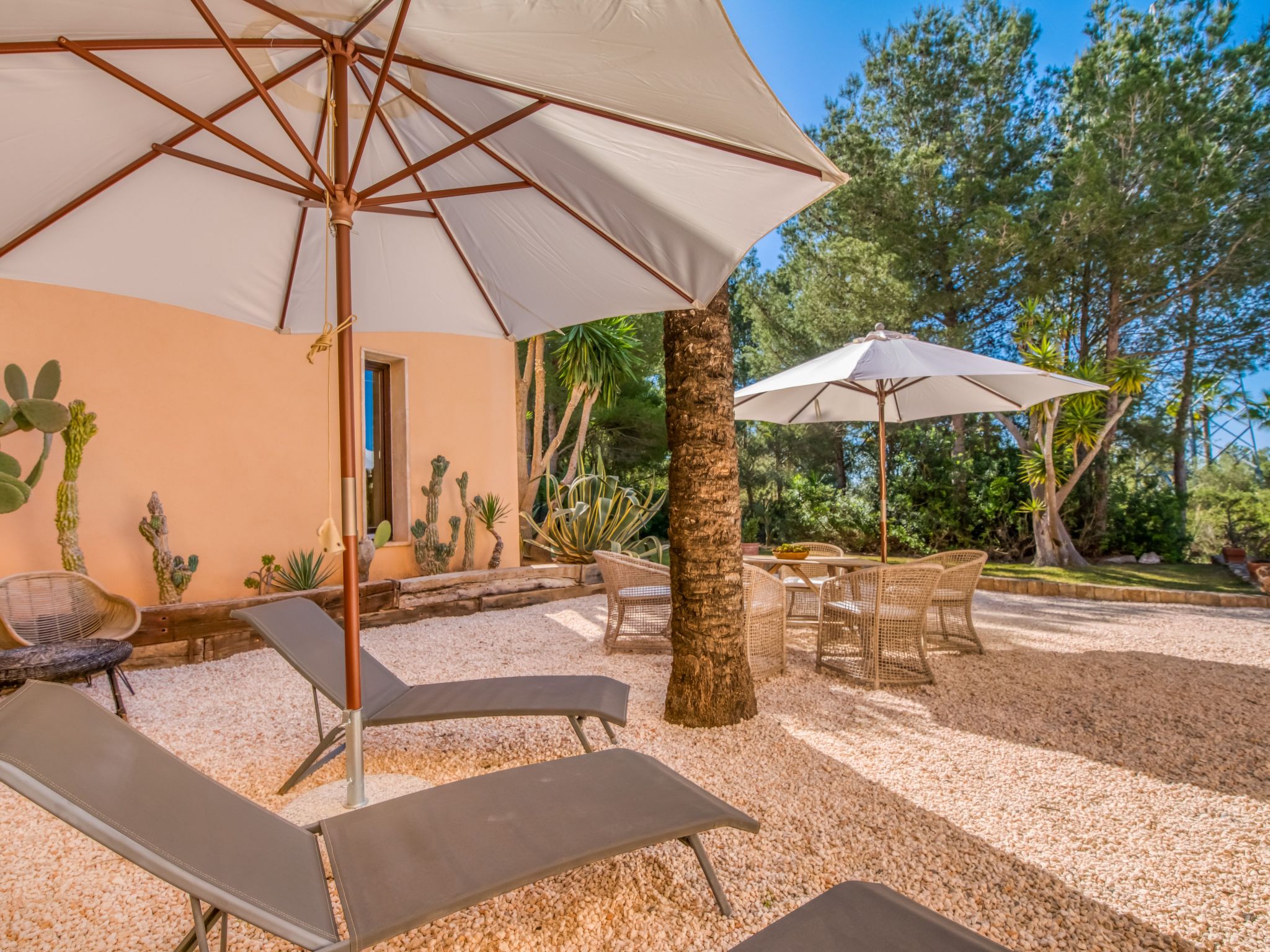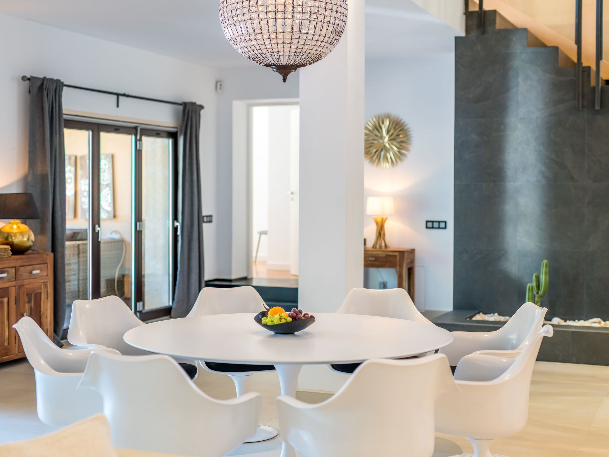 The furnishings match the modern style of the finca, the colour scheme is calm and the style is minimalist. A mixture of warm wood tones, large-format, light-coloured tiles - combined with glass and steel. Beautiful, unique pieces that we have found stand alongside design classics that are pleasing to the eye, calming and refreshing at the same time.