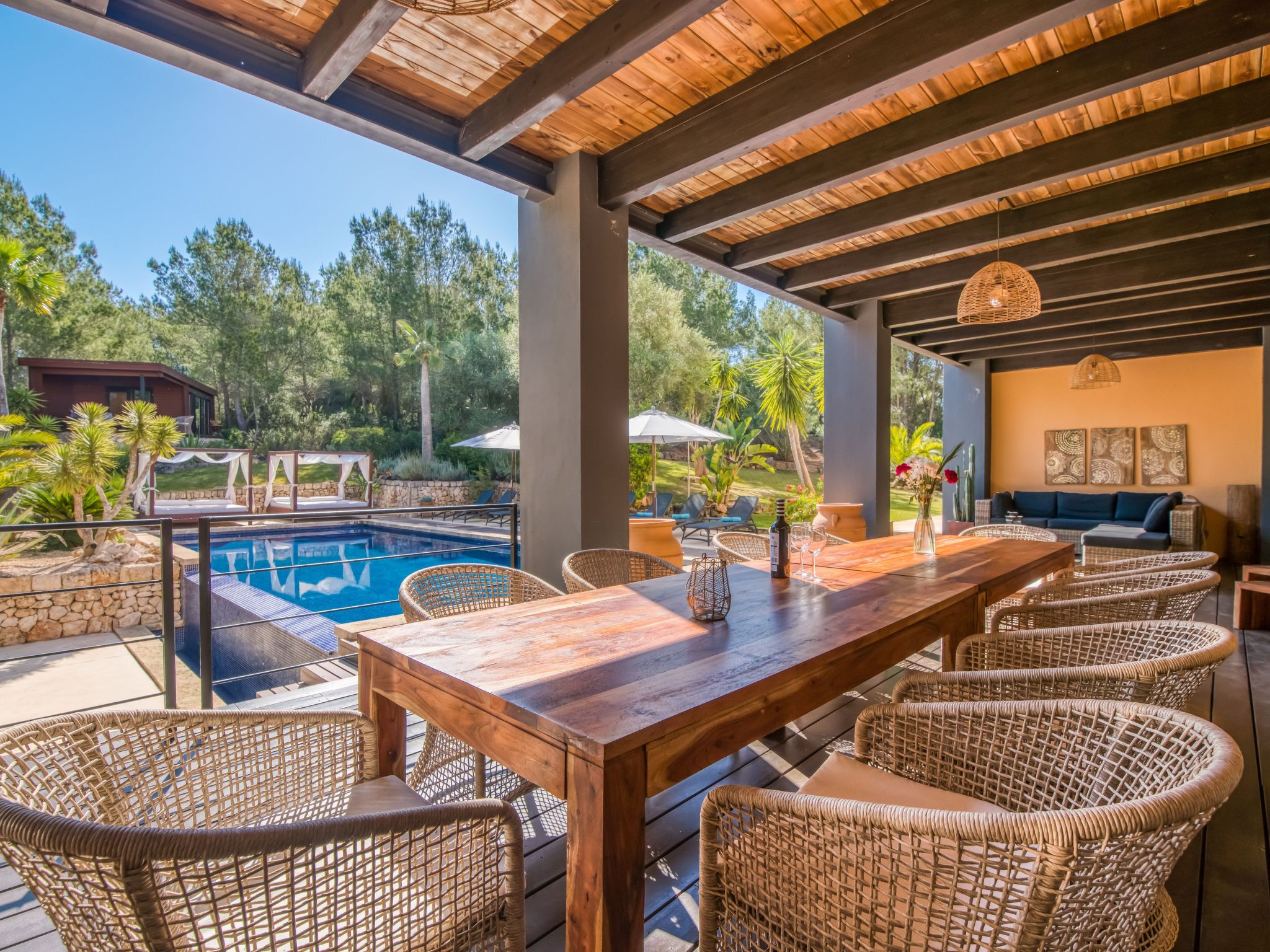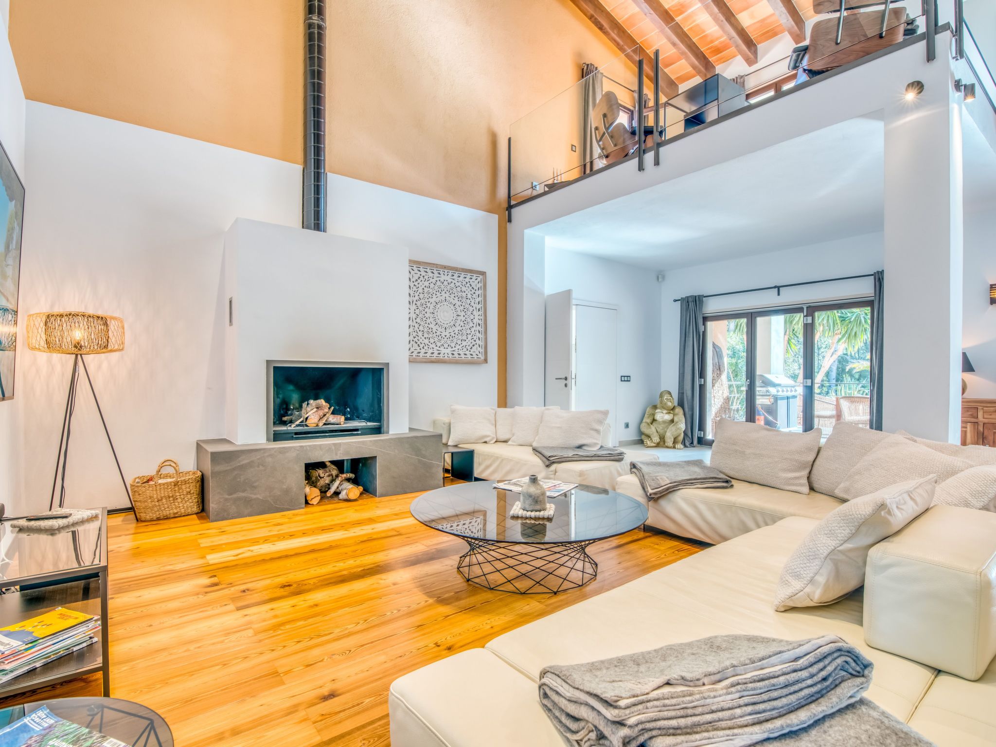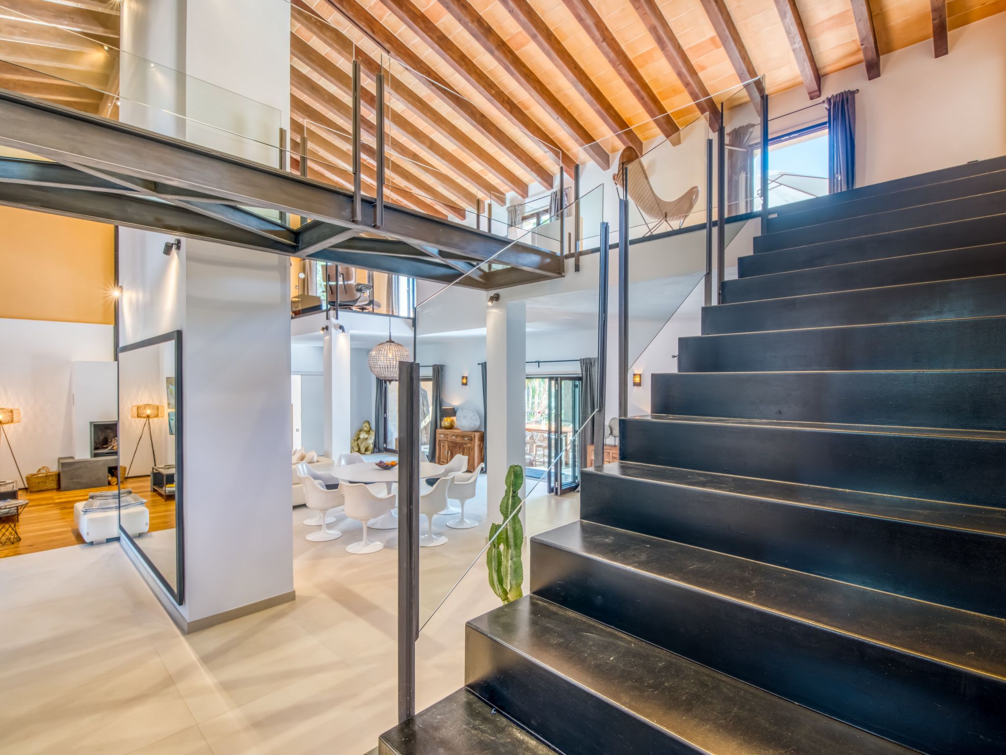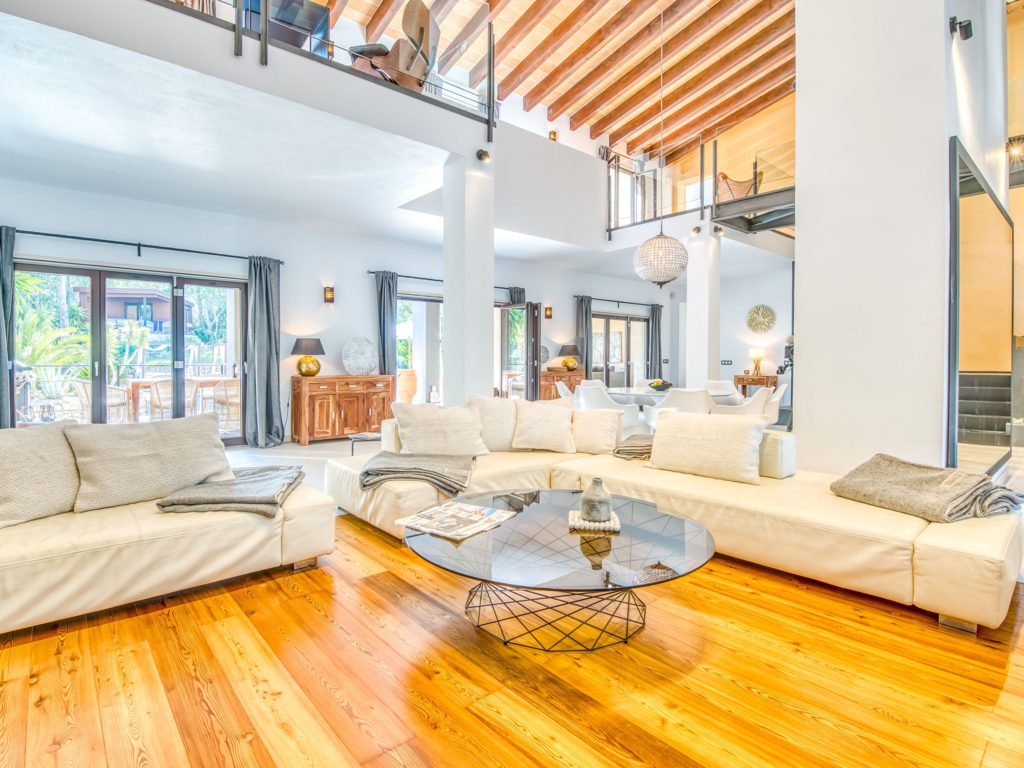 The furnishings match the modern style of the finca, the colour scheme is calm and the style is minimalist. A mixture of warm wood tones, large-format, light-coloured tiles - combined with glass and steel. Beautiful, unique pieces that we have found stand alongside design classics that are pleasing to the eye, calming and refreshing at the same time.