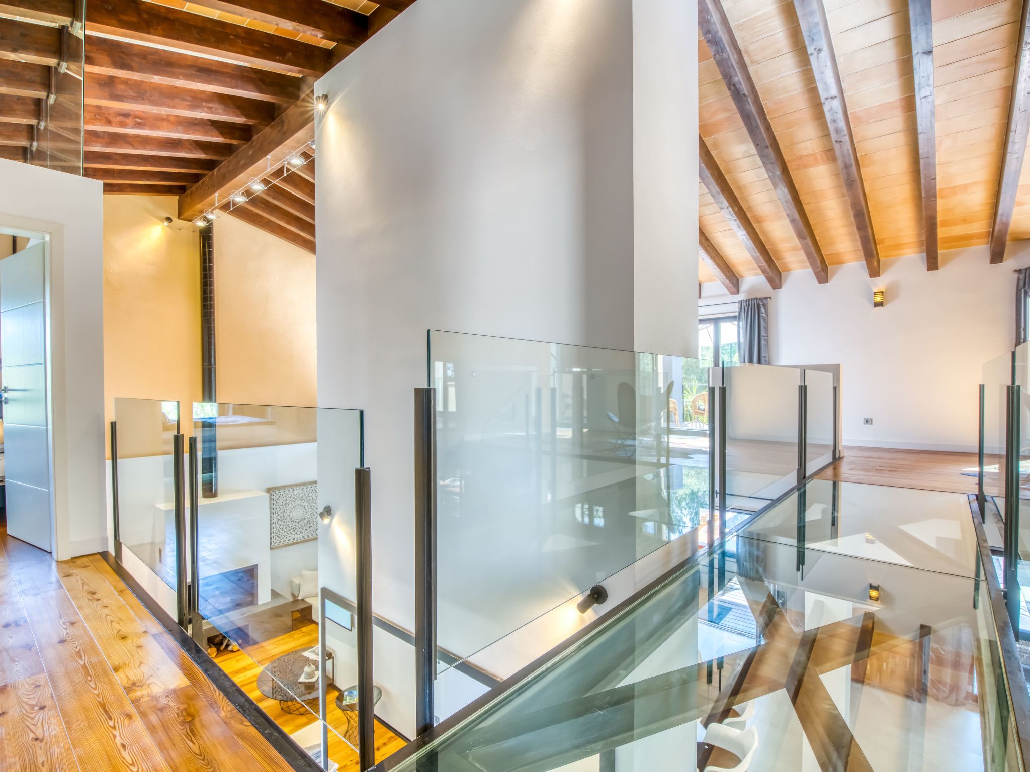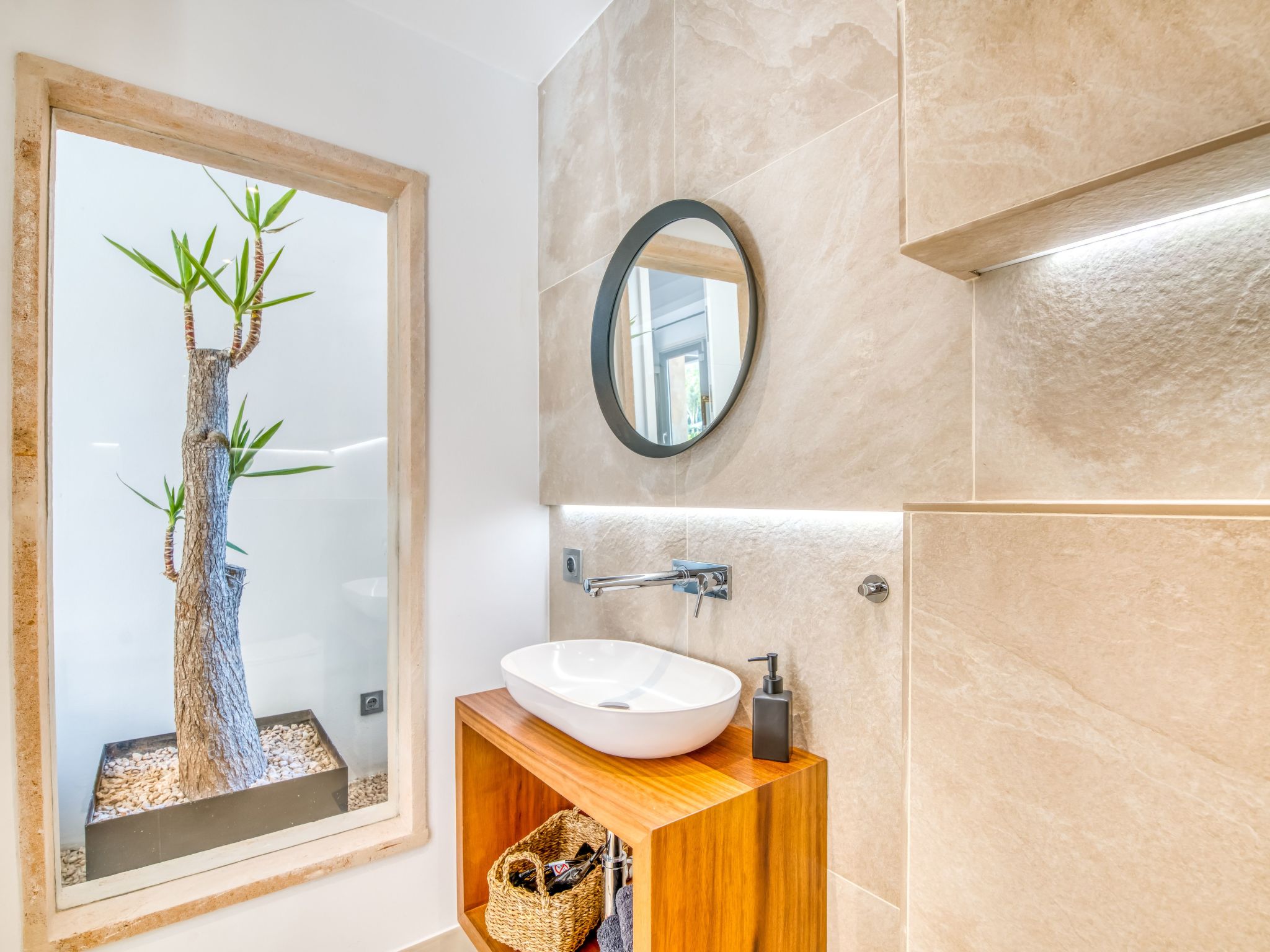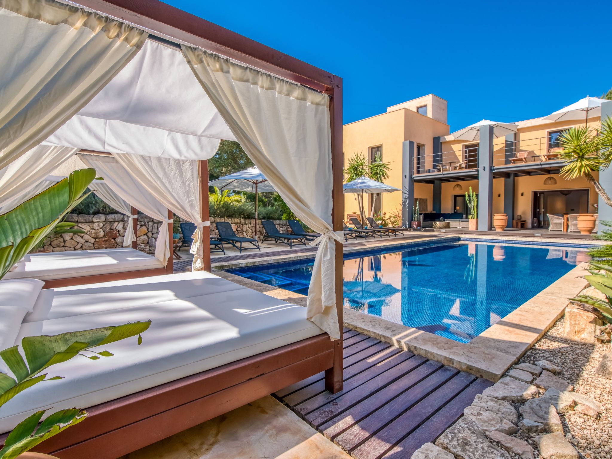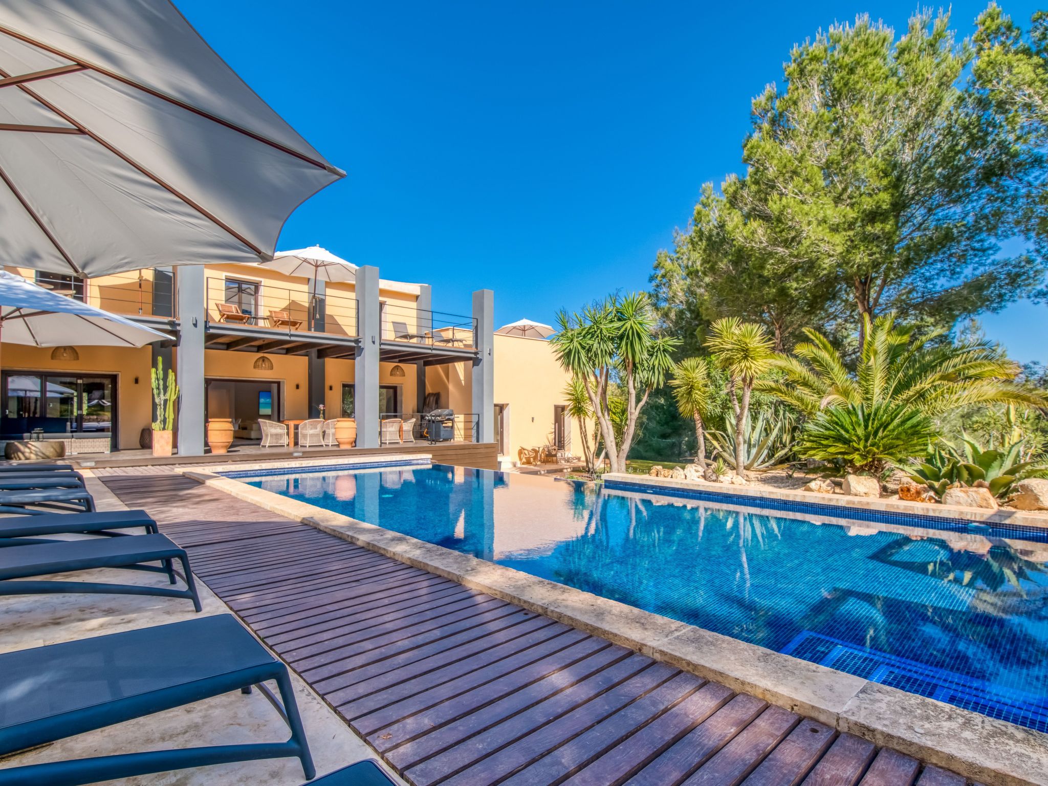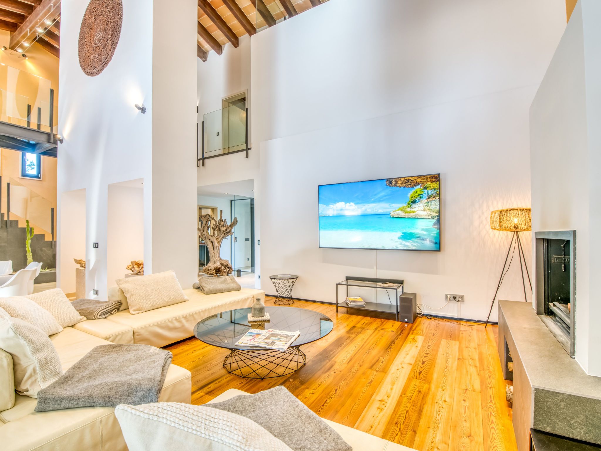 The furnishings match the modern style of the finca, the colour scheme is calm and the style is minimalist. A mixture of warm wood tones, large-format, light-coloured tiles - combined with glass and steel. Beautiful, unique pieces that we have found stand alongside design classics that are pleasing to the eye, calming and refreshing at the same time.