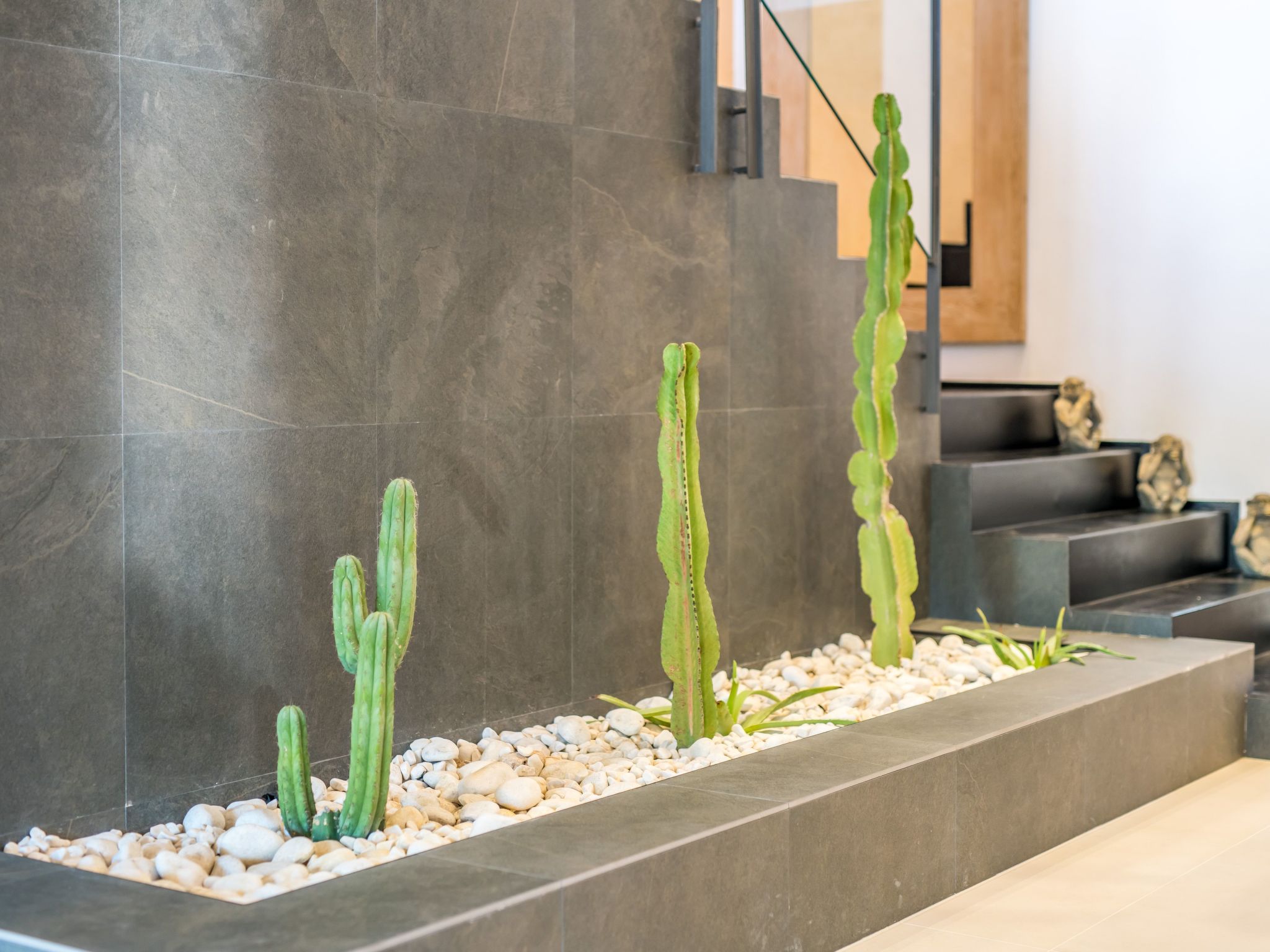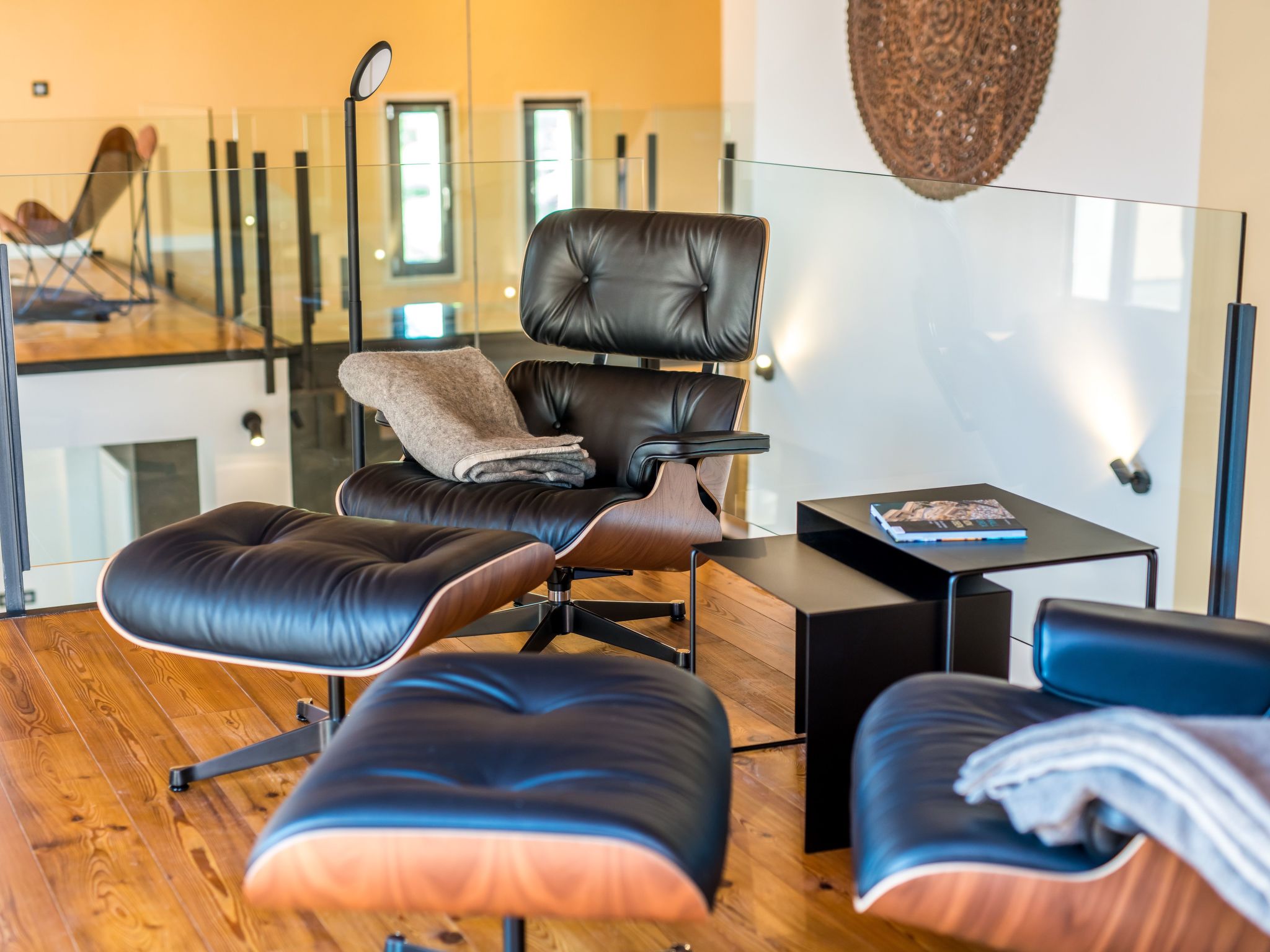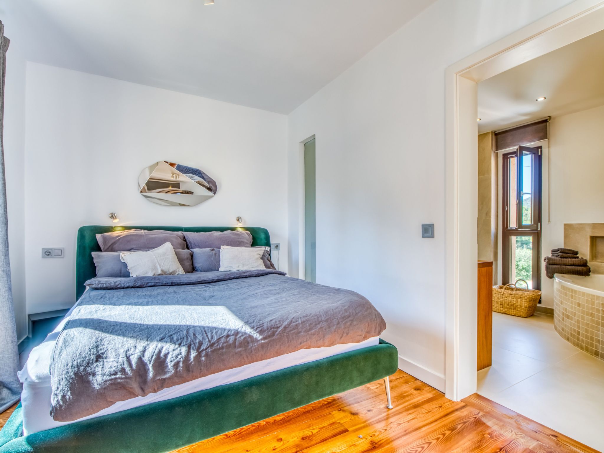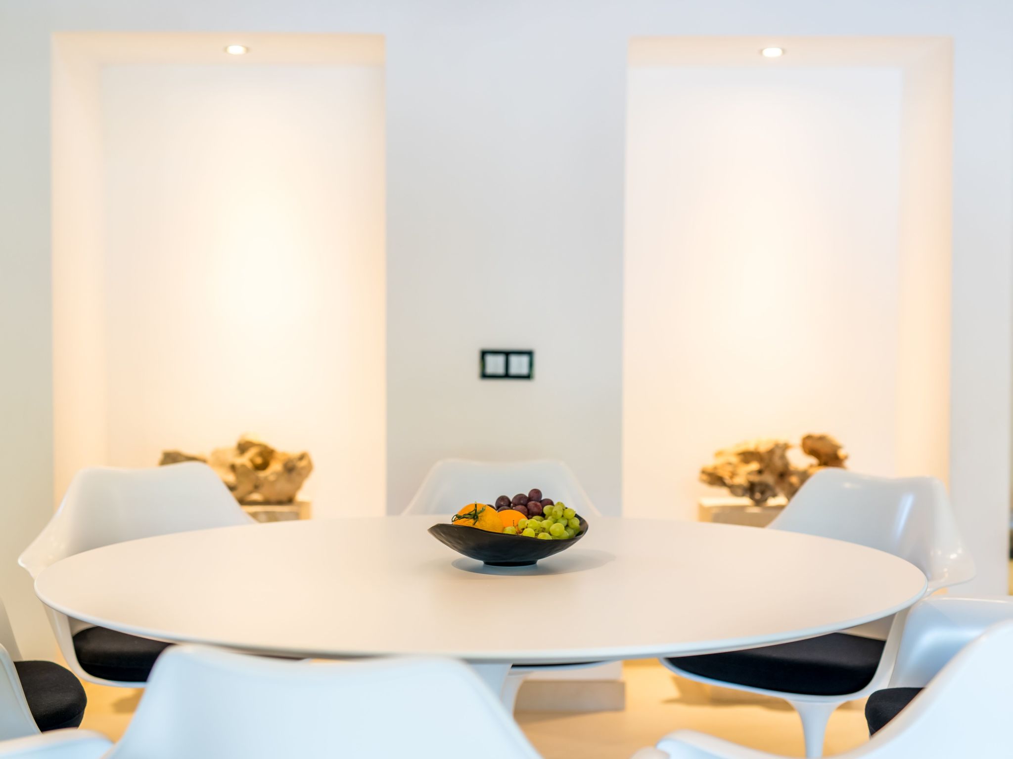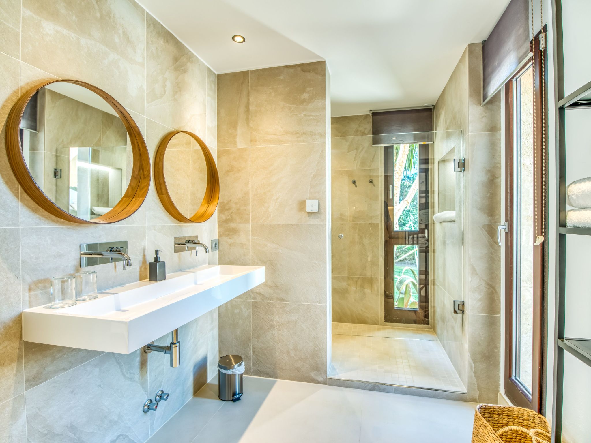 The furnishings match the modern style of the finca, the colour scheme is calm and the style is minimalist. A mixture of warm wood tones, large-format, light-coloured tiles - combined with glass and steel. Beautiful, unique pieces that we have found stand alongside design classics that are pleasing to the eye, calming and refreshing at the same time.