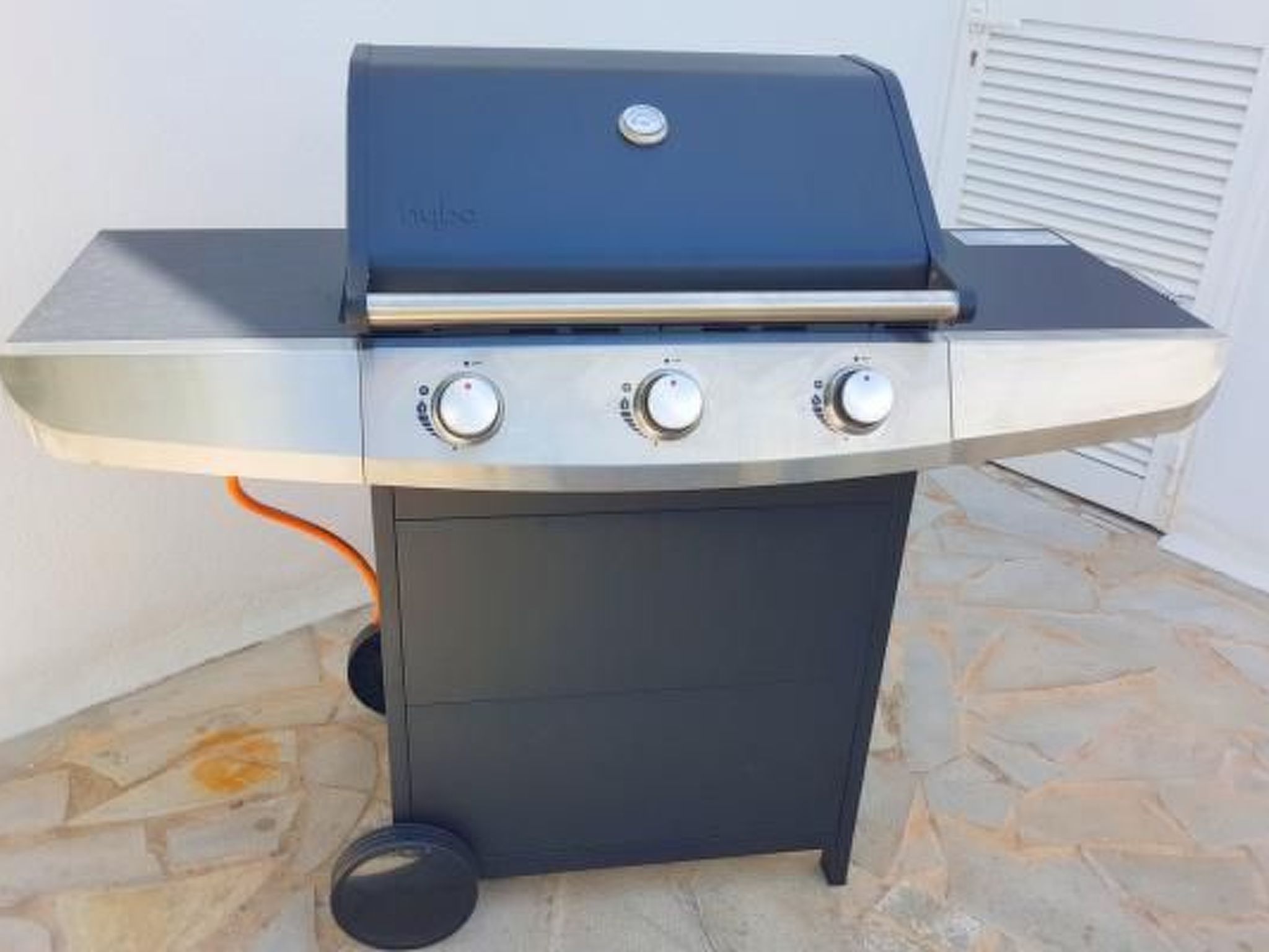 Garden with sun loungers, large table, chairs, barbecue, private pool 24 m2, 1 to 1.5 metres deep, several terraces, gas barbecue, sun protection, indoor and outdoor dining area with table and chairs for 8 people. The green area is artificial grass.