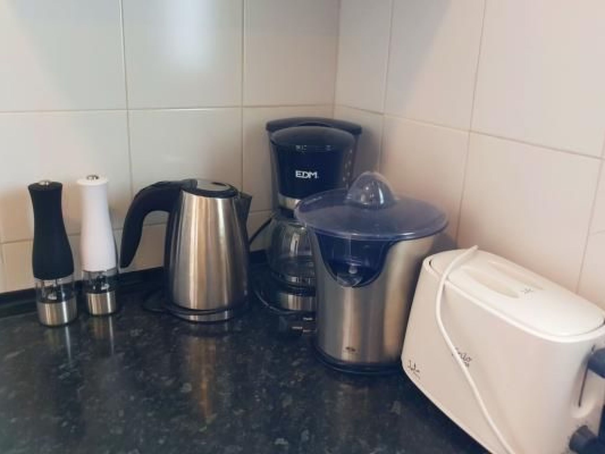 Well furnished, 4 bedrooms, 4 bathrooms, small kitchen: fridge, oven, toaster, coffee maker, kettle, etc., living room: WiFi, flat screen TV (German), sofa, floor-to-ceiling windows, table, chairs. Air conditioning everywhere, so each of the 4 rooms and the living area can be controlled separately.
