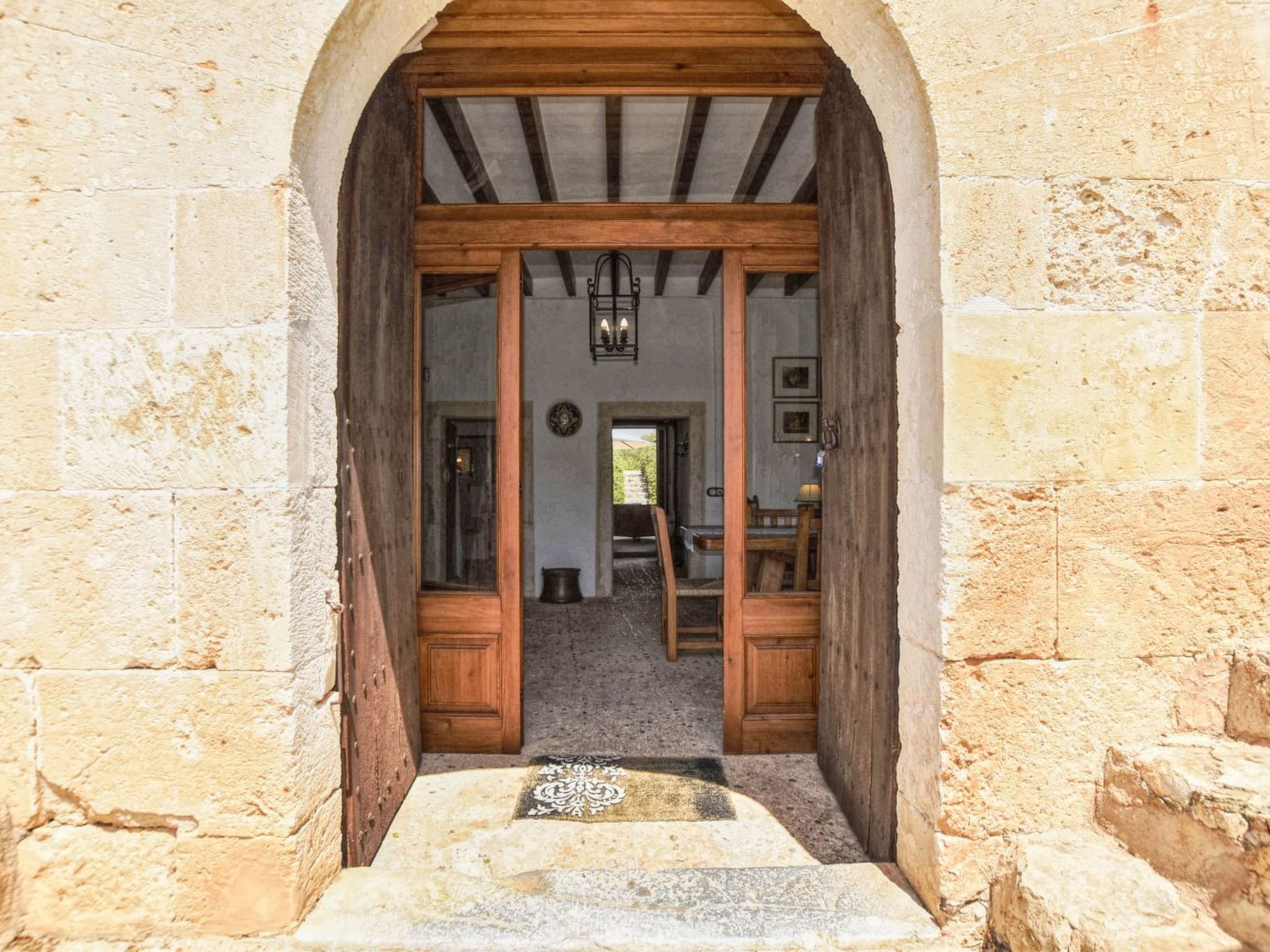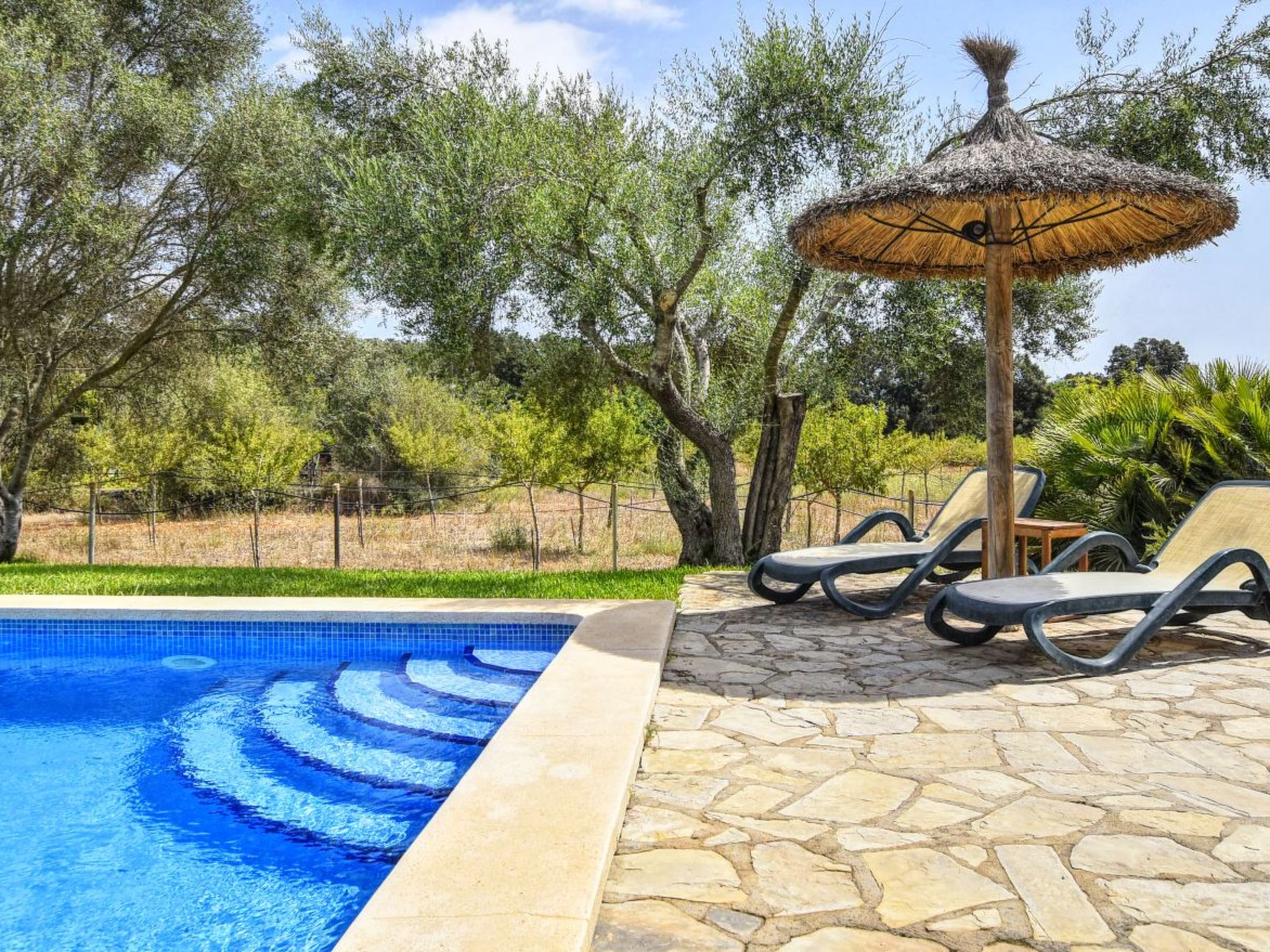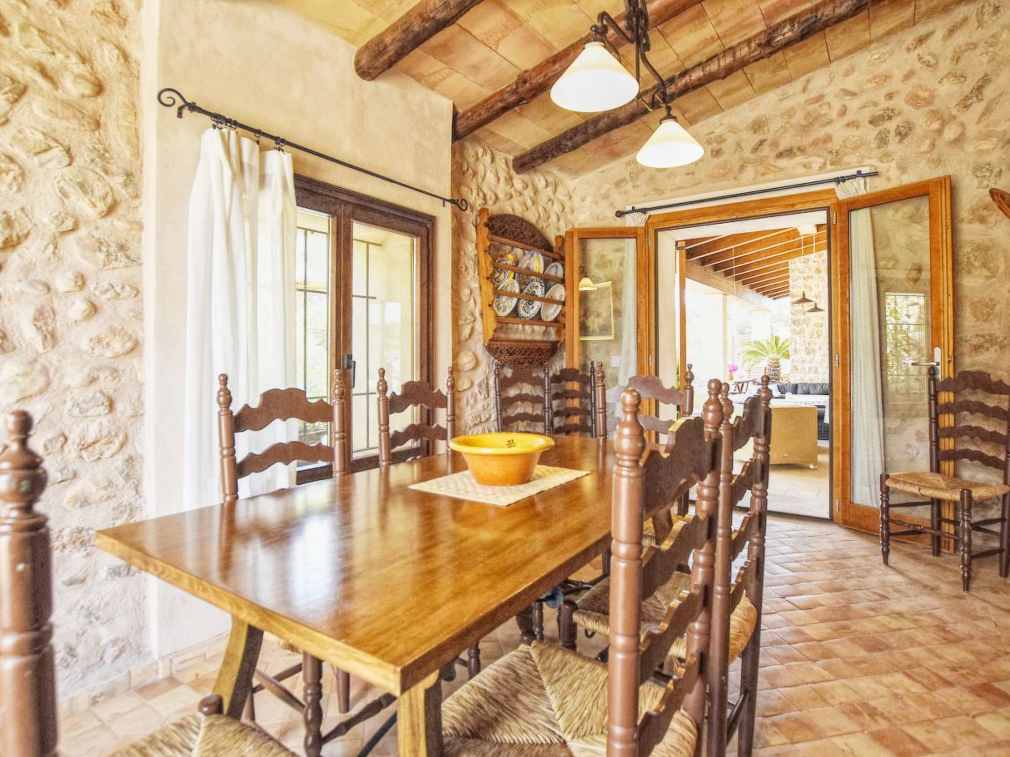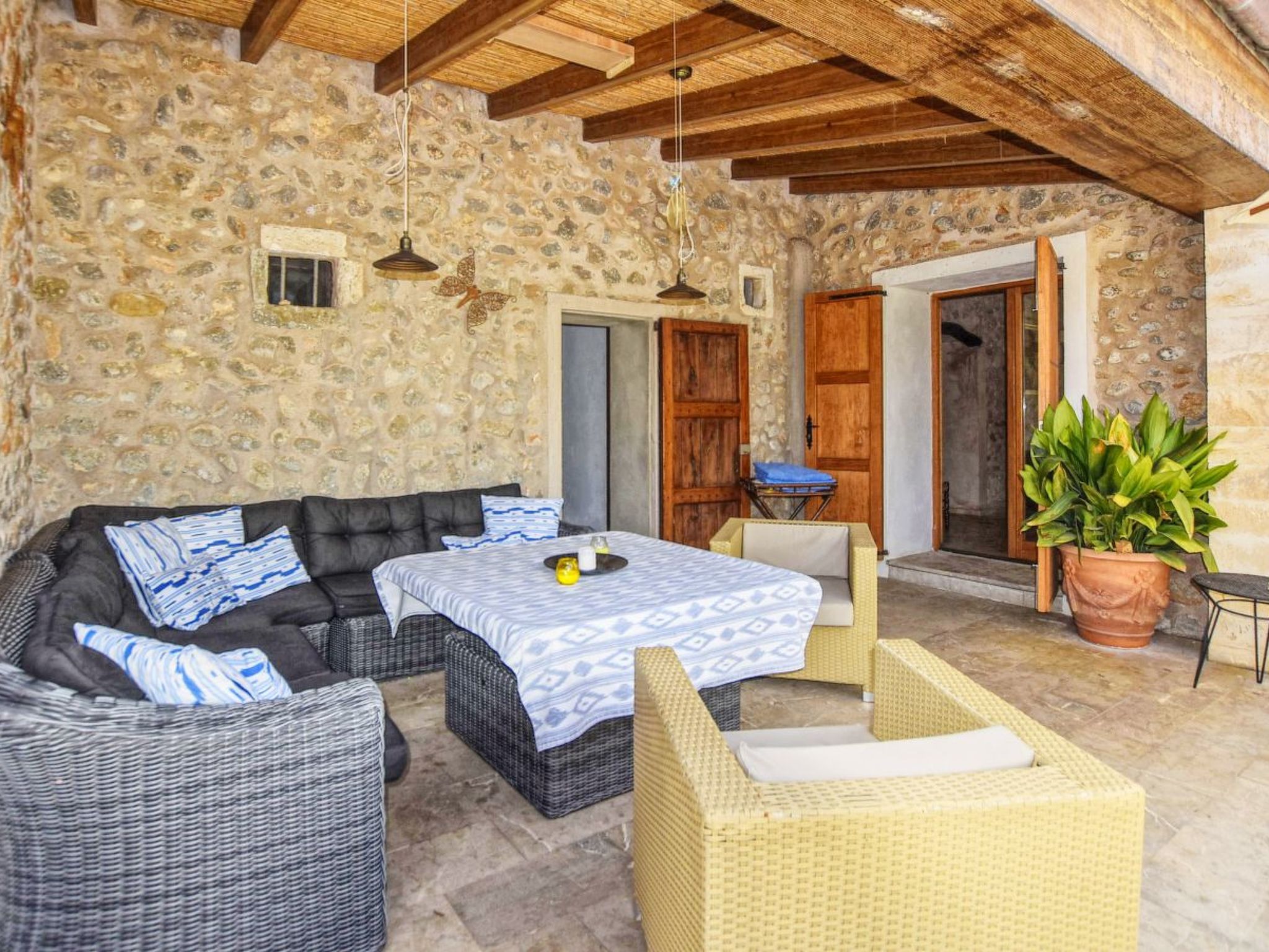 The finca can accommodate up to 6 guests and has around 210 m² of living space on two floors with a total of 3 bedrooms and 3 bathrooms, of which one bedroom and two bathrooms are on the ground floor and the other two and another bathroom are on the upper floor. The cozy living room is on the upper floor and is equipped with satellite TV and WiFi internet. The kitchen, which is equipped with a dishwasher, is also on the ground floor. The living room and all bedrooms have air conditioning.