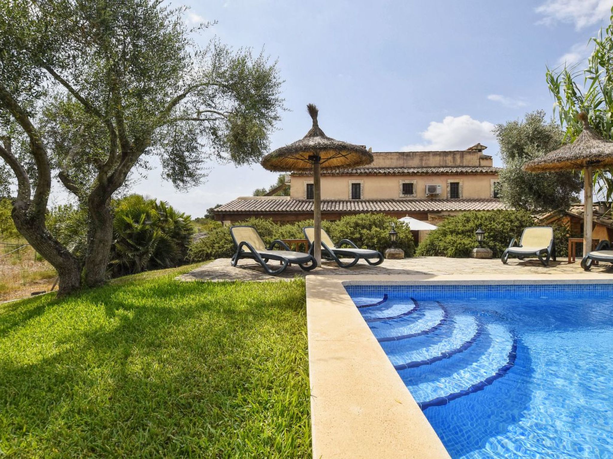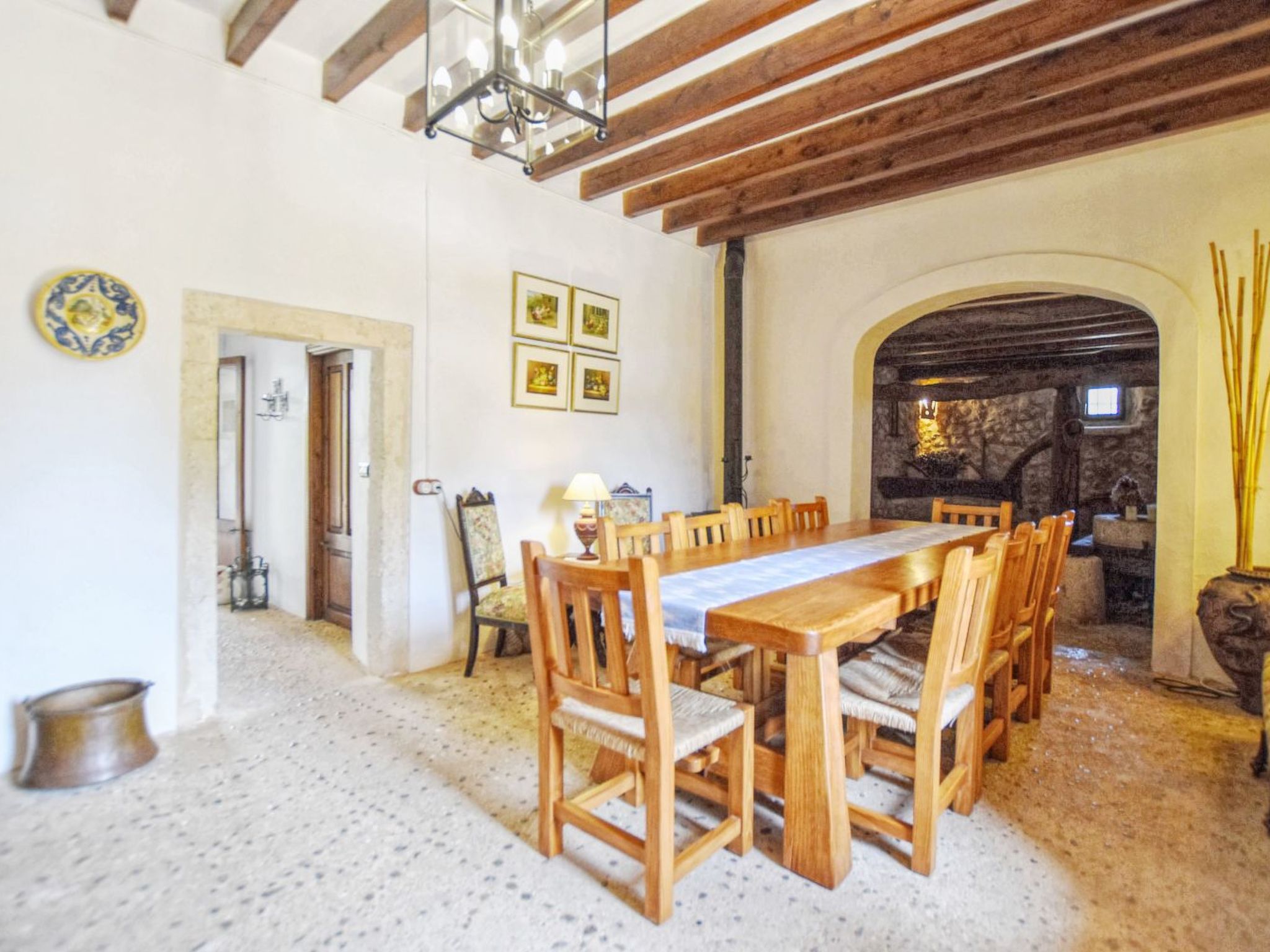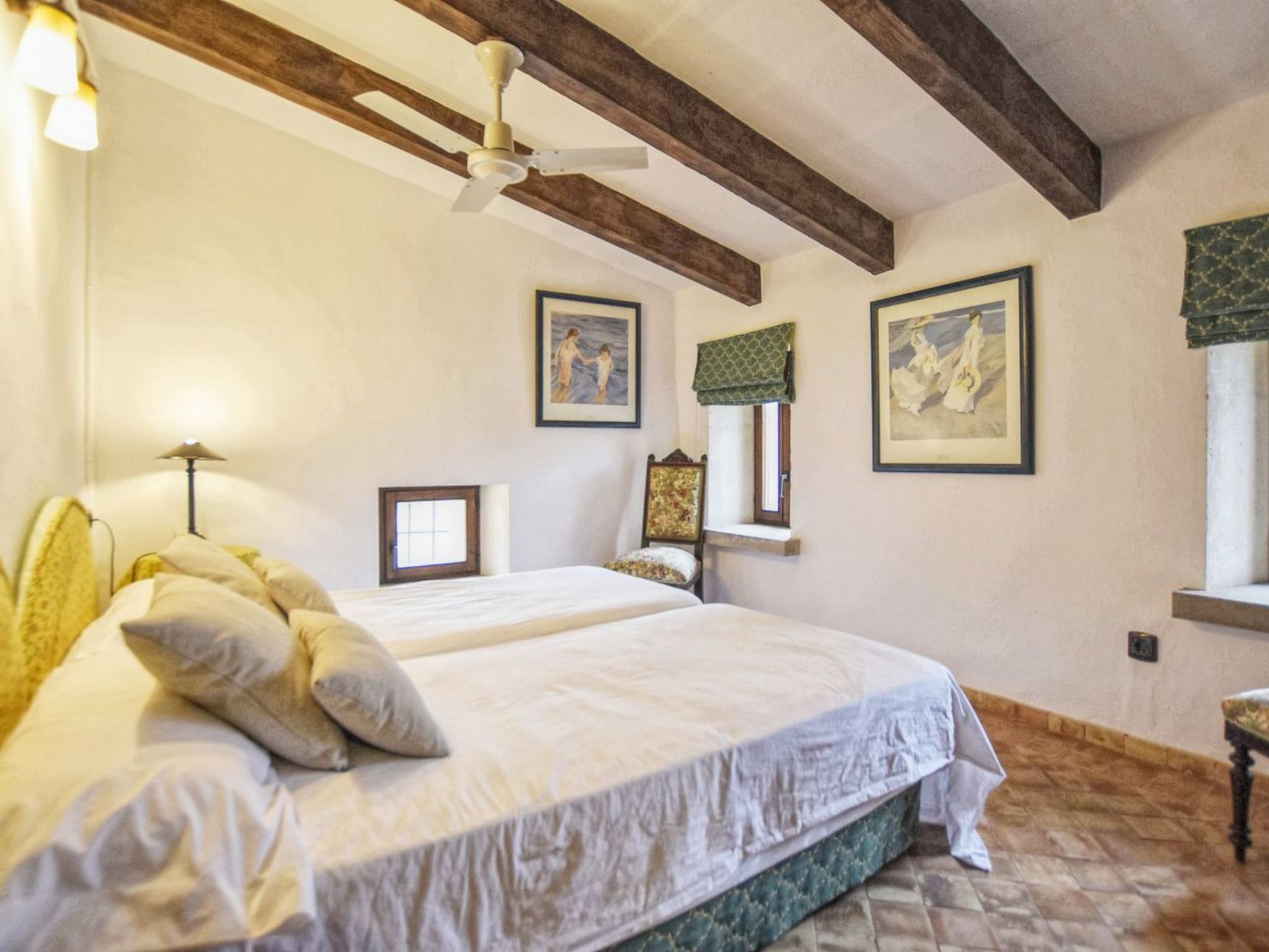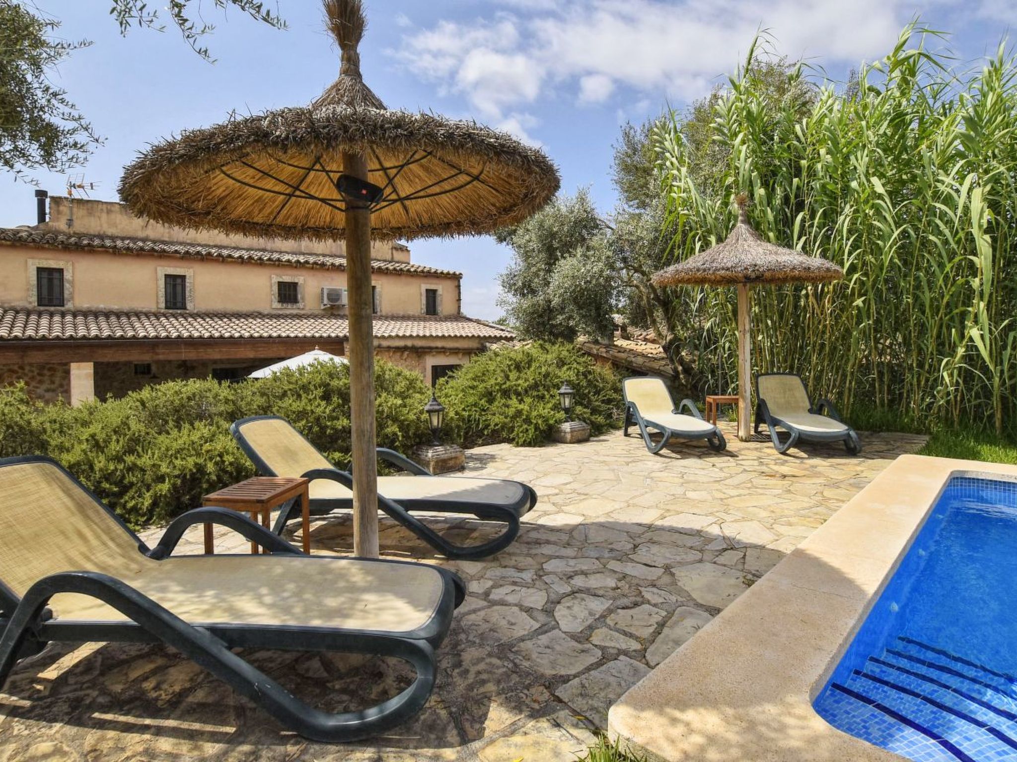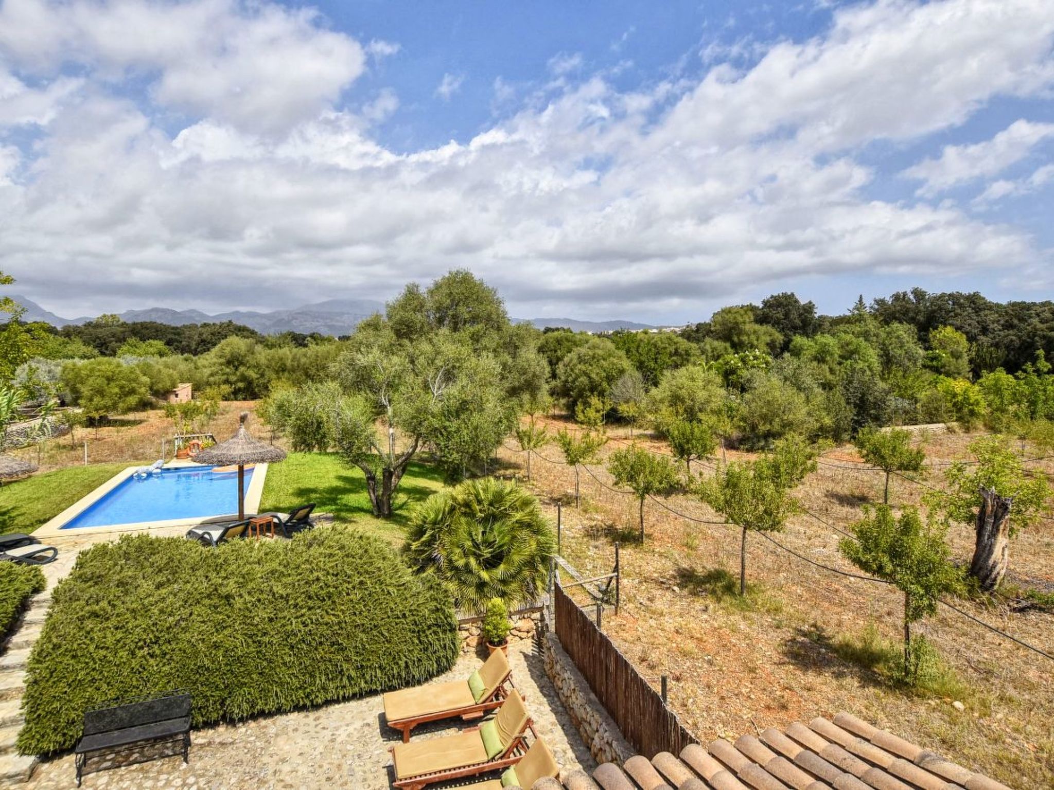 The finca can accommodate up to 6 guests and has around 210 m² of living space on two floors with a total of 3 bedrooms and 3 bathrooms, of which one bedroom and two bathrooms are on the ground floor and the other two and another bathroom are on the upper floor. The cozy living room is on the upper floor and is equipped with satellite TV and WiFi internet. The kitchen, which is equipped with a dishwasher, is also on the ground floor. The living room and all bedrooms have air conditioning.