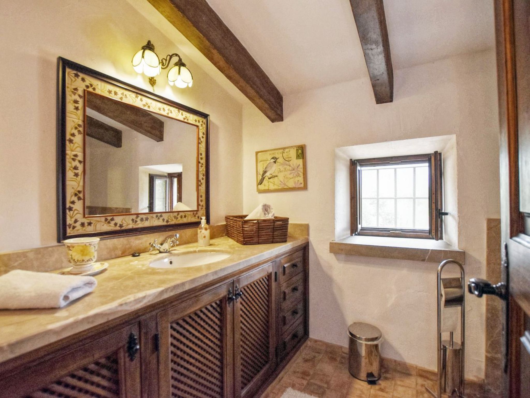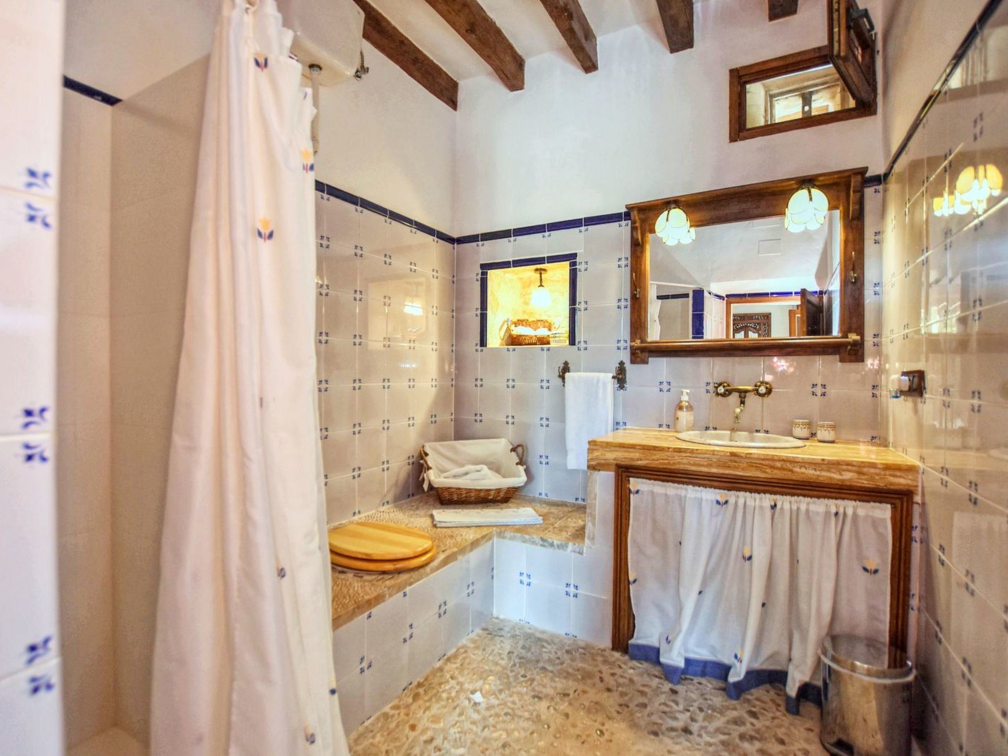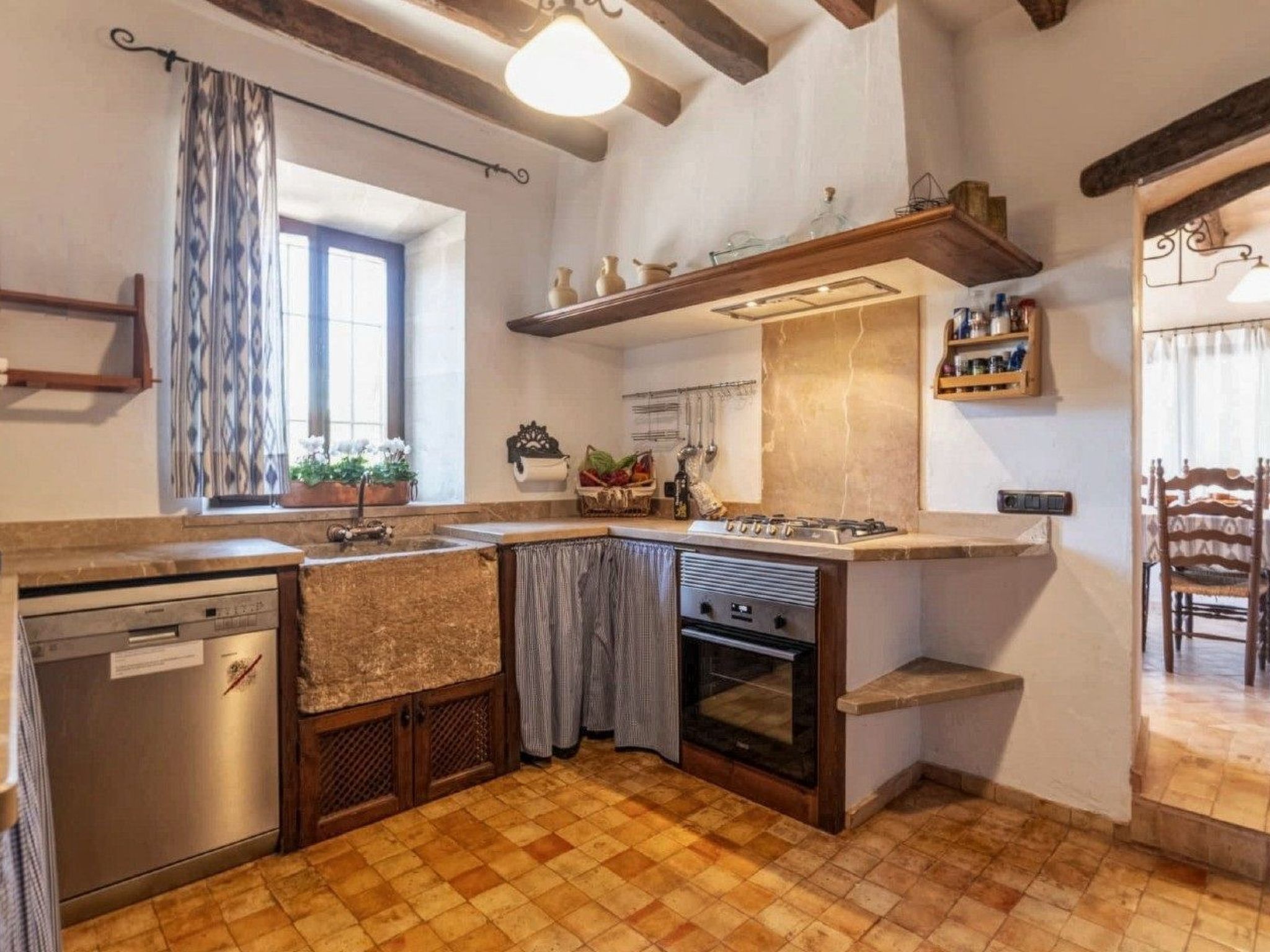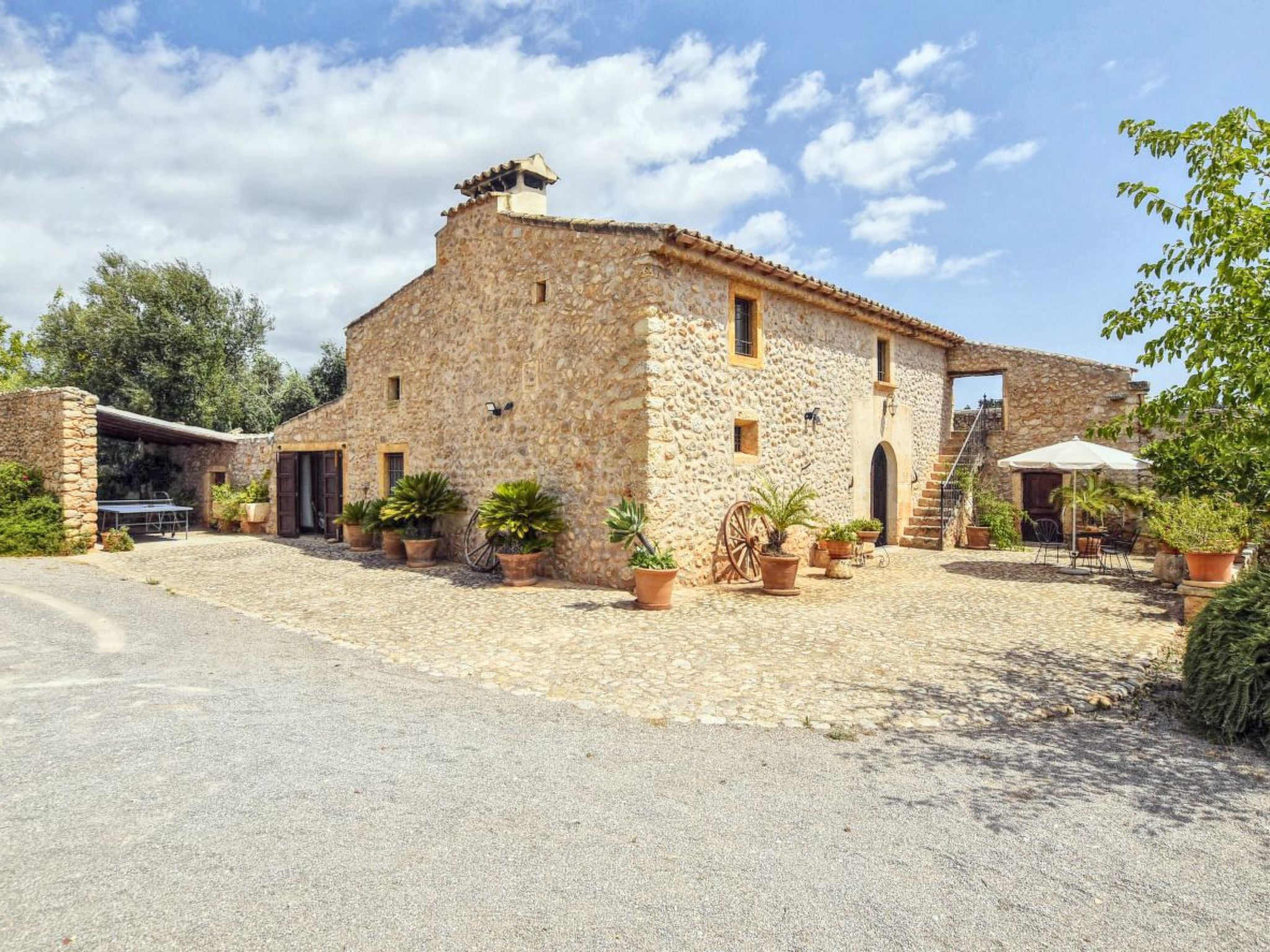 The finca can accommodate up to 6 guests and has around 210 m² of living space on two floors with a total of 3 bedrooms and 3 bathrooms, of which one bedroom and two bathrooms are on the ground floor and the other two and another bathroom are on the upper floor. The cozy living room is on the upper floor and is equipped with satellite TV and WiFi internet. The kitchen, which is equipped with a dishwasher, is also on the ground floor. The living room and all bedrooms have air conditioning.