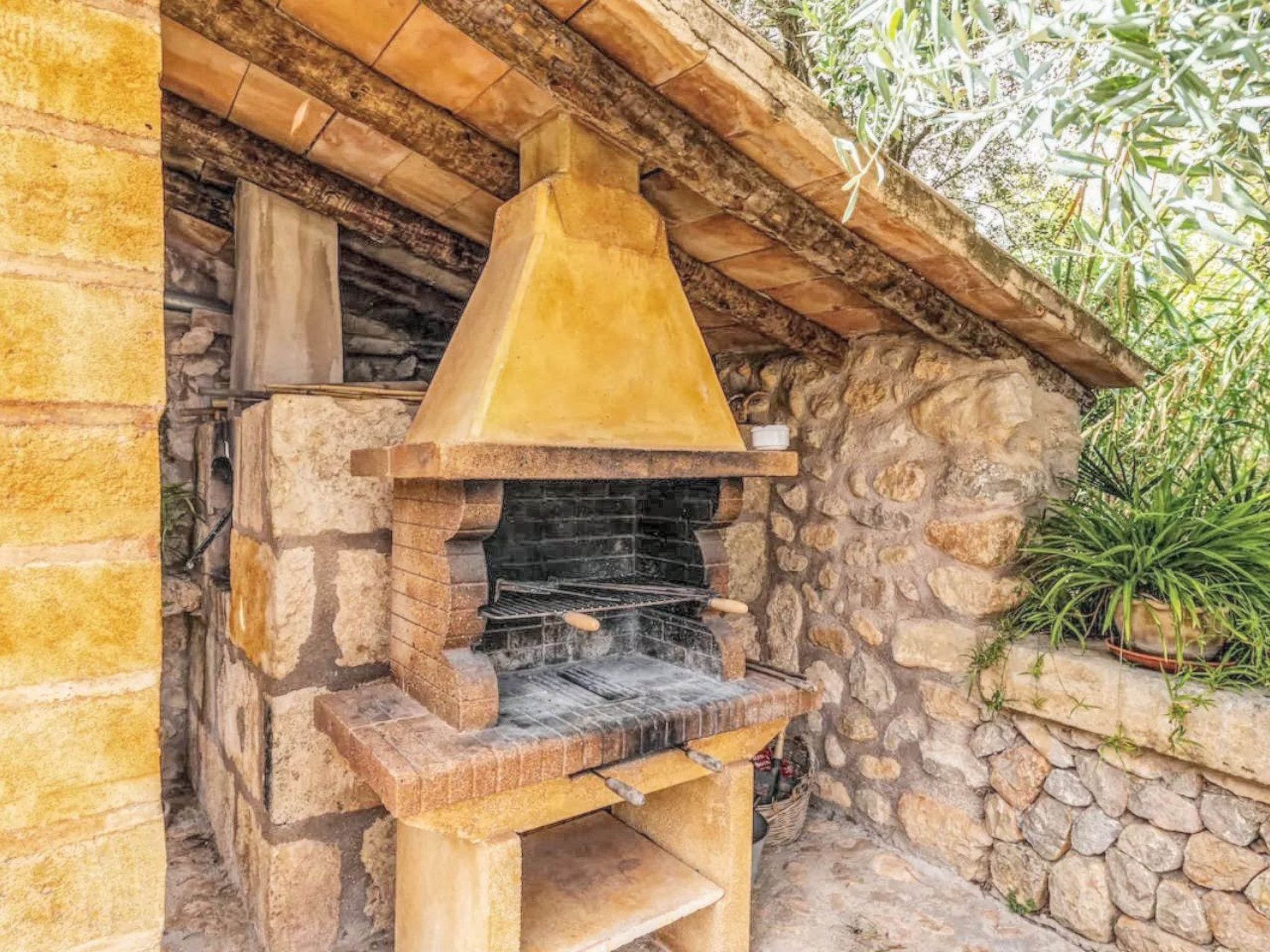 The furnished terrace has a dining table to relax and enjoy the fresh holiday air and right next to it under a shady tree is the brick barbecue grill.