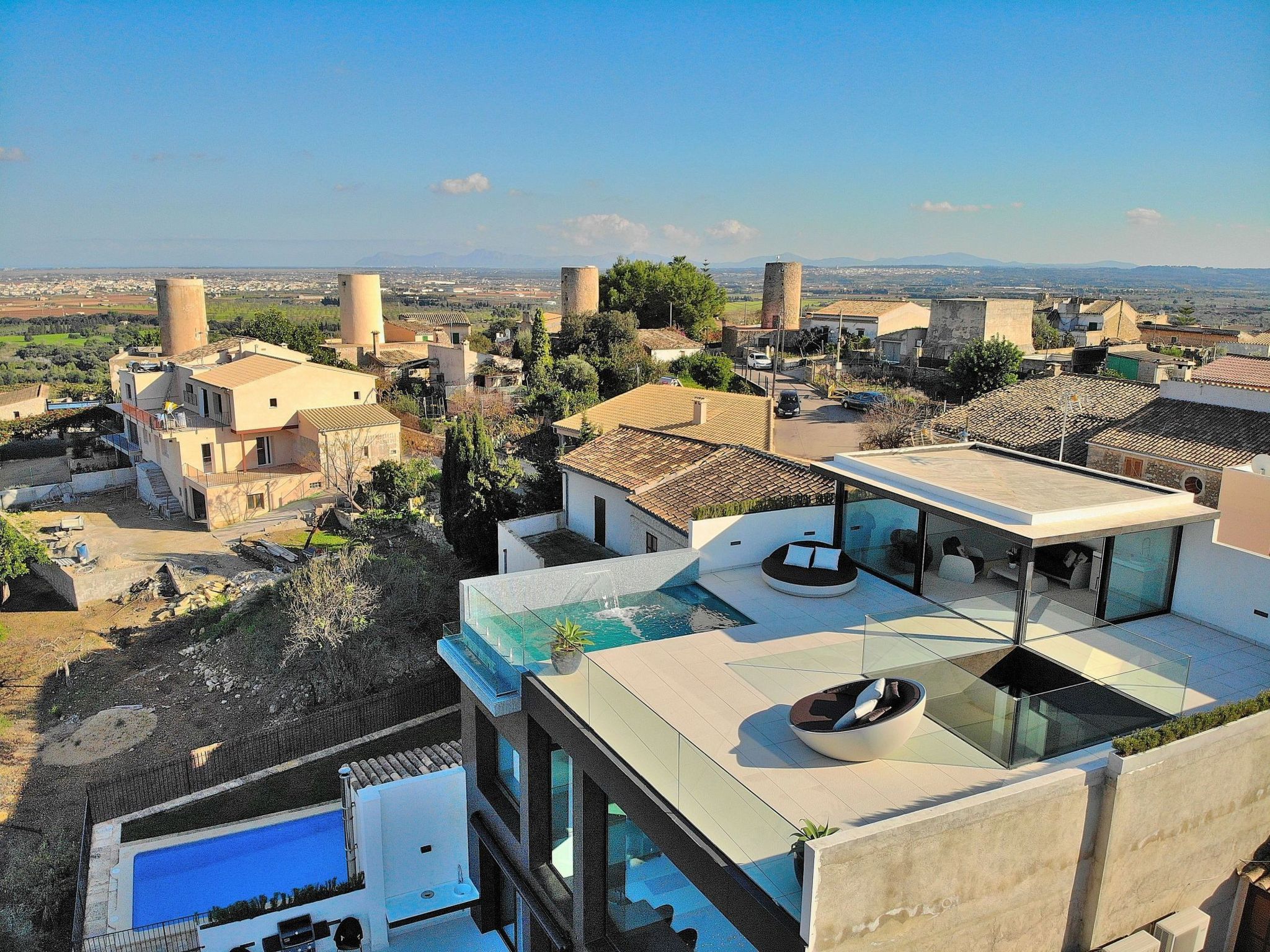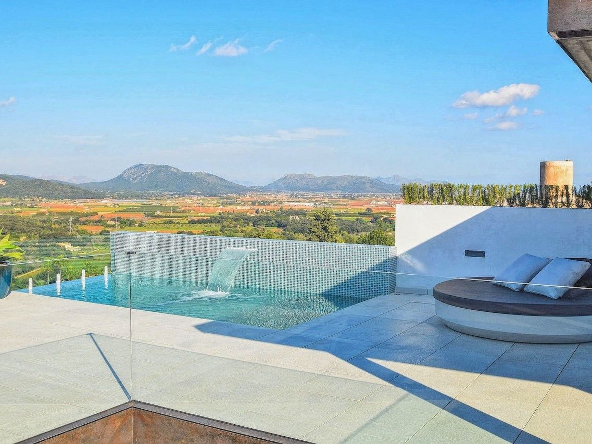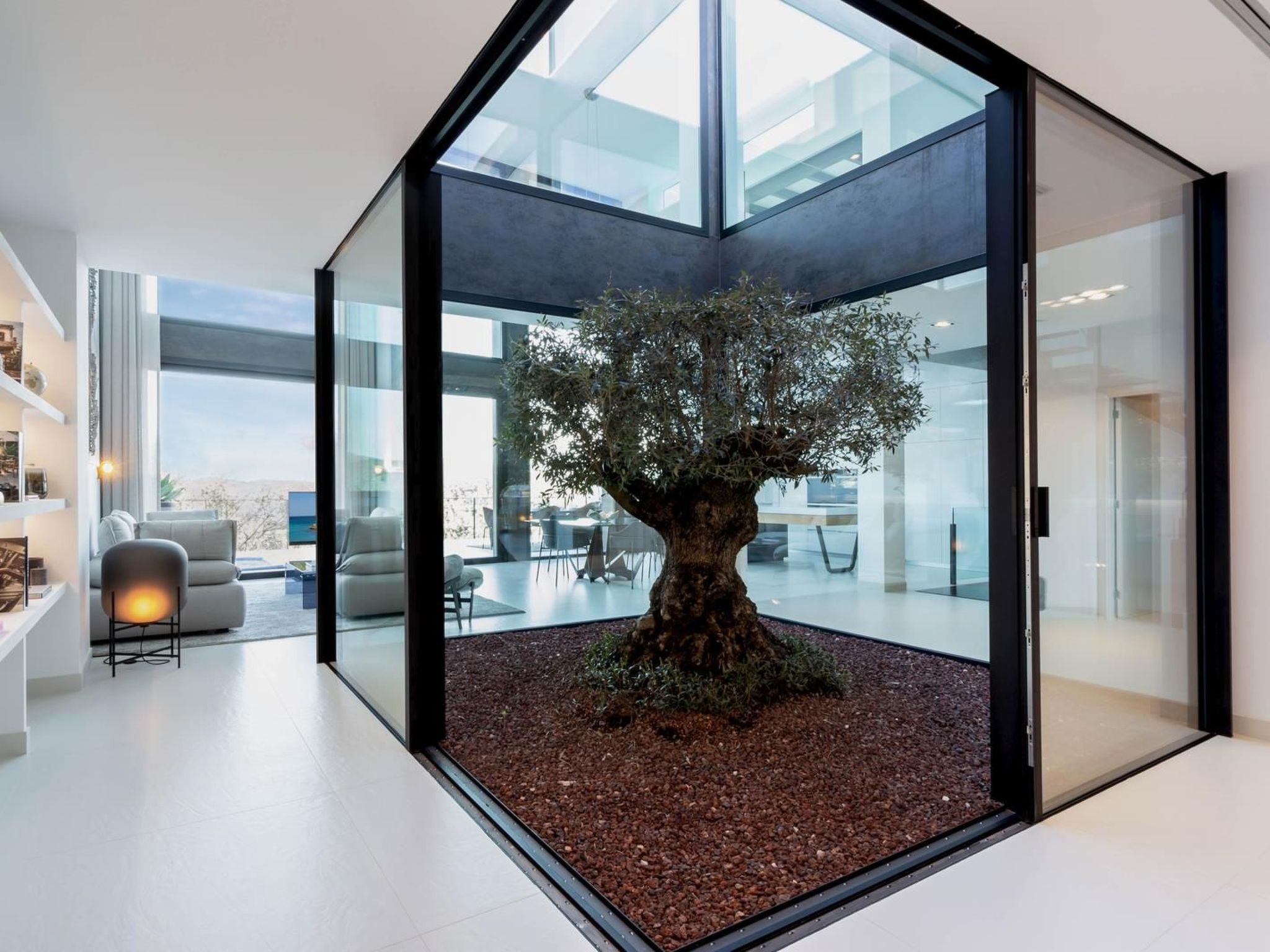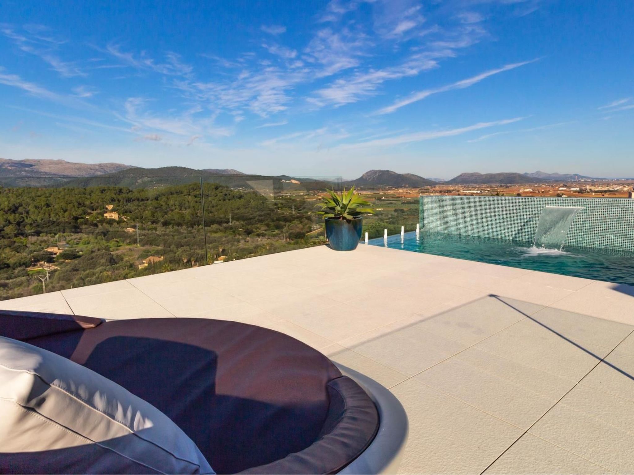 The house has an excellent architectural design, which is accompanied by a spectacular decoration and interior design. The quality of the furniture throughout the house stands out, with the presence of the best brands of high Italian, French, Scandinavian design... such as Cattelan, Lago, Ligne Roset, Arketipo... Behind this furniture there is the signature of great designers such as Philippe Starck, Claudio Dondoli, Marco Pocci, Andrea Lucatello, Sebastian Herkner, Mauro Lipparini, Giuseppe Viganò... The house stands out for its great luminosity and spaciousness, and the unconventional dimensions of the doors and windows are also surprising. Such as the single-leaf entrance doors, which are more than 1.70m wide and 3.50m high, or the garage door, which is almost 6m long. In addition, the privileged location of the house offers magnificent views of the Tramuntana mountain range. In order to be able to enjoy this splendid landscape from practically every corner of the property, the main façade has been equipped with 6 large windows, with the aim of framing the whole of the mountain. The largest single piece of glass is over 5m long and 3m high. The quality and design are still present in the kitchen, taps, bathrooms, toilets... signed by Porcelanosa, as well as in the electrical appliances with brands such as Bosch Neff... The terrace furniture, consisting of outdoor dining room, sun loungers, hammocks, rugs... is by Vondom. The lighting is from brands such as Foscarini, Artemide, Pulpo... In the centre of the house there is a centenary olive tree (more than 200 years old). The swimming pool is located on the rooftop, in order to maximize the great potential of the views, thus obtaining a panoramic view of practically the entire Sierra de Tramuntana mountain range and even the sea of the Bay of Alcudia. In addition, one of the walls of the pool is made of glass, which allows the light and the movement of the water to be reflected inside the house and at the same time the dining room and the living room can be observed from the bottom of the pool.
