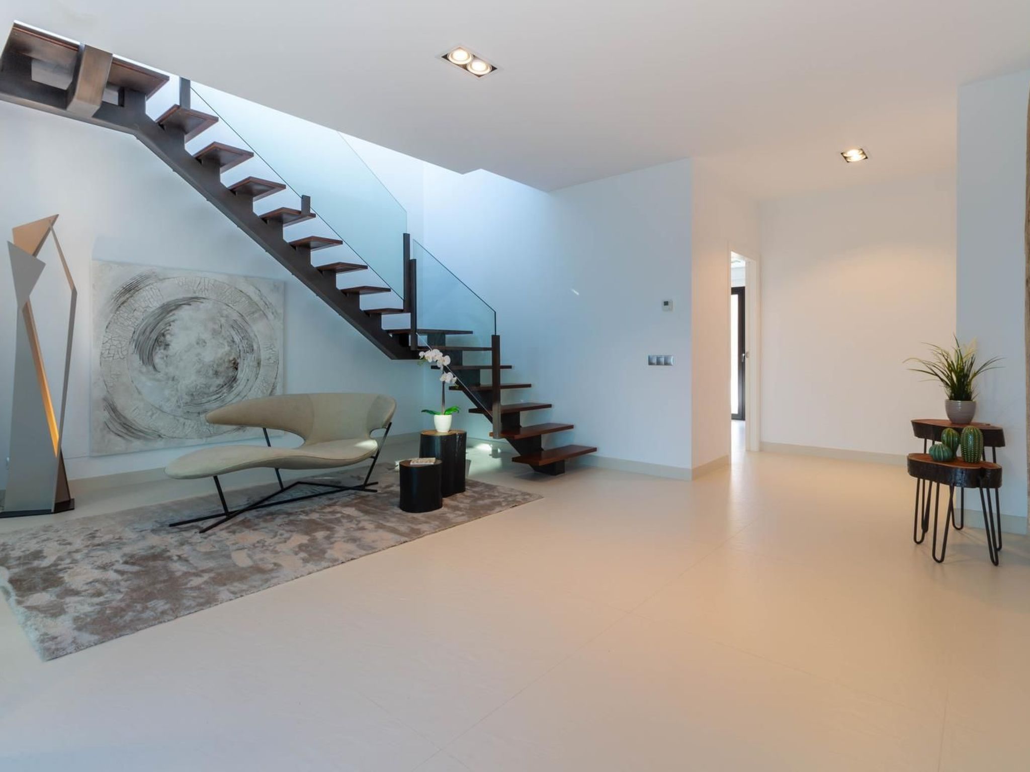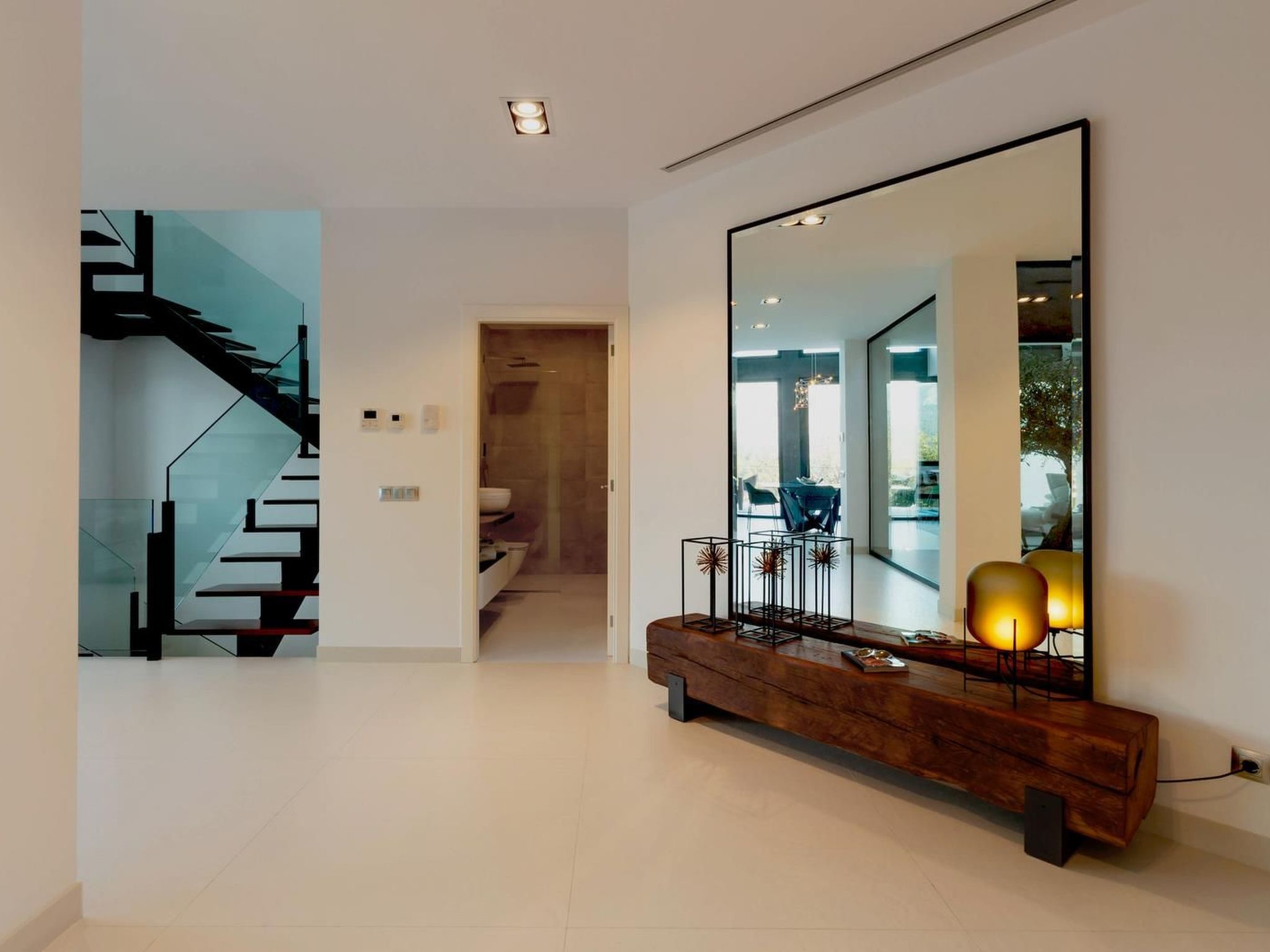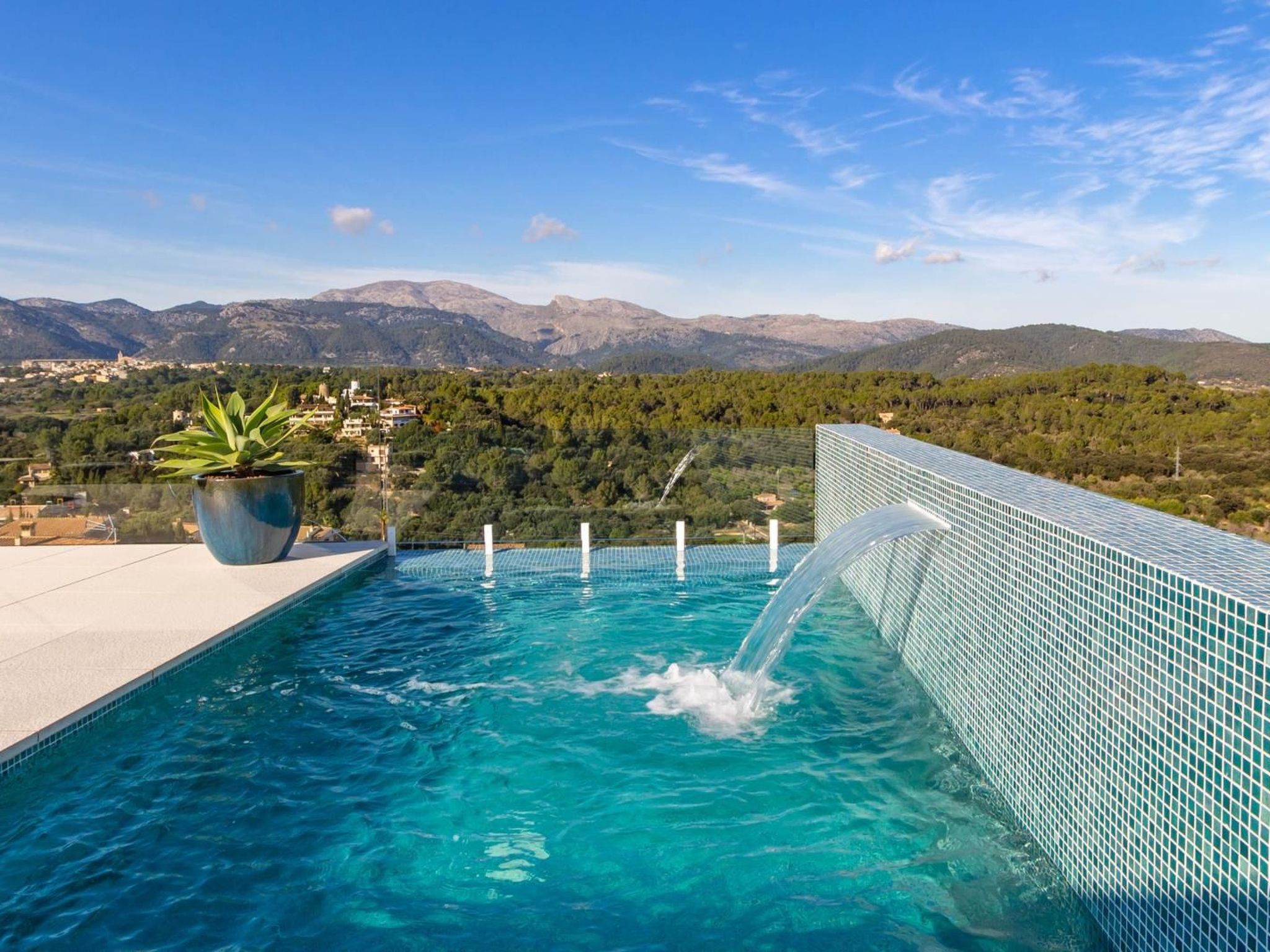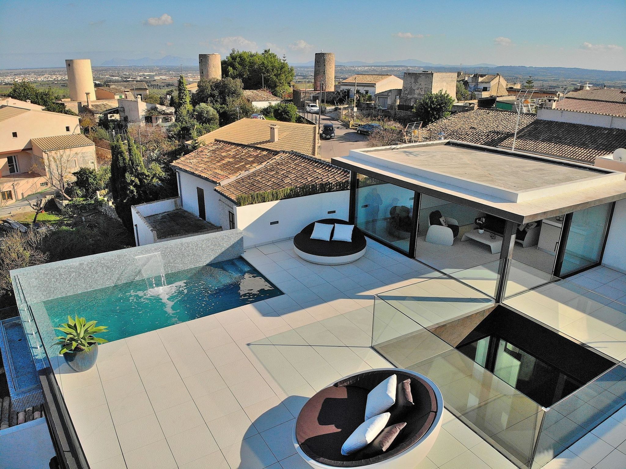 The house has an excellent architectural design, which is accompanied by a spectacular decoration and interior design. The quality of the furniture throughout the house stands out, with the presence of the best brands of high Italian, French, Scandinavian design... such as Cattelan, Lago, Ligne Roset, Arketipo... Behind this furniture there is the signature of great designers such as Philippe Starck, Claudio Dondoli, Marco Pocci, Andrea Lucatello, Sebastian Herkner, Mauro Lipparini, Giuseppe Viganò... The house stands out for its great luminosity and spaciousness, and the unconventional dimensions of the doors and windows are also surprising. Such as the single-leaf entrance doors, which are more than 1.70m wide and 3.50m high, or the garage door, which is almost 6m long. In addition, the privileged location of the house offers magnificent views of the Tramuntana mountain range. In order to be able to enjoy this splendid landscape from practically every corner of the property, the main façade has been equipped with 6 large windows, with the aim of framing the whole of the mountain. The largest single piece of glass is over 5m long and 3m high. The quality and design are still present in the kitchen, taps, bathrooms, toilets... signed by Porcelanosa, as well as in the electrical appliances with brands such as Bosch Neff... The terrace furniture, consisting of outdoor dining room, sun loungers, hammocks, rugs... is by Vondom. The lighting is from brands such as Foscarini, Artemide, Pulpo... In the centre of the house there is a centenary olive tree (more than 200 years old). The swimming pool is located on the rooftop, in order to maximize the great potential of the views, thus obtaining a panoramic view of practically the entire Sierra de Tramuntana mountain range and even the sea of the Bay of Alcudia. In addition, one of the walls of the pool is made of glass, which allows the light and the movement of the water to be reflected inside the house and at the same time the dining room and the living room can be observed from the bottom of the pool.