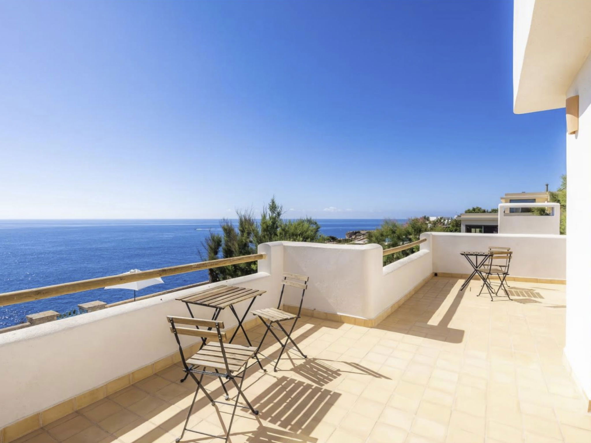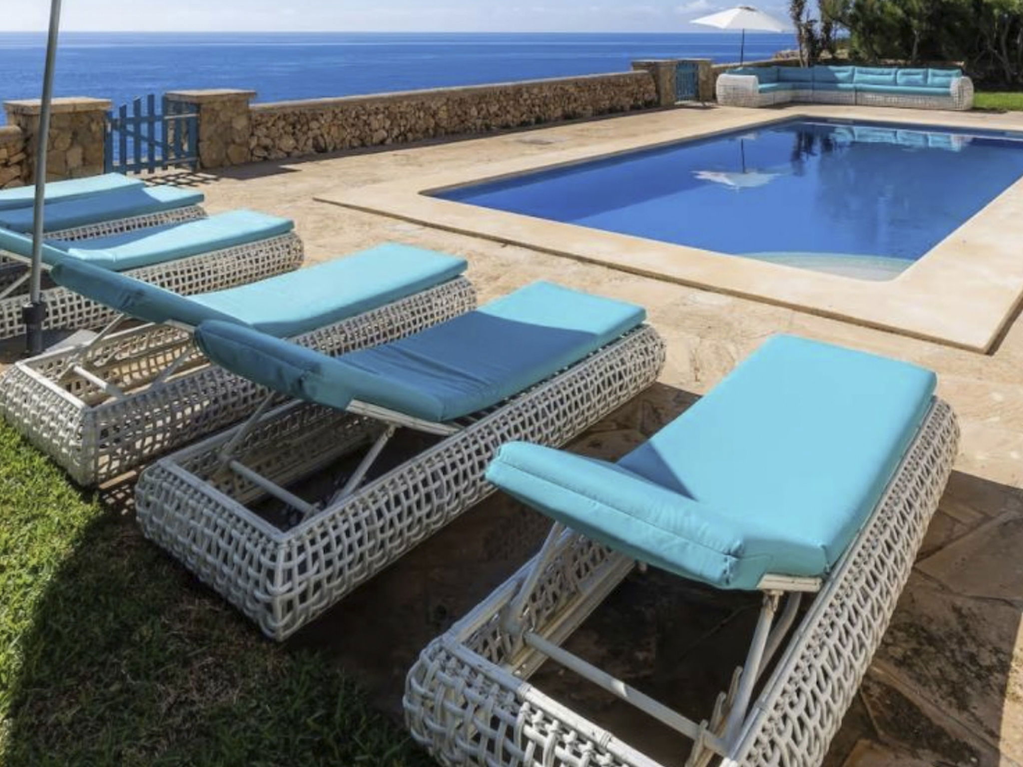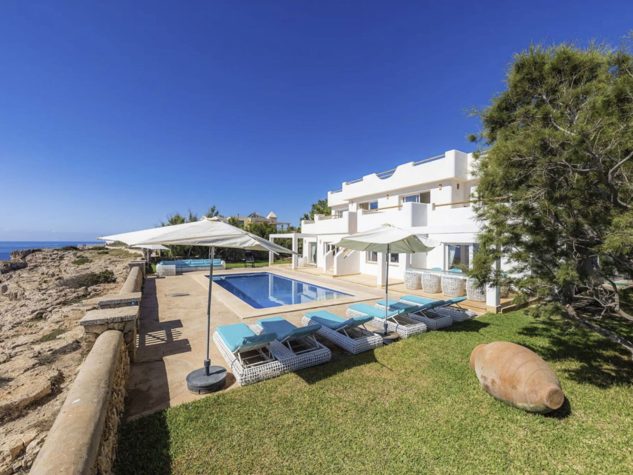 Seven bathrooms are available, five of which are ensuite to the bedrooms. All bedrooms and the living area are air-conditioned. Some of the bedrooms on the upper floor have access to the terrace. From there, the pool terrace can be reached via an external staircase to the garden, and with private access you are also directly on the rocky coast.