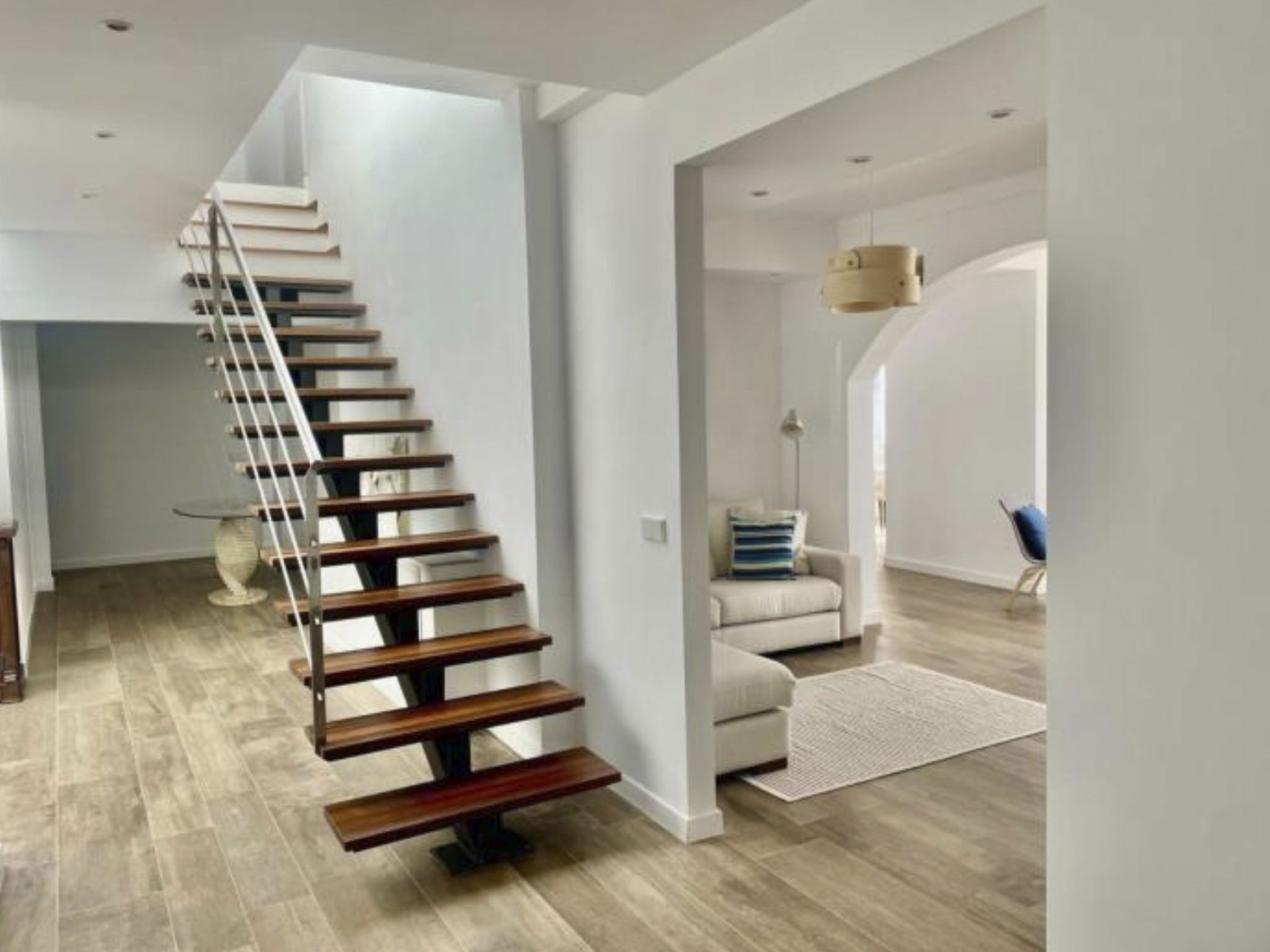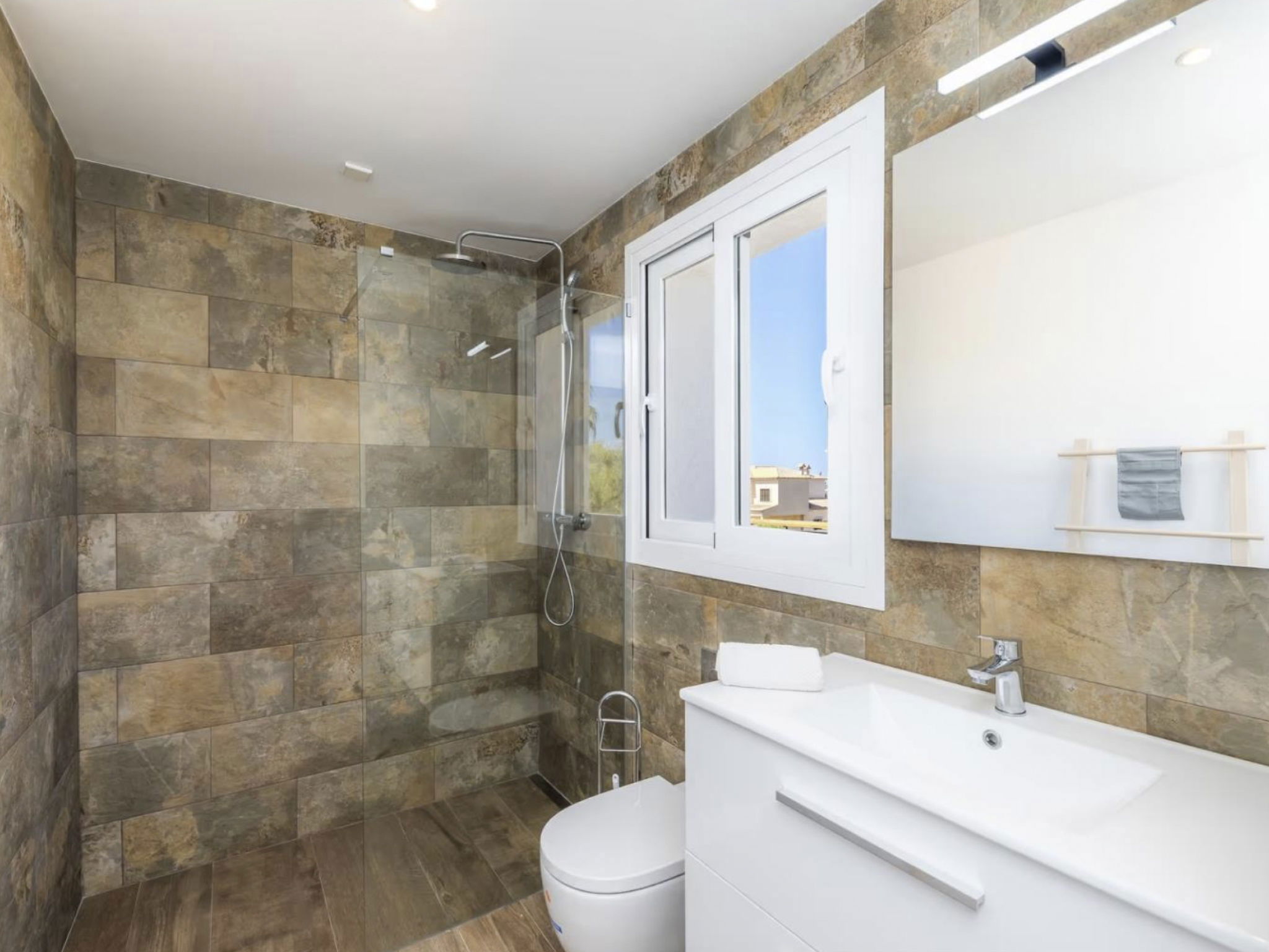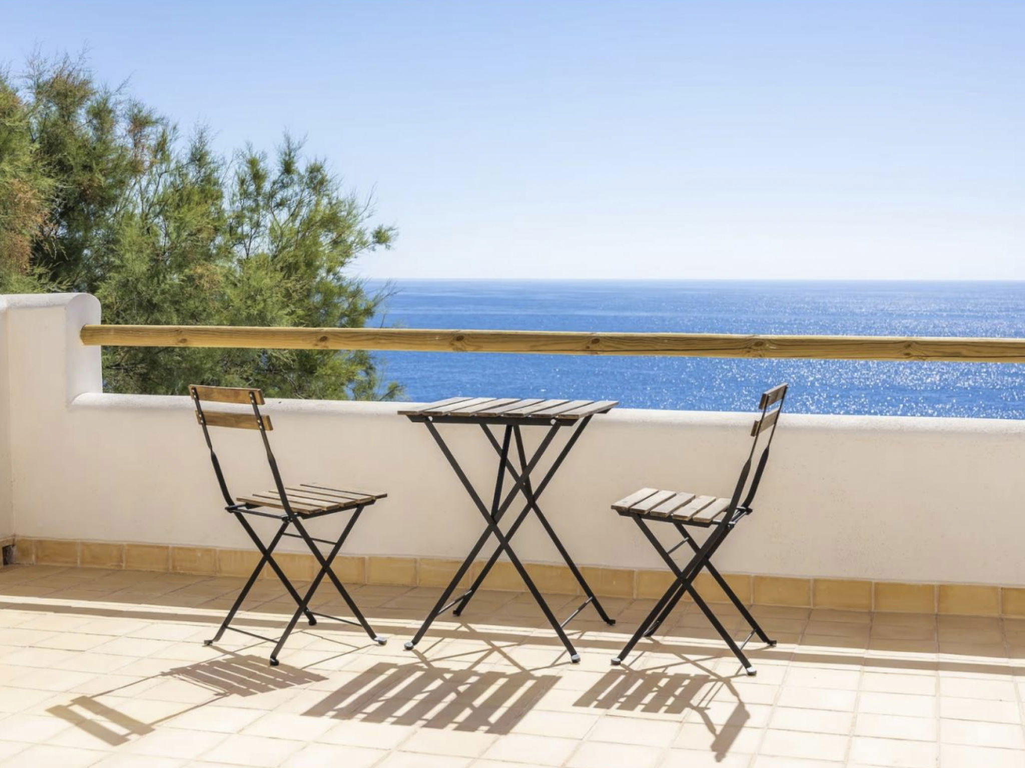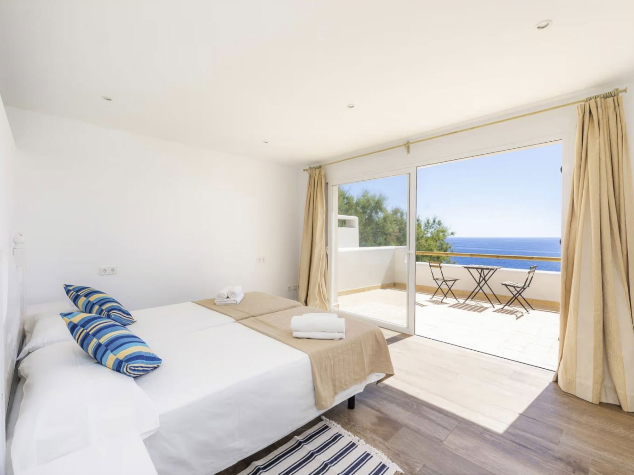 Seven bathrooms are available, five of which are ensuite to the bedrooms. All bedrooms and the living area are air-conditioned. Some of the bedrooms on the upper floor have access to the terrace. From there, the pool terrace can be reached via an external staircase to the garden, and with private access you are also directly on the rocky coast.