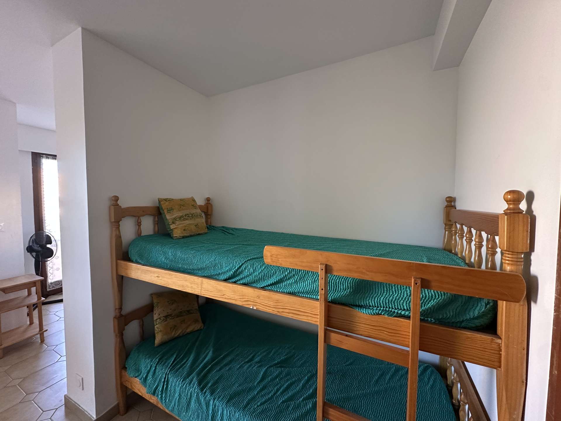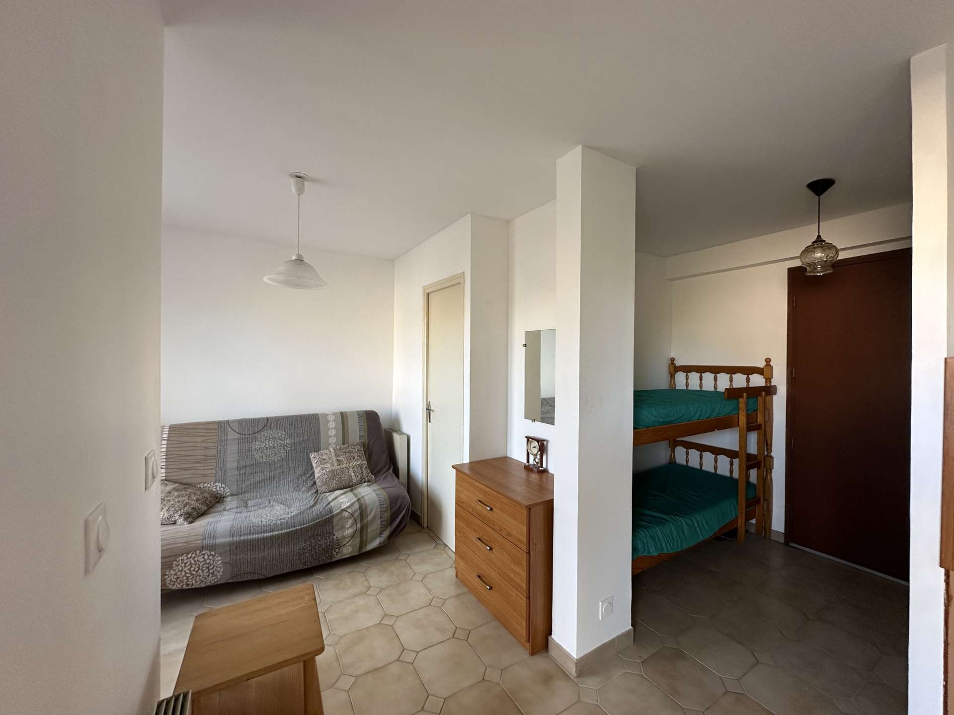 The studio apartment comprises a fully equipped kitchen, a living room with a sofa bed and a sleeping area with bunk beds, and a bathroom with toilet.