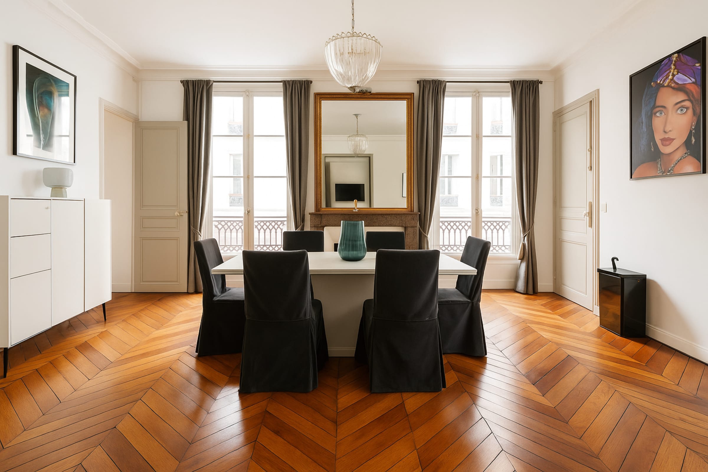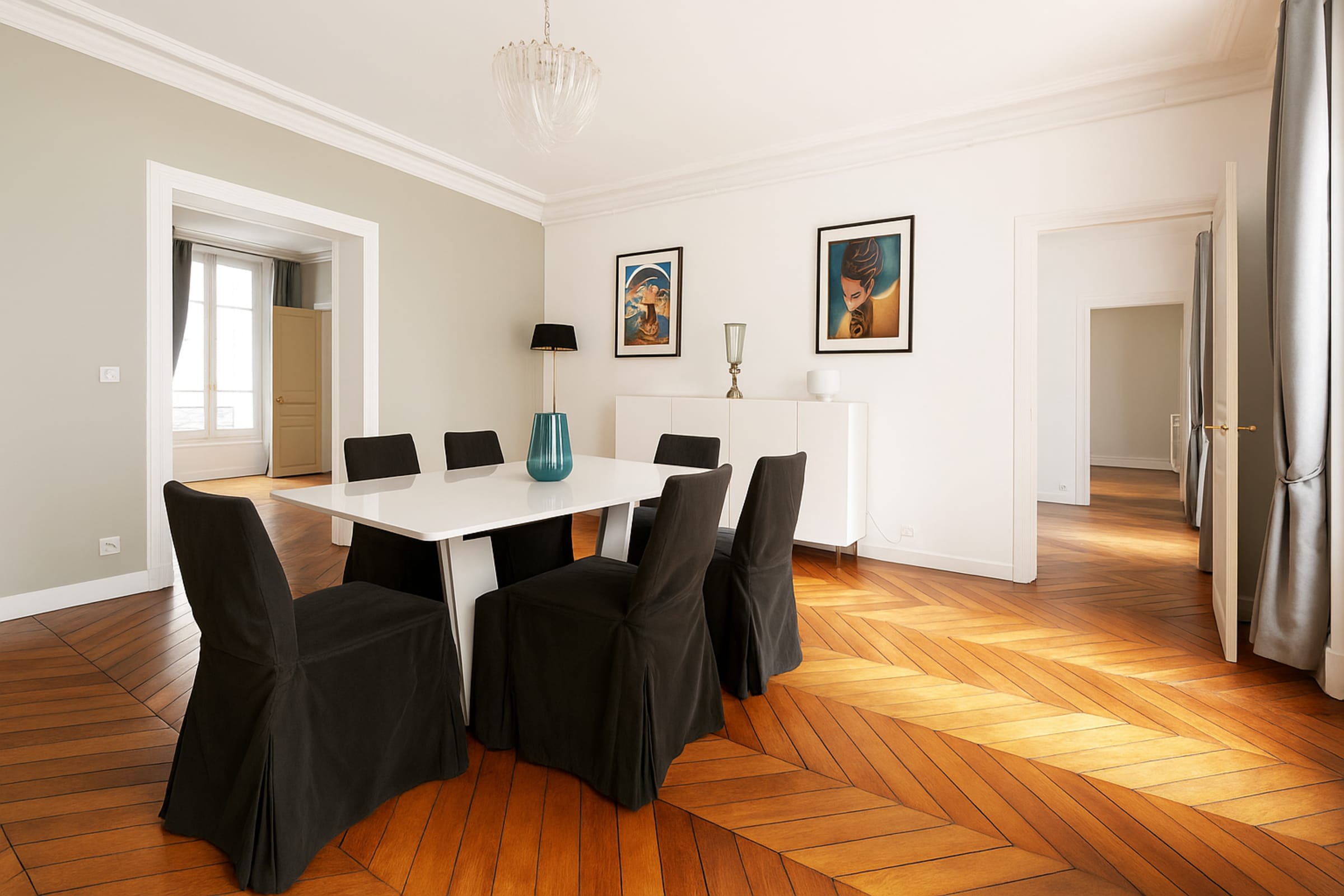 As soon as you arrive, you’ll be captivated by the spacious dining room, bathed in natural light and featuring an elegant table for six guests. Artistic paintings adorn the walls, adding a refined and contemporary touch to the space.