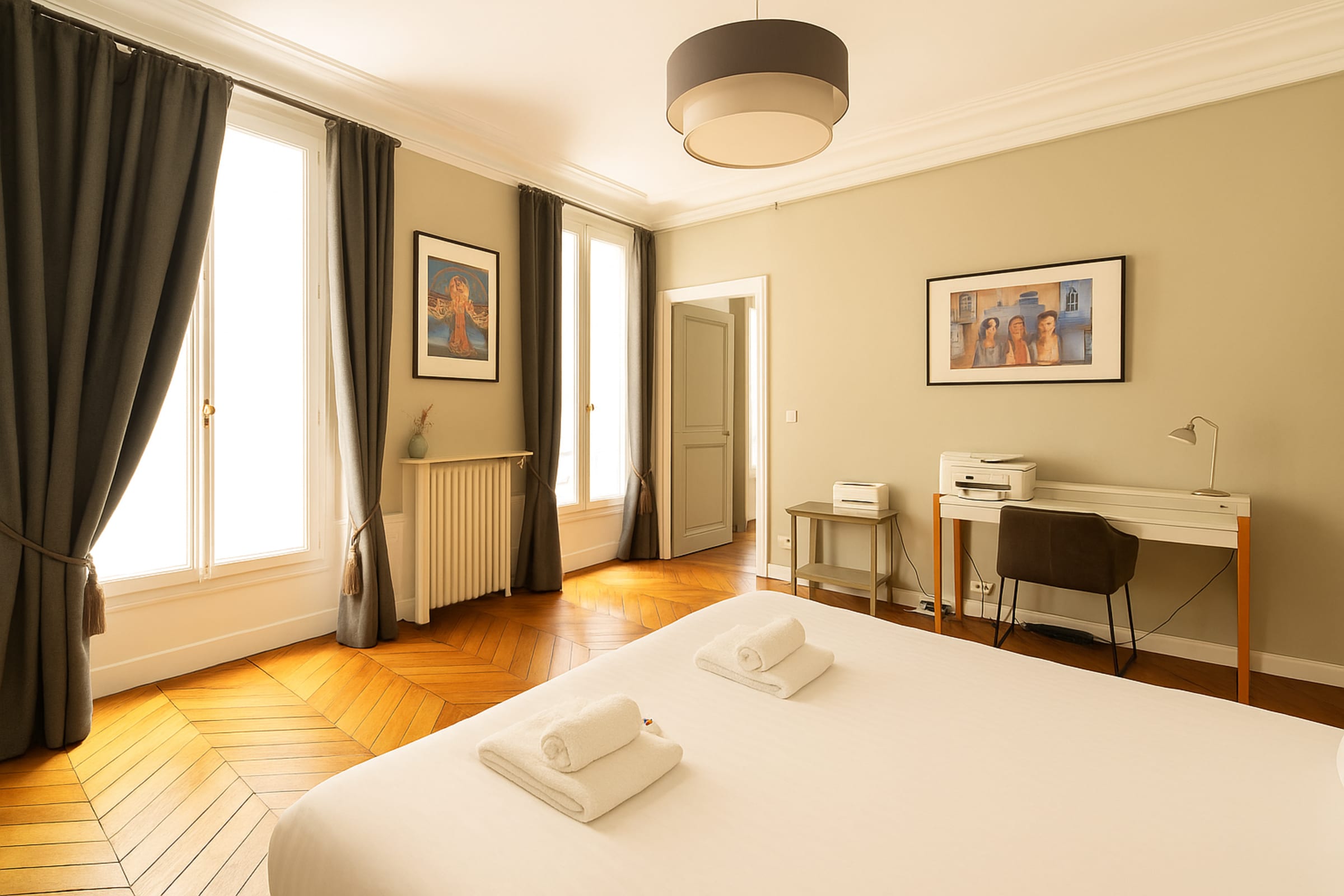 The and the second bedrooms stands out with their artistic flair and ultra-comfortable double bed, dressed in luxury hotel linens. You’ll also find a large mirror, practical storage, and an open ensuite bathroom featuring a newly renovated Italian-style shower and WC.