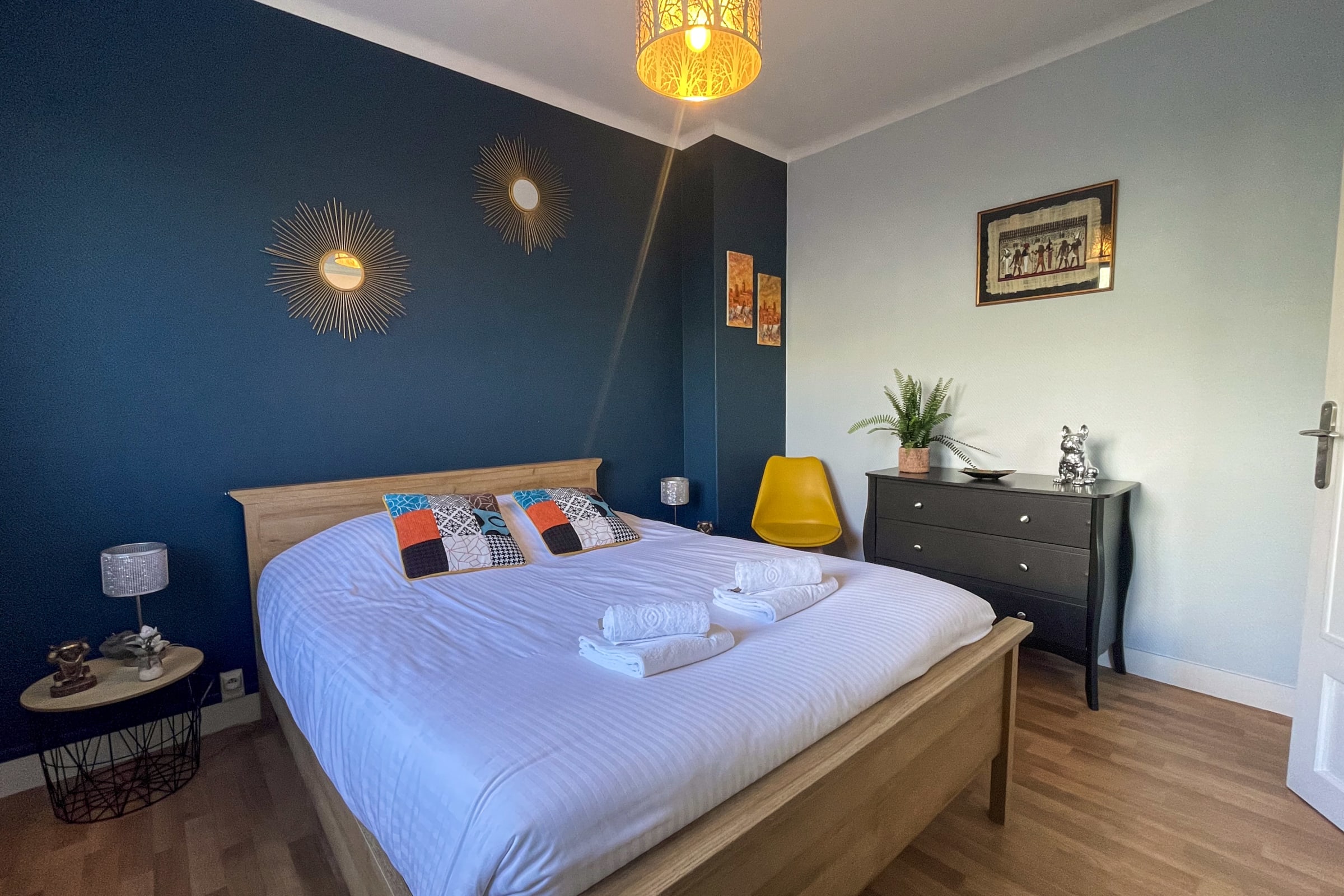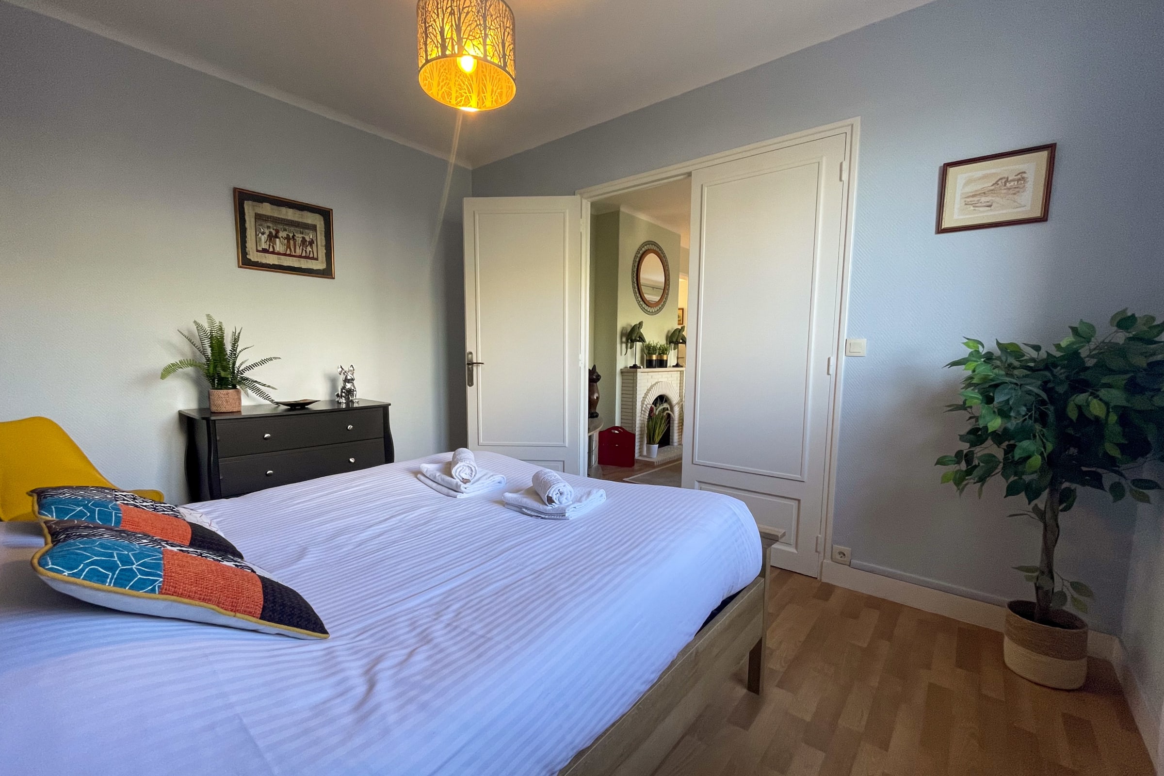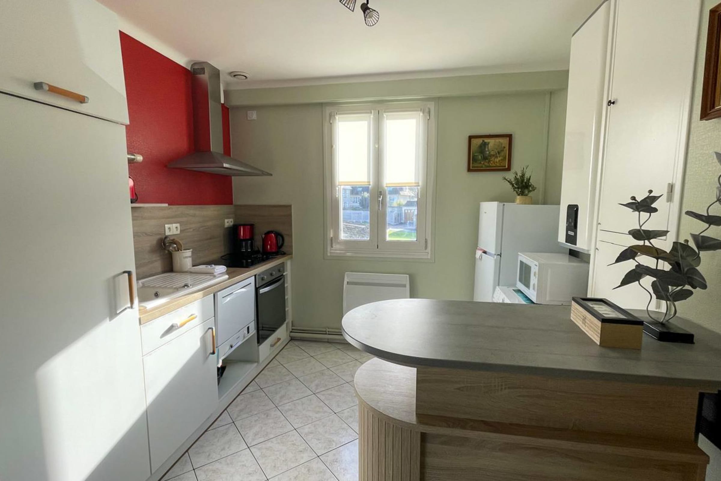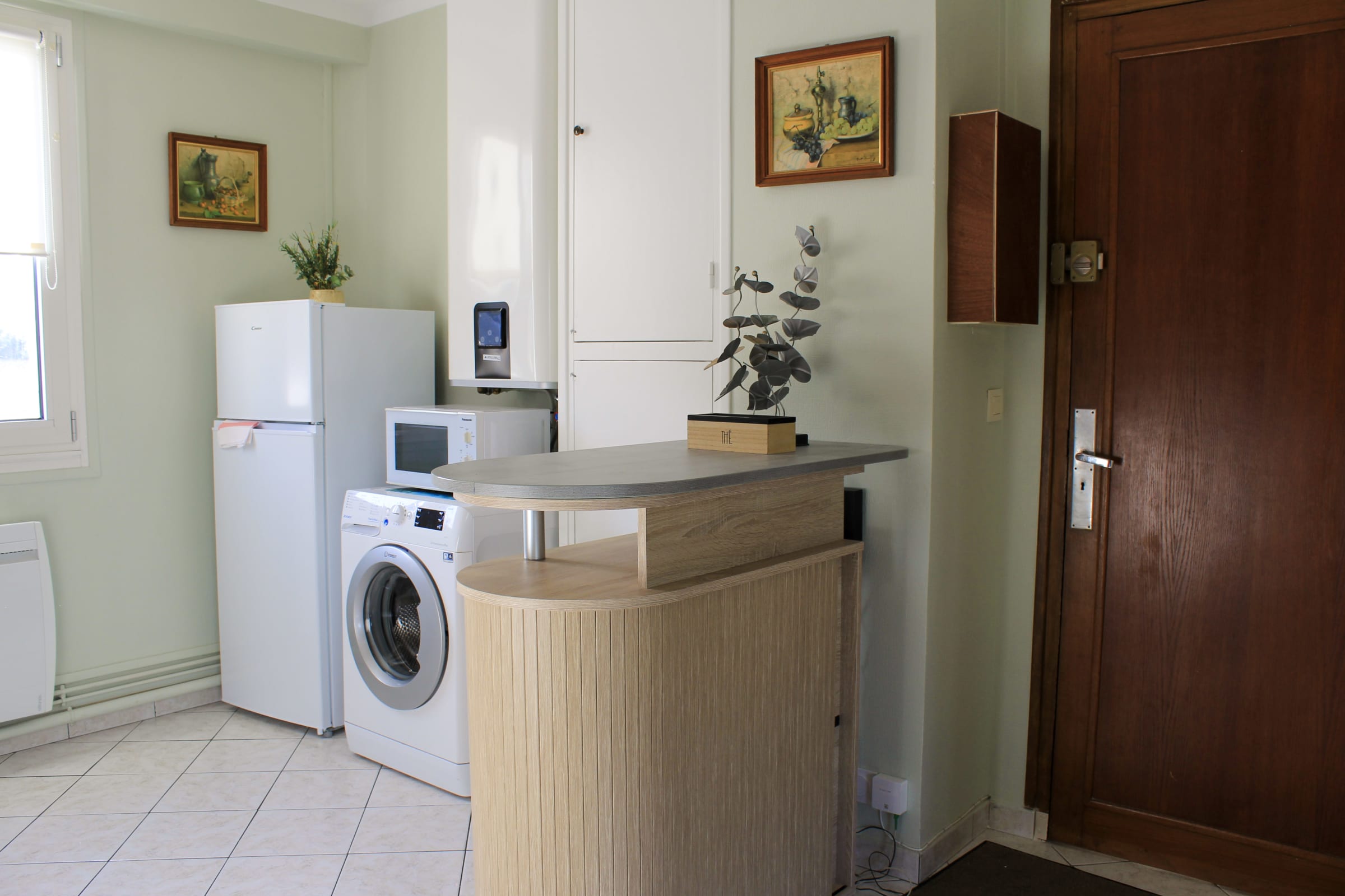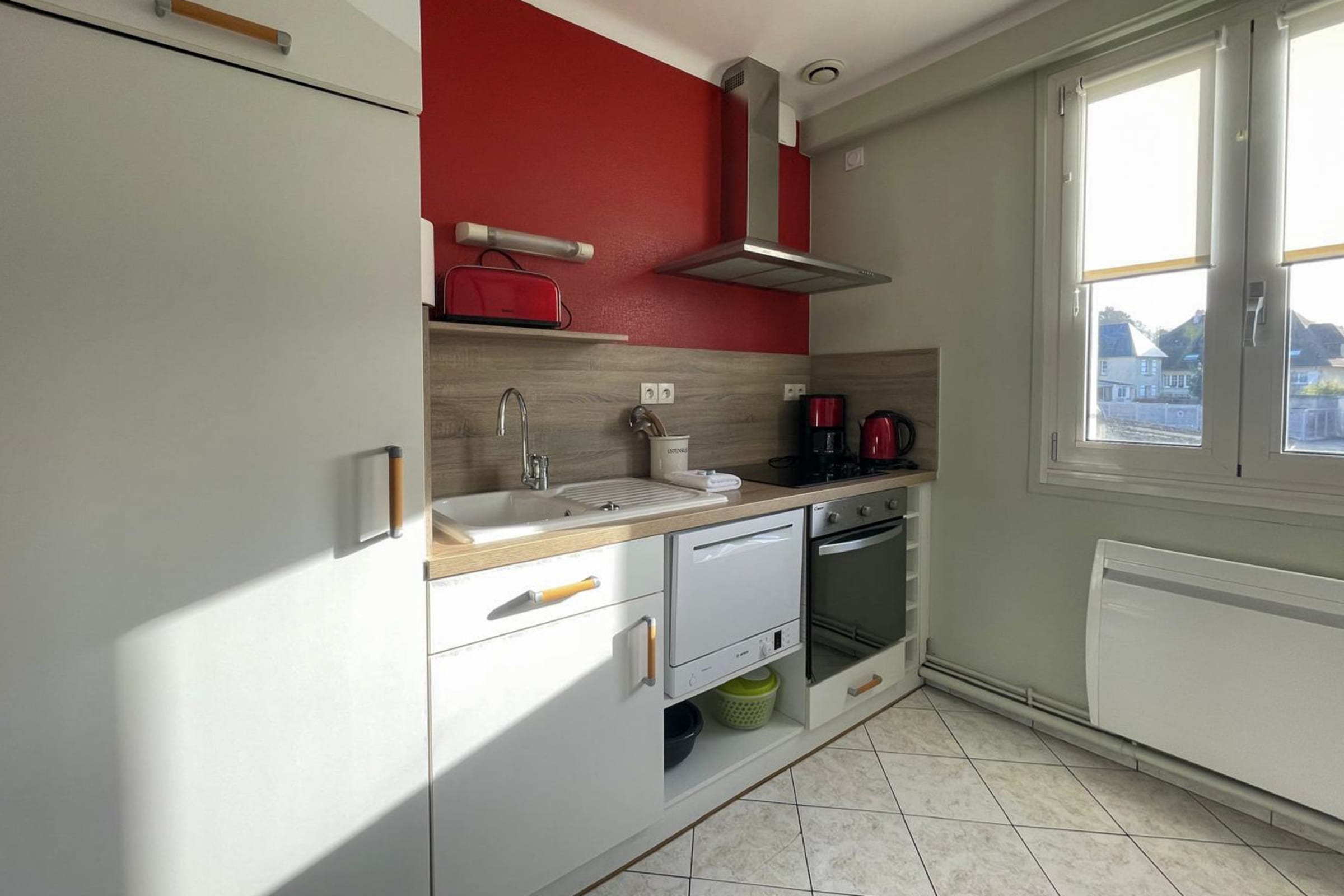 Apartment located on the floor of a typical Arromanches-les-Bains building. Very bright and quiet, with an open-plan kitchen and dining room. The dining room has a balcony with views of the museum, the town, and the artificial harbor. Tourist office, shops, and restaurants nearby.