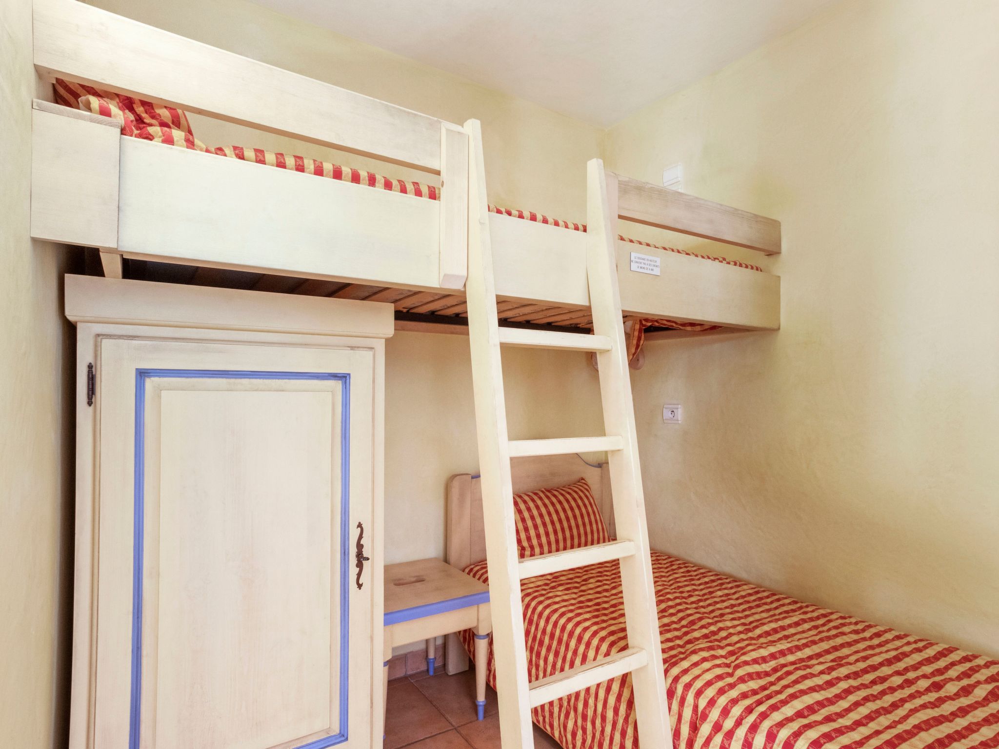 Decorated in Provençal style, the 35 m² flat has three fully furnished and equipped rooms for up to 4 people. It has a kitchenette (ceramic hob, oven, dishwasher, microwave, toaster), a living/dining room, a television, free Wi-Fi via fibre optic, a cabin with two bunk beds for children, a bedroom with a 1.60 m-wide bed, a bathroom (bath, washbasin), separate WC, and a large terrace with garden furniture, extending the living space. A number of features have recently been upgraded.