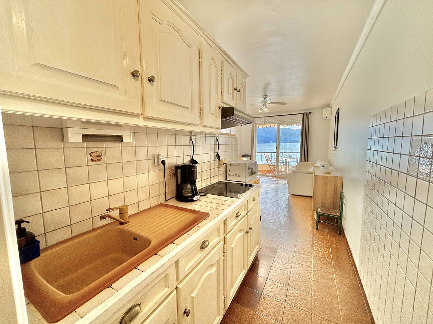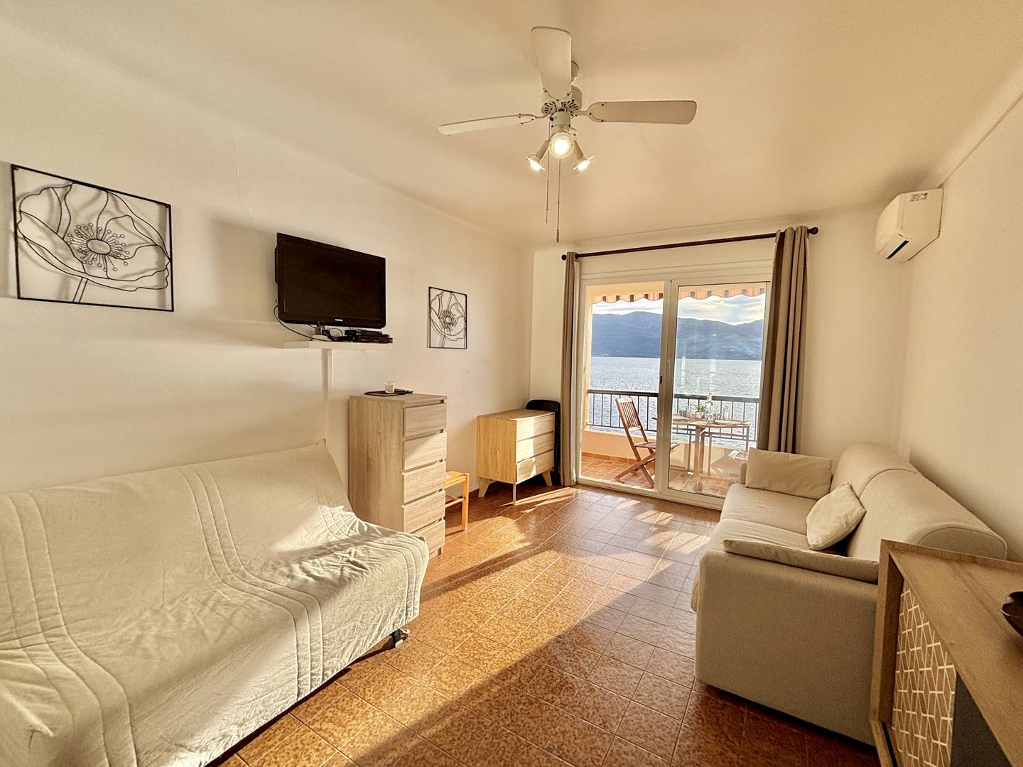 The studio apartment includes: an entrance hall, a bathroom with shower, toilet, and washing machine, a living area with a large, fully equipped kitchen and a sofa bed, a television, all opening onto a small terrace with breathtaking sea views. Air conditioning is provided in the living room.