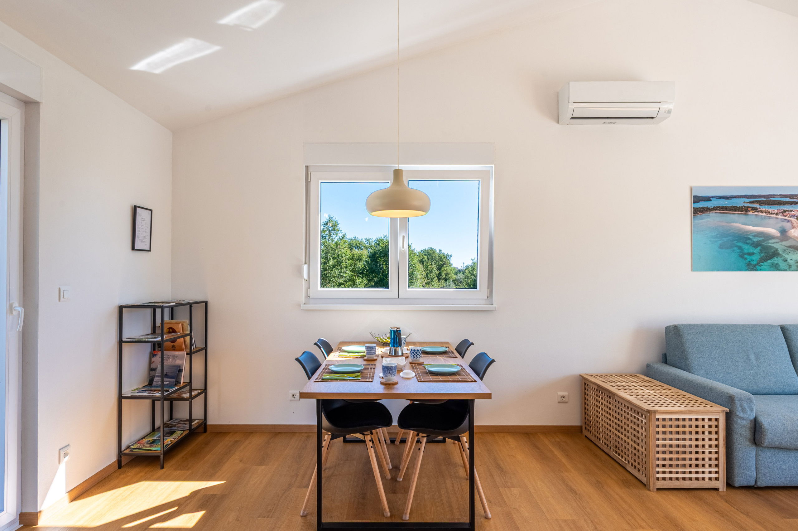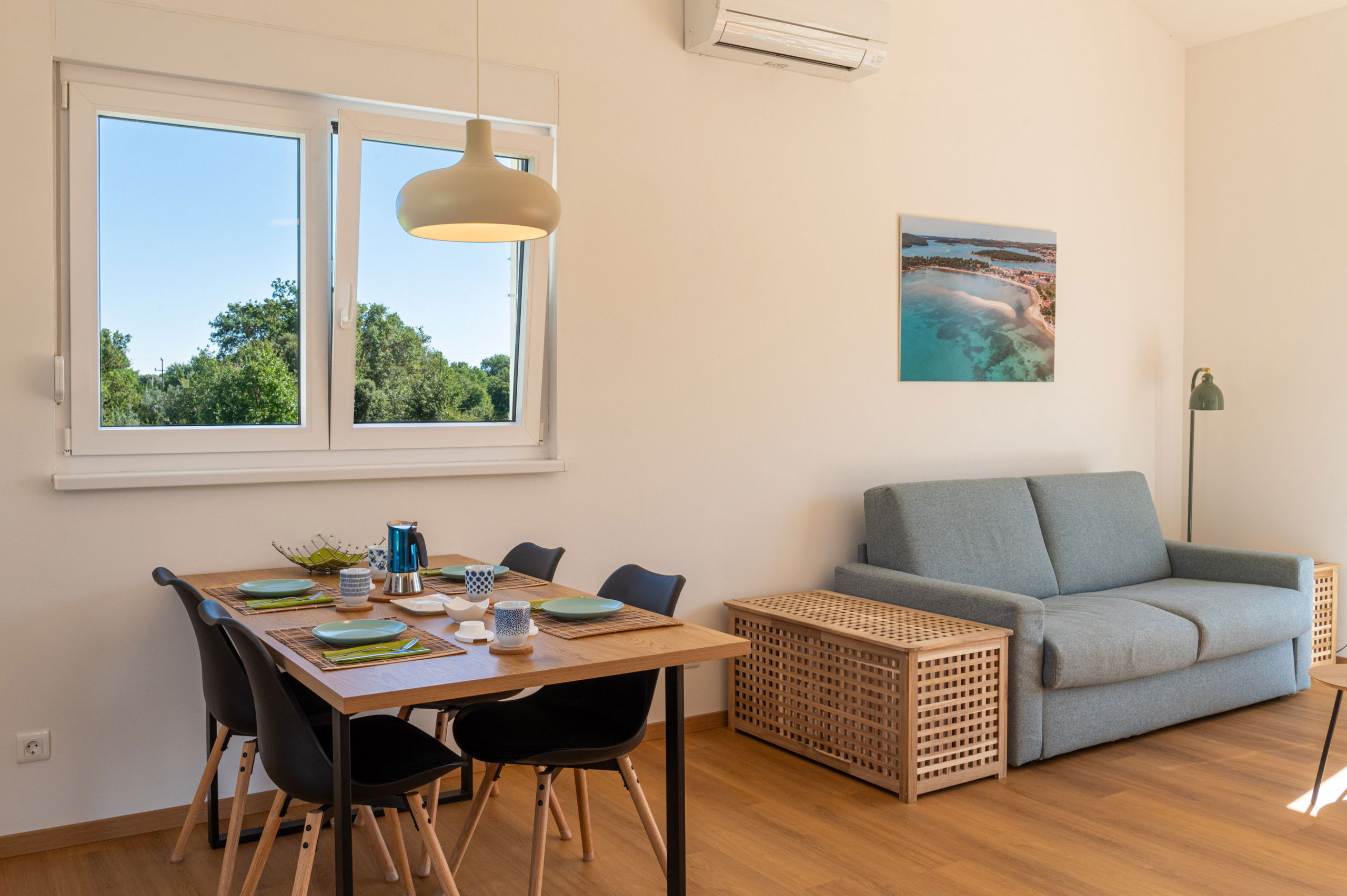 Both the bedroom and living room have an air conditioning unit.