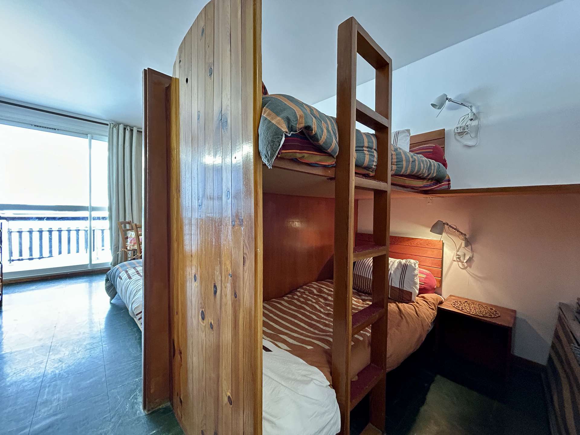 The living room has a sleeping area separated by a curtain with bunk beds in 80x190 and a living area with a double bed in 140x200, as well as a television.
