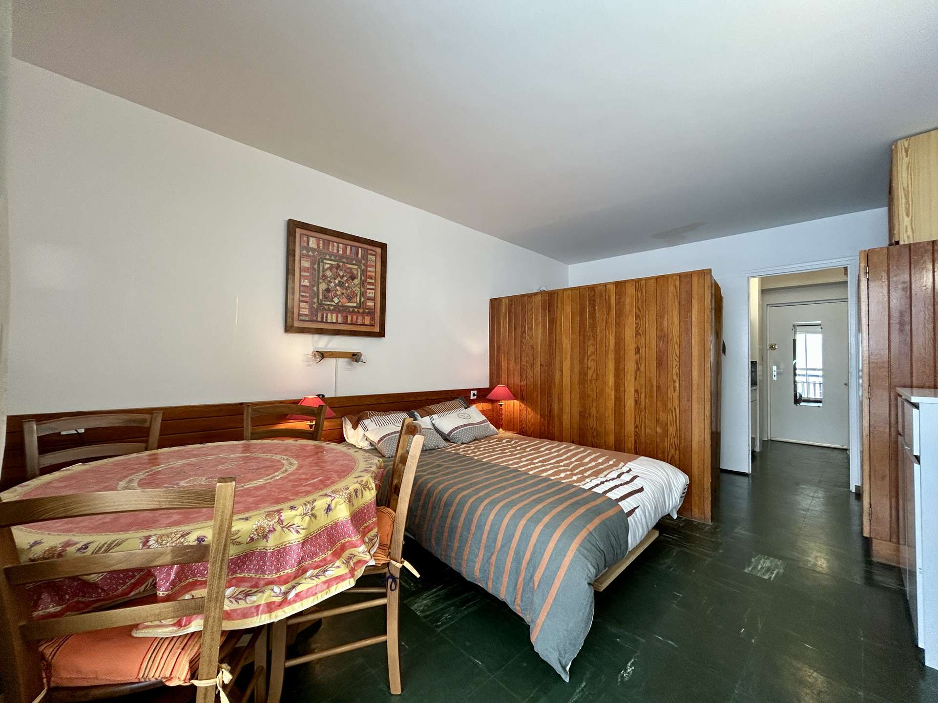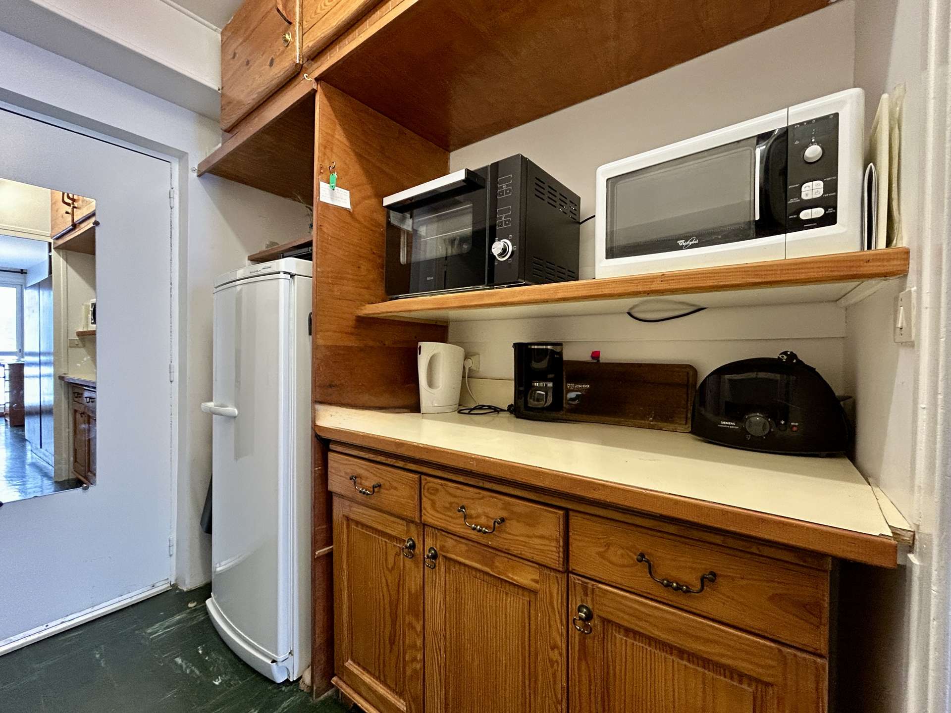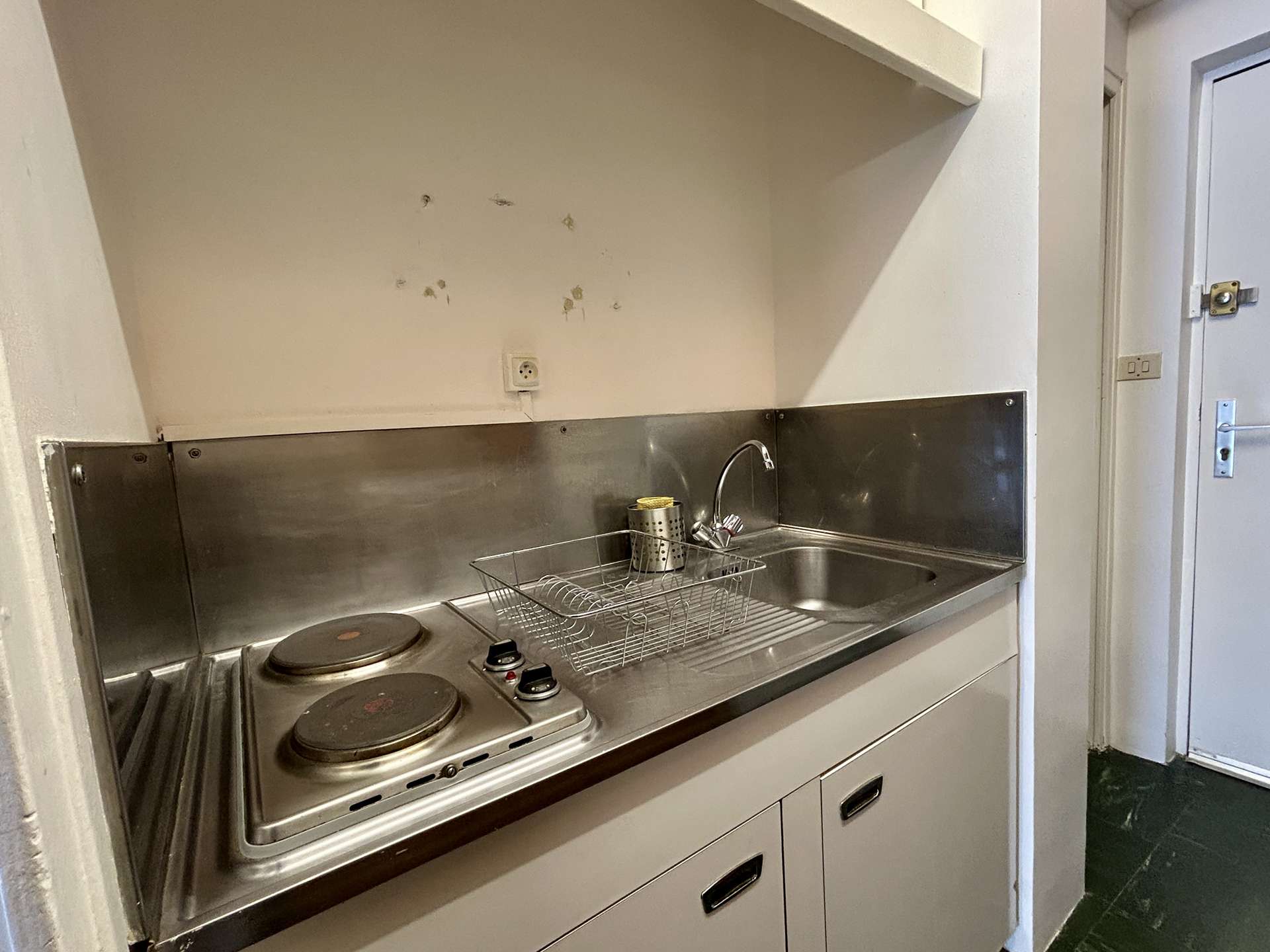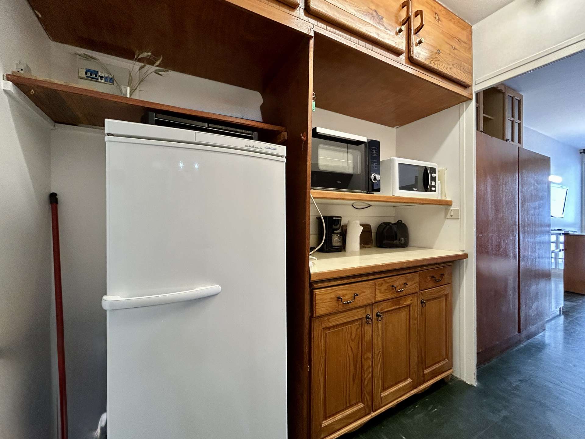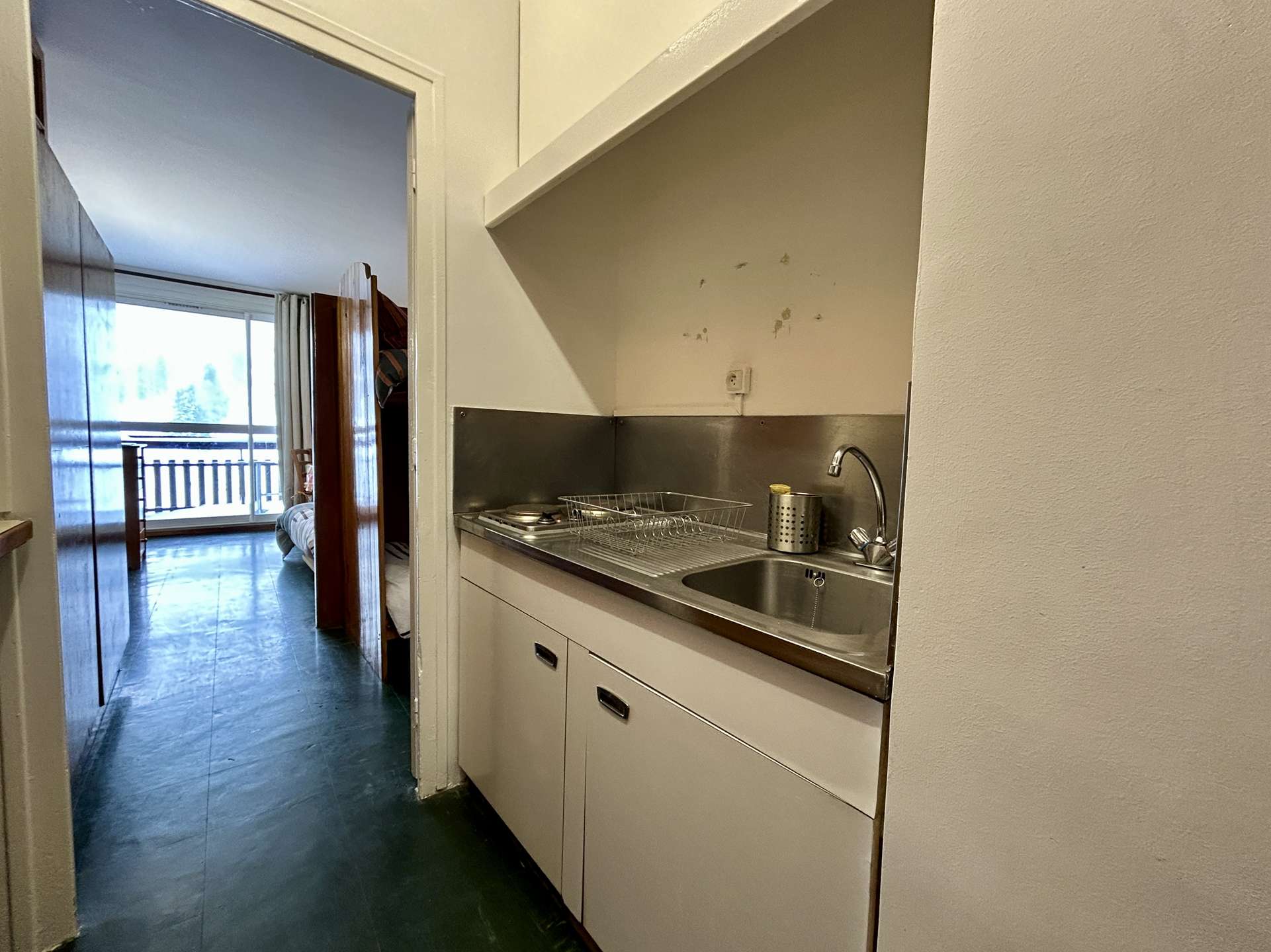 It includes an entrance hall leading to the bathroom with WC, a separate kitchen equipped with a mini oven, a microwave, 2 electric hobs, an electric coffee maker, a toaster and a kettle.