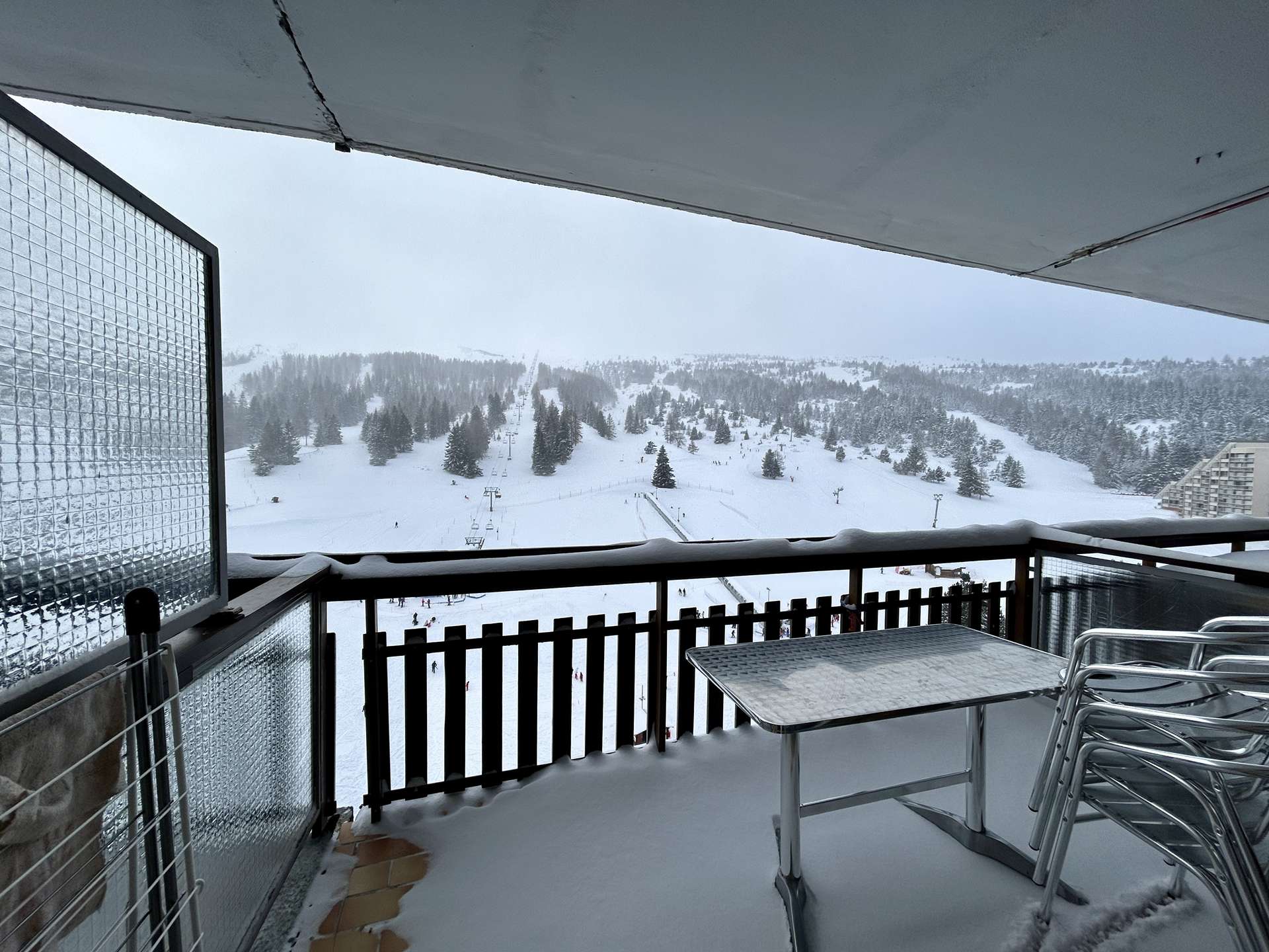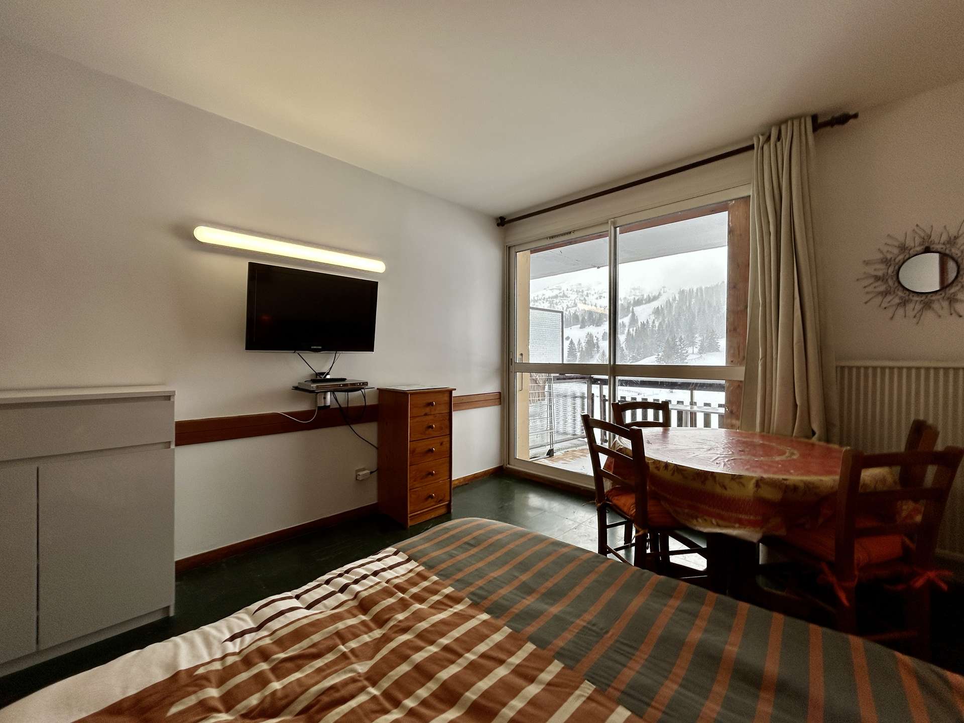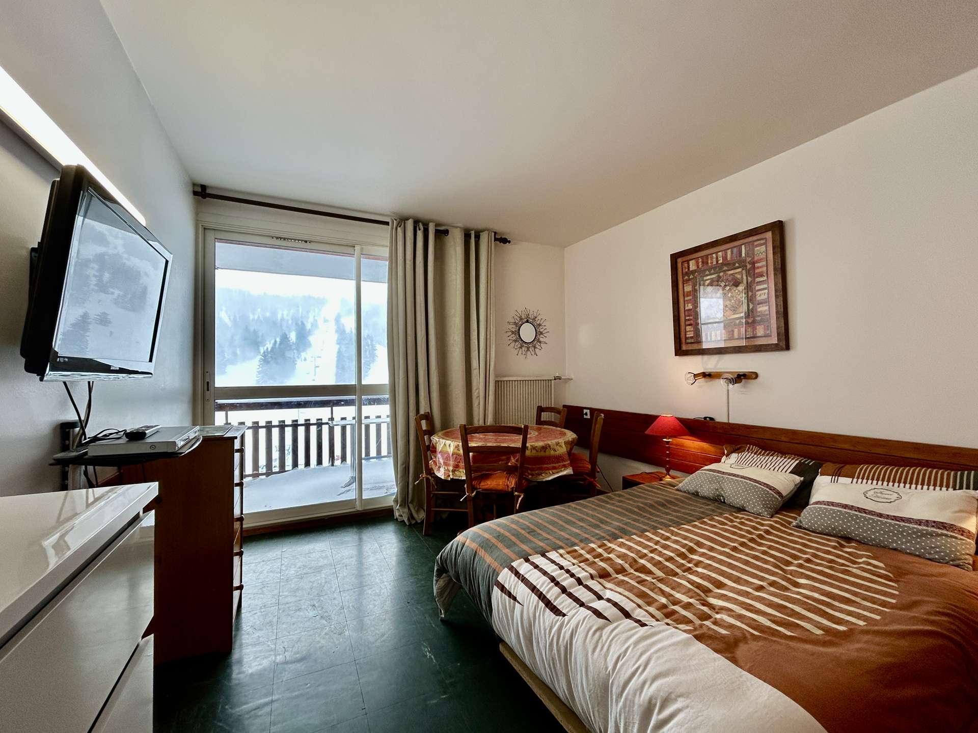The "Le Bois d'Aurouze" residence is ideally located, just 50 meters from the Le Jas chairlift. This mountain studio apartment is on the 10th floor of the residence. Facing southwest, it offers a magnificent view of the ski slopes.