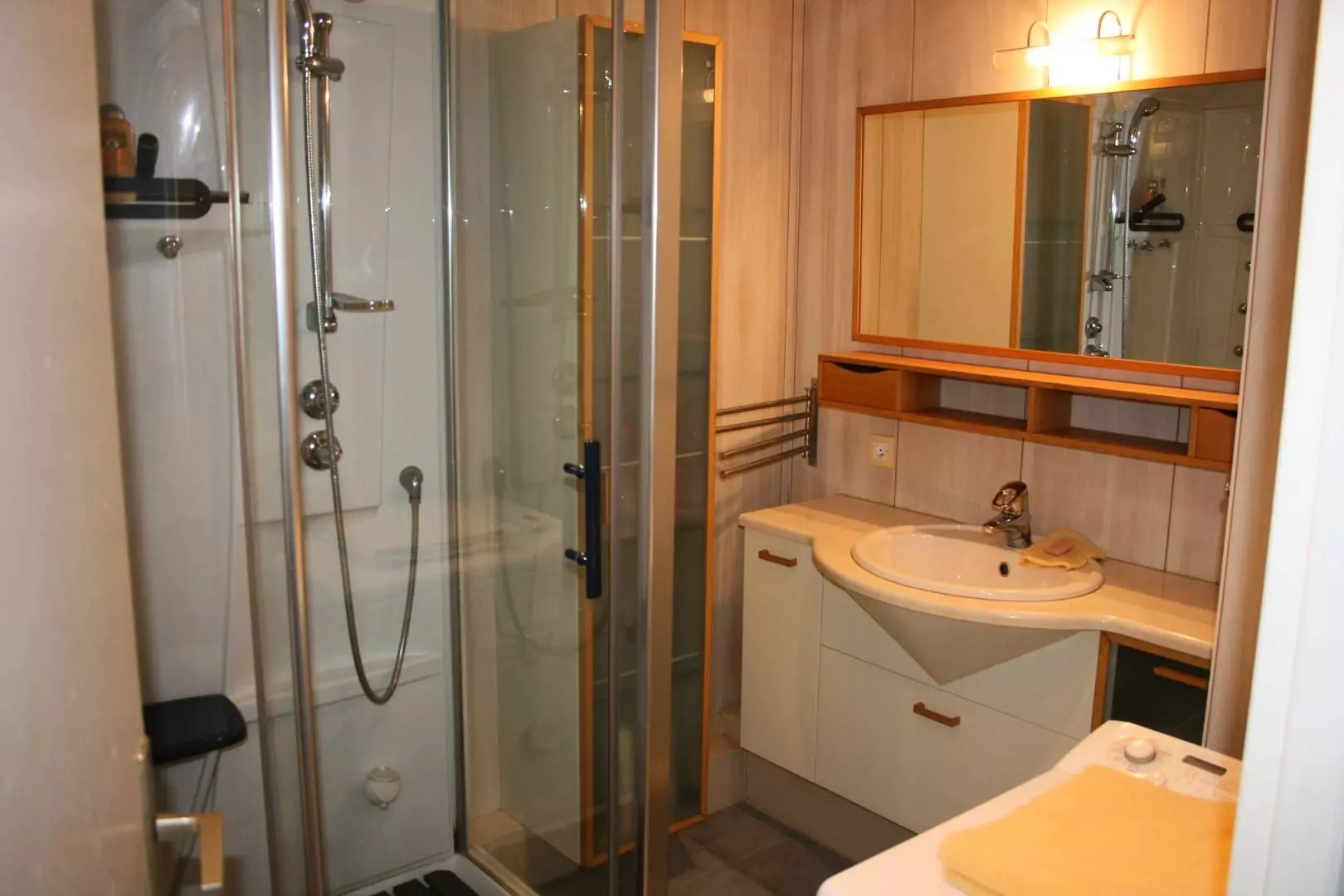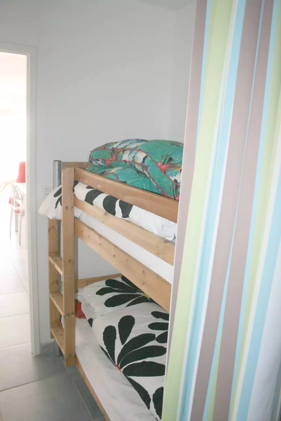 PORNICHET, SEAFRONT, raised ground floor apartment of approximately 60 m2, comprising: an entrance cabin with 2 bunk beds, a living room (table and chairs, two sofas and television) with kitchenette (Fridge-Freezer, electric oven, hob, dishwasher, microwave) opening onto a sea-facing terrace, a bedroom with a double bed, a bedroom with a double bed, a shower room with washing machine and a separate WC.