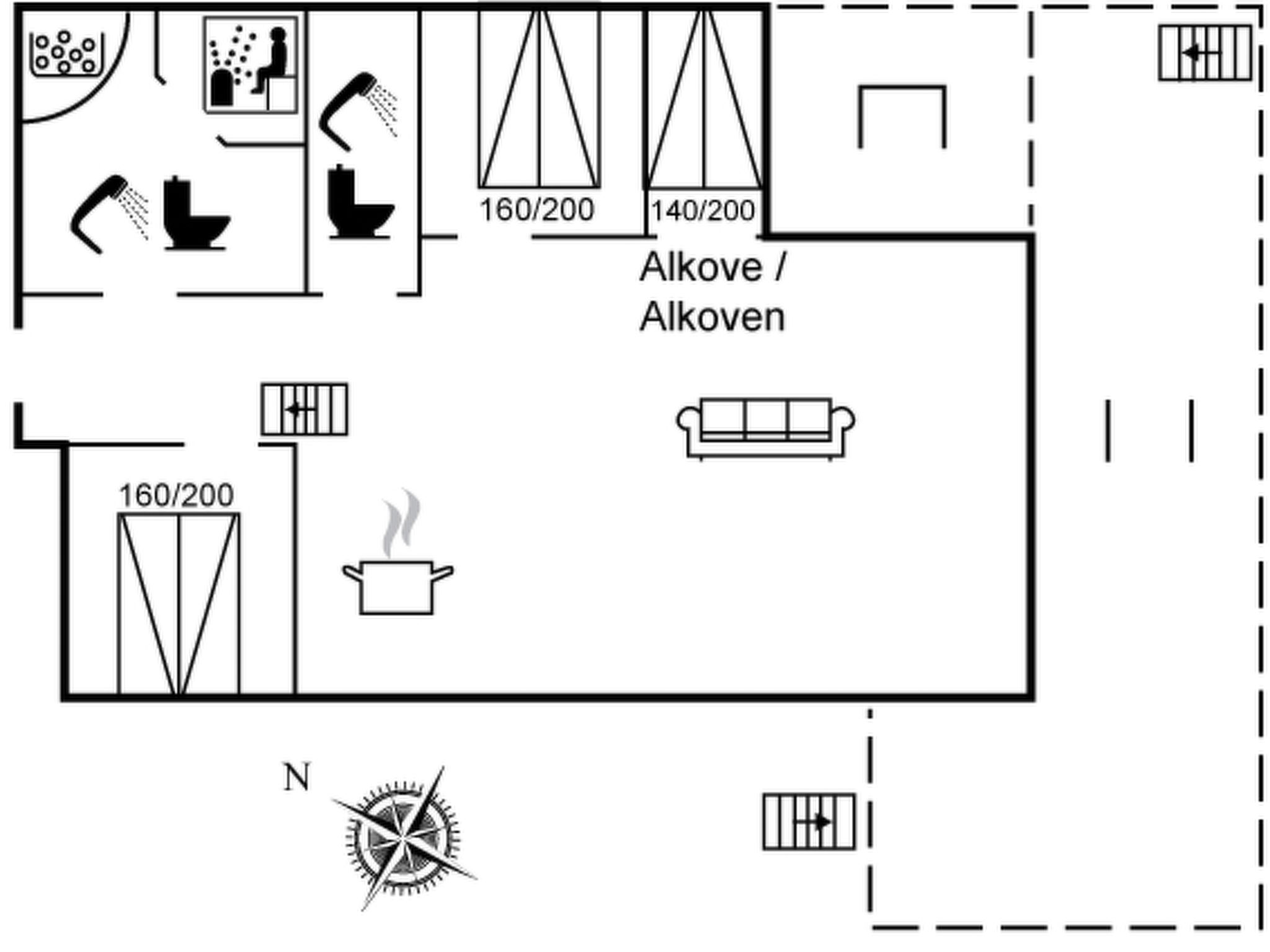 Single-family house, built in 1966. 200 m from the sea. Private: property 701 m2, well-kept garden. Barbecue. In the house: sauna, washing machine, tumble dryer. Parking at the house. Grocery 3.5 km. Golf course 5.6 km. The owner does not accept any youth groups.