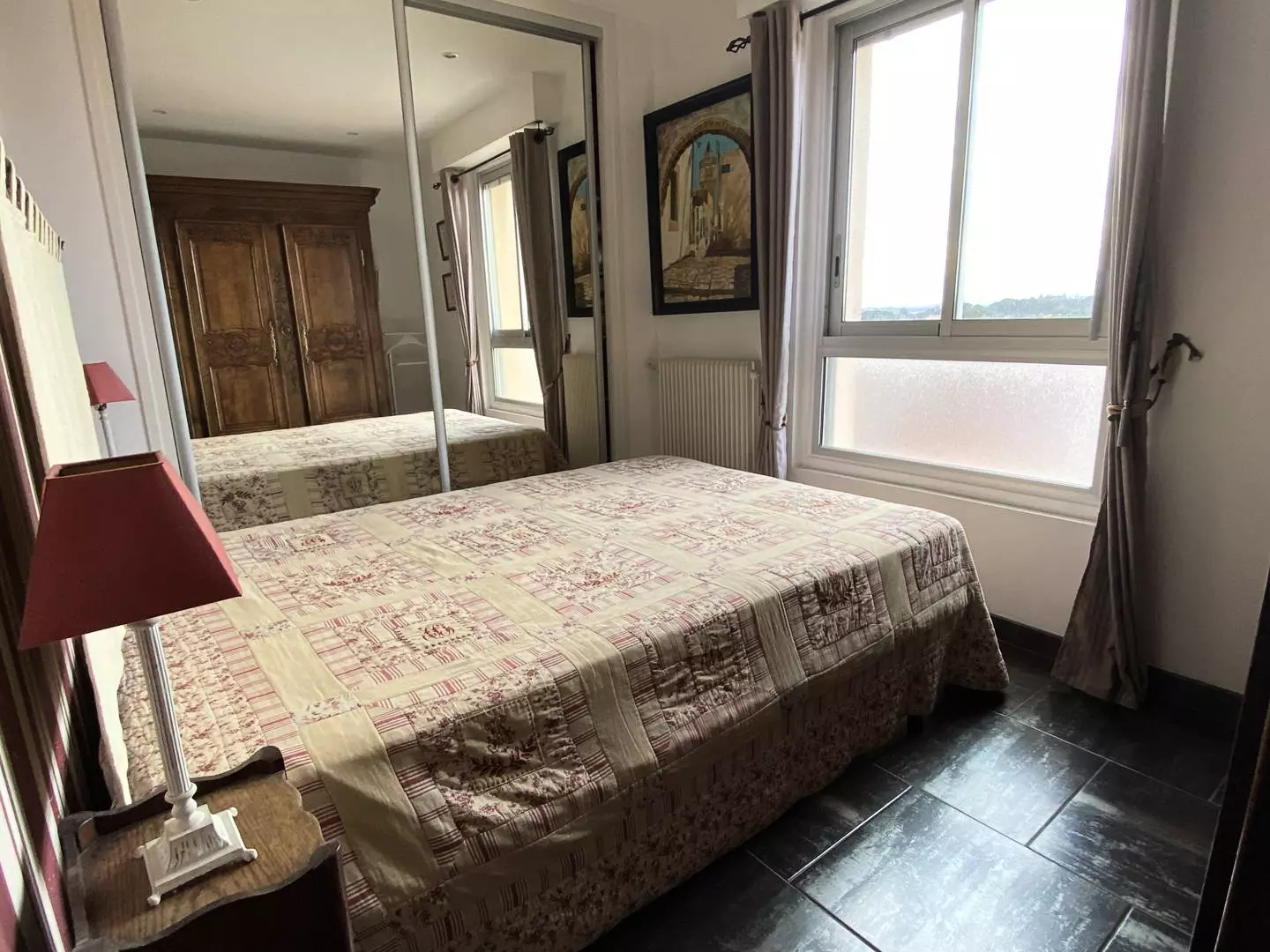 The bedrooms offer optimal comfort: two single beds (90 cm) in the bedroom and a double bed (140 cm) in the second bedroom. The apartment also includes a shower room, separate WC, air conditioning, Wi-Fi, and new electric roller shutters.