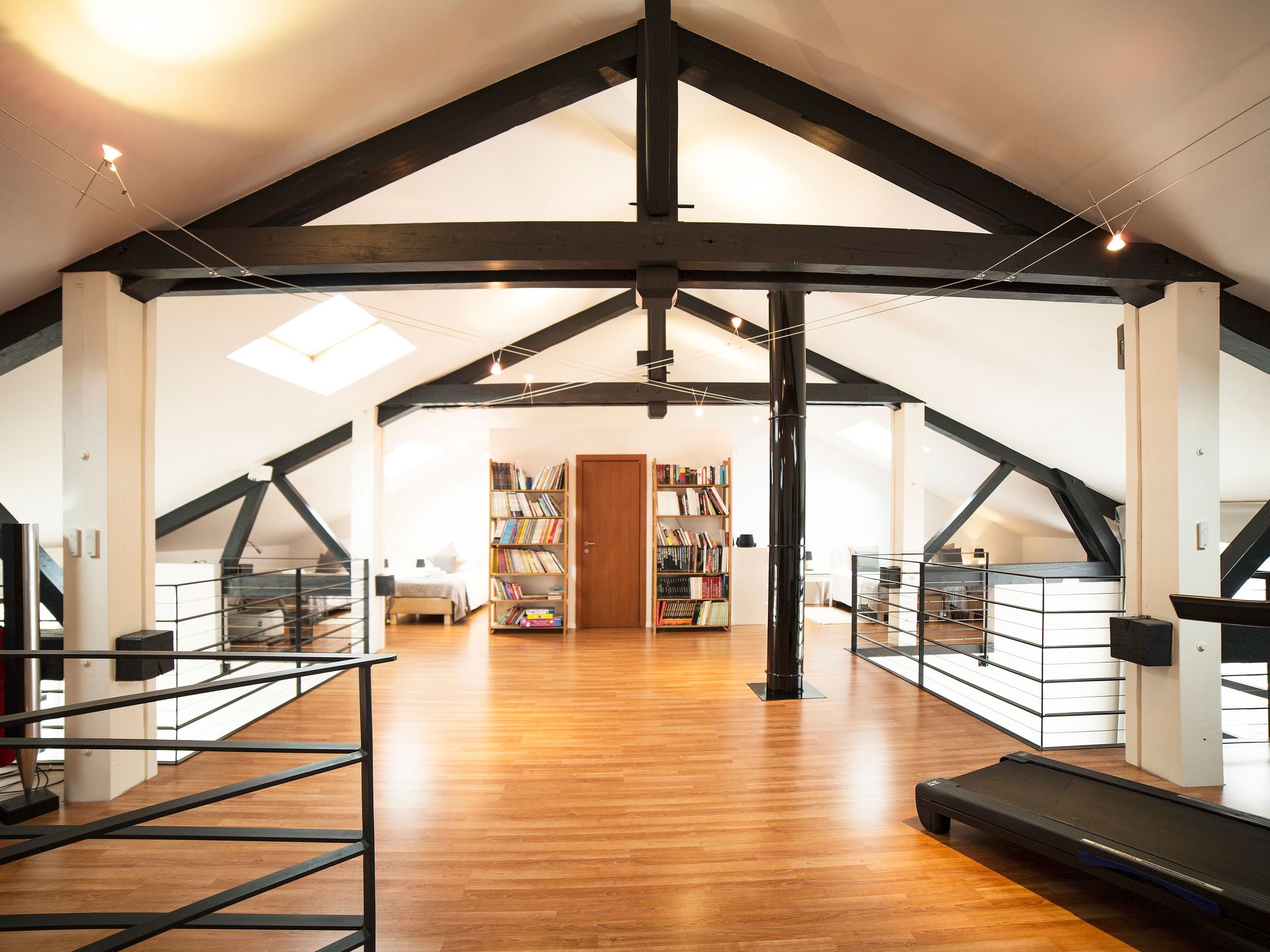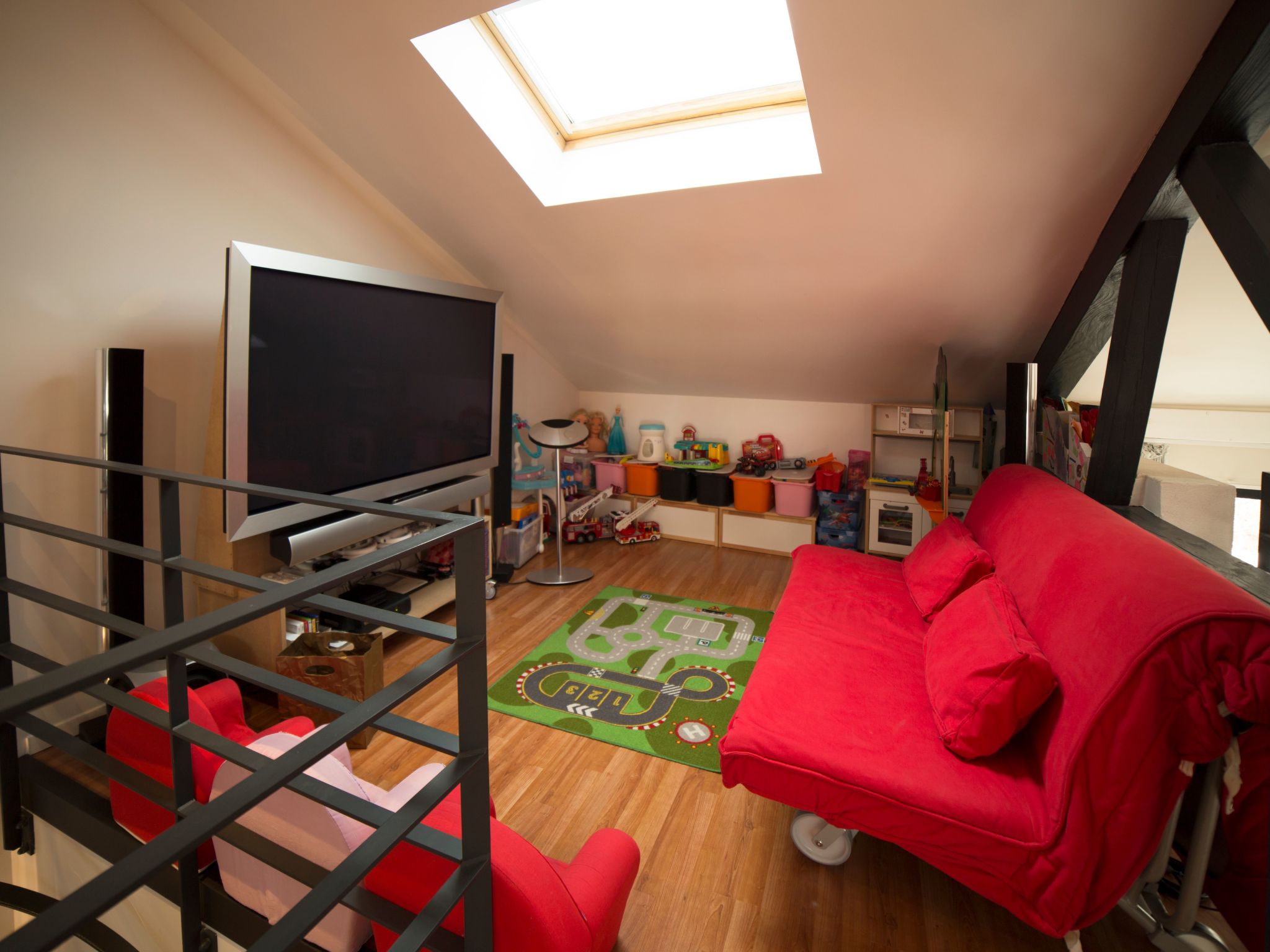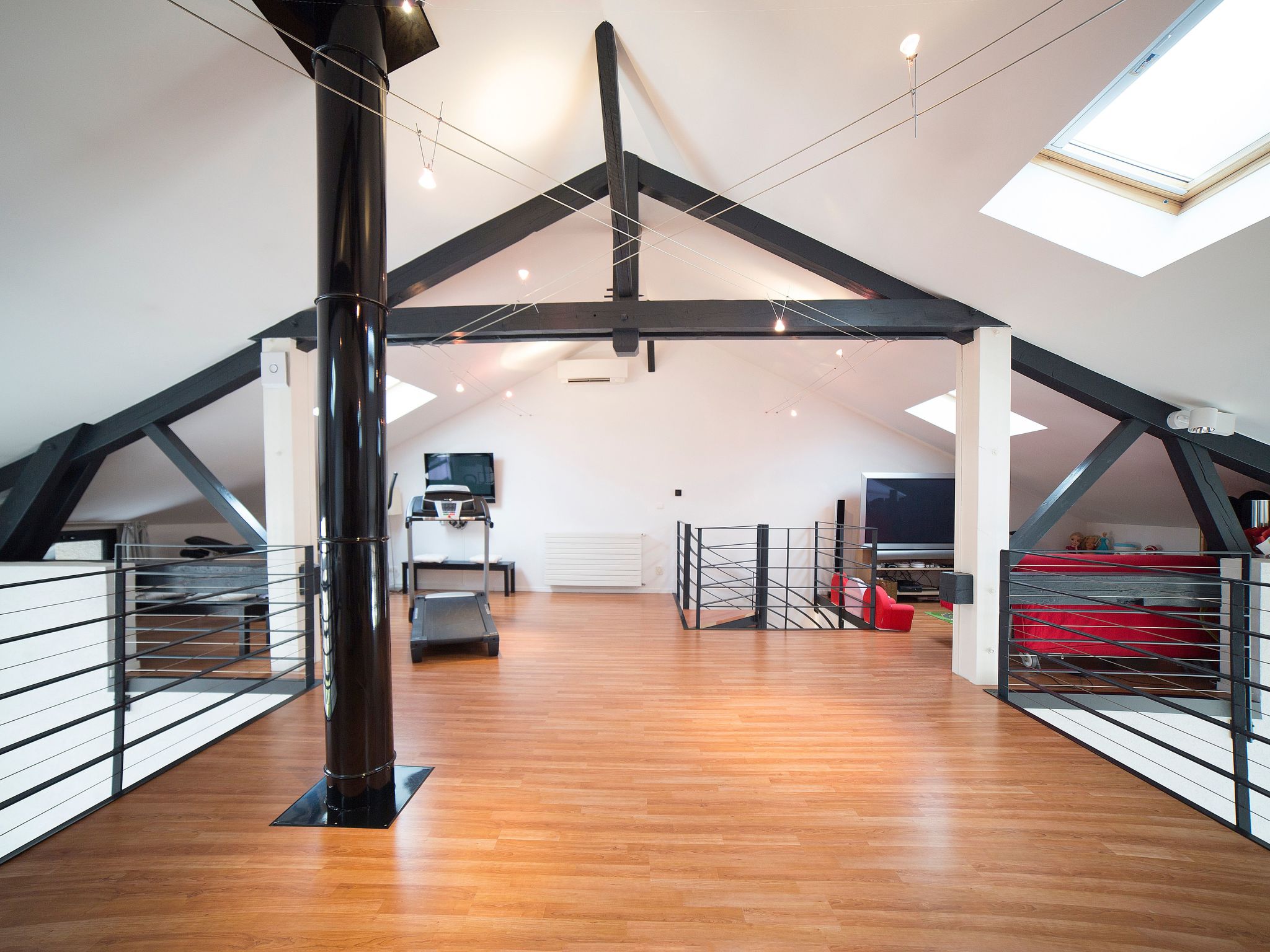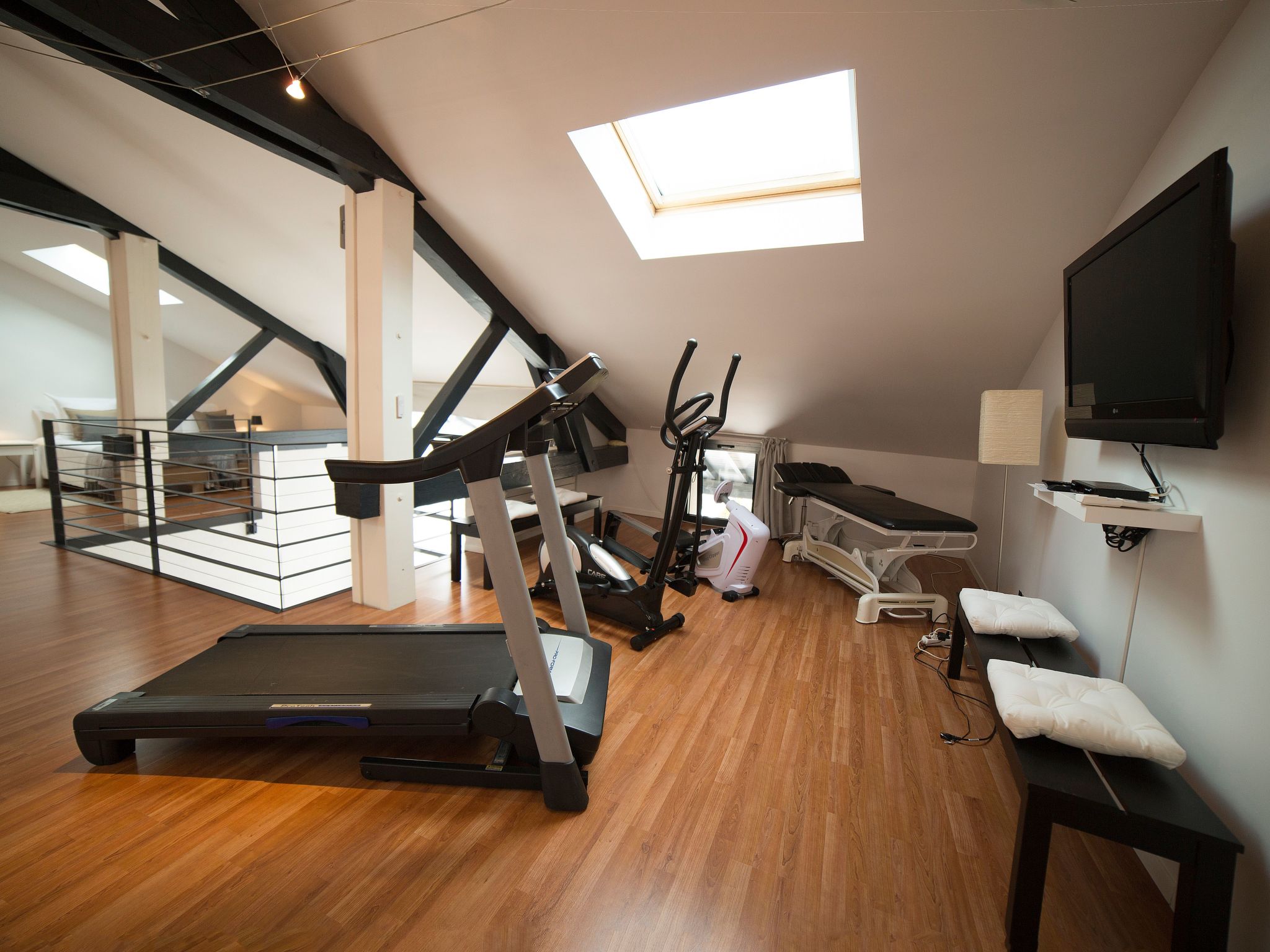 There are four bedrooms on the floor: two doubles and two twins, which can be arranged as double bedrooms. All of the bedrooms have televisions and plenty of storage. There's also a bathroon on this floor, with twin basins, a bath and a shower. There is a large loft room on the top floor with two sets of twin beds separated by a shower room. There are also gym and play areas with a television and games consoles. Please be aware the 4 single beds located on the mezzanine are in an open space together with the gym and the games room. Please refer to our photos.