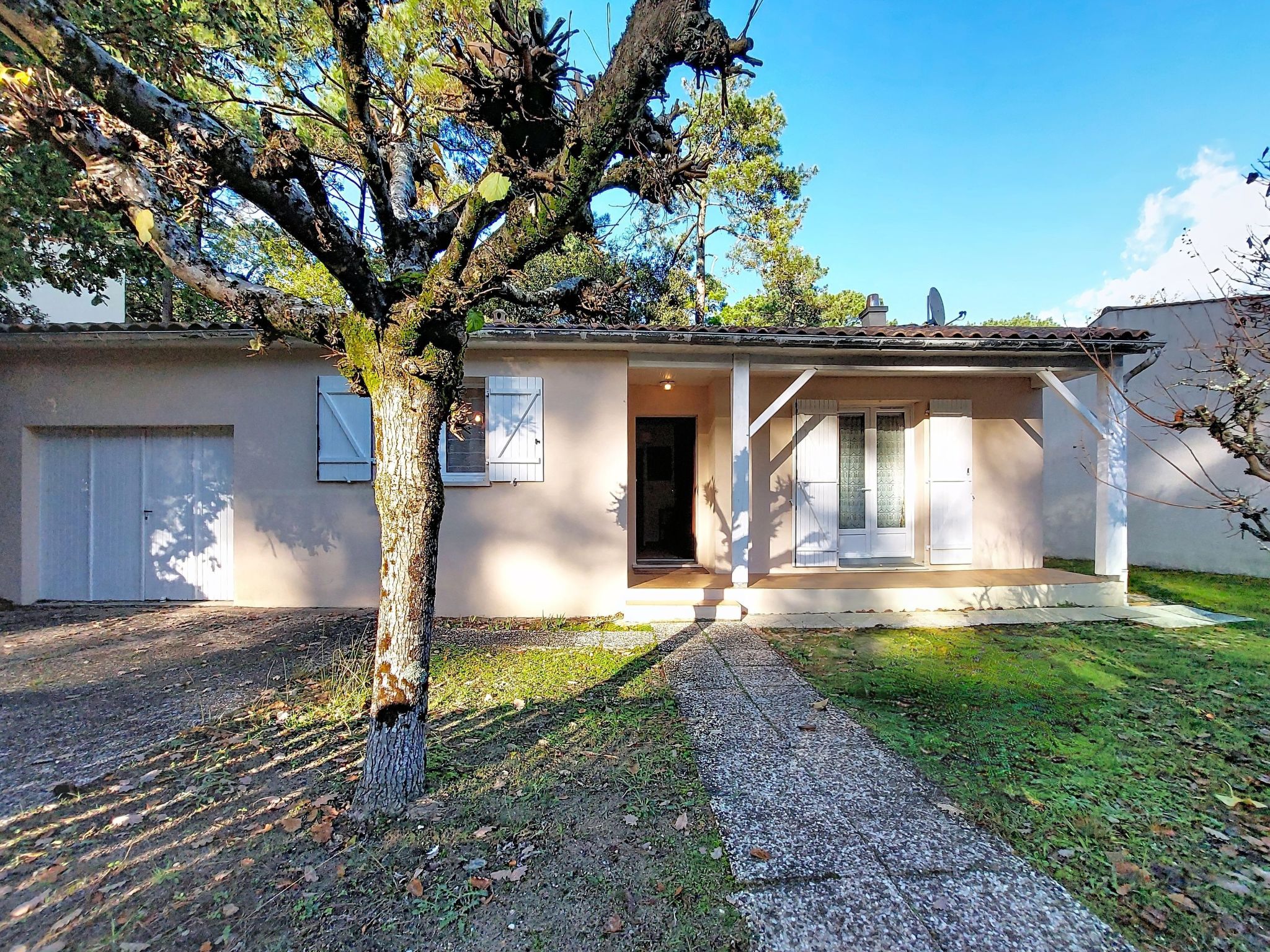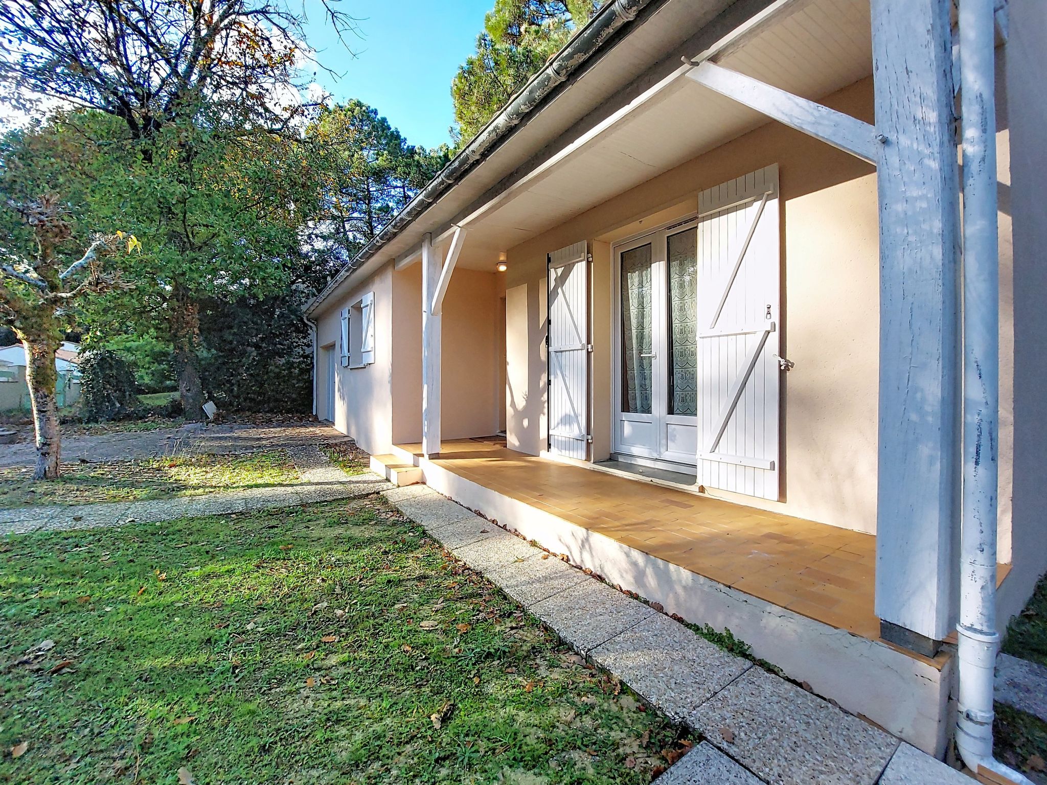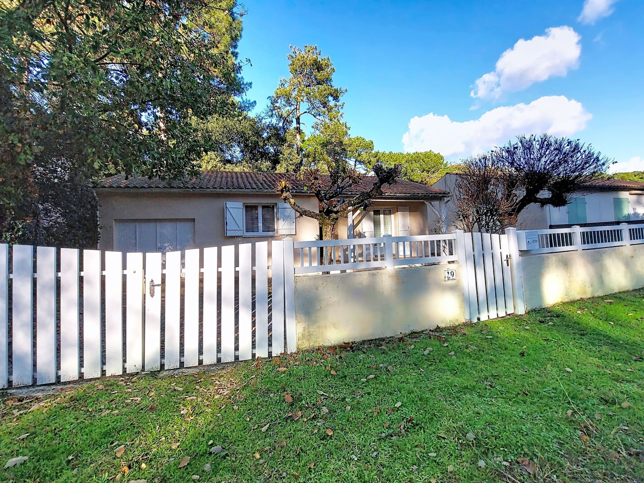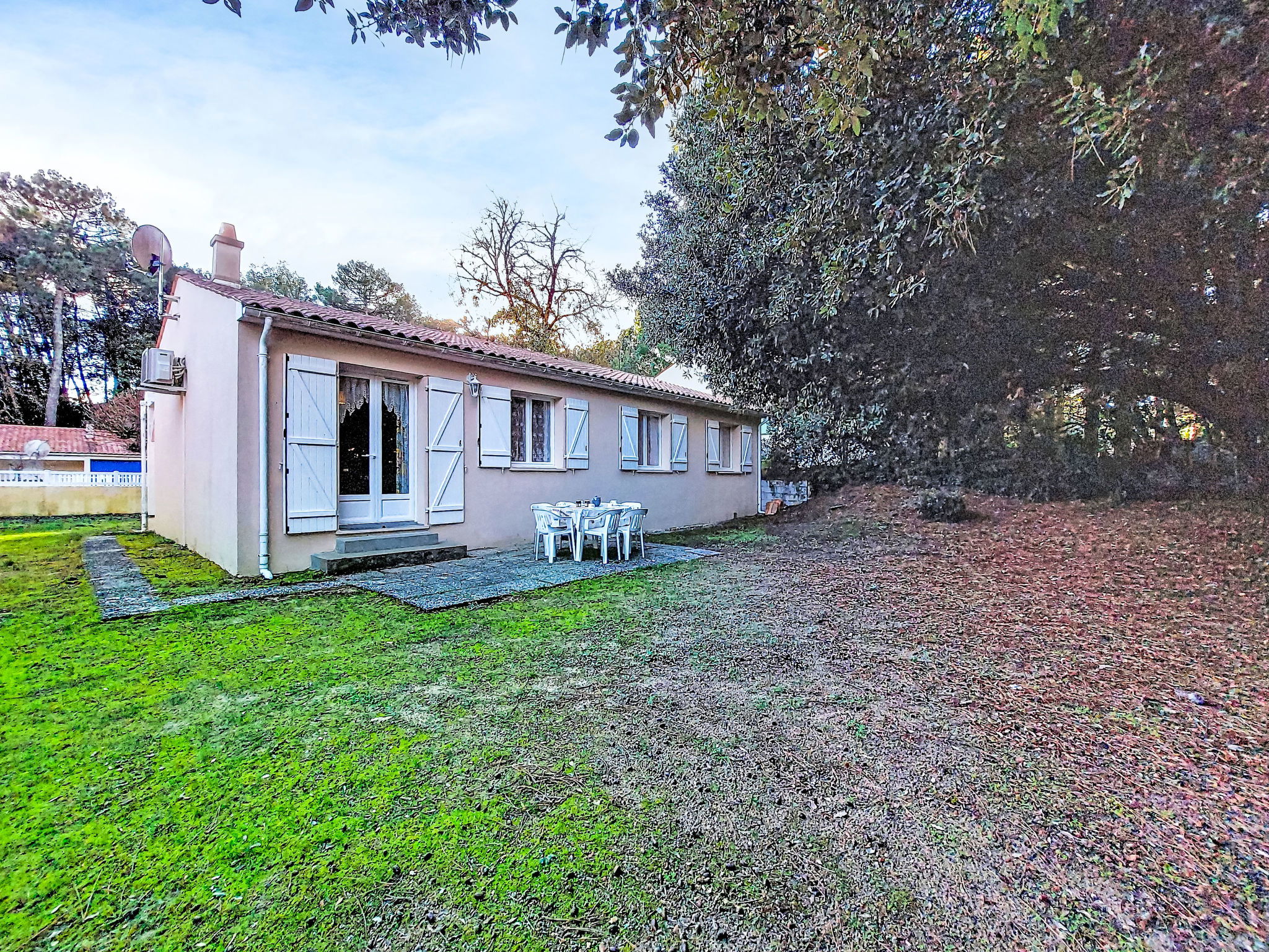 La Palmyre: Single-family house "Les Alouettes". In the resort 1 km from the centre of La Palmyre, in a quiet position in the residential district, 1.7 km from the sea, 1.7 km from the beach, south-west facing position. Private: natural state property 570 m2 (fenced), trees, parking. Shop 1 km, grocery 1 km, supermarket 1 km, bakery 1 km, café 1 km, bus stop "Office de tourisme" 1 km, railway station "Royan" 18 km, sandy beach "La Palmyre" 1.7 km. Sports harbour 1.7 km, golf course (9 hole) 900 m, surf school 1 km, tennis 150 m, riding stable 1.7 km. Nearby attractions: Zoo de La Palmyre 1.1 km, Hippodrome - La Palmyre 700 m, Zagal Cabaret - La Palmyre 1.9 km, Luna Park (Juillet - Août) 5 km, Port La Tremblade - Boyard / Ile d'Aix 12 km, Golf La Palmyre 2 km. The keys‘ handover takes place by the agency in La Palmyre, 1 km.