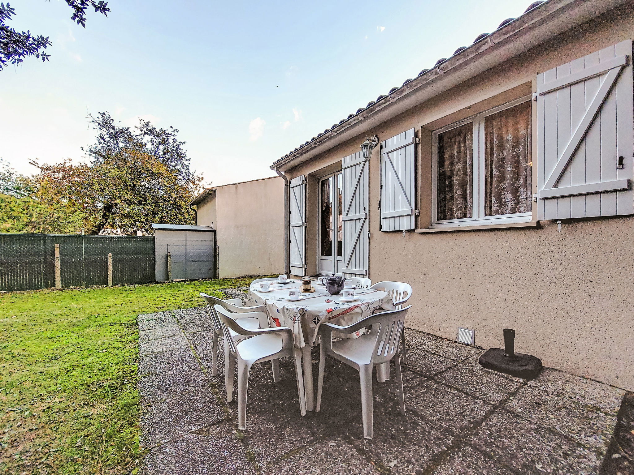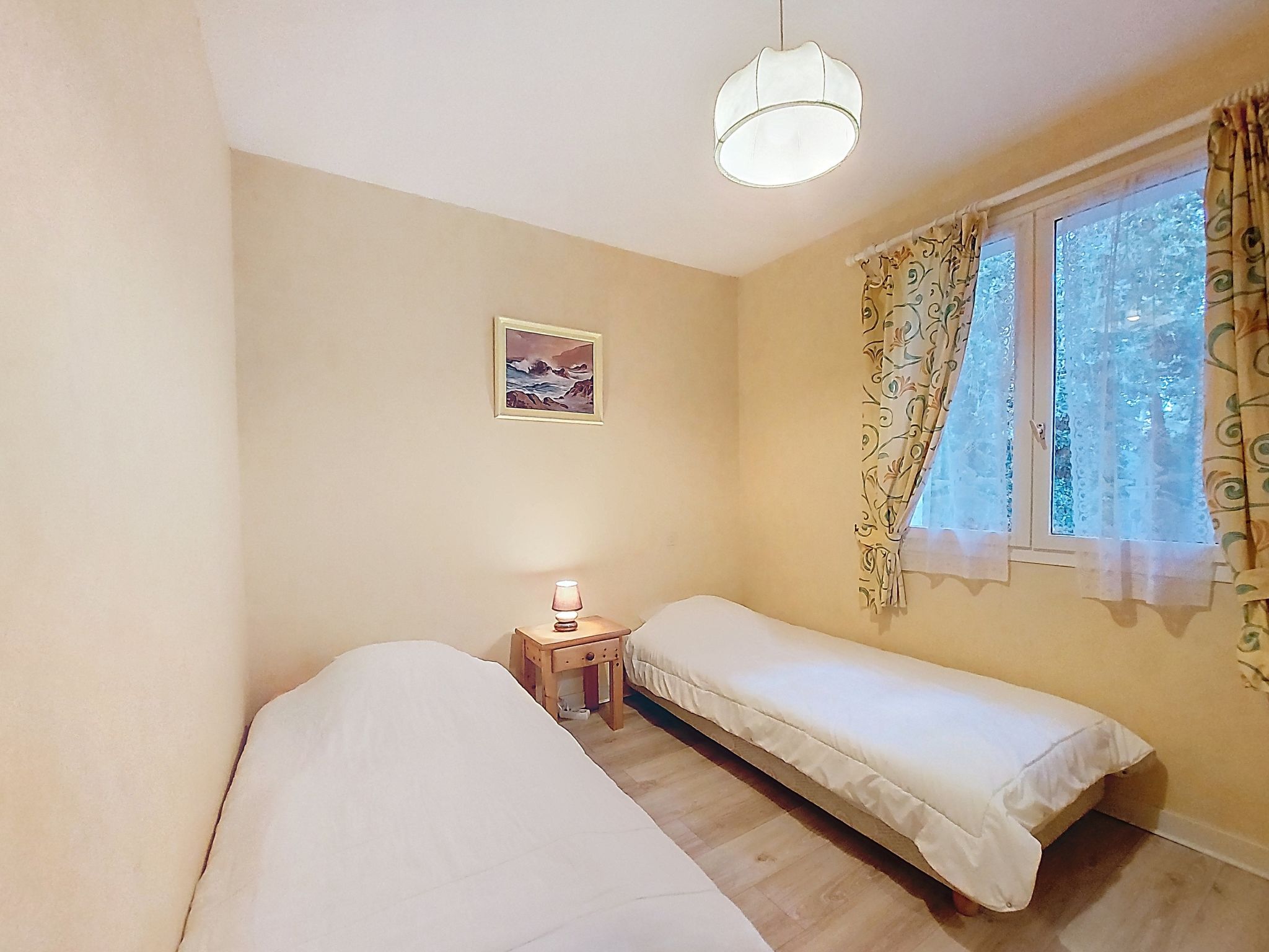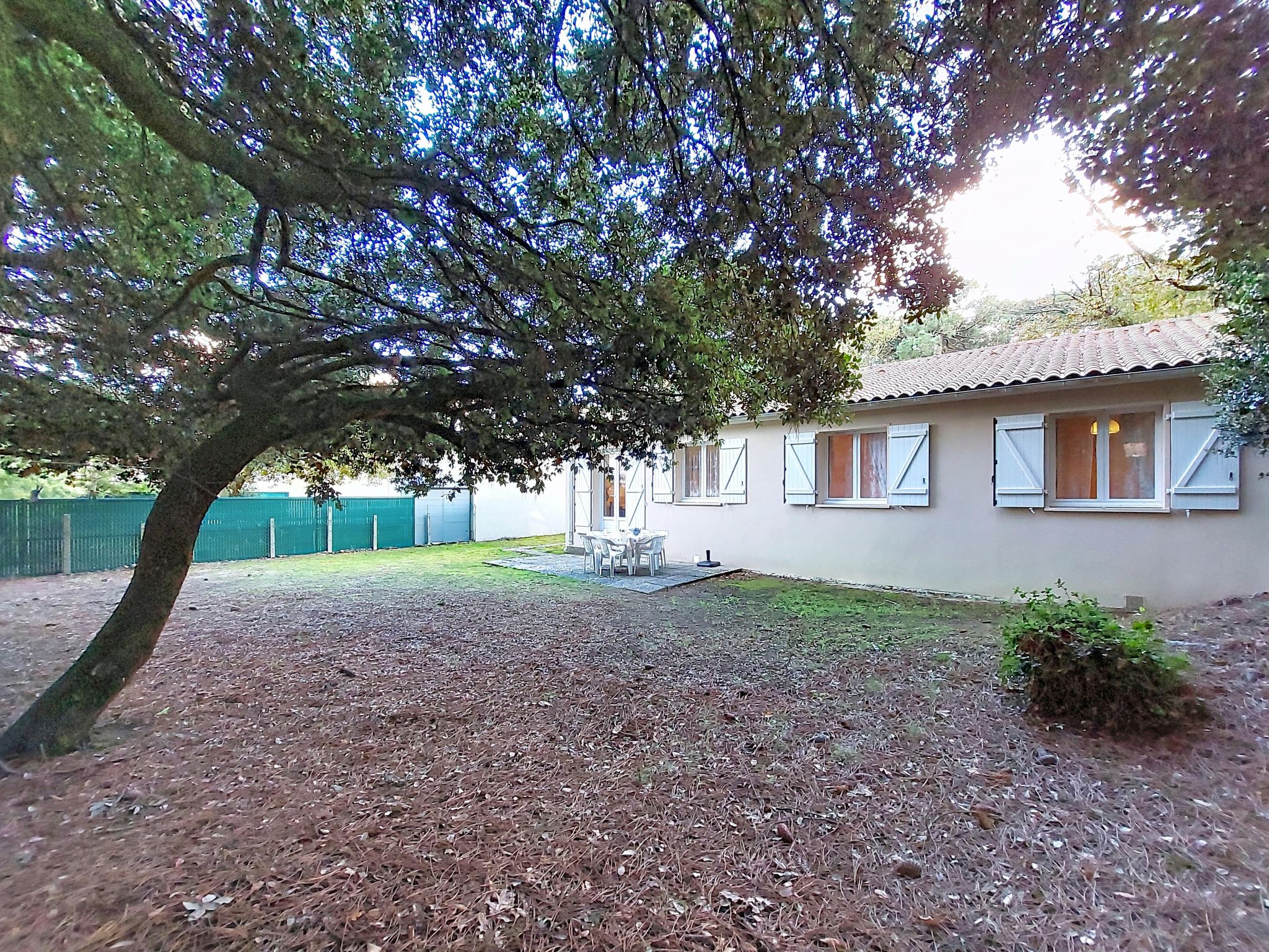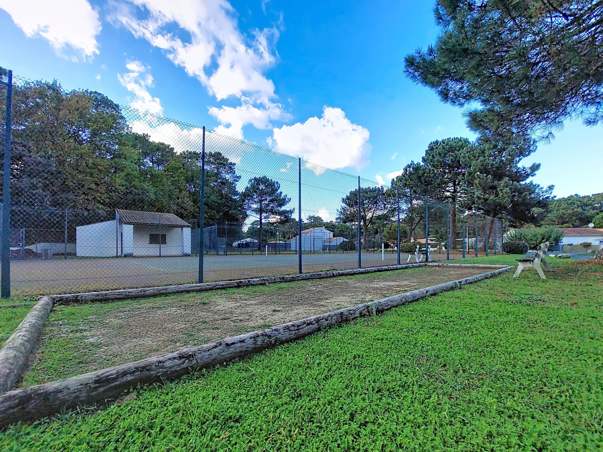La Palmyre: Single-family house "Les Alouettes". In the resort 1 km from the centre of La Palmyre, in a quiet position in the residential district, 1.7 km from the sea, 1.7 km from the beach, south-west facing position. Private: natural state property 570 m2 (fenced), trees, parking. Shop 1 km, grocery 1 km, supermarket 1 km, bakery 1 km, café 1 km, bus stop "Office de tourisme" 1 km, railway station "Royan" 18 km, sandy beach "La Palmyre" 1.7 km. Sports harbour 1.7 km, golf course (9 hole) 900 m, surf school 1 km, tennis 150 m, riding stable 1.7 km. Nearby attractions: Zoo de La Palmyre 1.1 km, Hippodrome - La Palmyre 700 m, Zagal Cabaret - La Palmyre 1.9 km, Luna Park (Juillet - Août) 5 km, Port La Tremblade - Boyard / Ile d'Aix 12 km, Golf La Palmyre 2 km. The keys‘ handover takes place by the agency in La Palmyre, 1 km.