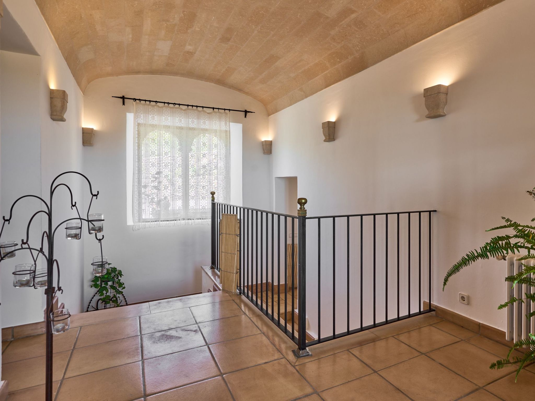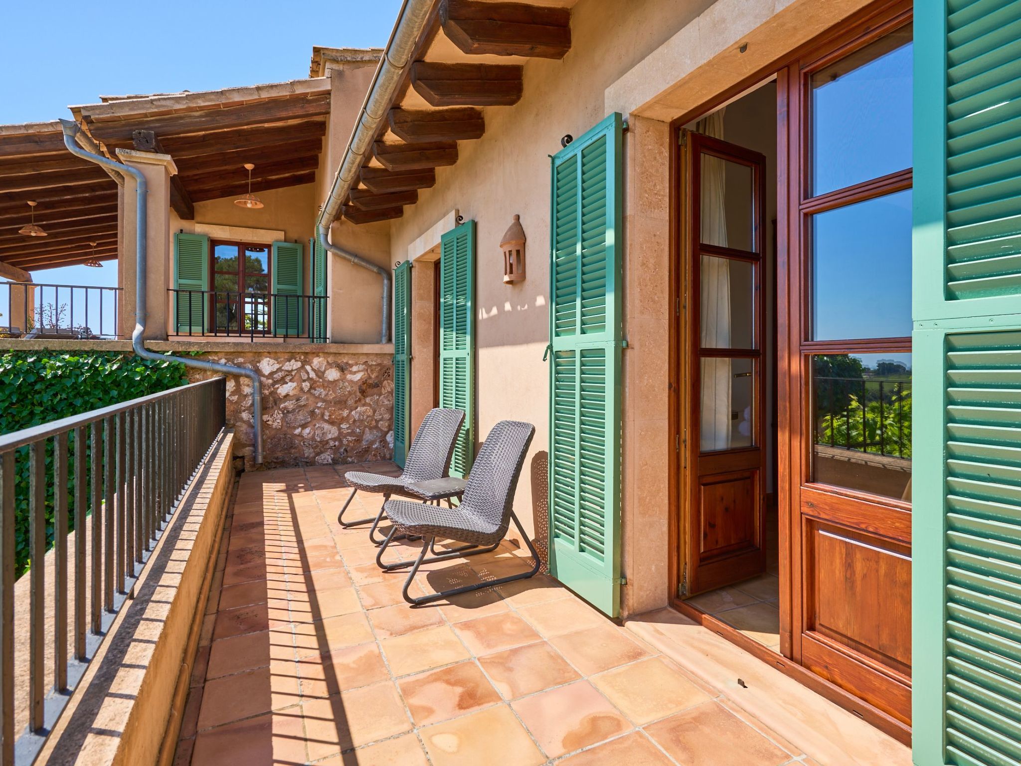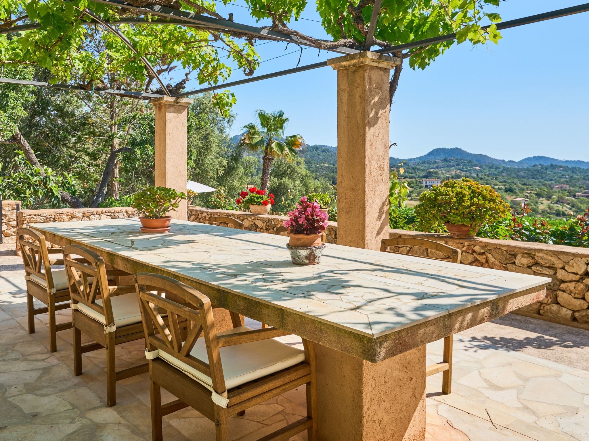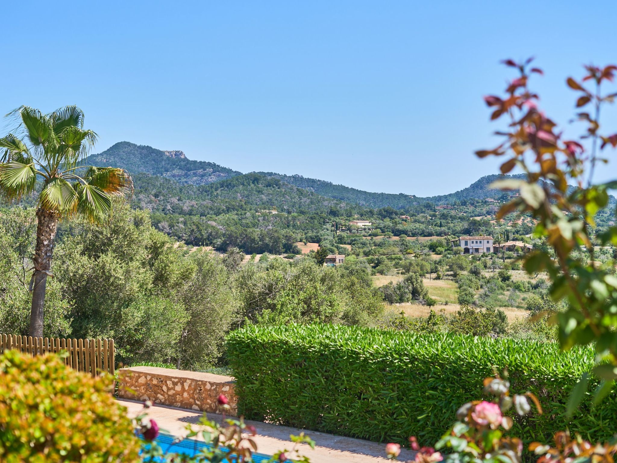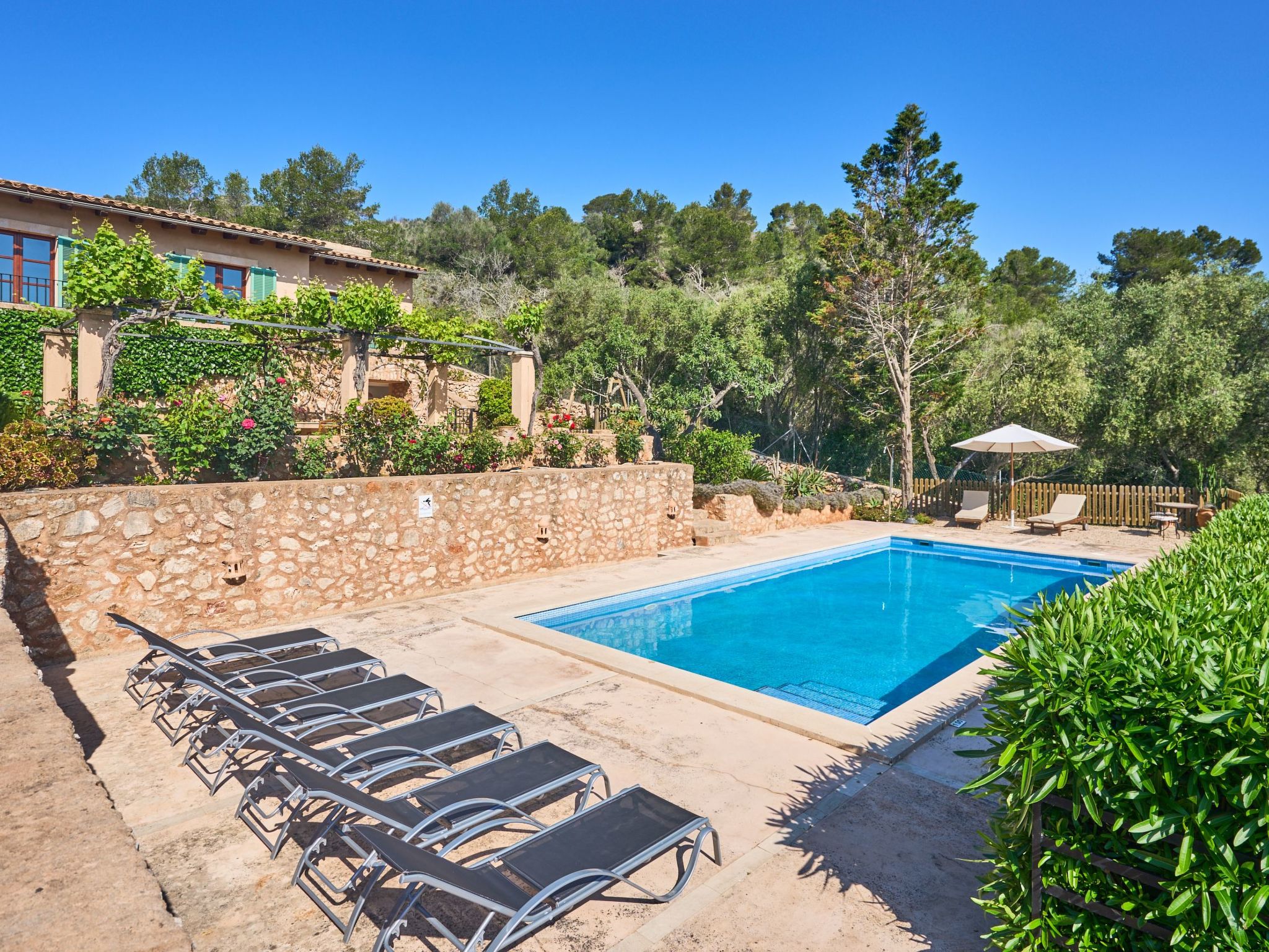 Sa Penya Rodona is a luxurious accommodation. The main entrance is at the rear of the house and leads through to the spacious, perfectly equipped kitchen. Adjacent is the beautiful dining room, with patio doors leading to the front upper terrace. The large living room is tastefully decorated with elegant furniture, Smart TV and Playstation Type 2. Large patio doors also lead out onto the beautiful upper outdoor terrace with fantastic views and the partial canopy provides both sun and shade. A few steps lead down half a level to the master bedroom, equipped with a double bed, dressing room, full en suite bathroom and access to the upper sun terrace. From here there are further impressive views over the property and the beautiful lower pool area. Also on this level are two further bedrooms, each with two single beds, which share a fully equipped bathroom. On the ground floor, from the covered terrace at the front of the house, there is access to a separate double bedroom. This beautiful, spacious room has a double bed, dressing room and en suite bathroom with walk-in shower (wheelchair accessible).