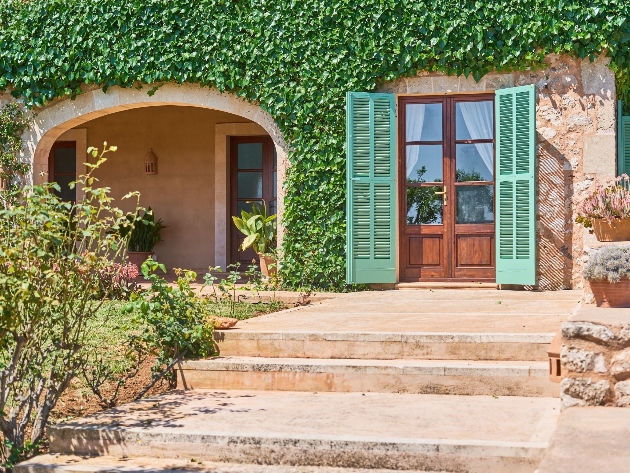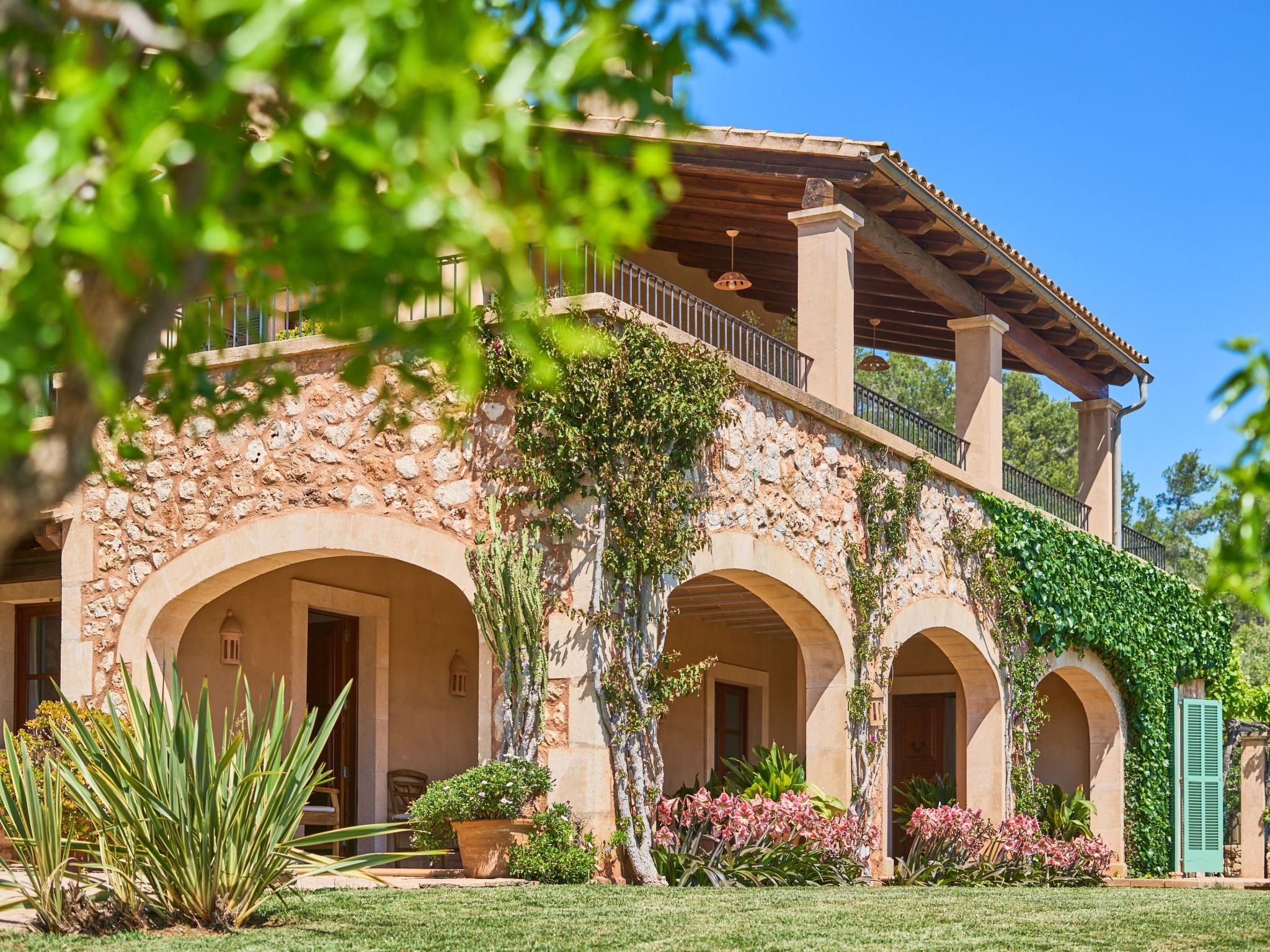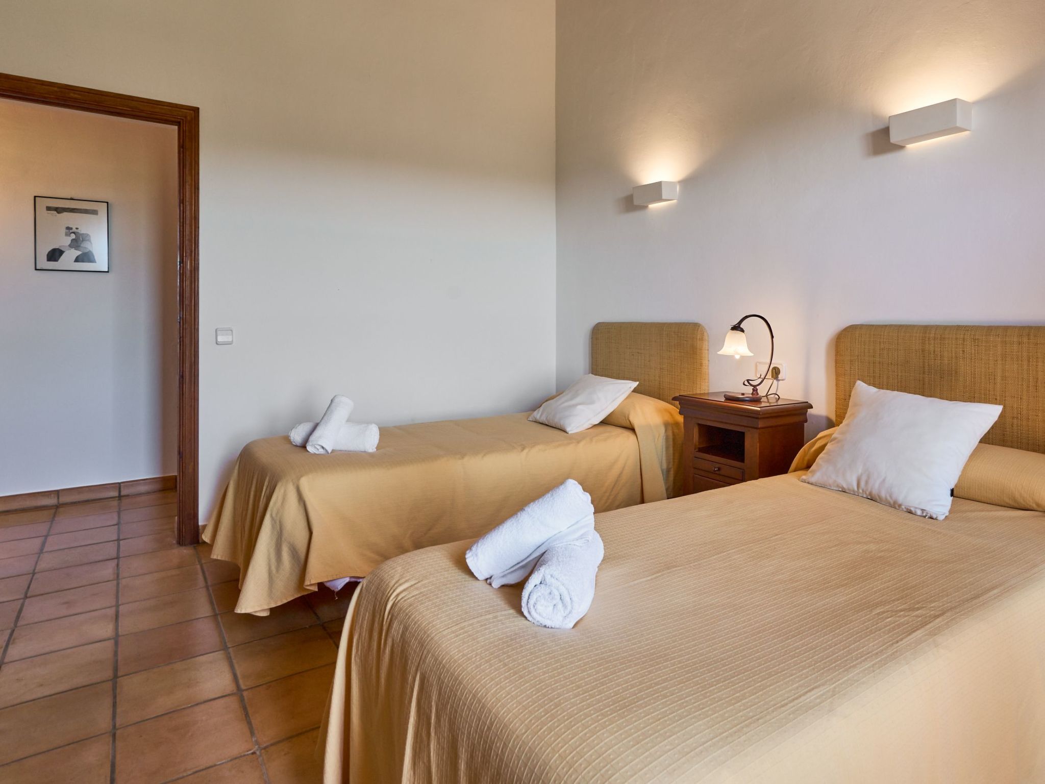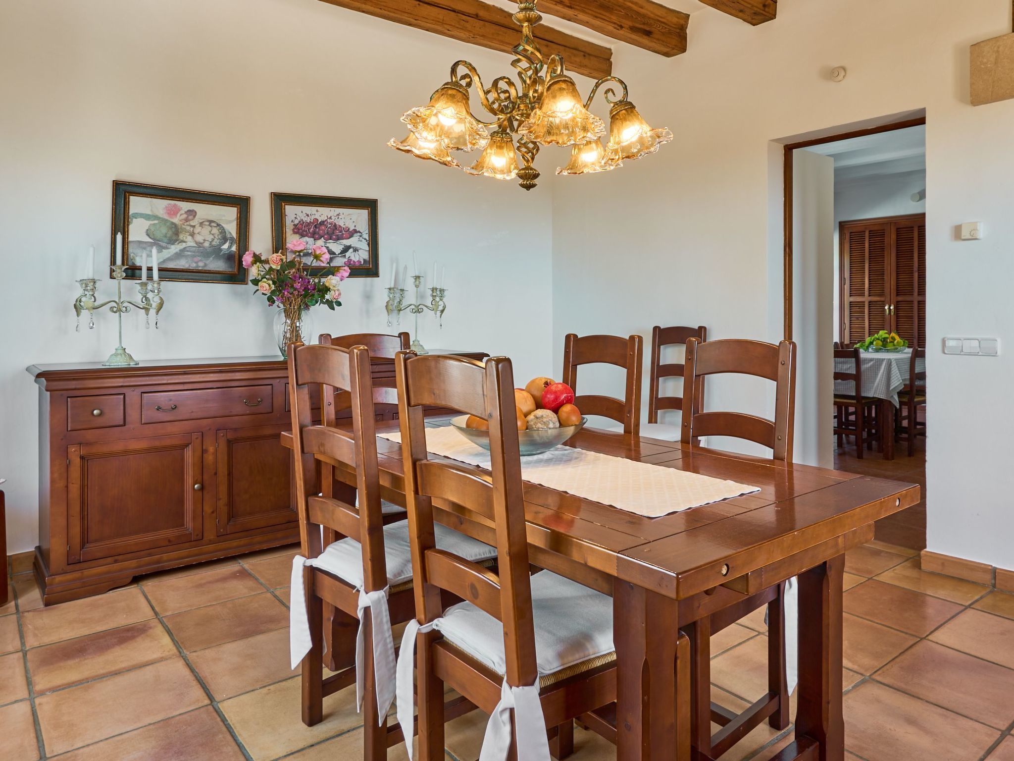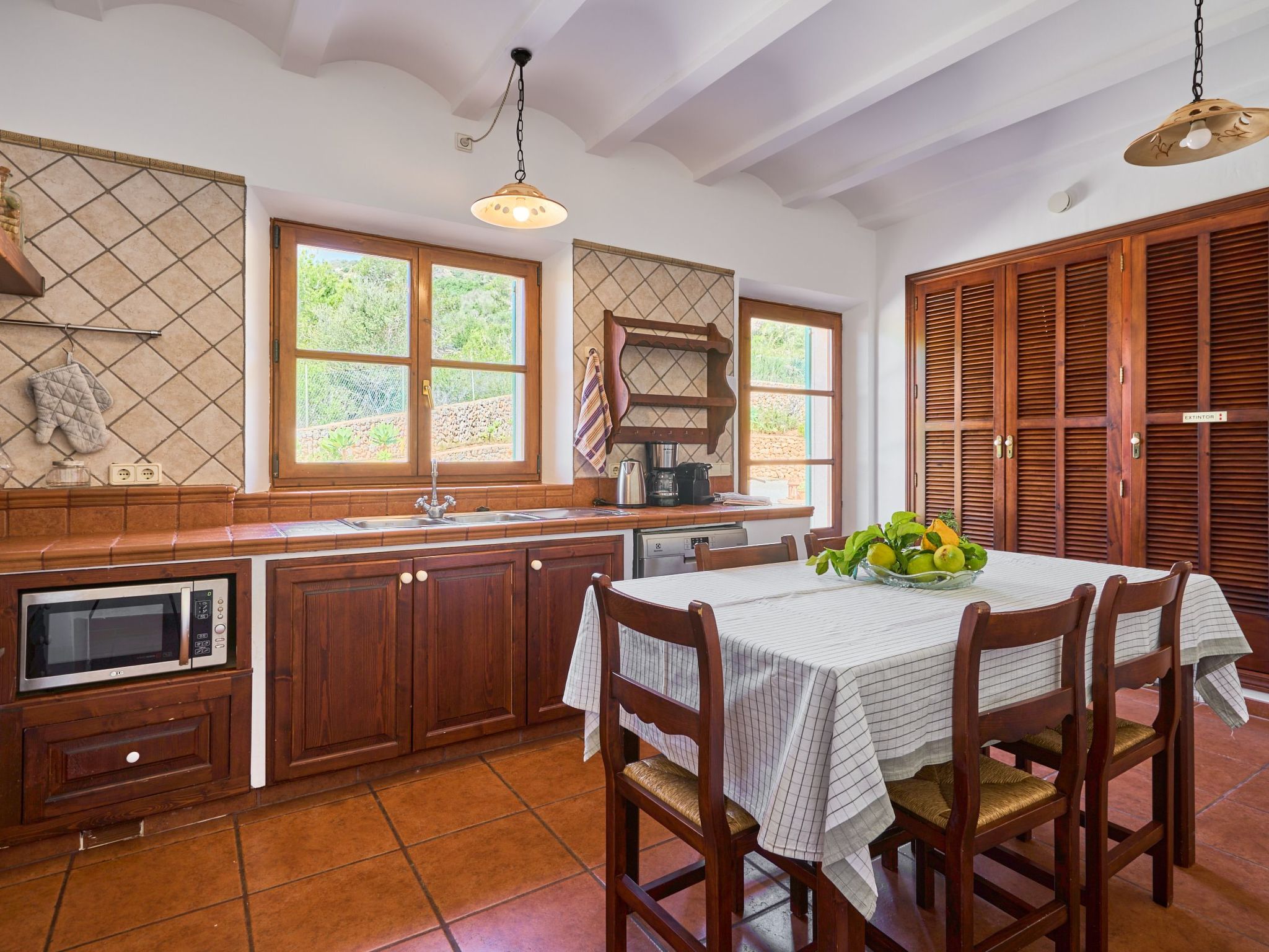 Sa Penya Rodona is a luxurious accommodation. The main entrance is at the rear of the house and leads through to the spacious, perfectly equipped kitchen. Adjacent is the beautiful dining room, with patio doors leading to the front upper terrace. The large living room is tastefully decorated with elegant furniture, Smart TV and Playstation Type 2. Large patio doors also lead out onto the beautiful upper outdoor terrace with fantastic views and the partial canopy provides both sun and shade. A few steps lead down half a level to the master bedroom, equipped with a double bed, dressing room, full en suite bathroom and access to the upper sun terrace. From here there are further impressive views over the property and the beautiful lower pool area. Also on this level are two further bedrooms, each with two single beds, which share a fully equipped bathroom. On the ground floor, from the covered terrace at the front of the house, there is access to a separate double bedroom. This beautiful, spacious room has a double bed, dressing room and en suite bathroom with walk-in shower (wheelchair accessible).