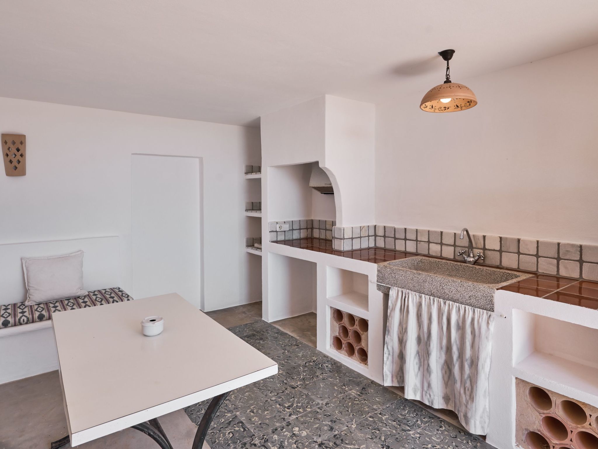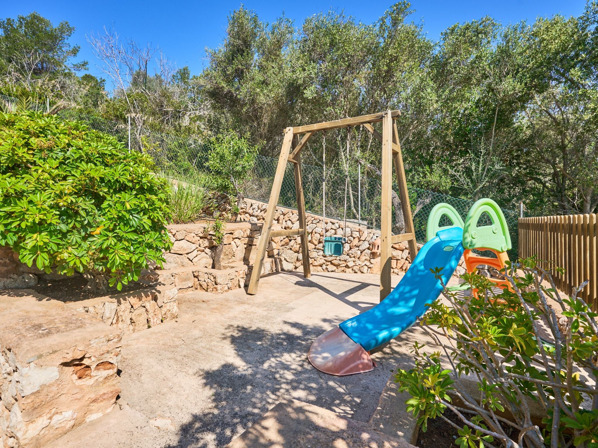 Surrounded by dry stone walls and a beautiful terrace, there is a long pool with mosaic tiles and an outdoor shower. Small iron doors have been installed so that this area can be closed off safely for children. Above the pool area is a terrace covered by shady vines with an enormous stone table, the ideal place for long barbecues in the balmy summer air with fantastic panoramic views. For convenience, there is an adjoining outdoor kitchen, as well as a small playground with a swing and slide for the little ones and a great outdoor barbecue next to the pool.