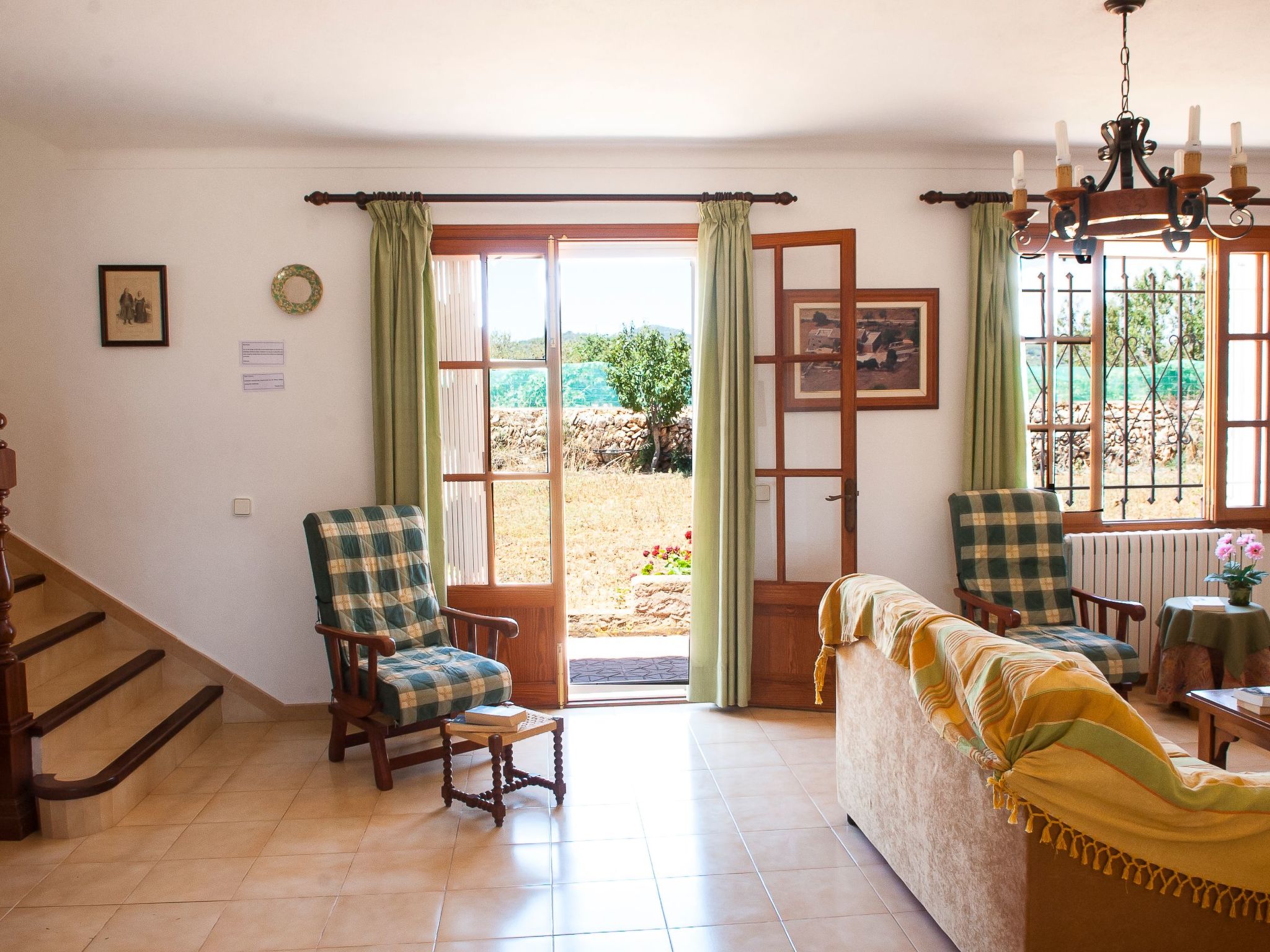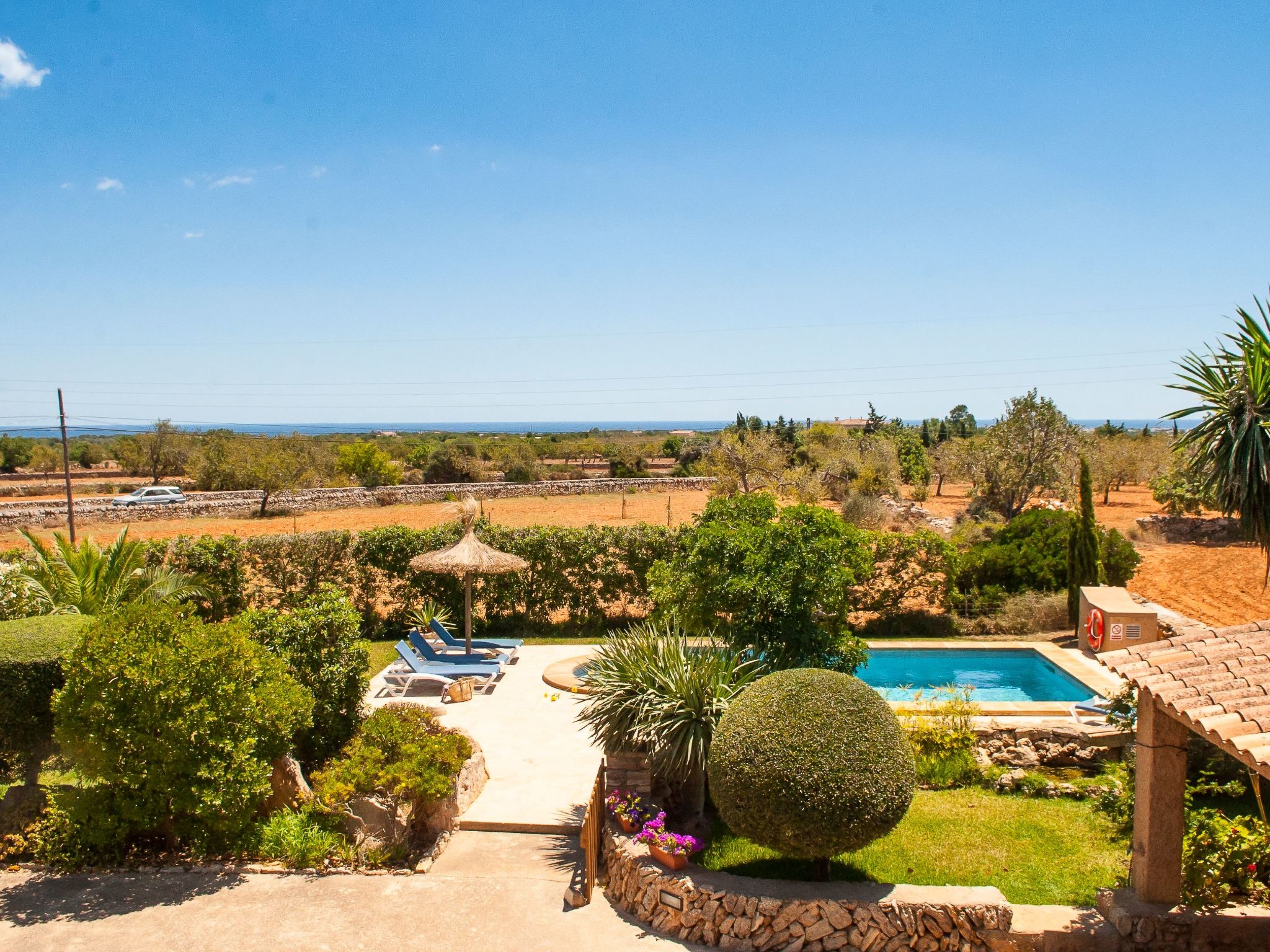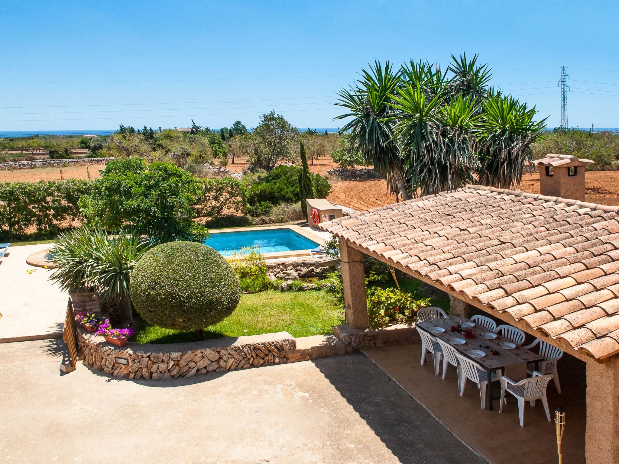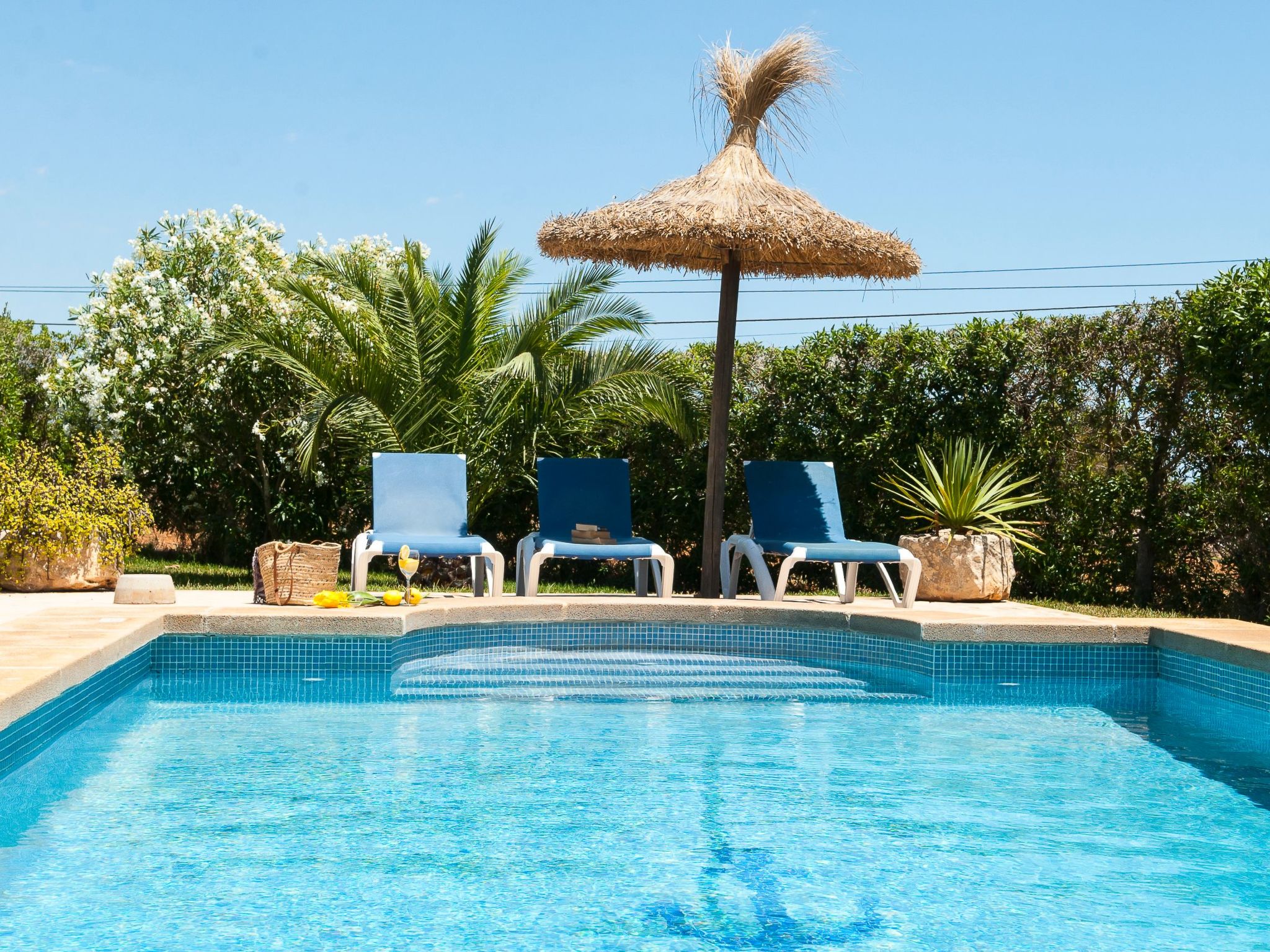The large garden with shrubs, palm trees, trees and bright bougainvillea is very well maintained. The 8m x 4m pool has a large sun terrace with sun loungers and is surrounded on one side by a protective hedge. On the other side, a dry stone wall borders the neighbouring almond tree grove. There are swings and lawns for children to play on. A "porche", a covered terrace with a barbecue area and dining facilities, is located between the house and the garden and provides an ideal shady spot for all meals.