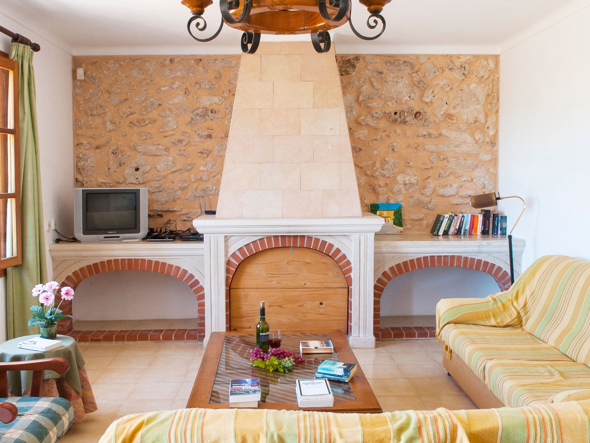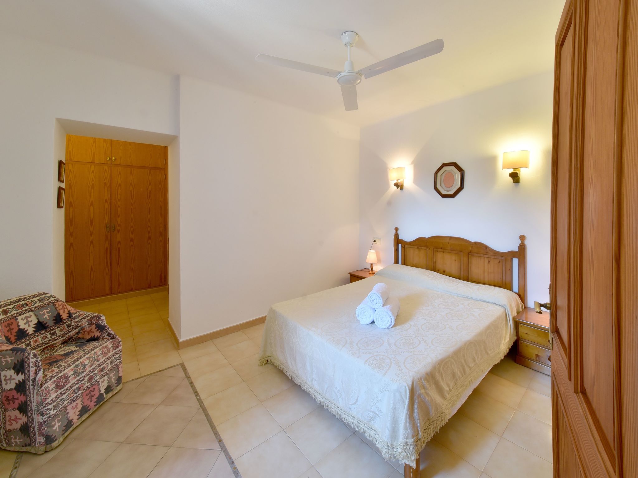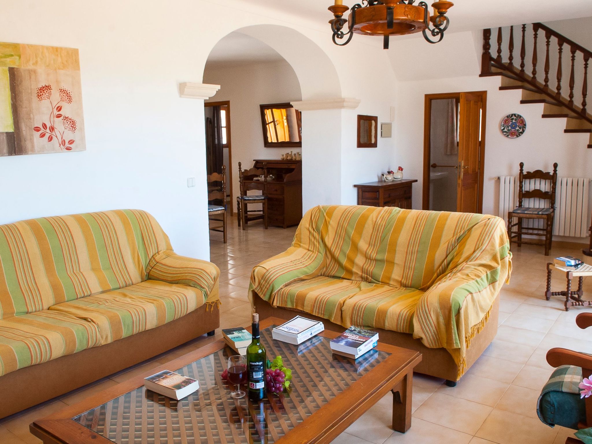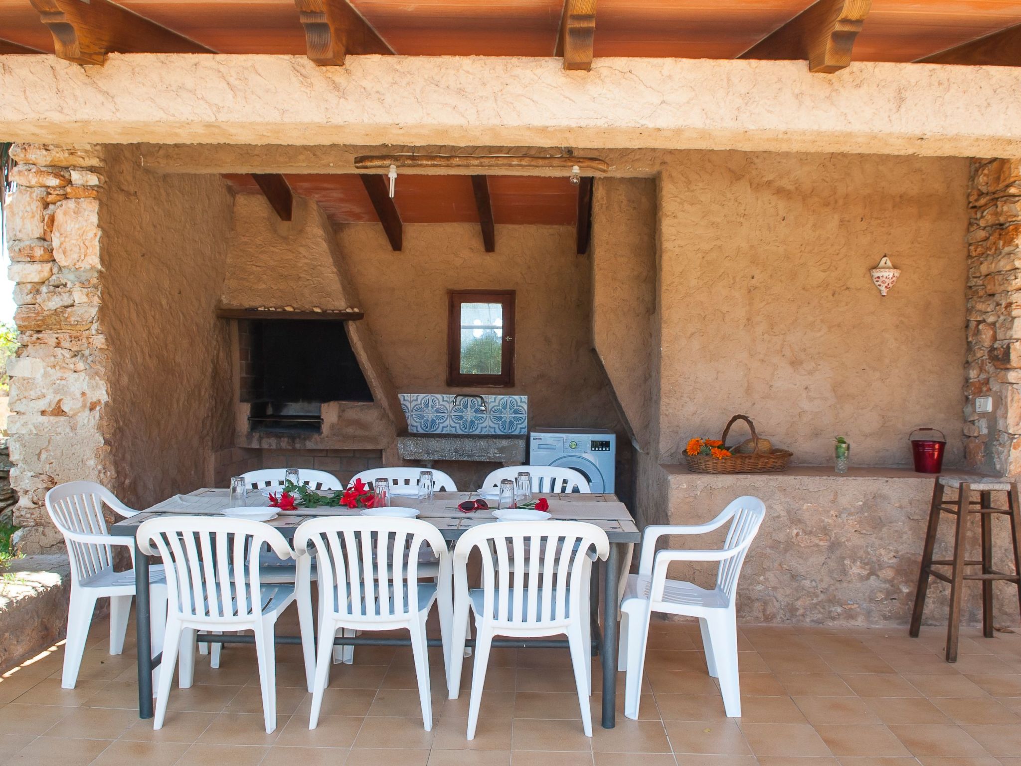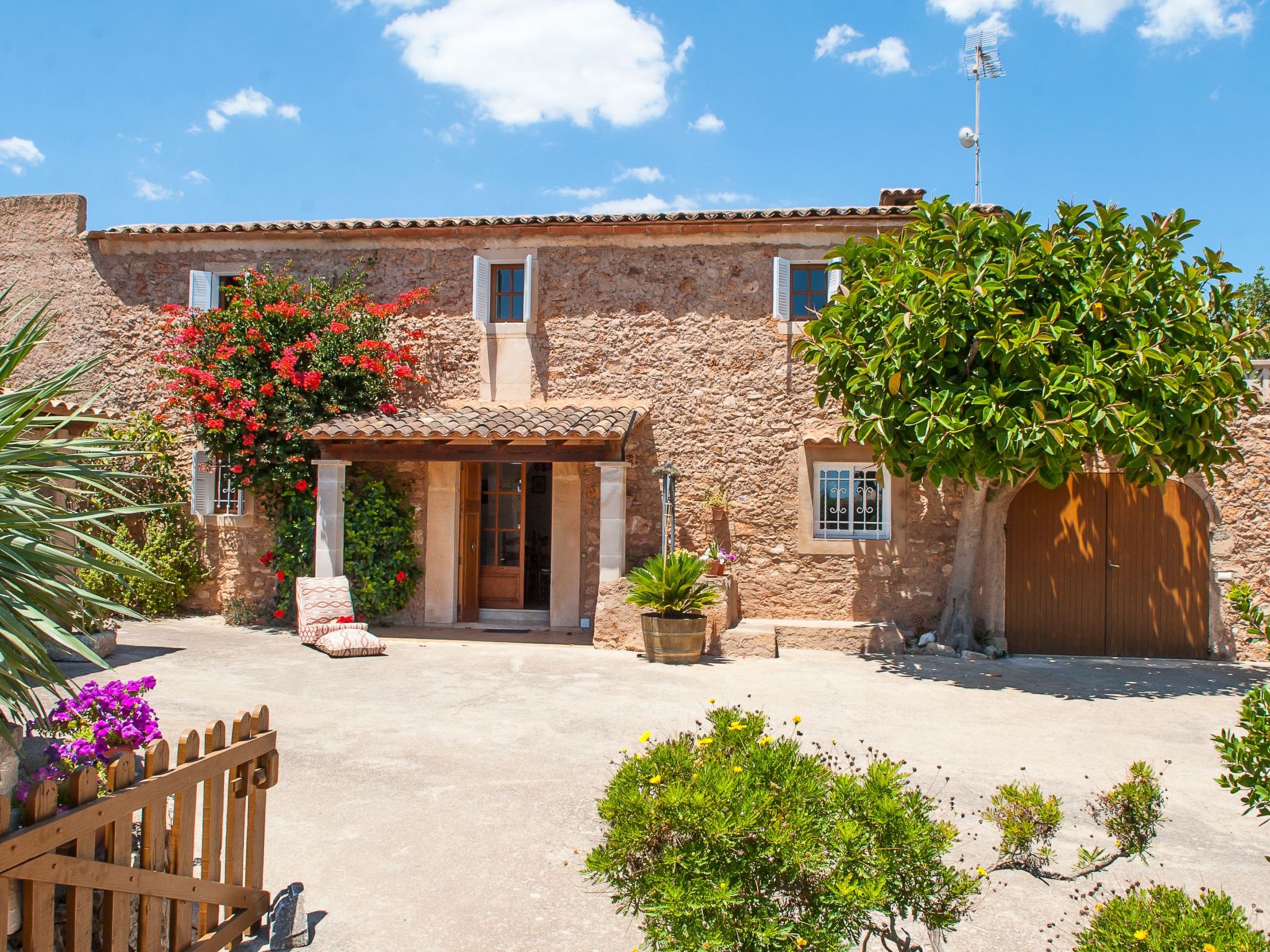 The large garden with shrubs, palm trees, trees and bright bougainvillea is very well maintained. The 8m x 4m pool has a large sun terrace with sun loungers and is surrounded on one side by a protective hedge. On the other side, a dry stone wall borders the neighbouring almond tree grove. There are swings and lawns for children to play on. A "porche", a covered terrace with a barbecue area and dining facilities, is located between the house and the garden and provides an ideal shady spot for all meals.