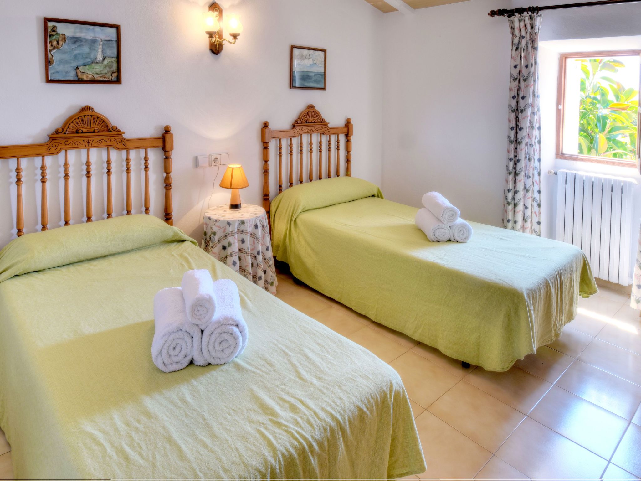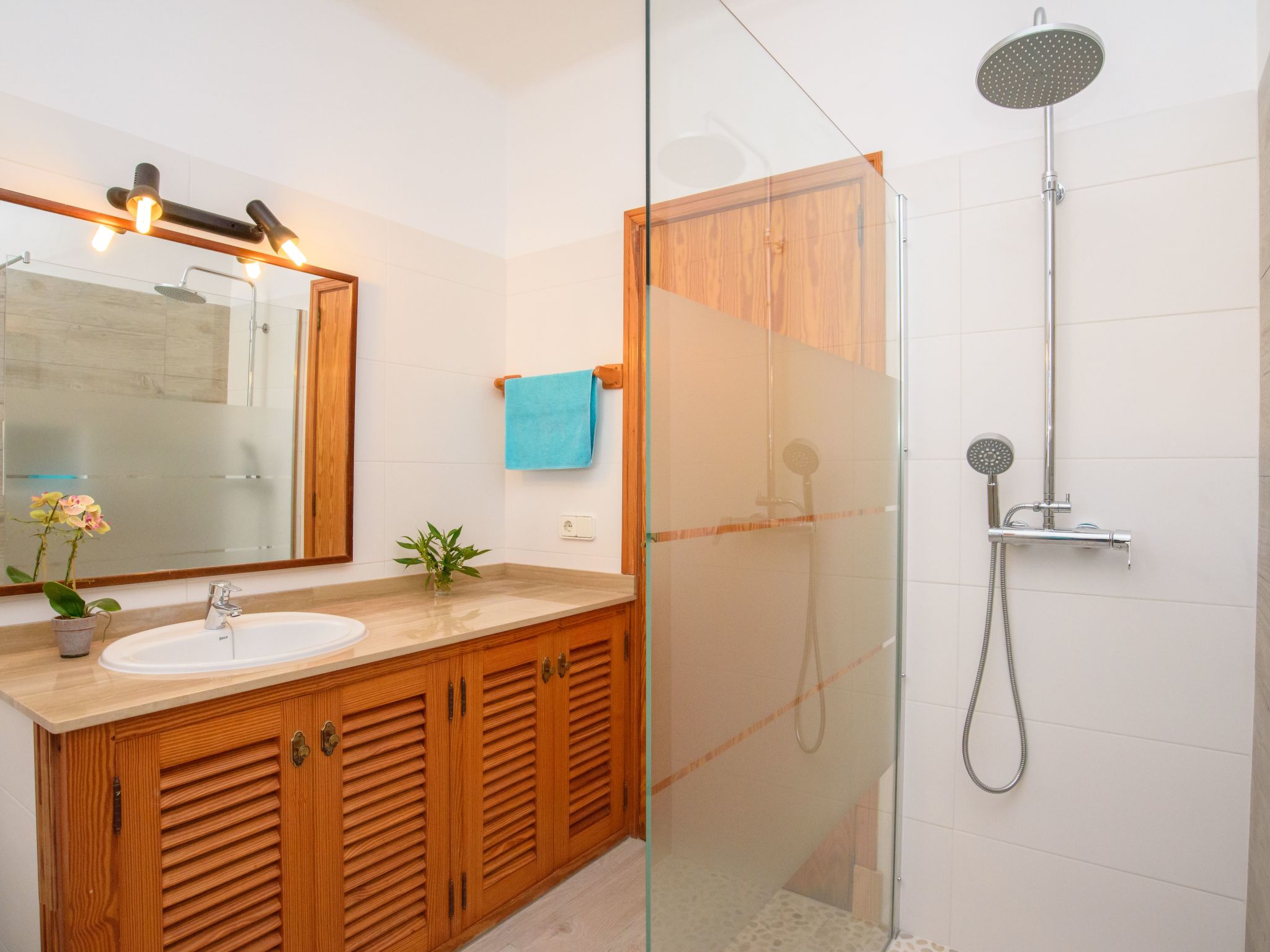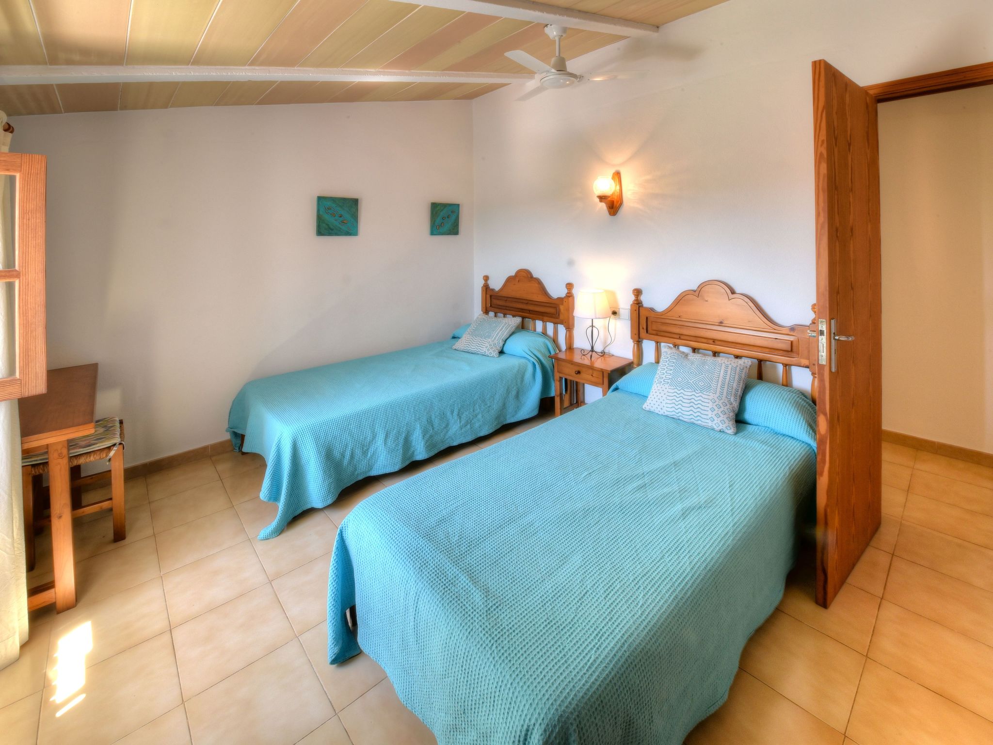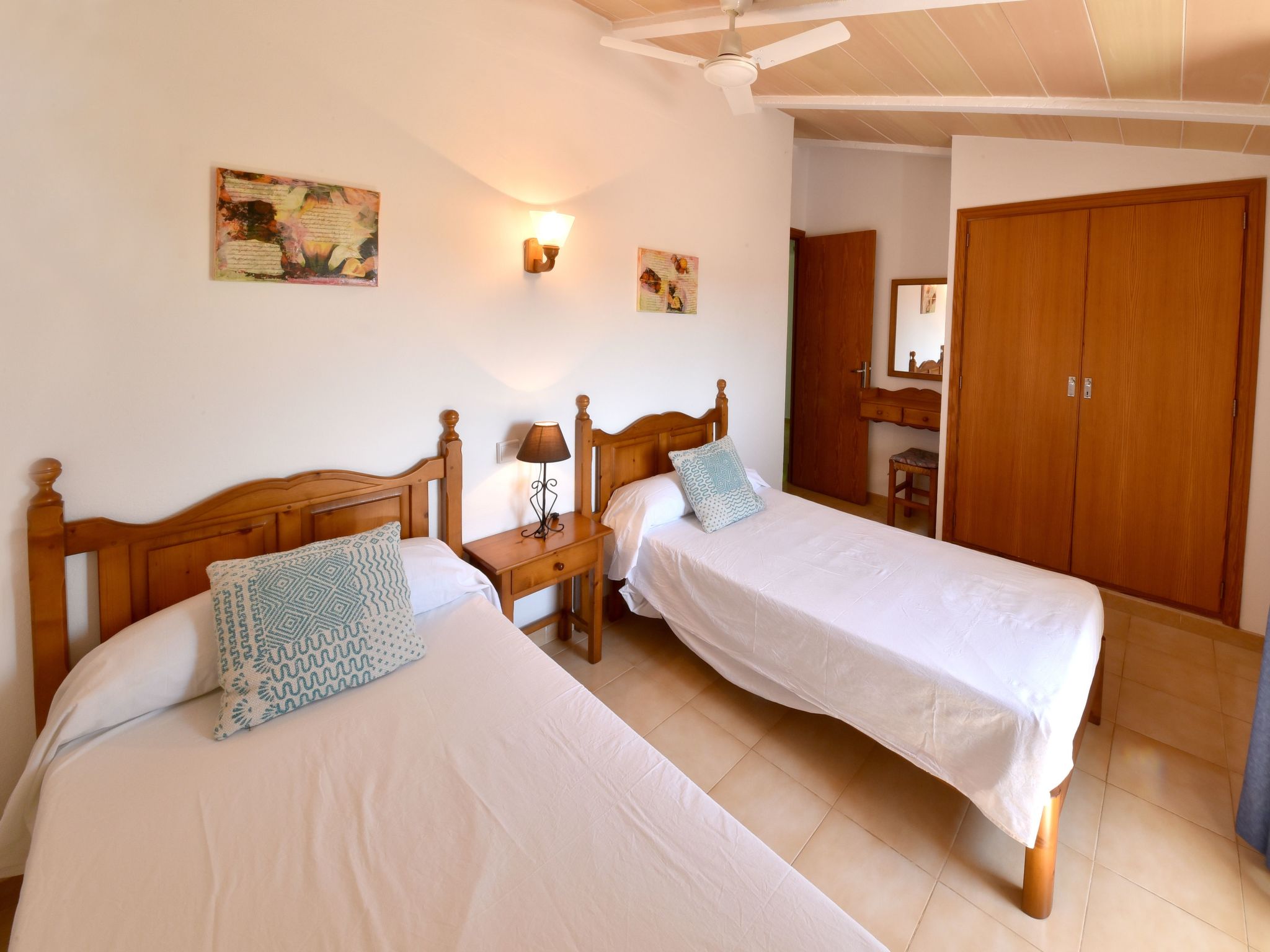 Tanca Nova is a traditional Mallorcan finca located between S'Horta and Cala D'Or, perfect for enjoying the rural tranquillity on the one hand, and the small village of S'Horta or the lively centre of Cala D'Or are only a few minutes away by car on the other. The numerous beautiful sandy bays on the south-east coast, especially Cala Sanau, are also just a few minutes away by car. Tanca Nova is a traditional finca with rural charm. On the ground floor of the house, you enter directly into the rustic dining room, decorated in warm colours, which flows directly into the cosy living room. Right next to the dining area is the well-equipped, renovated kitchen with a view of the plant-filled courtyard. There is also a double bedroom with en-suite bathroom and a guest toilet on the ground floor. Stairs lead from the living room to the floor, where there are 3 further simple but inviting bedrooms, each with two single beds. A further renovated bathroom with shower is available here.