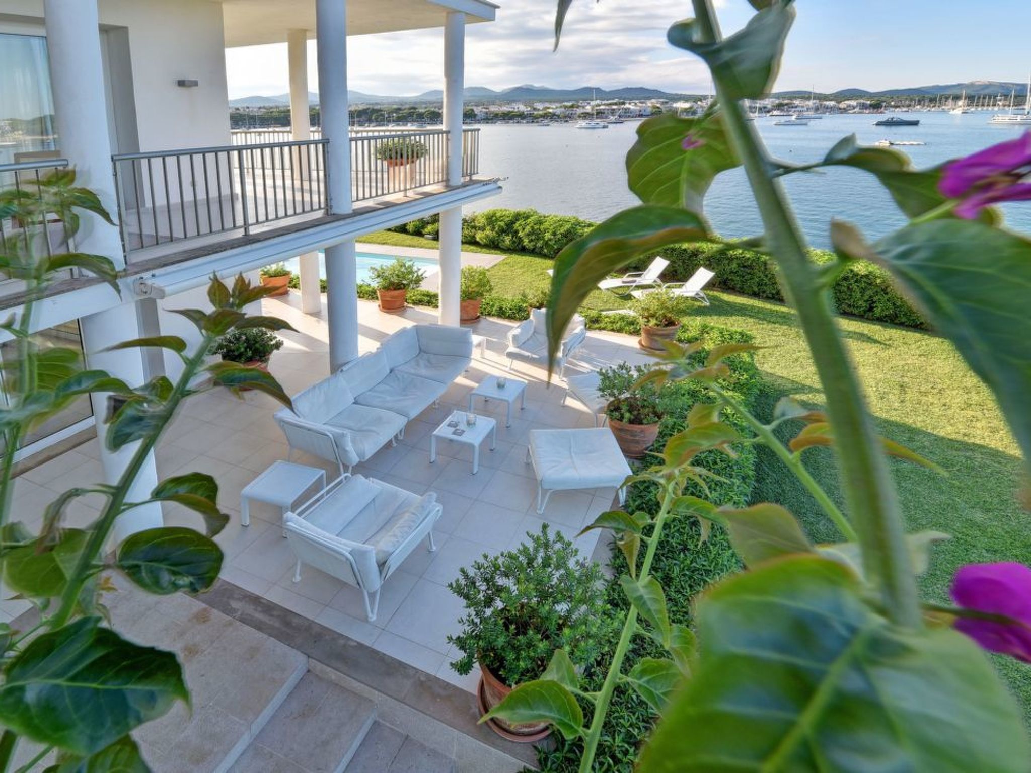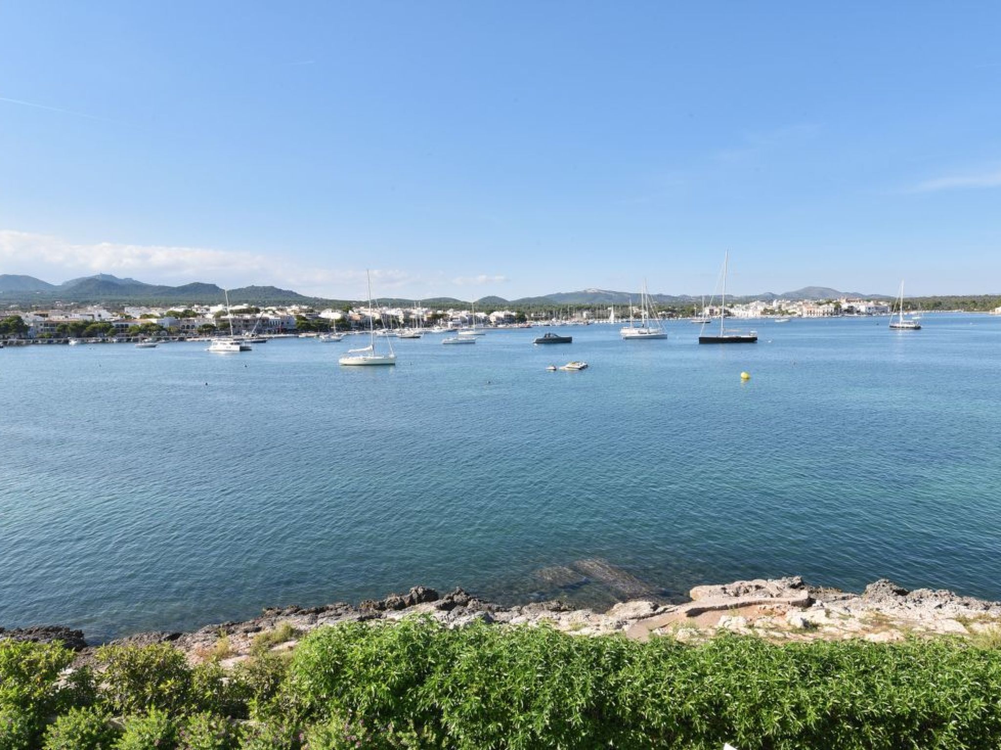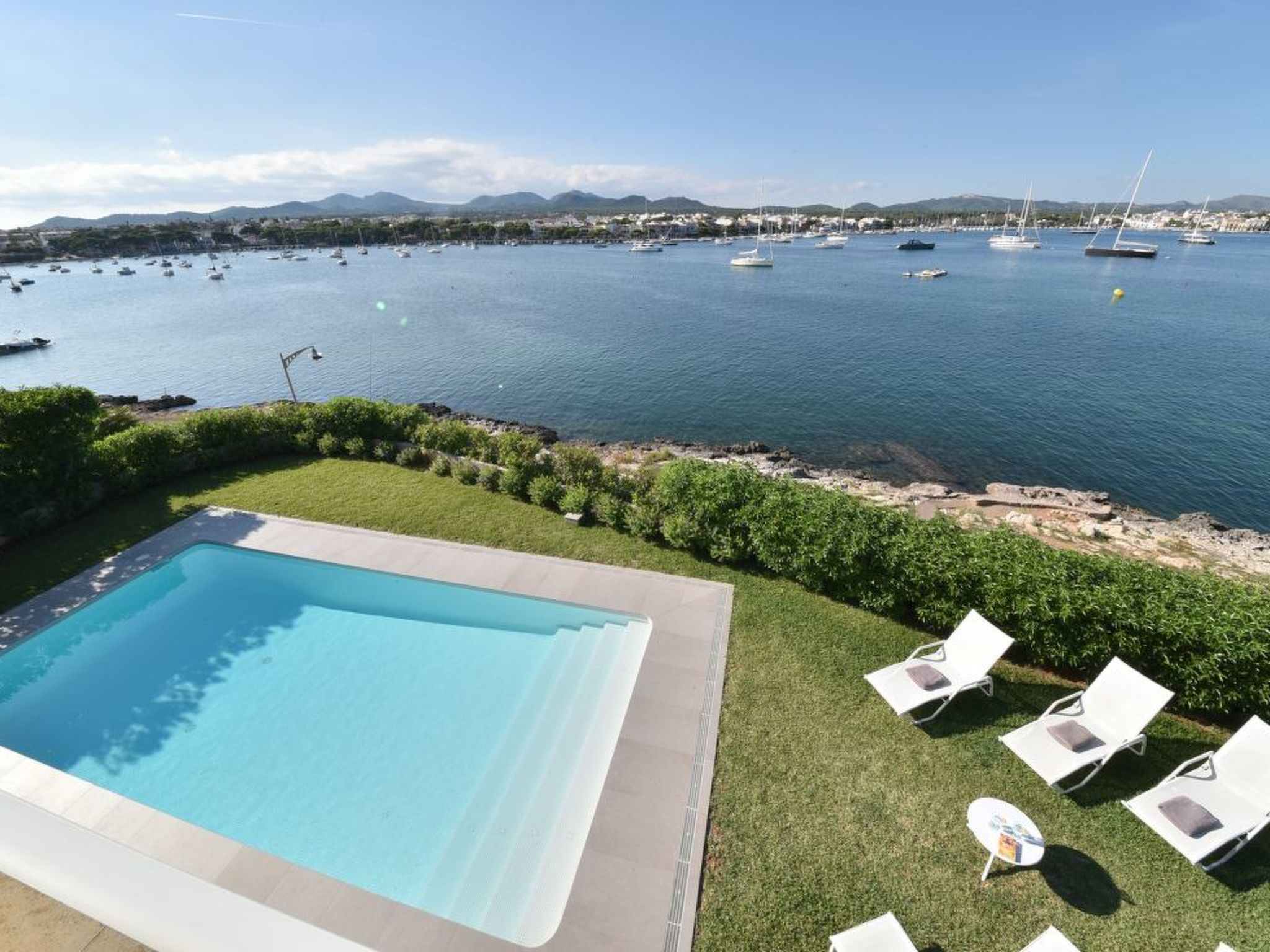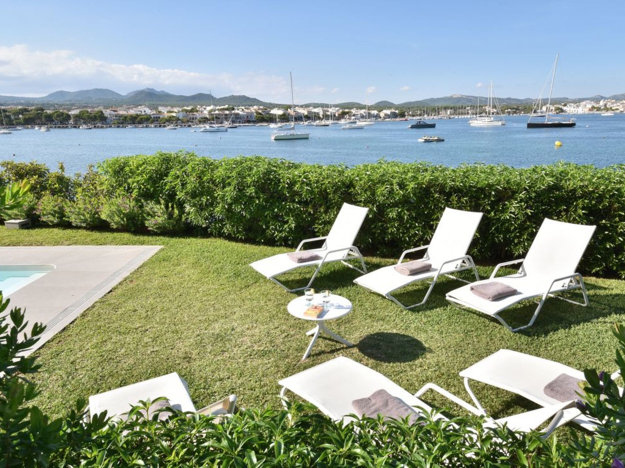 The long, corner terrace offers magnificent views over the water and the harbour of Porto Colom. Beautiful outdoor furniture and a mobile barbecue invite you to enjoy long, relaxed and cosy dinners. The rectangular pool (10 m x 4 m, depth min. 1.10 m, max. 1.70 m) below the terrace is fenced and therefore child-proof. The spacious lawn next to it invites you to sunbathe.