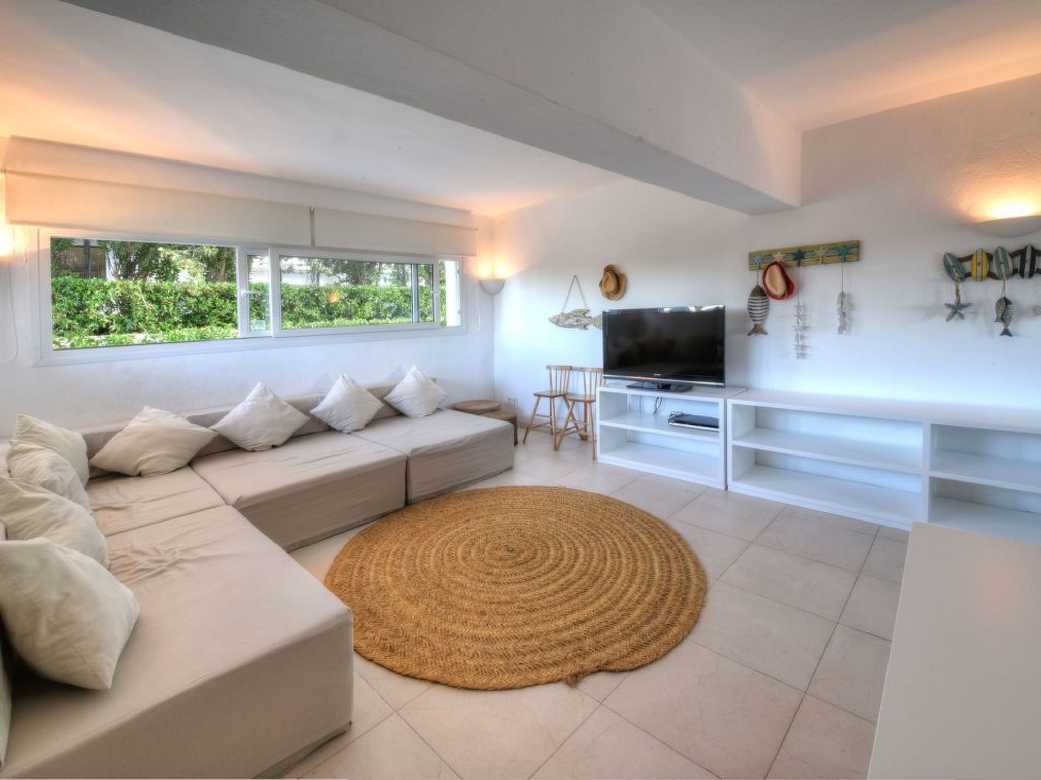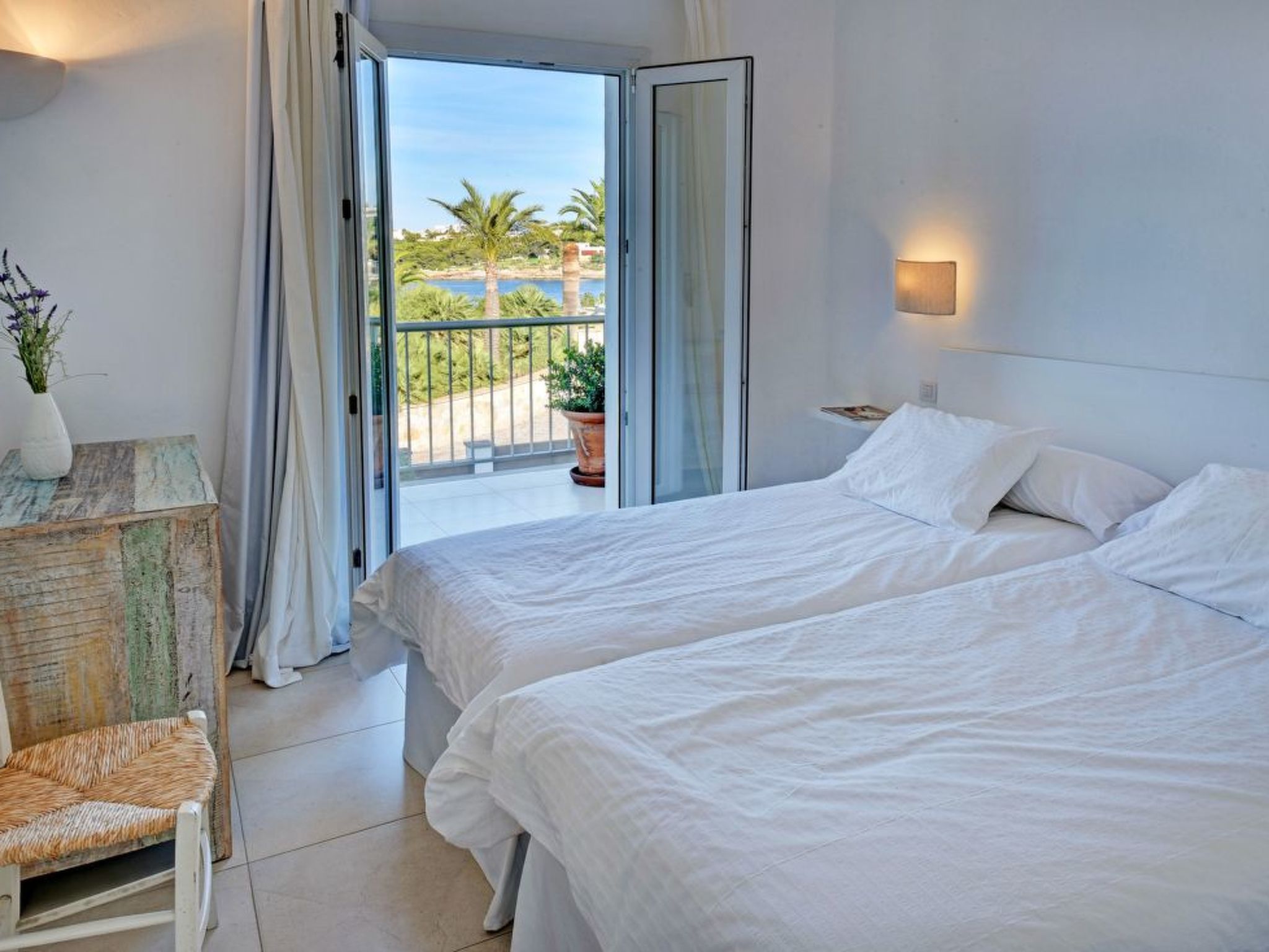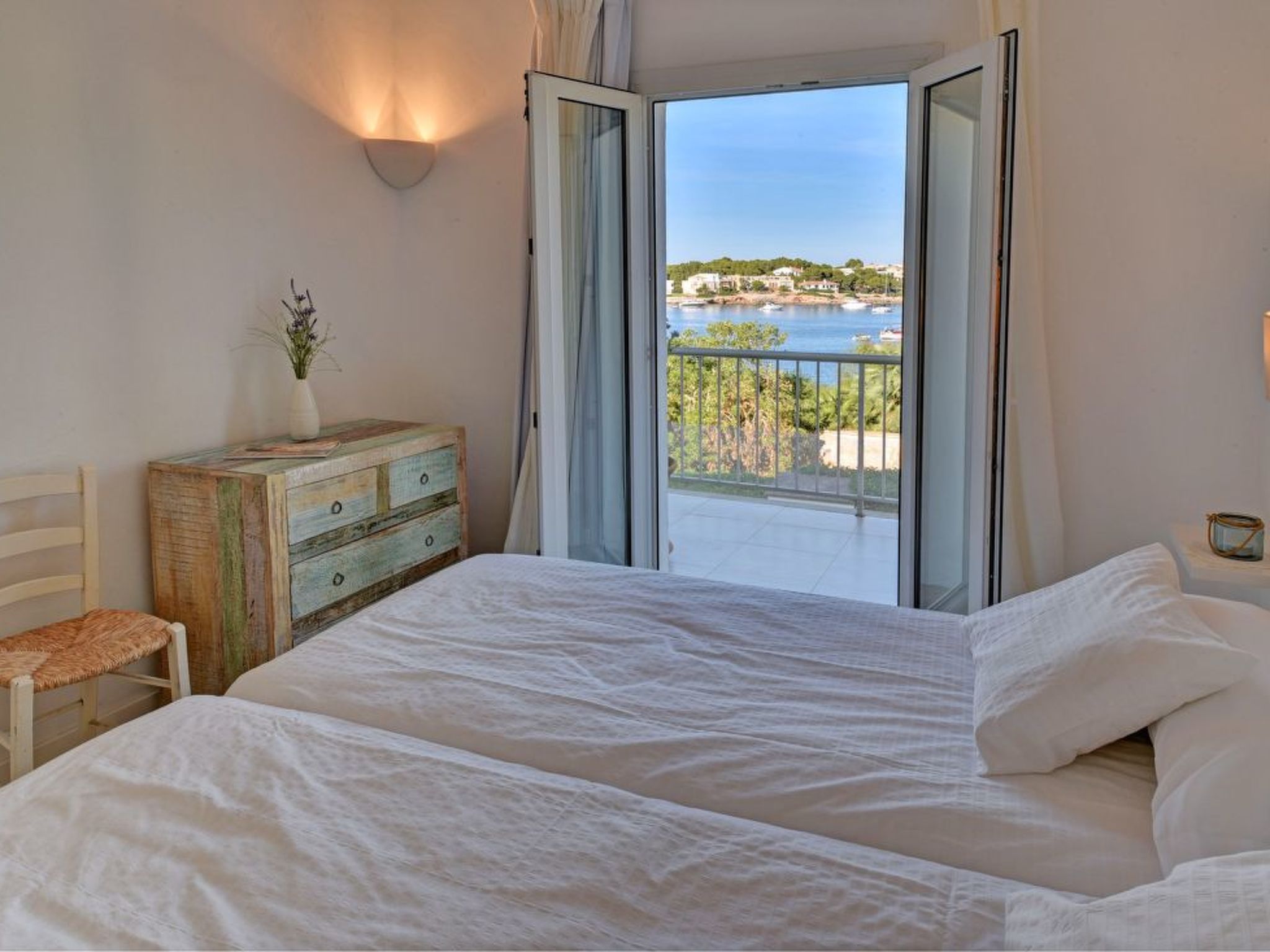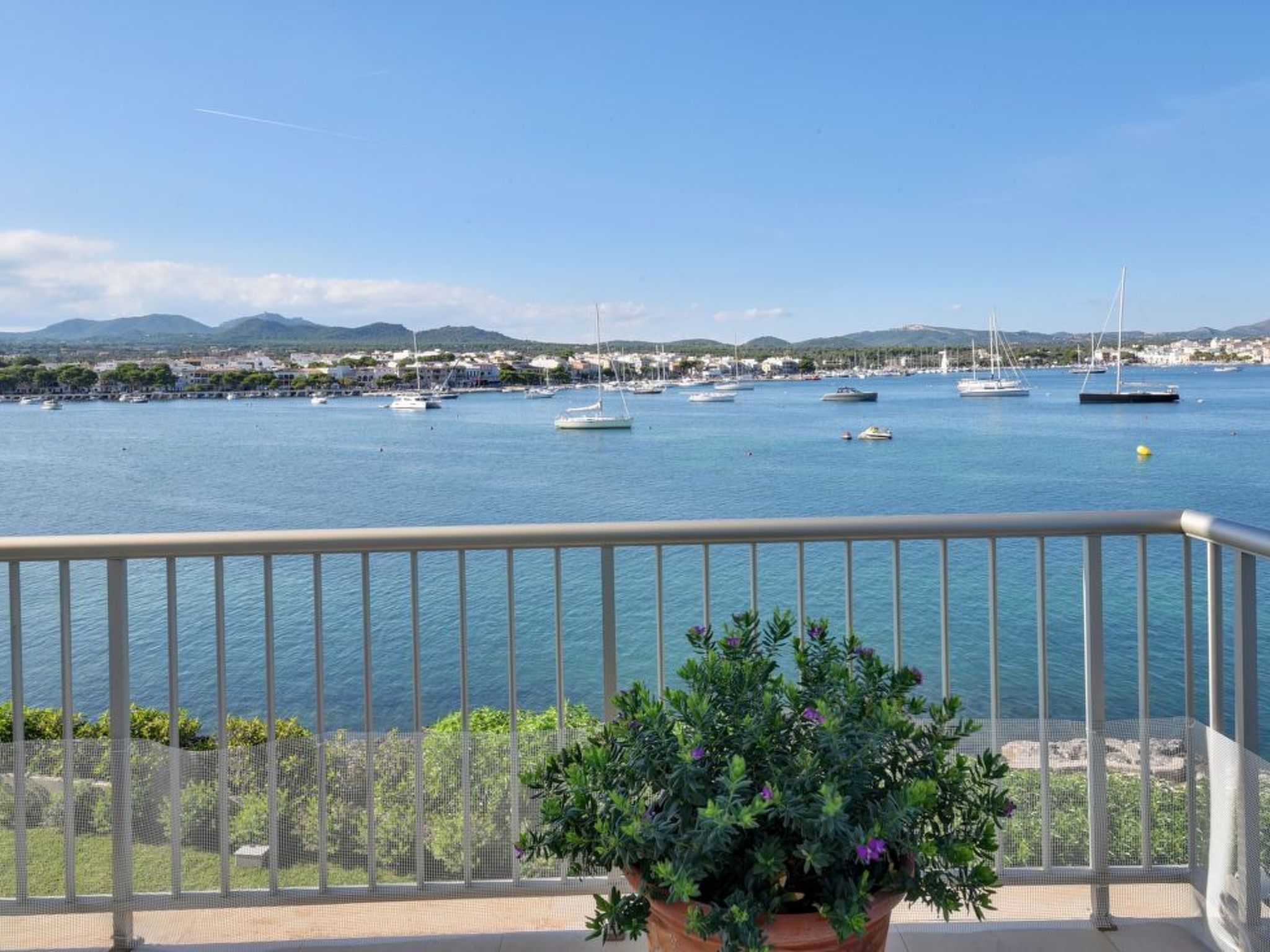 The long, corner terrace offers magnificent views over the water and the harbour of Porto Colom. Beautiful outdoor furniture and a mobile barbecue invite you to enjoy long, relaxed and cosy dinners. The rectangular pool (10 m x 4 m, depth min. 1.10 m, max. 1.70 m) below the terrace is fenced and therefore child-proof. The spacious lawn next to it invites you to sunbathe.