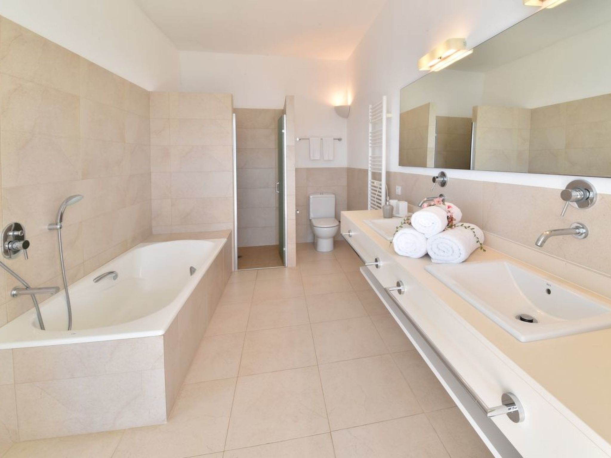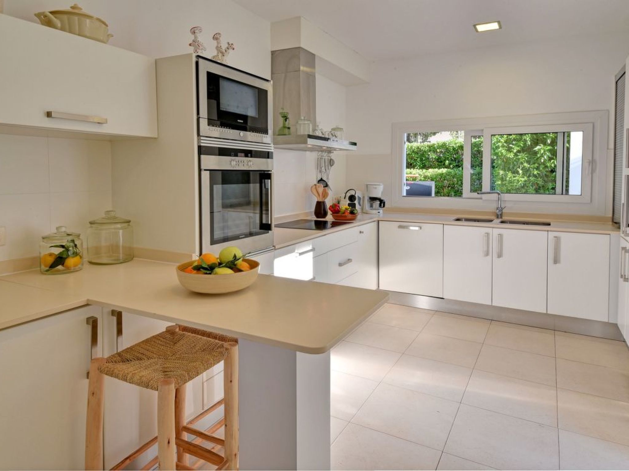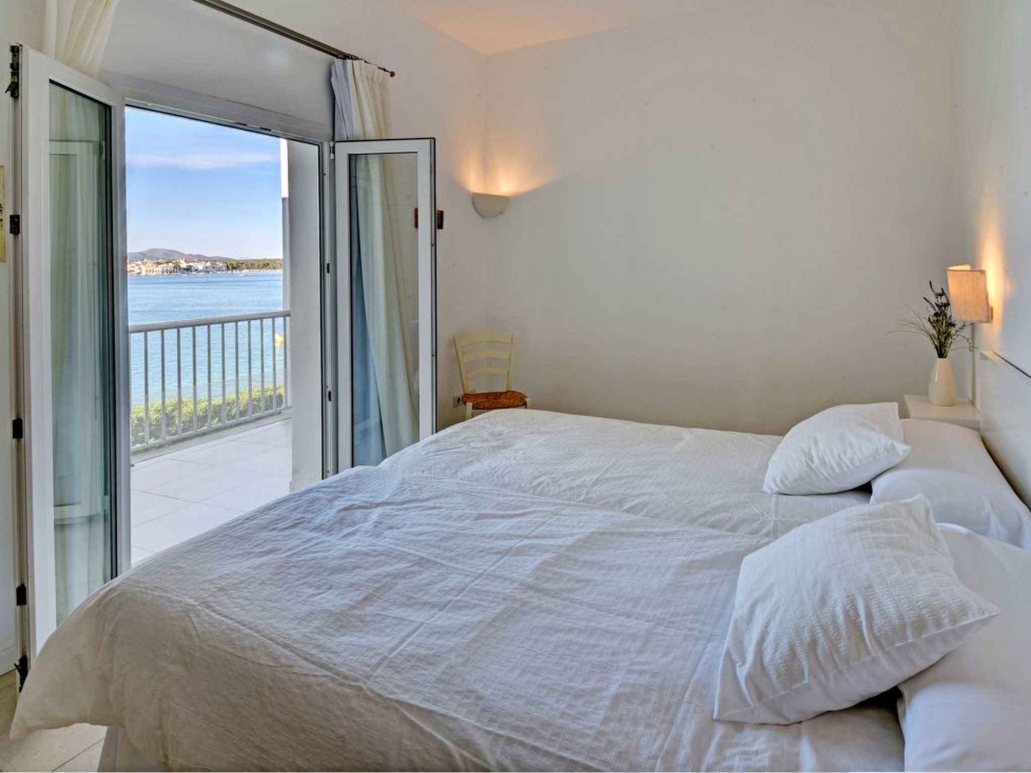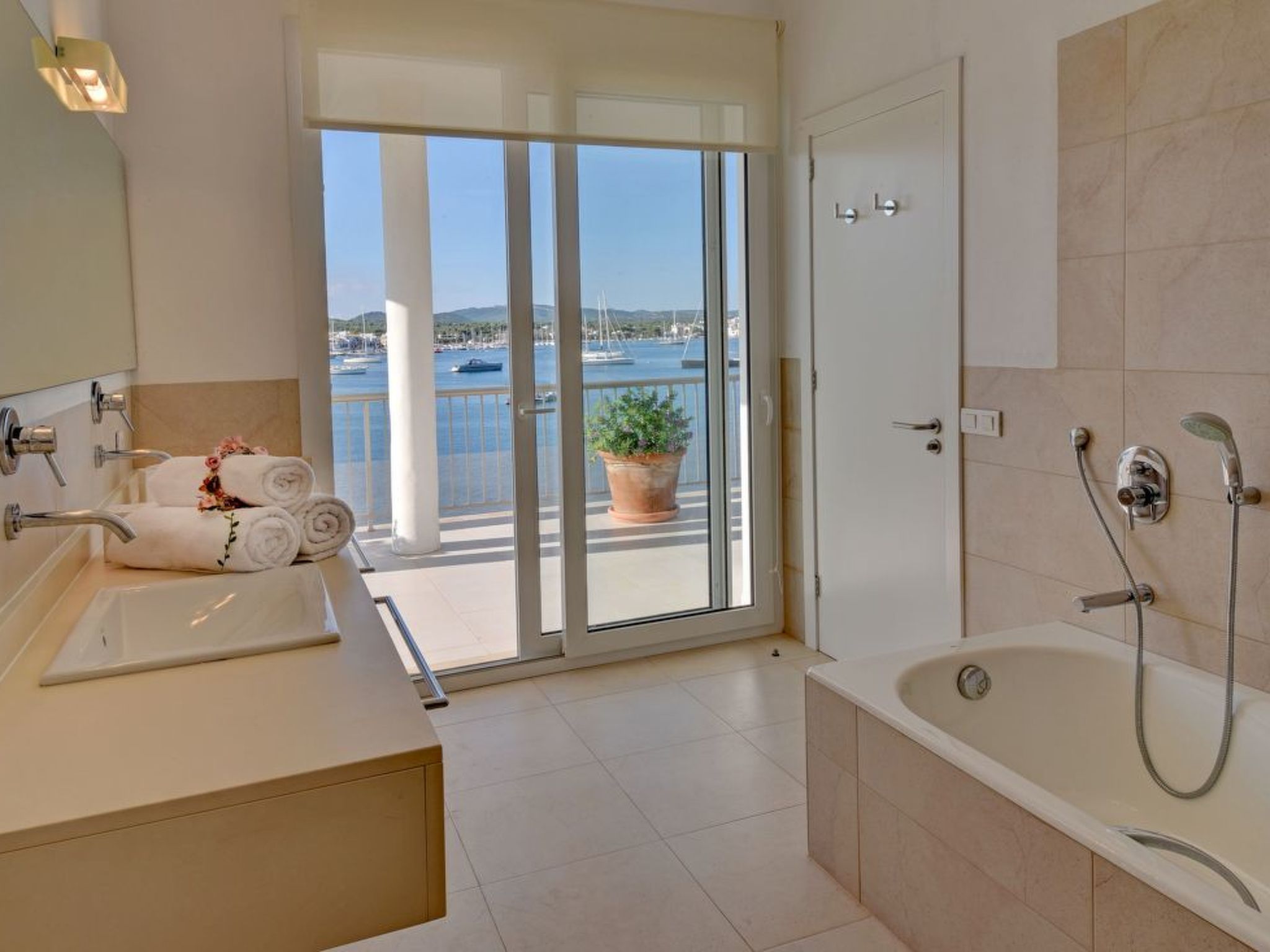 On the ground floor is the airy living/dining room, furnished with stylish, light-coloured dining and living room furniture, satellite TV and DVD. Large glazed sliding doors lead out onto the long terrace with uninterrupted views over the harbour. Adjacent is the modern, fully equipped kitchen with induction hob. A laundry room adjoins. Also on the ground floor is a playroom for the little ones, which offers space for painting, romping around etc. and a shower room. A small double bedroom with en suite shower room completes the ground floor. Upstairs there are 4 double bedrooms, all with double beds. The master bedroom has a full bathroom with bath and shower en suite. 2 further double bedrooms share a full bathroom. The last double bedroom has an en suite shower room.