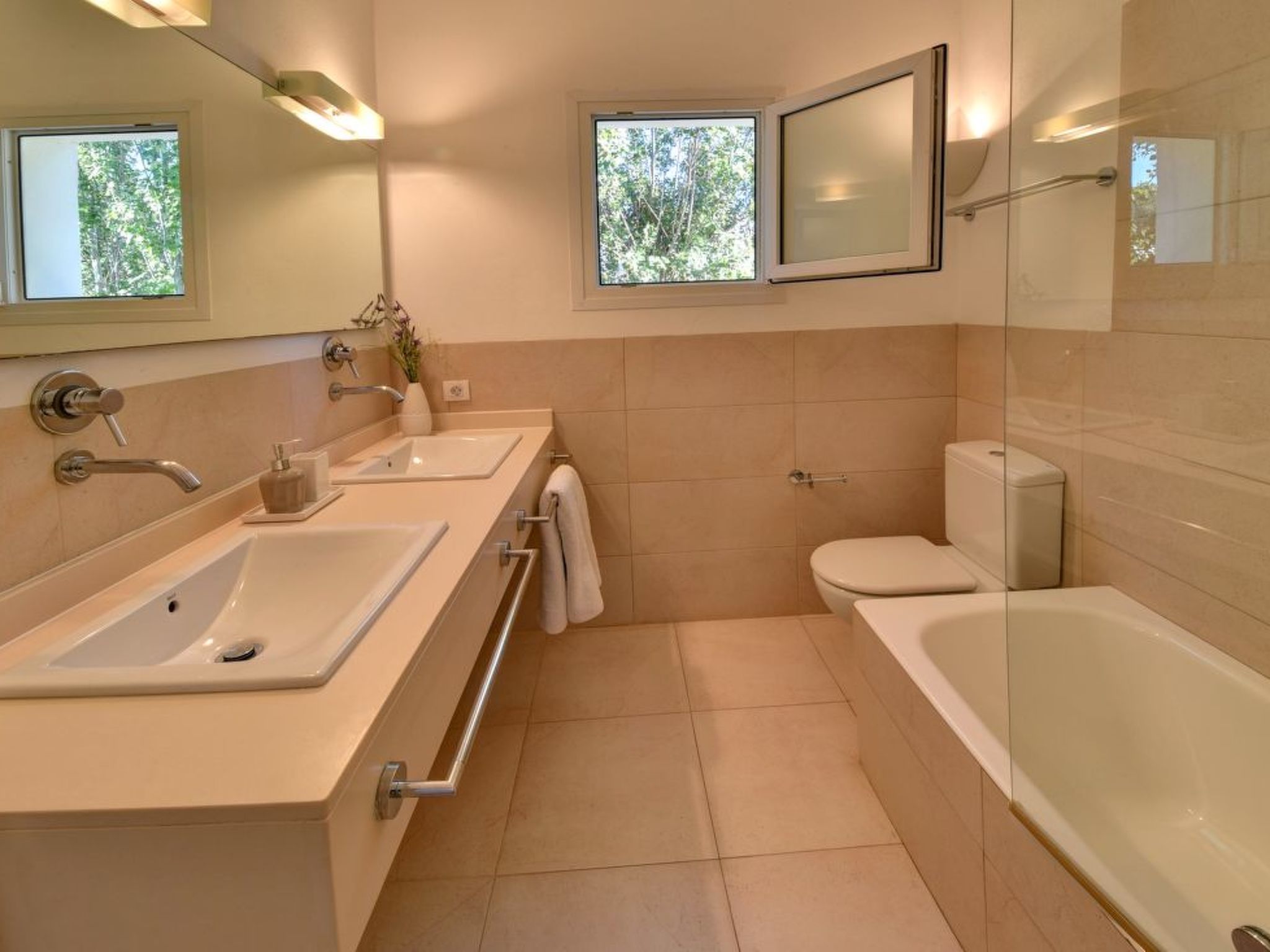All bedrooms and the living area have hot/cold air conditioning with set times of use (bedrooms: 20:00 to 08:00, living area: 10:00 to 20:00). The price includes bed linen, towels for use in the house, tea towels, final cleaning and all additional costs (electricity, water, gas). A high chair and a cot (60 x 120 cm) can be provided free of charge.