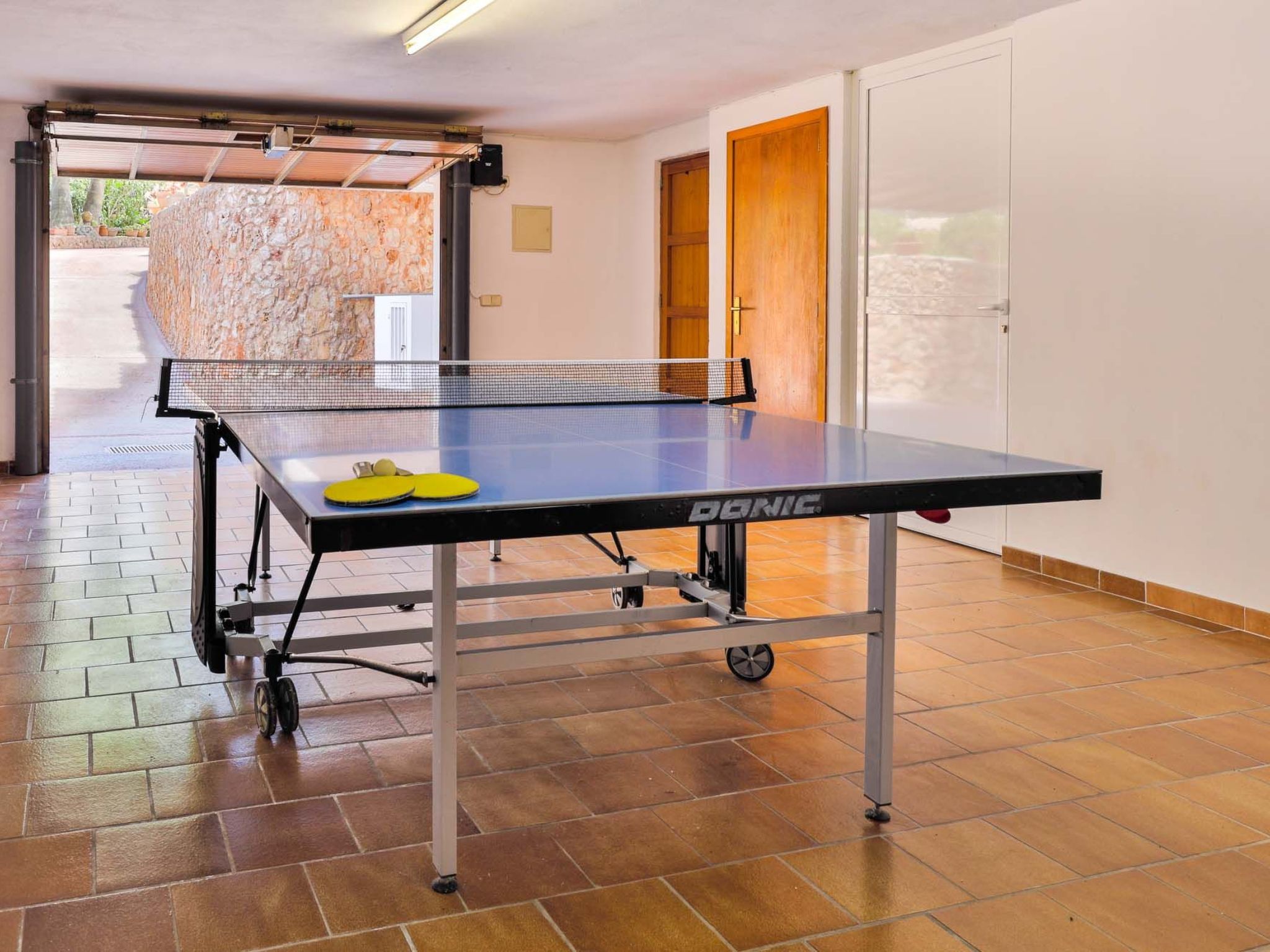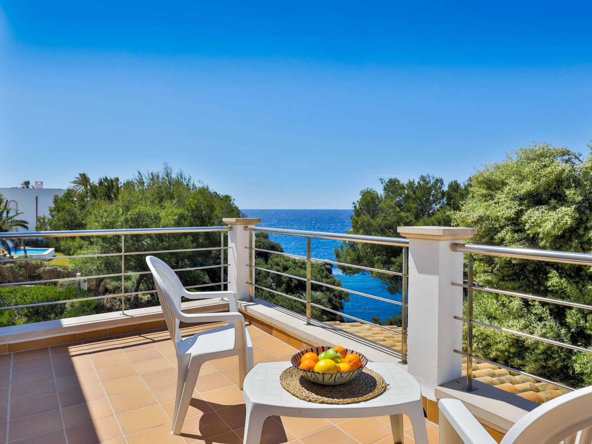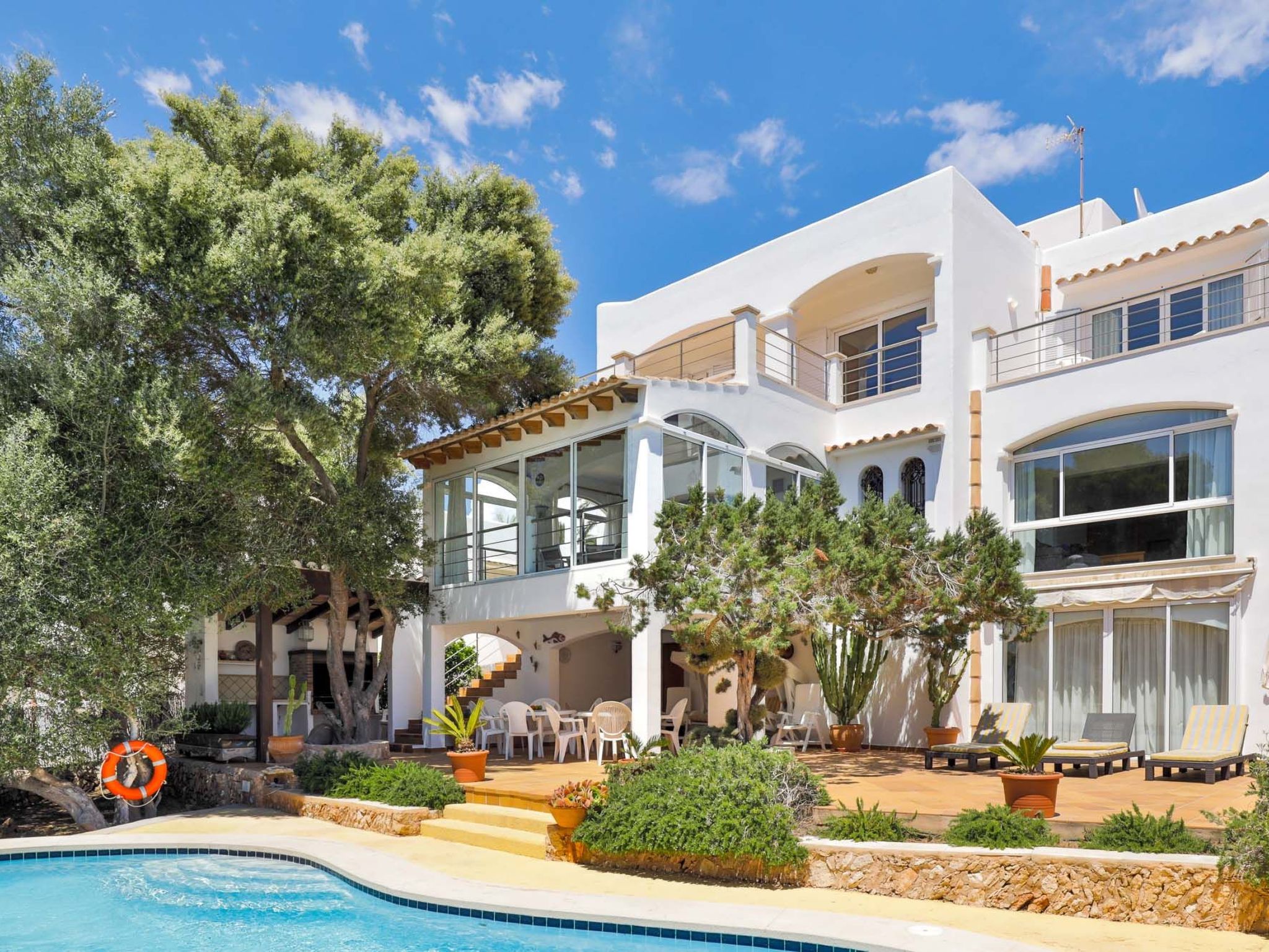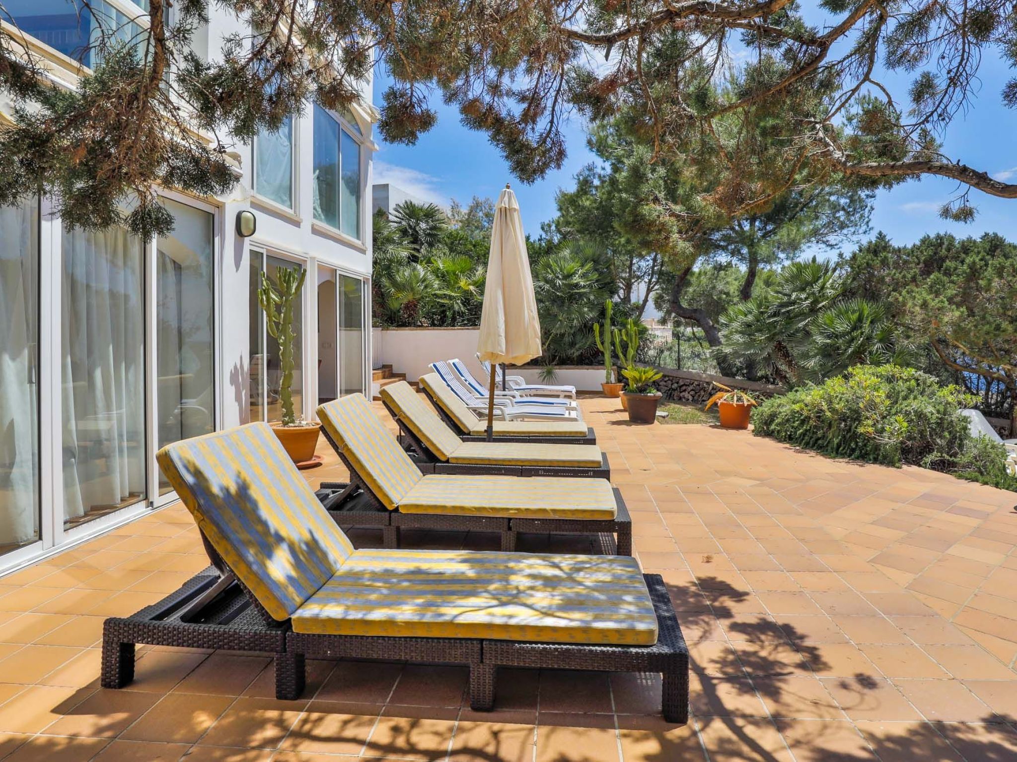 The reception area on the ground floor leads into a dining room. Sliding glass doors lead into a conservatory with a further dining table, sofas and partial sea views. Adjacent to the dining room are the kitchen and the living room, where beautiful views are also a priority, with the sofa overlooking the pool area and the sea beyond. There is also a satellite TV in the living room and WLAN internet access is available. The living room leads to a bedroom with 2 single beds and en suite shower room. On the ground floor there is also a utility room, guest toilet and access to the garage, which leads to the pool terrace. There are a further 4 bedrooms on the 1st floor. The master bedroom with double bed, dressing room and en suite bathroom with separate shower and terrace with sea views. The 3 remaining bedrooms, one with double bed, 2 with 2 single beds each, share a bathroom and on the terrace near the pool (10 x 5 m) there is a room with sofas and table; ideal for children to play on fresh days in the low season. Shower room/ WC in the garage. Air conditioning hot/cold with set hours of use.