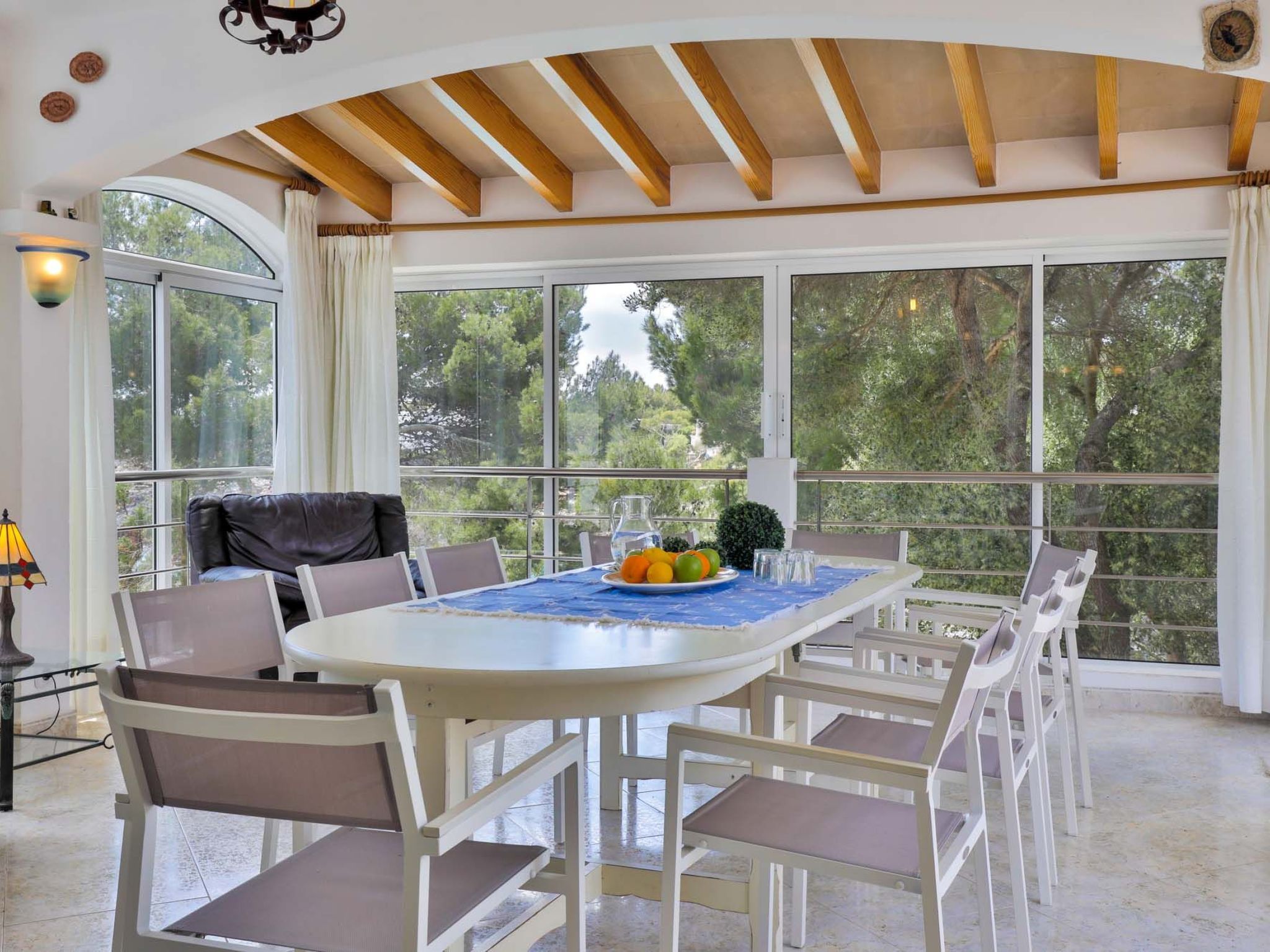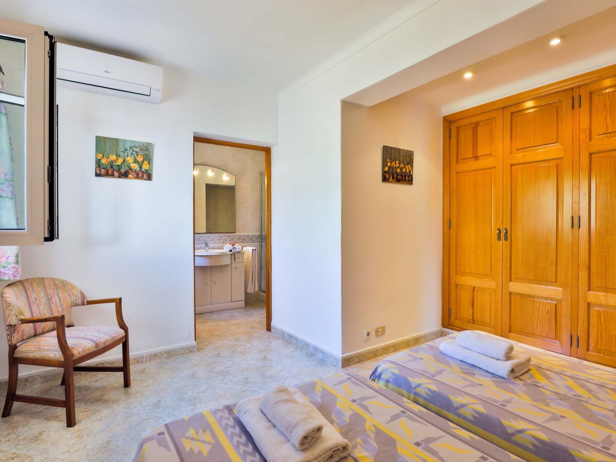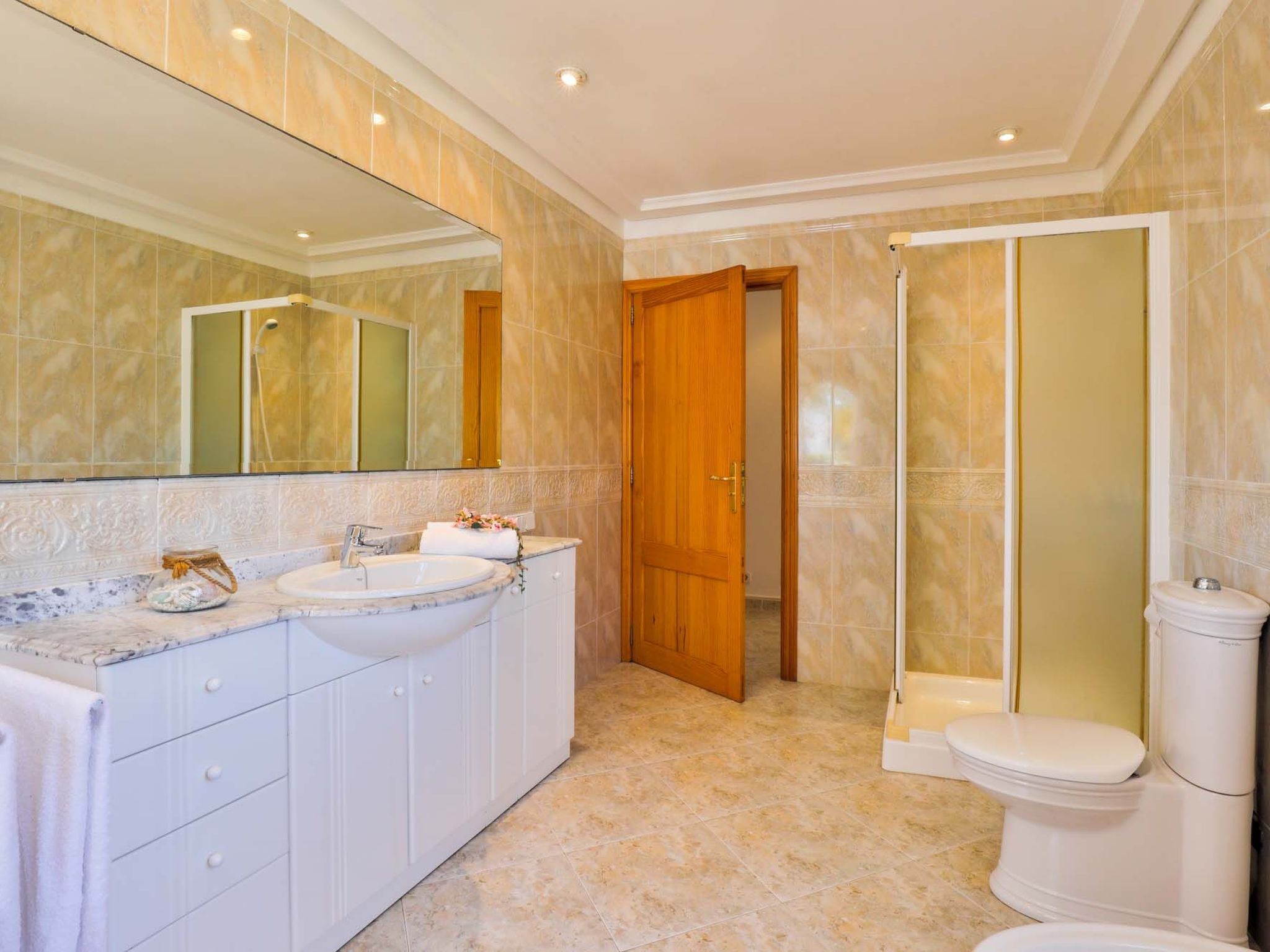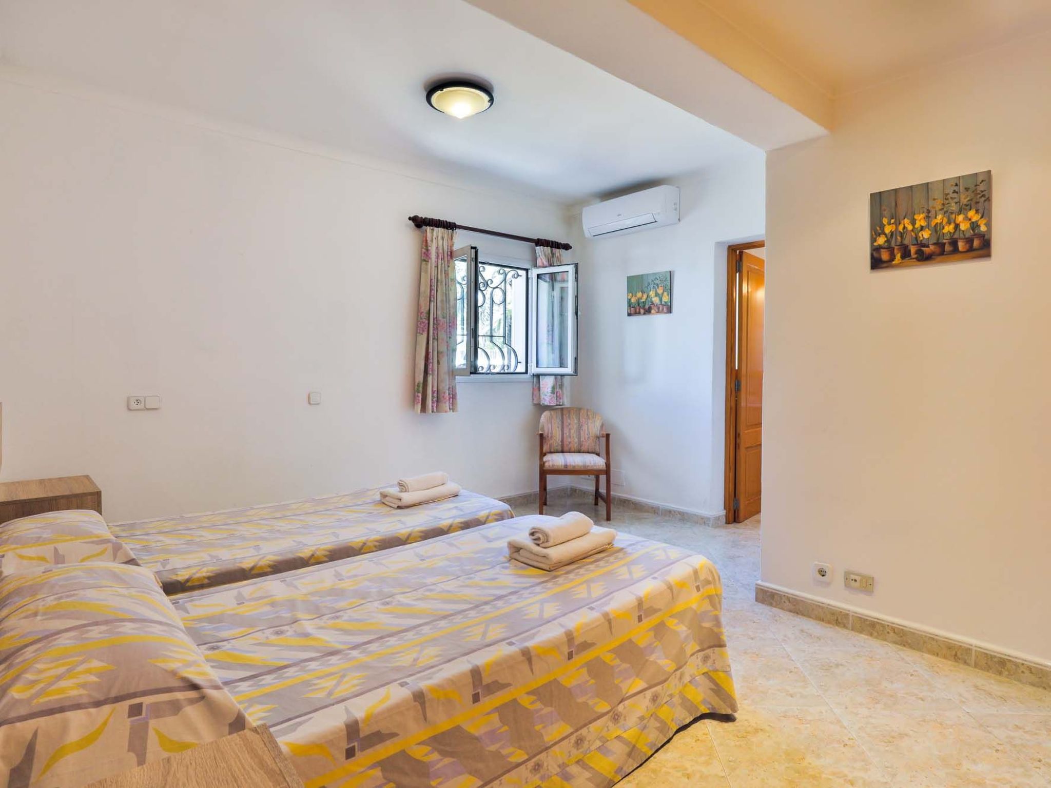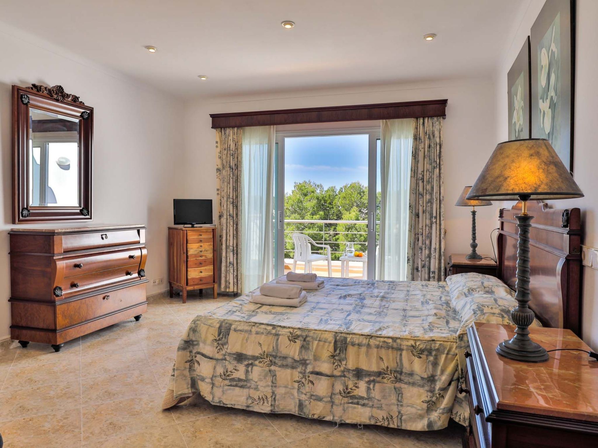 The reception area on the ground floor leads into a dining room. Sliding glass doors lead into a conservatory with a further dining table, sofas and partial sea views. Adjacent to the dining room are the kitchen and the living room, where beautiful views are also a priority, with the sofa overlooking the pool area and the sea beyond. There is also a satellite TV in the living room and WLAN internet access is available. The living room leads to a bedroom with 2 single beds and en suite shower room. On the ground floor there is also a utility room, guest toilet and access to the garage, which leads to the pool terrace. There are a further 4 bedrooms on the 1st floor. The master bedroom with double bed, dressing room and en suite bathroom with separate shower and terrace with sea views. The 3 remaining bedrooms, one with double bed, 2 with 2 single beds each, share a bathroom and on the terrace near the pool (10 x 5 m) there is a room with sofas and table; ideal for children to play on fresh days in the low season. Shower room/ WC in the garage. Air conditioning hot/cold with set hours of use.