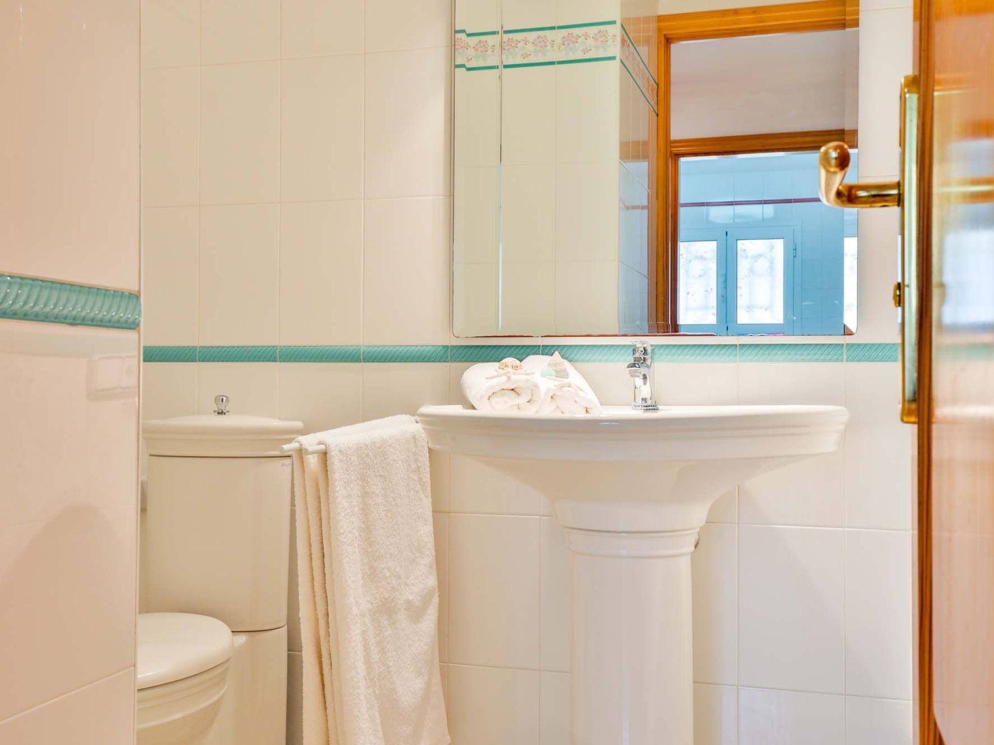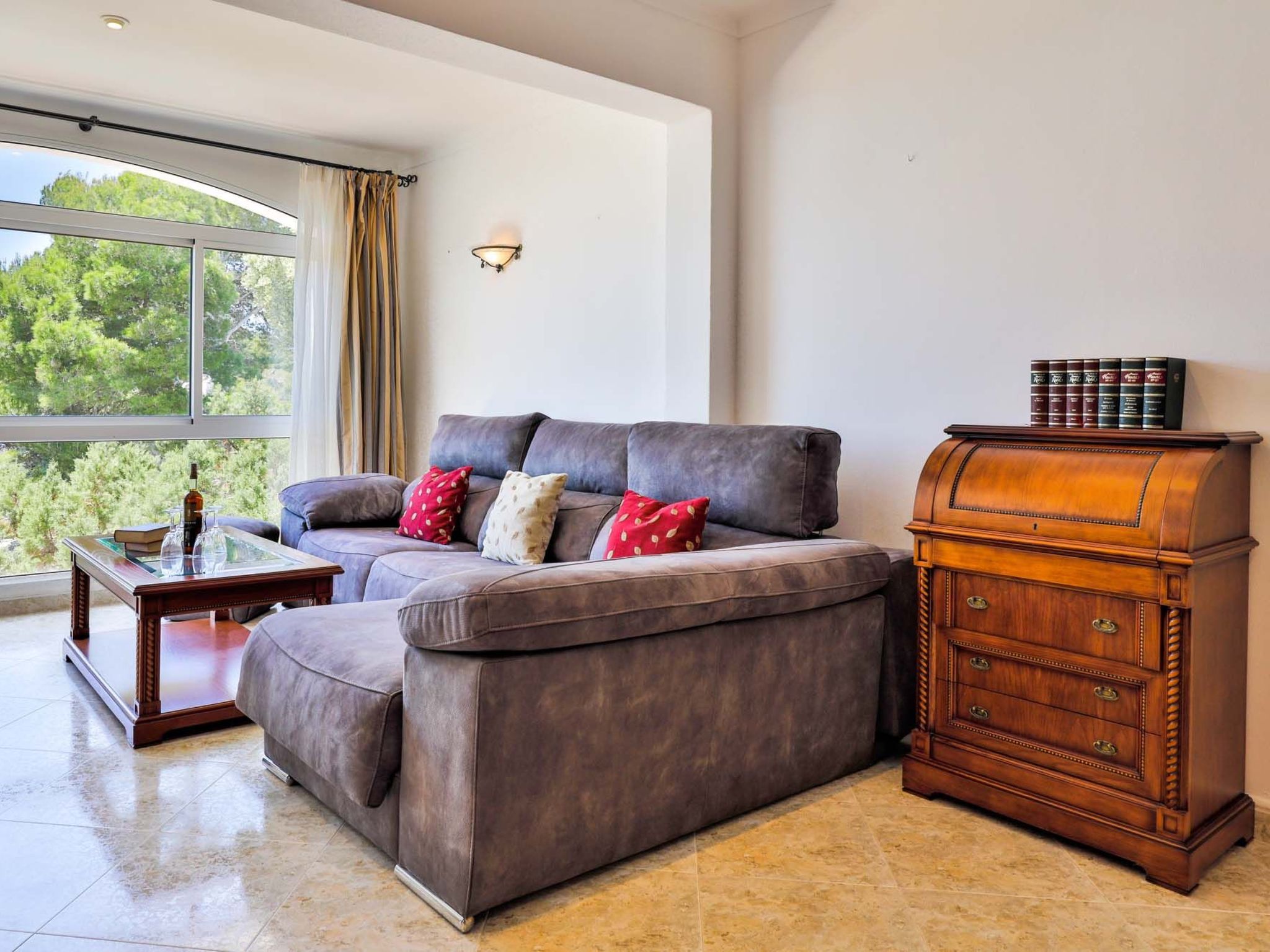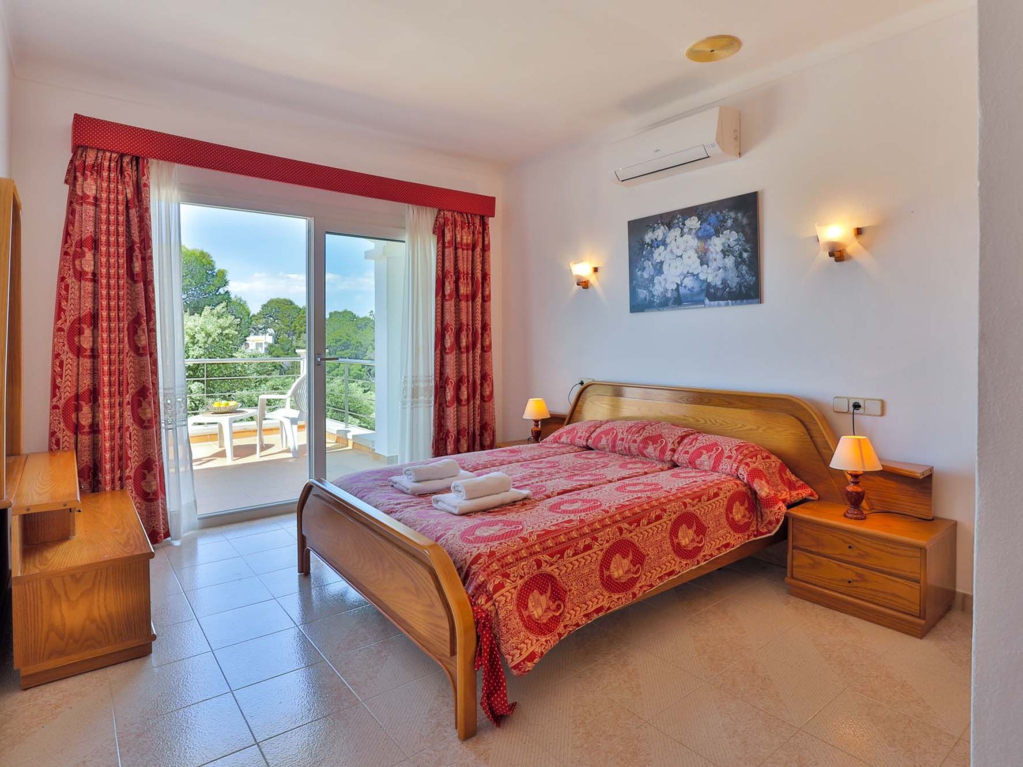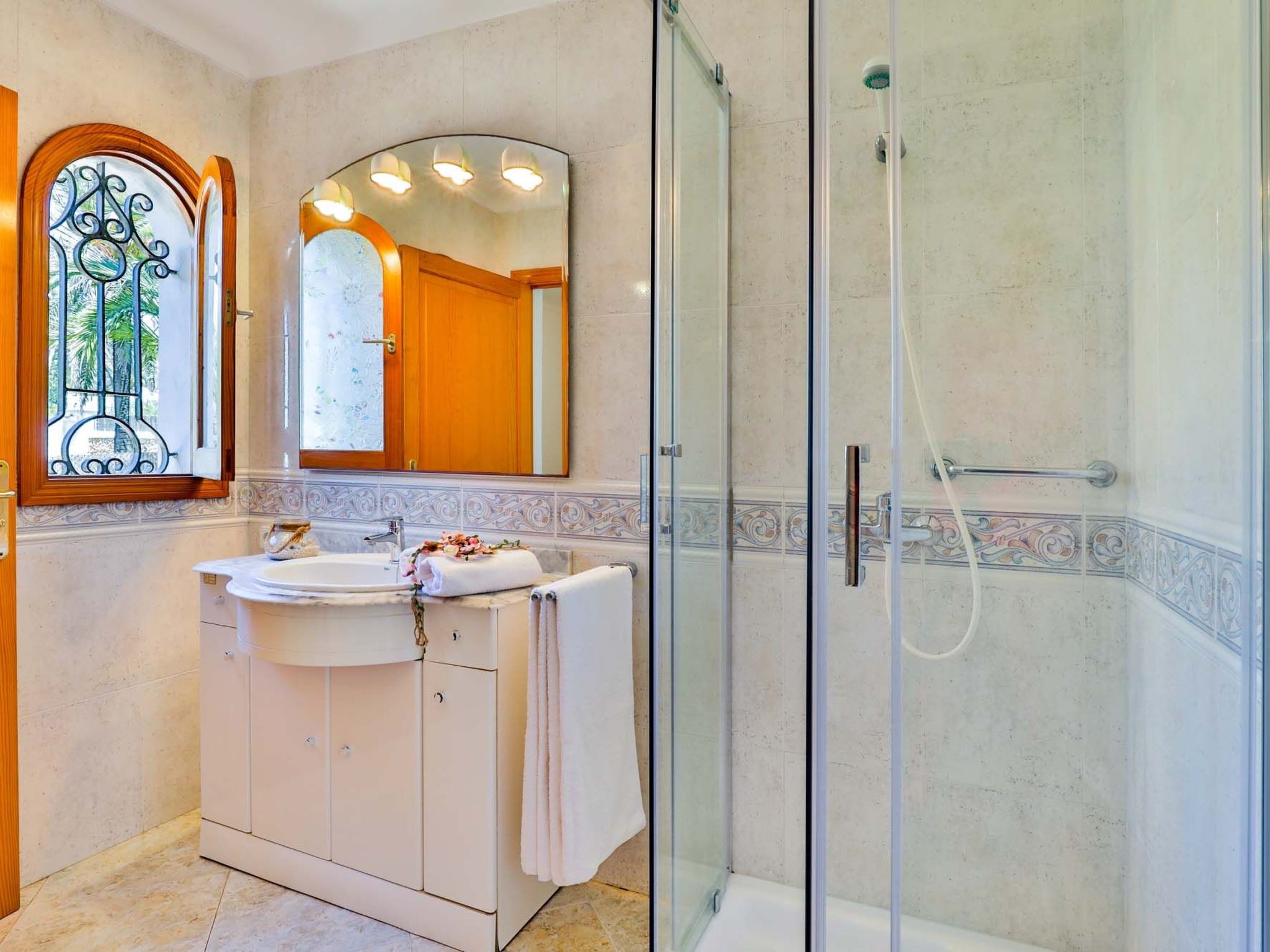 The reception area on the ground floor leads into a dining room. Sliding glass doors lead into a conservatory with a further dining table, sofas and partial sea views. Adjacent to the dining room are the kitchen and the living room, where beautiful views are also a priority, with the sofa overlooking the pool area and the sea beyond. There is also a satellite TV in the living room and WLAN internet access is available. The living room leads to a bedroom with 2 single beds and en suite shower room. On the ground floor there is also a utility room, guest toilet and access to the garage, which leads to the pool terrace. There are a further 4 bedrooms on the 1st floor. The master bedroom with double bed, dressing room and en suite bathroom with separate shower and terrace with sea views. The 3 remaining bedrooms, one with double bed, 2 with 2 single beds each, share a bathroom and on the terrace near the pool (10 x 5 m) there is a room with sofas and table; ideal for children to play on fresh days in the low season. Shower room/ WC in the garage. Air conditioning hot/cold with set hours of use.