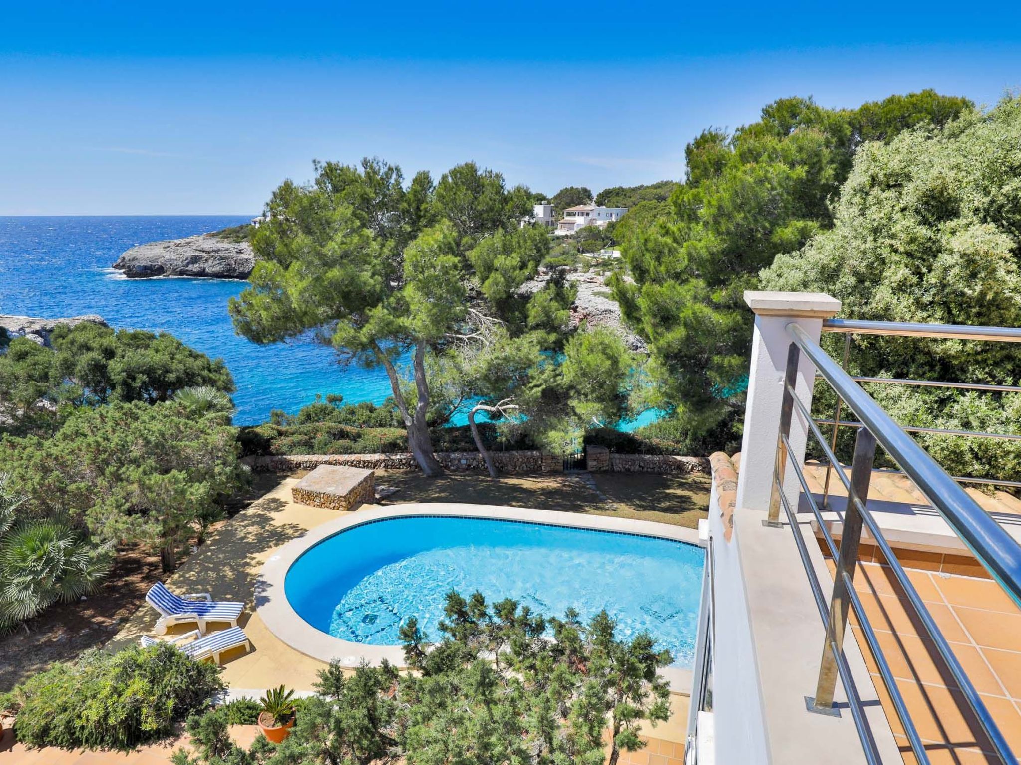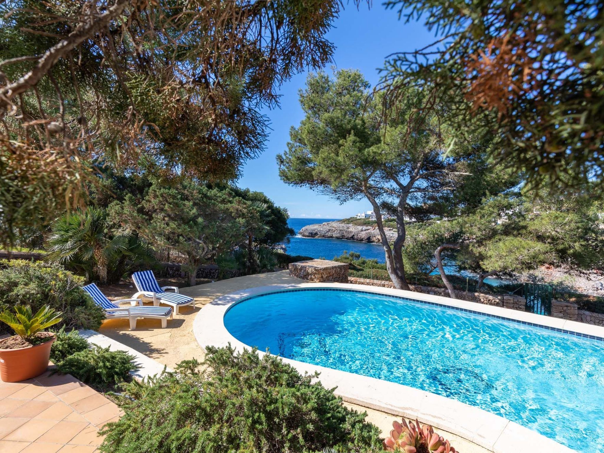 The pool is surrounded by a beautiful sun terrace and plants and, like the rest of the house, offers wonderful sea views.