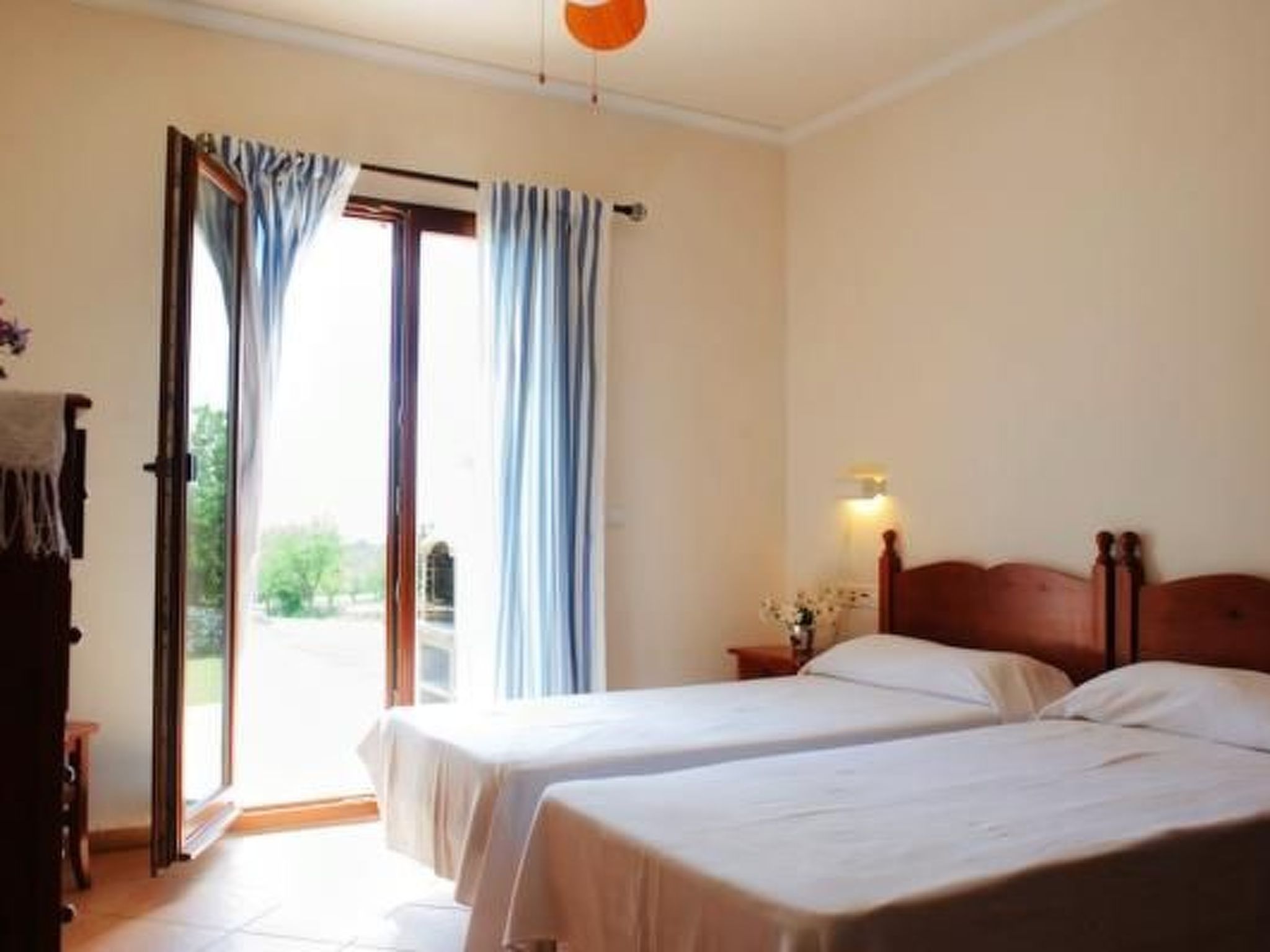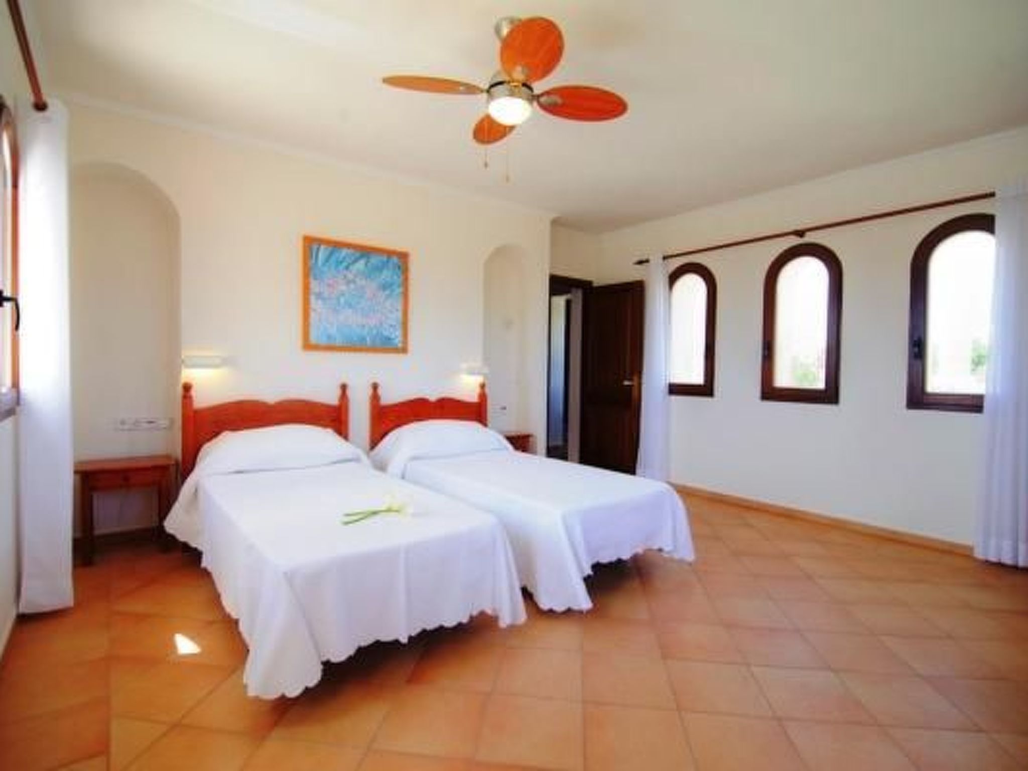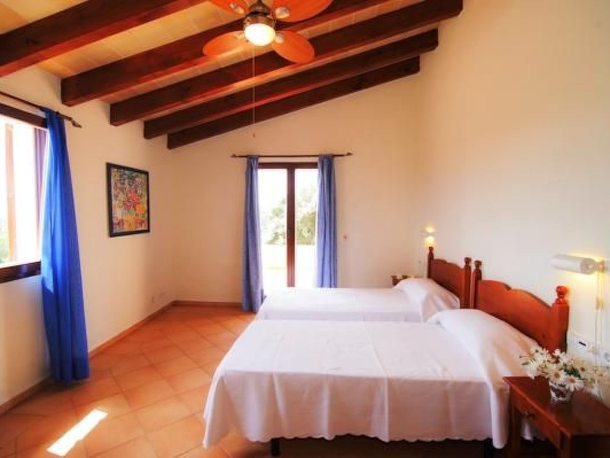Finca From the entrance area, you enter the bright dining area with sliding glass doors to the pool terrace. An open archway leads to the living area with cosy sofas, satellite TV, DVD and fireplace. The modern kitchen is superbly equipped. Next door is a bedroom with two single beds, bathroom and private access to the pool terrace. Upstairs is the master bedroom with two single beds, dressing area, en suite shower room and private sun terrace. The third bedroom, also with two single beds and dressing area, has an en-suite shower room. There is also a service room with washing machine in the basement. The house is very tastefully furnished to a high standard and equipped with ceiling fans and underfloor heating.