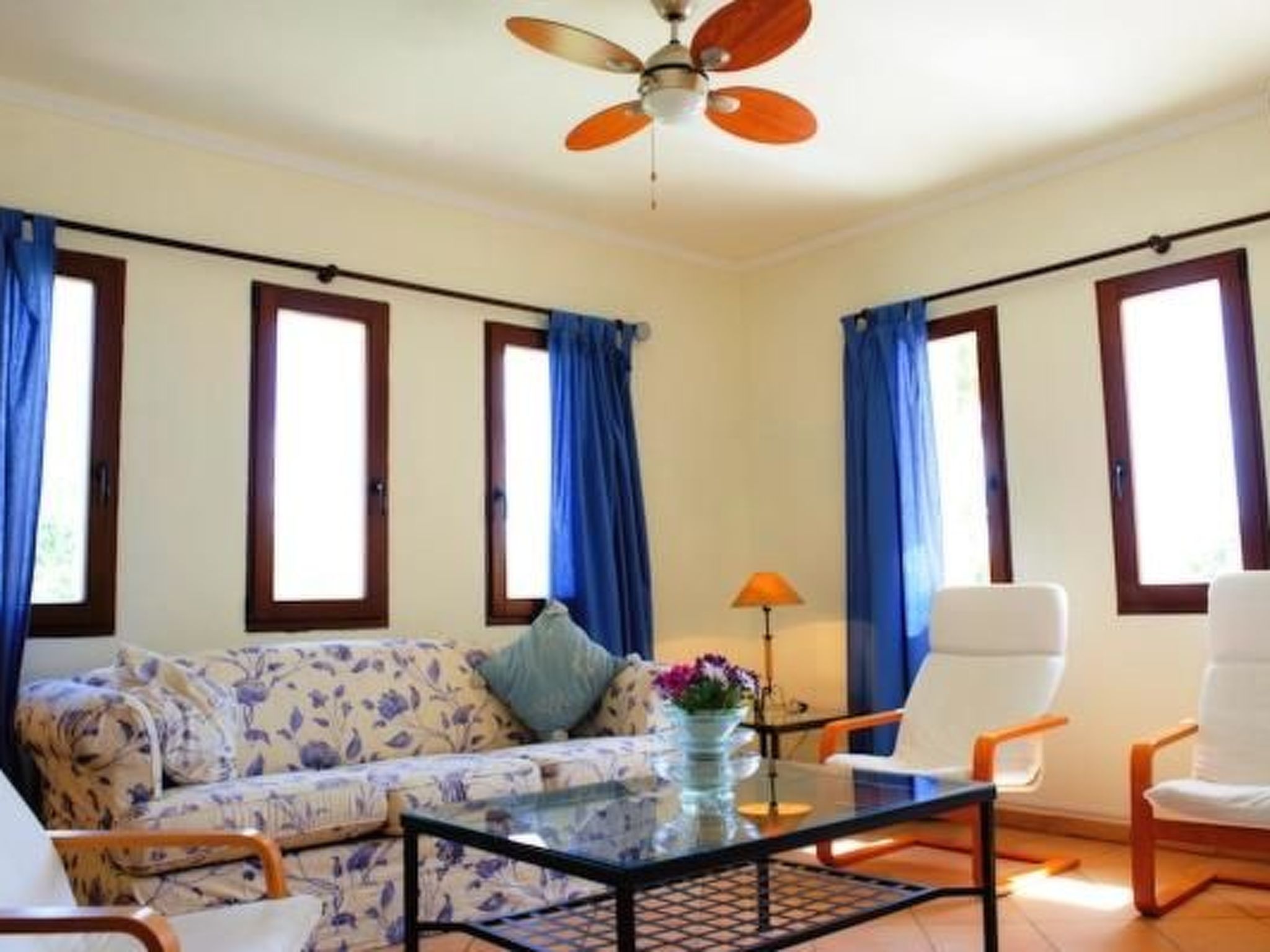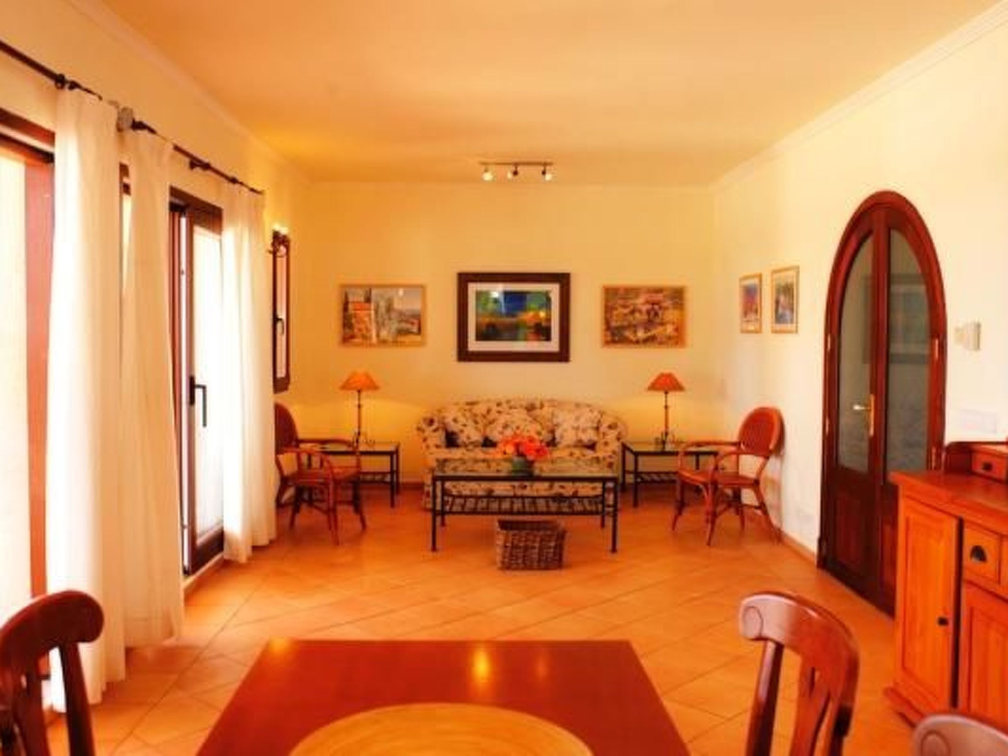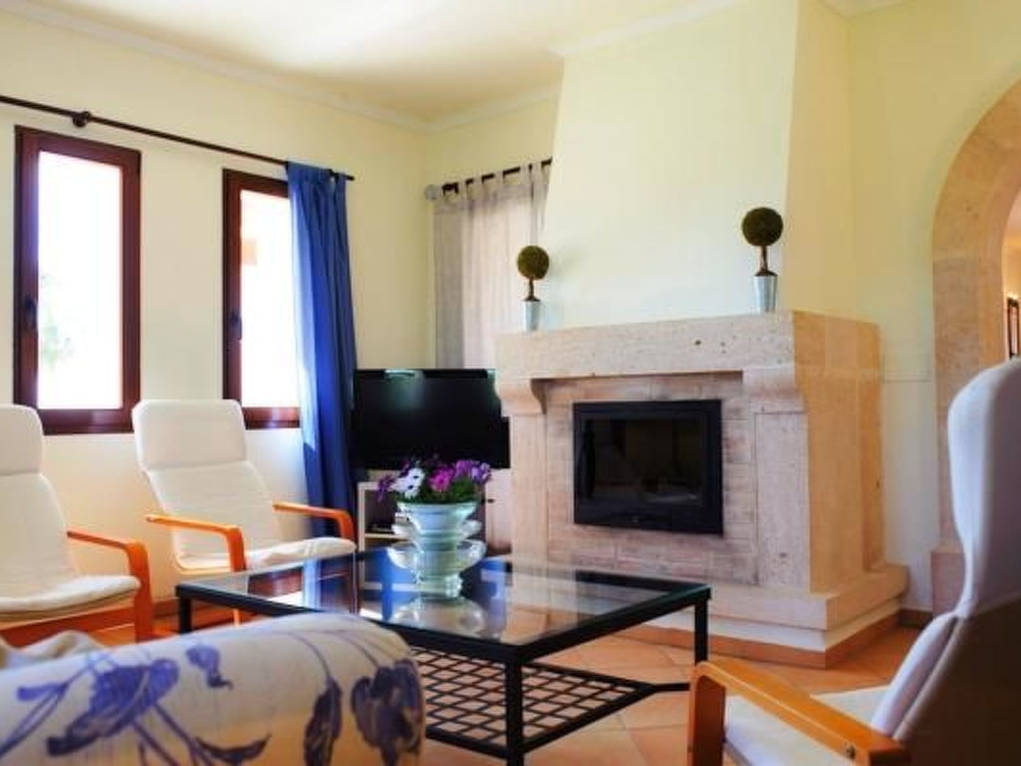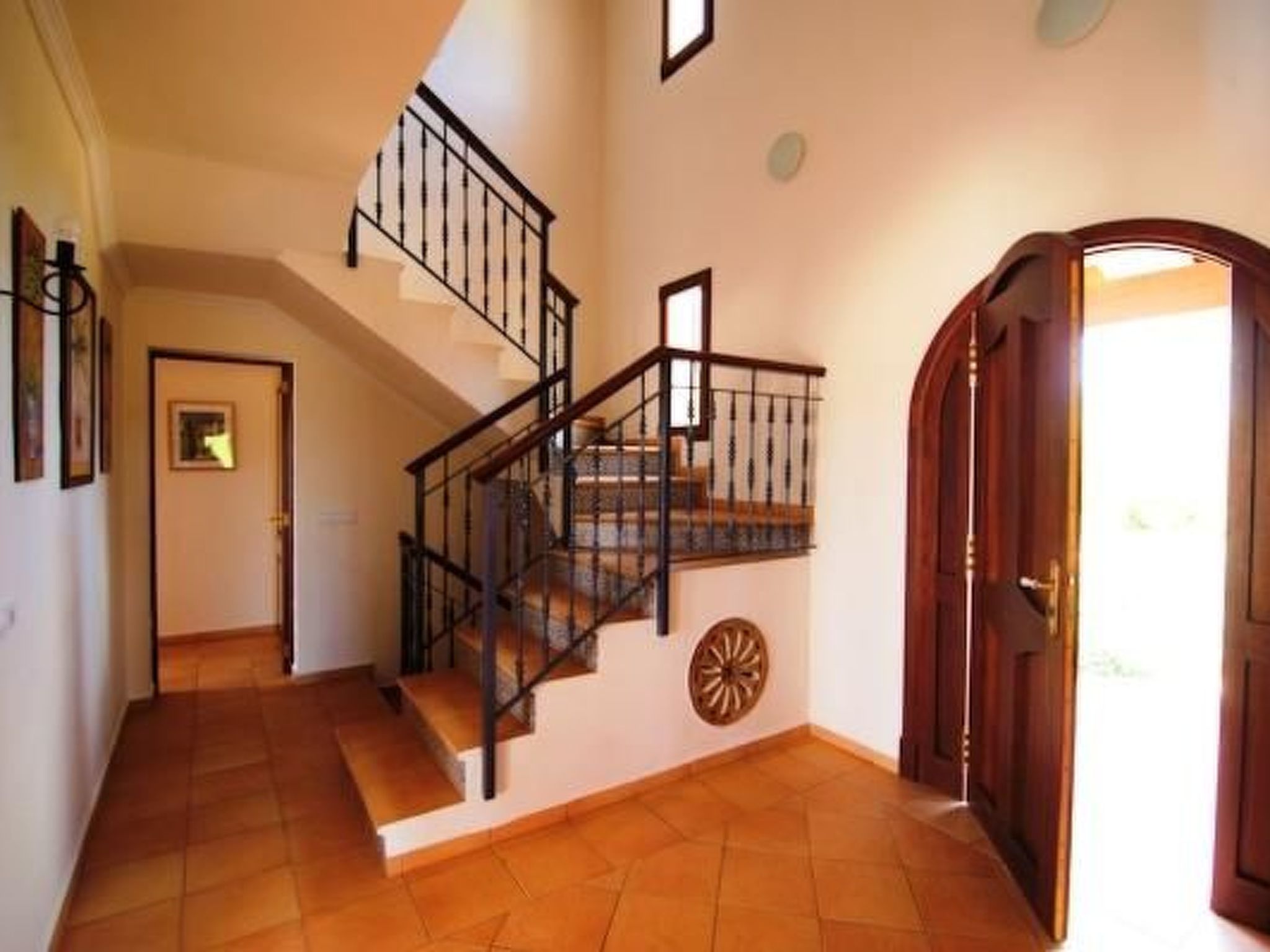 Finca From the entrance area, you enter the bright dining area with sliding glass doors to the pool terrace. An open archway leads to the living area with cosy sofas, satellite TV, DVD and fireplace. The modern kitchen is superbly equipped. Next door is a bedroom with two single beds, bathroom and private access to the pool terrace. Upstairs is the master bedroom with two single beds, dressing area, en suite shower room and private sun terrace. The third bedroom, also with two single beds and dressing area, has an en-suite shower room. There is also a service room with washing machine in the basement. The house is very tastefully furnished to a high standard and equipped with ceiling fans and underfloor heating.