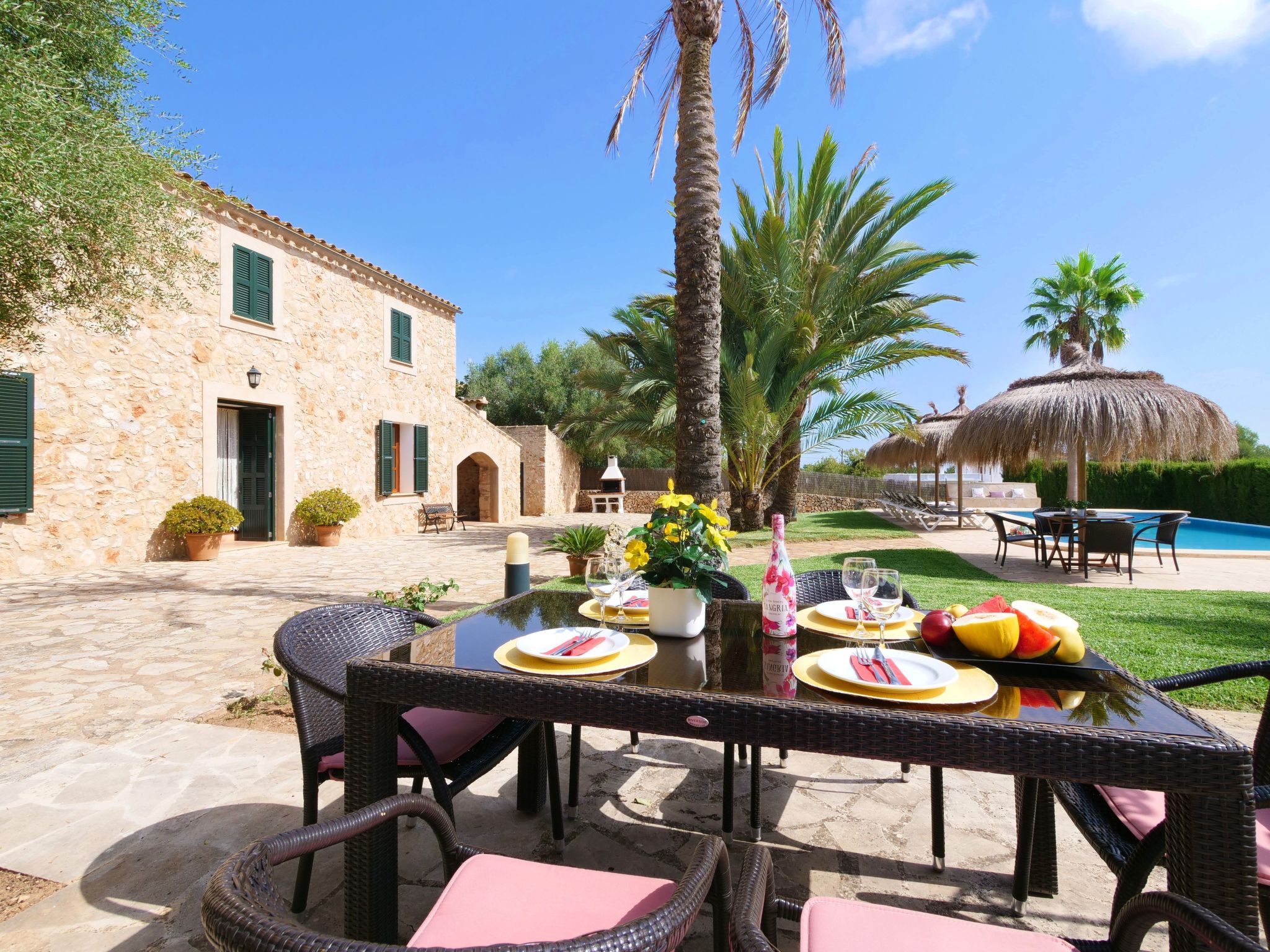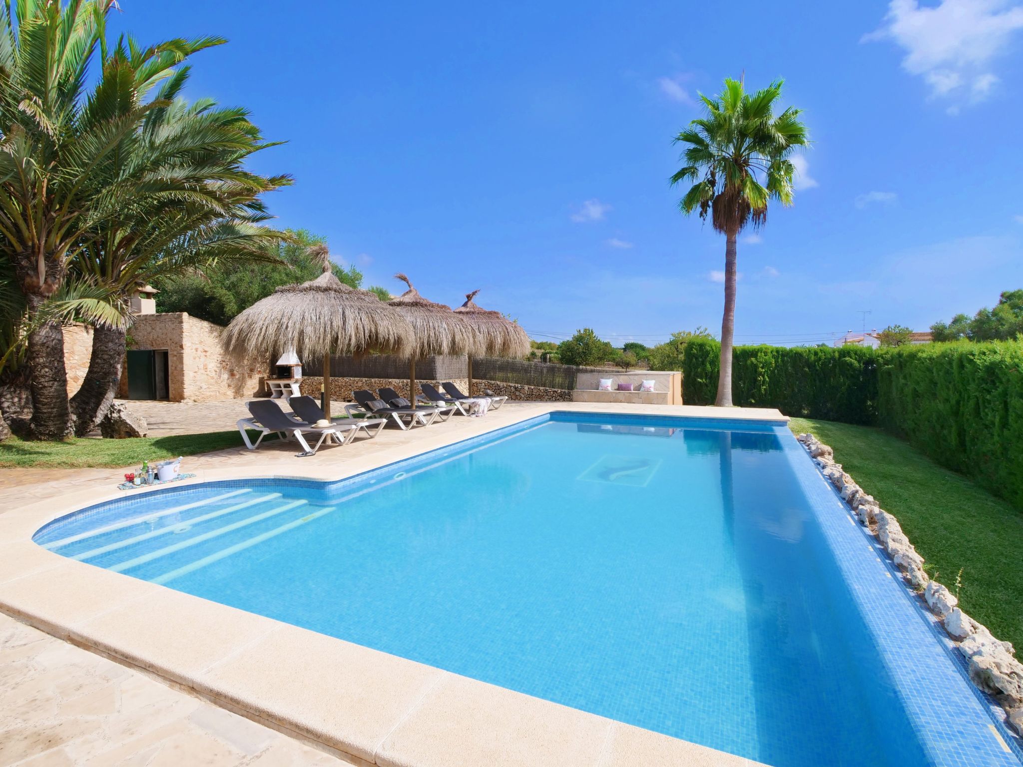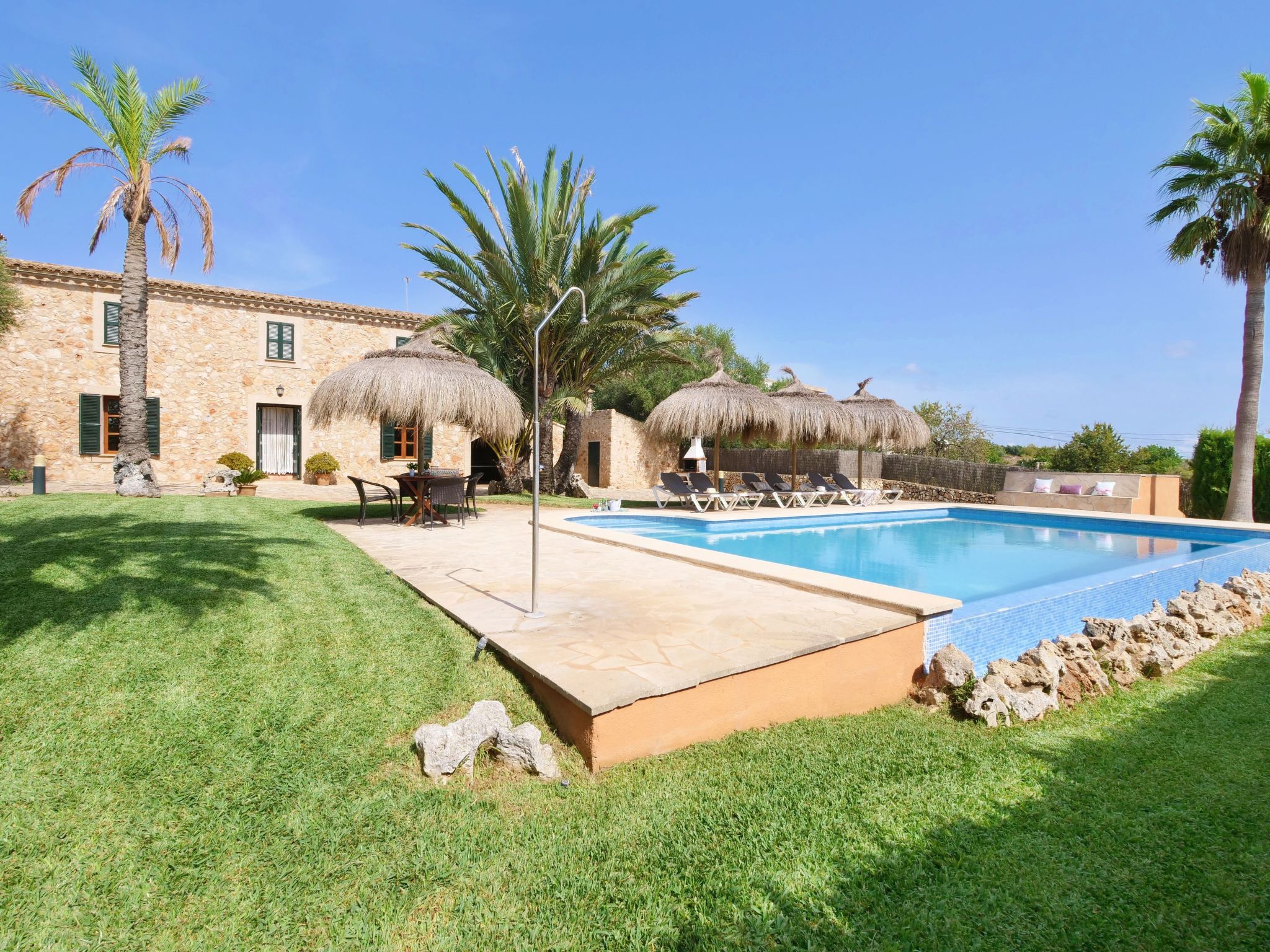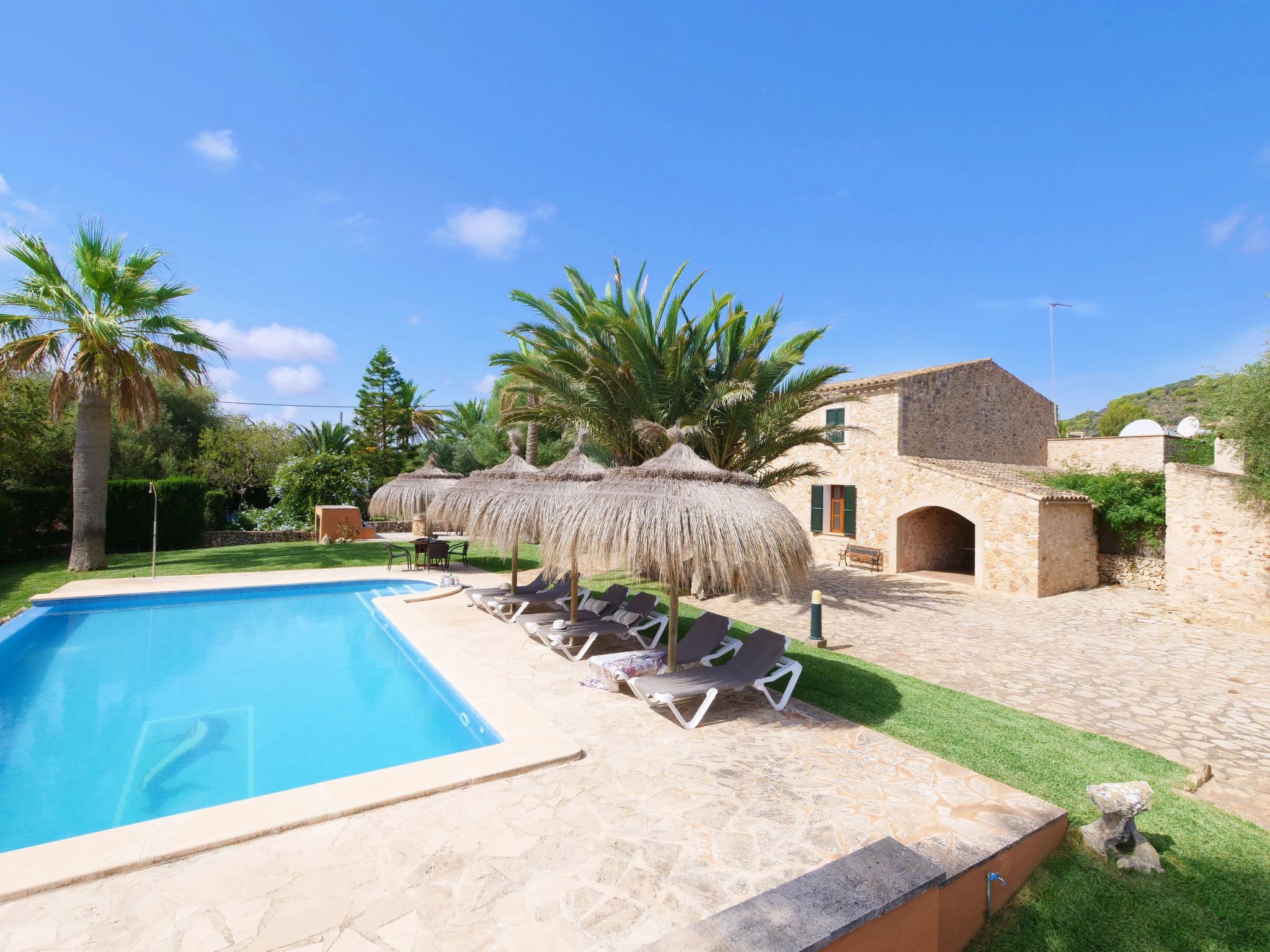 The Finca Corso de Shorta is a bit outside of the small, Mallorcan village of S'Horta with a few shops, bars and restaurants. In 5 minutes you can reach the beautiful sandy bay of Cala Sanau and the golf course Vall d´Or Golf is also nearby. The well-known holiday resort of Cala d´Or with shopping streets, bars, restaurants, nightlife and its glamorous marina is only approx. 5 km away. The beautiful 9 x 5 m pool with sun terrace invites you to cool off and sunbathe. Enjoy your meals outdoors on the cozy terrace - of course there is also an outside grill at your disposal.