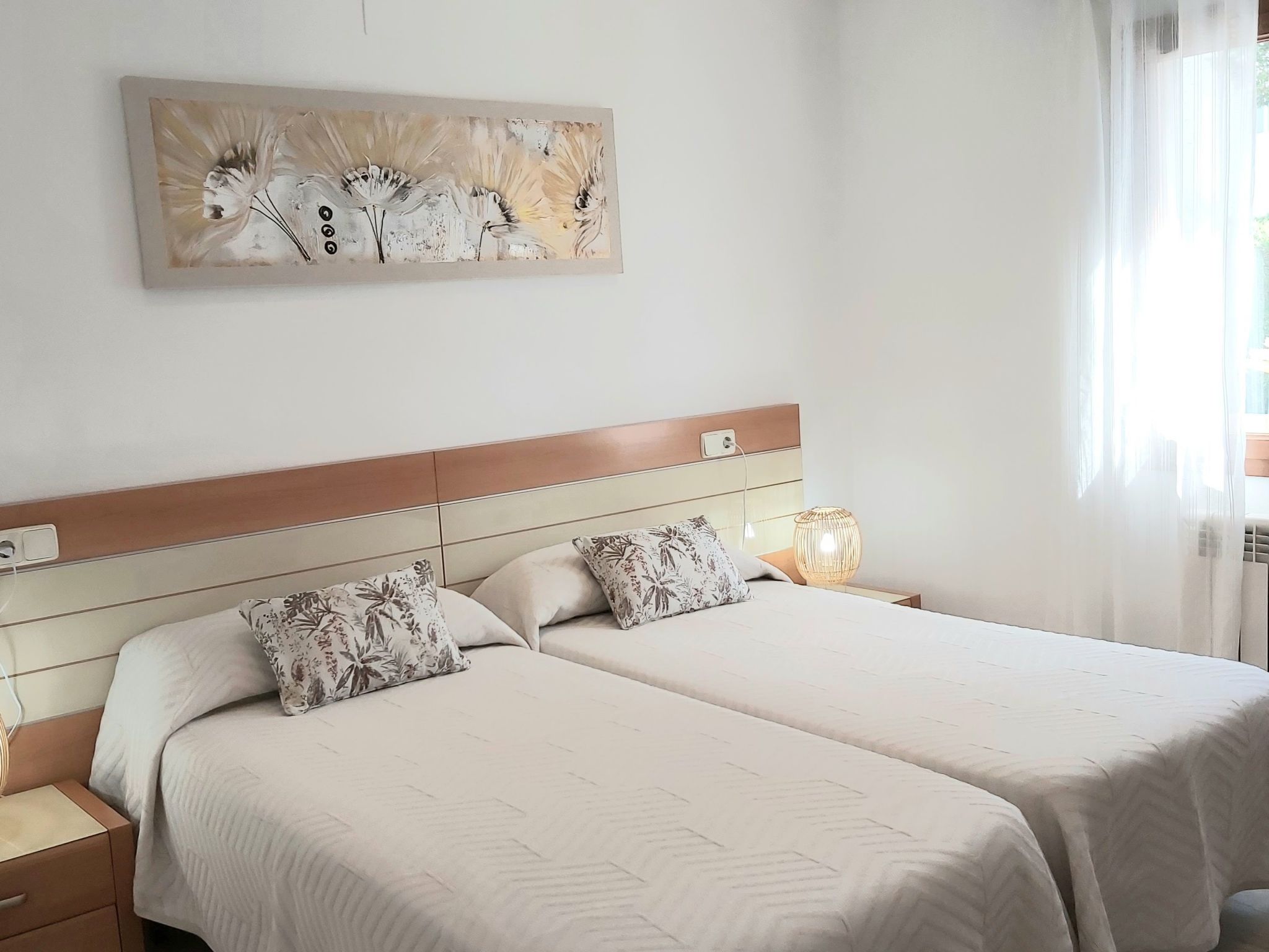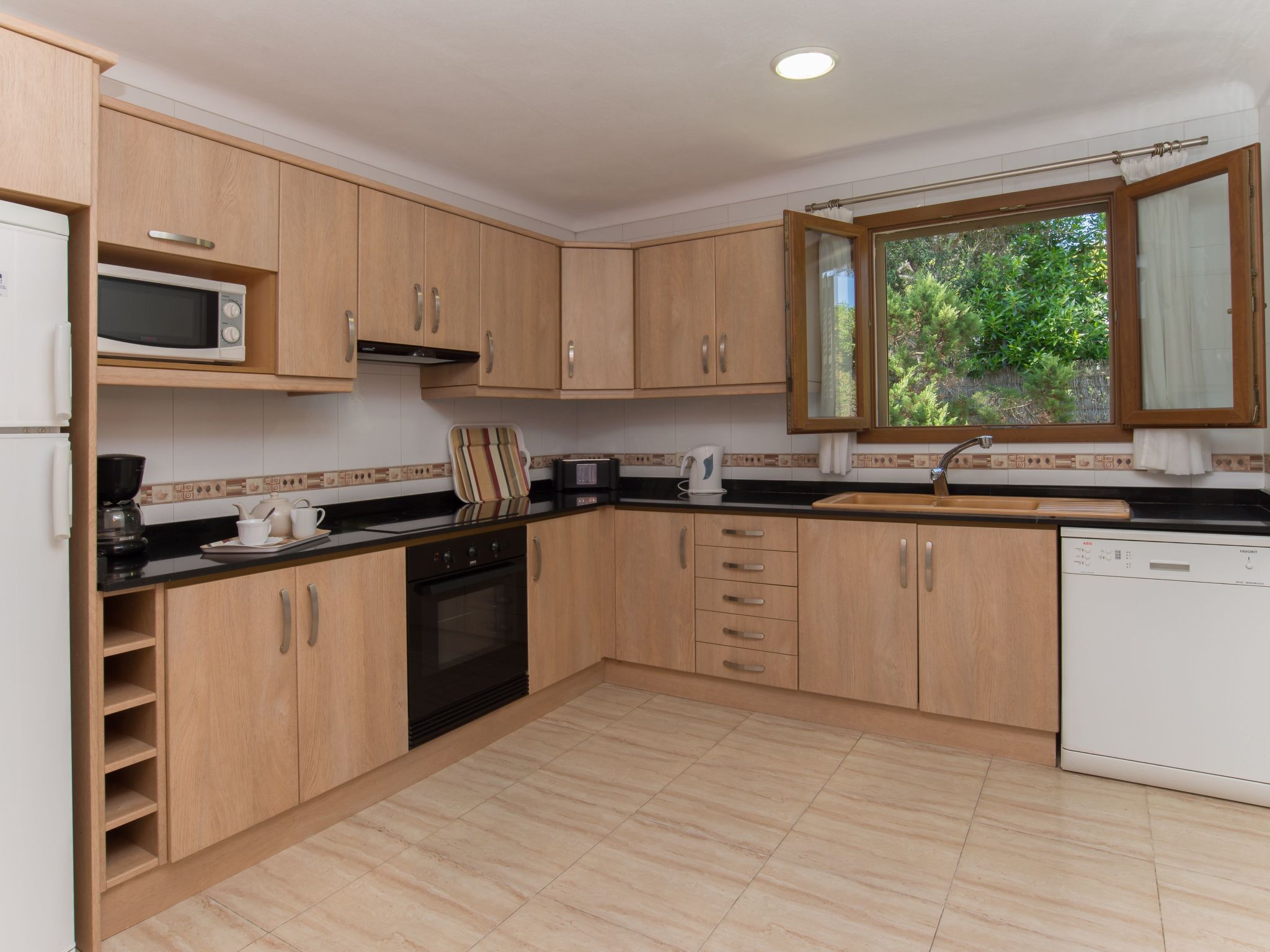 The villa offers a living room and dining room on the ground floor, each with a door to the pool terrace. From the dining room there is access to the spacious kitchen. There are also 2 bedrooms, one with a double bed and the other with two single beds. Both have an en-suite bathroom. On the upper floor there is a second living room with access to a small terrace and 3 bedrooms each with en-suite bathroom. Two bedrooms are equipped with 2 single beds and one with a double bed, the bedrooms have air conditioning with sensors, they only work when the doors and windows are completely closed, air conditioning with fixed and limited hours of use.