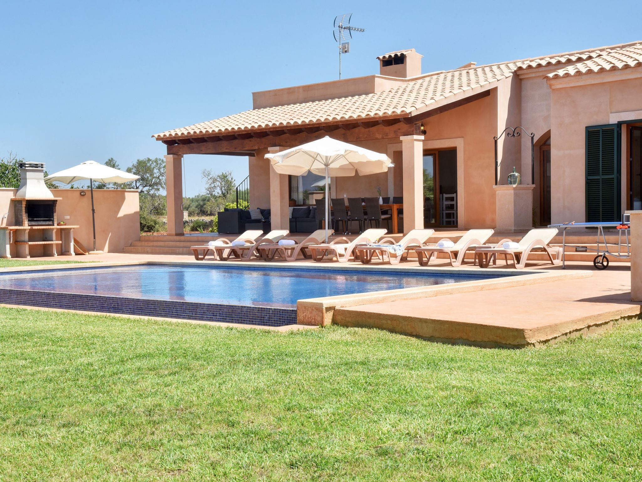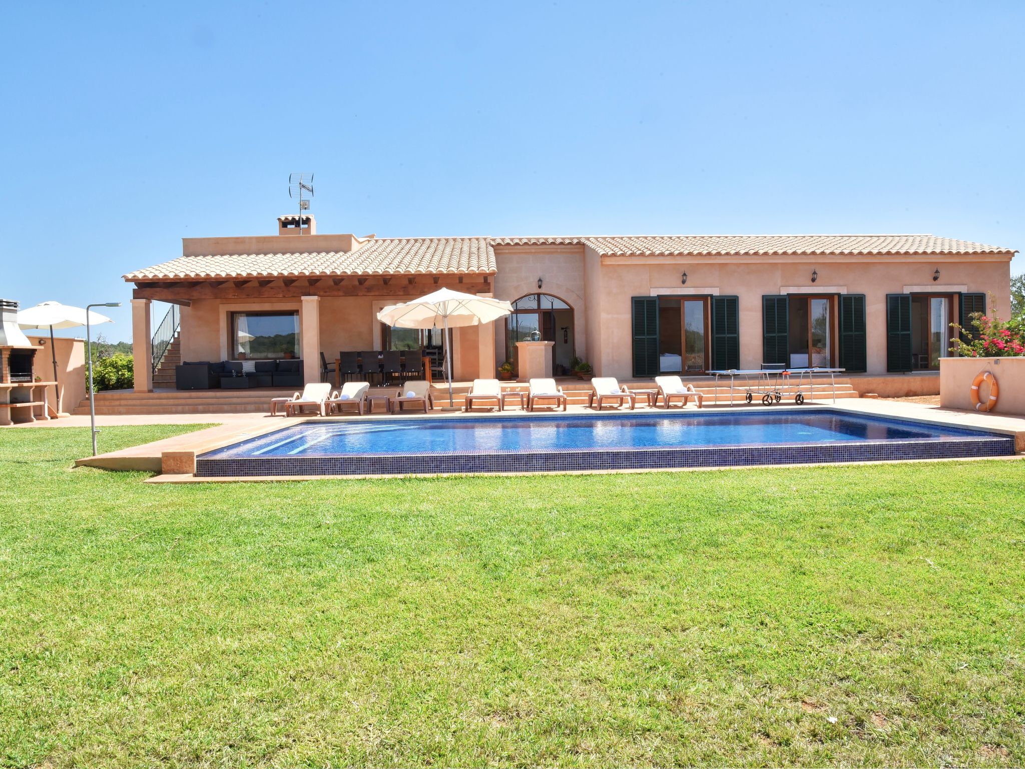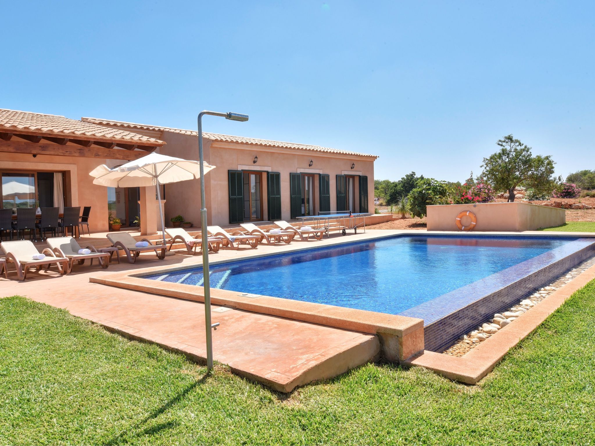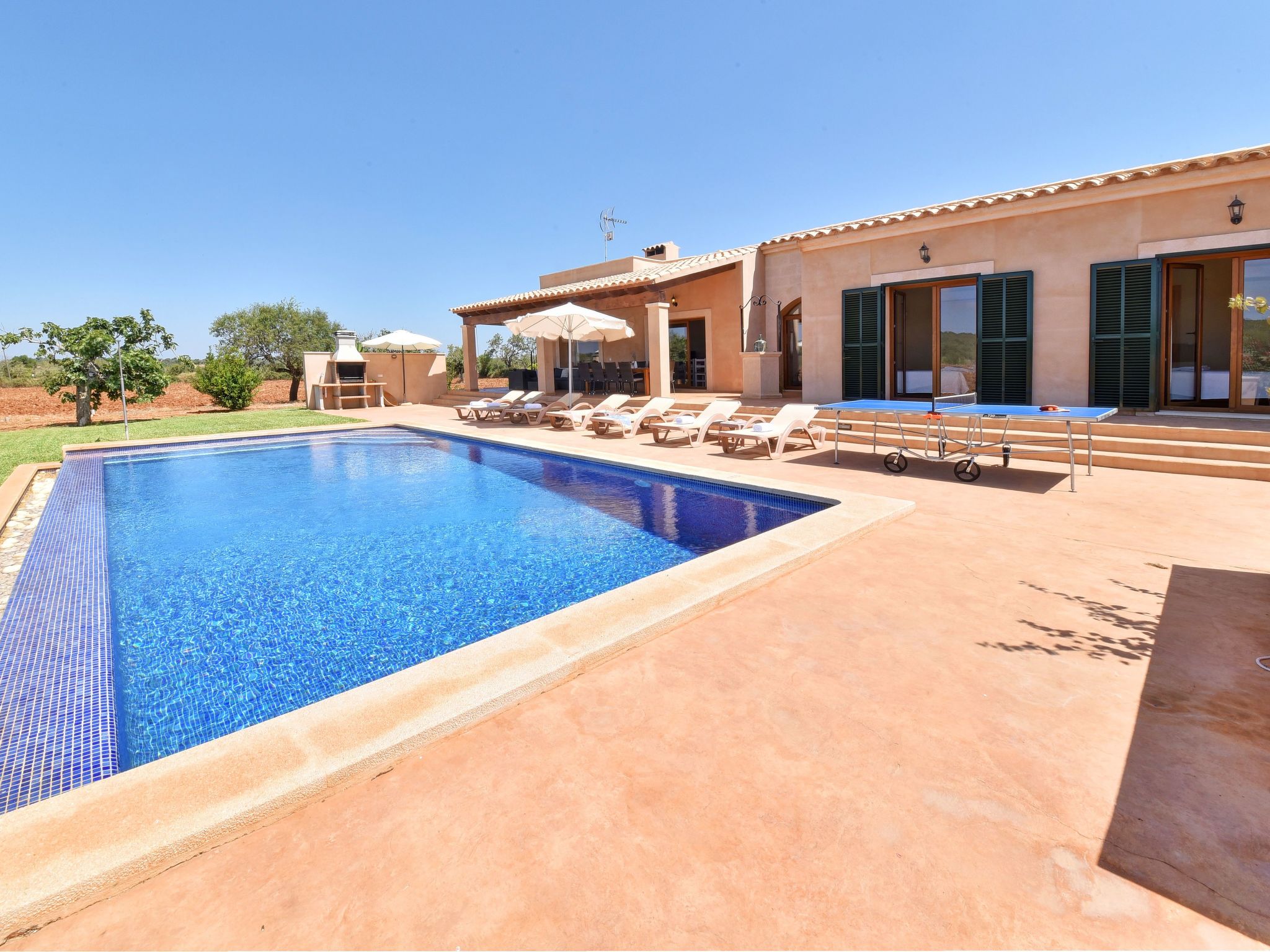 The entrance on the right leads to a large open-plan kitchen with a long dining table and adjoining living area with access to the terrace and pool. From the kitchen, a utility room leads to a spacious bedroom with 2 single beds and en-suite shower room. To the left of the entrance are 2 further bedrooms, also with 2 single beds each, which share a bathroom with Jacuzzi bath. The last bedroom with double bed has an en-suite shower room, the shower has a hydro-massage.