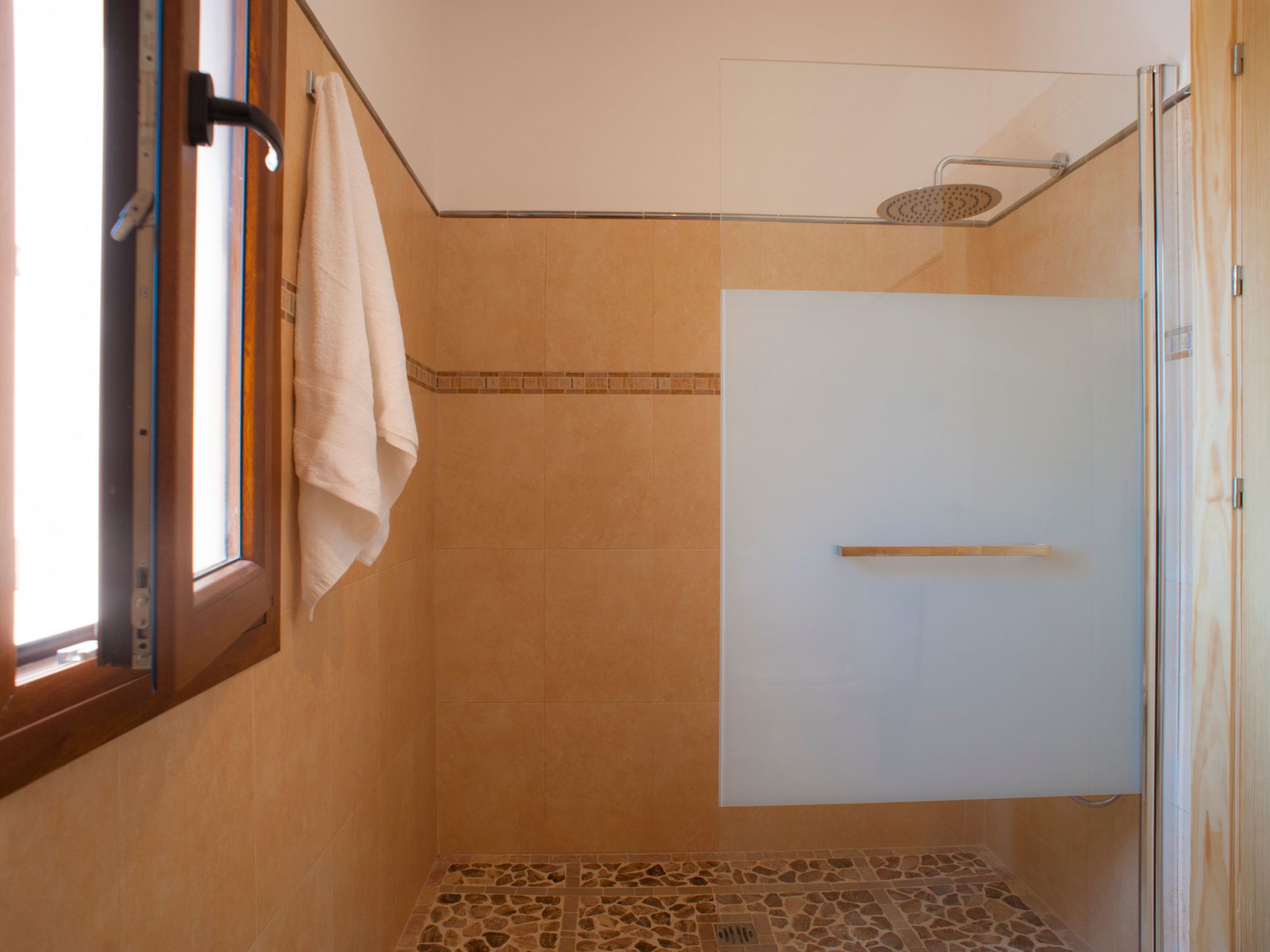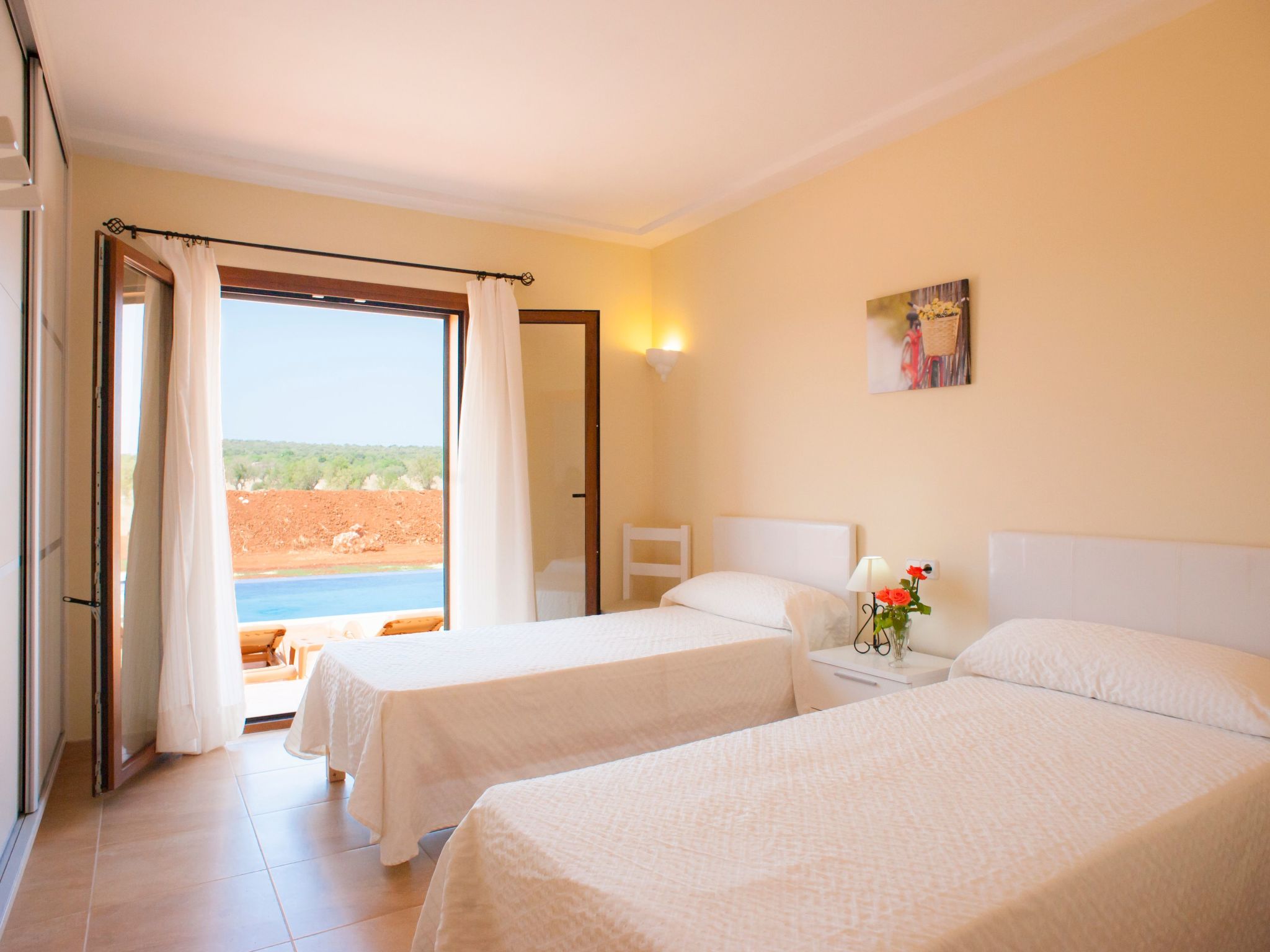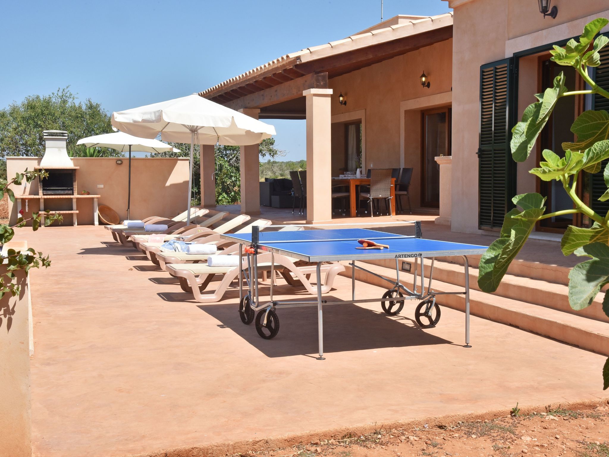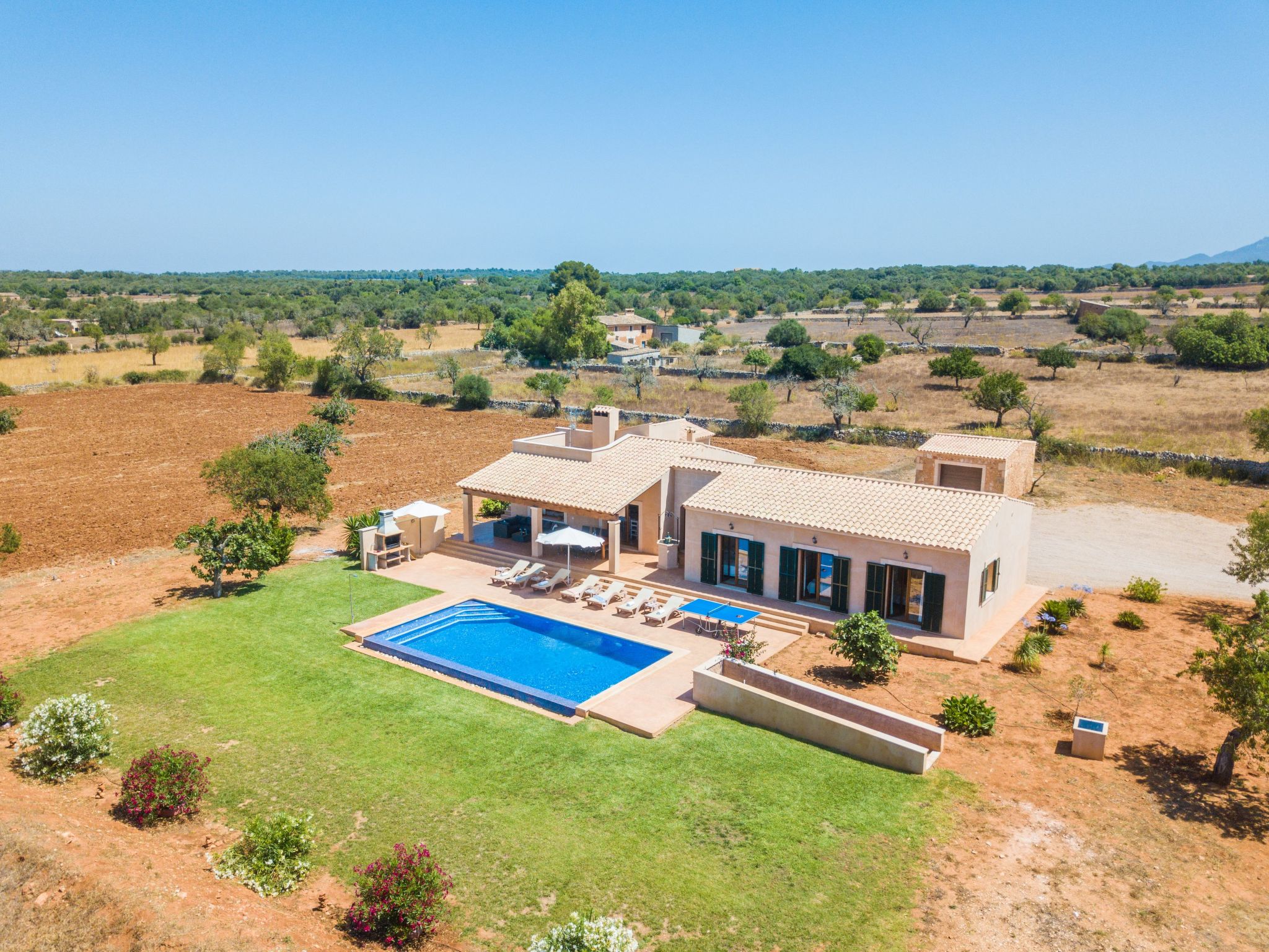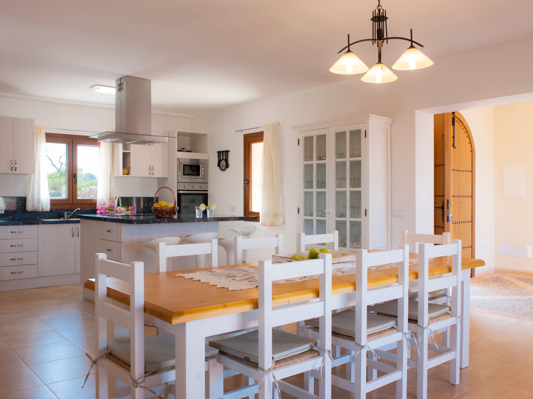 The entrance on the right leads to a large open-plan kitchen with a long dining table and adjoining living area with access to the terrace and pool. From the kitchen, a utility room leads to a spacious bedroom with 2 single beds and en-suite shower room. To the left of the entrance are 2 further bedrooms, also with 2 single beds each, which share a bathroom with Jacuzzi bath. The last bedroom with double bed has an en-suite shower room, the shower has a hydro-massage.